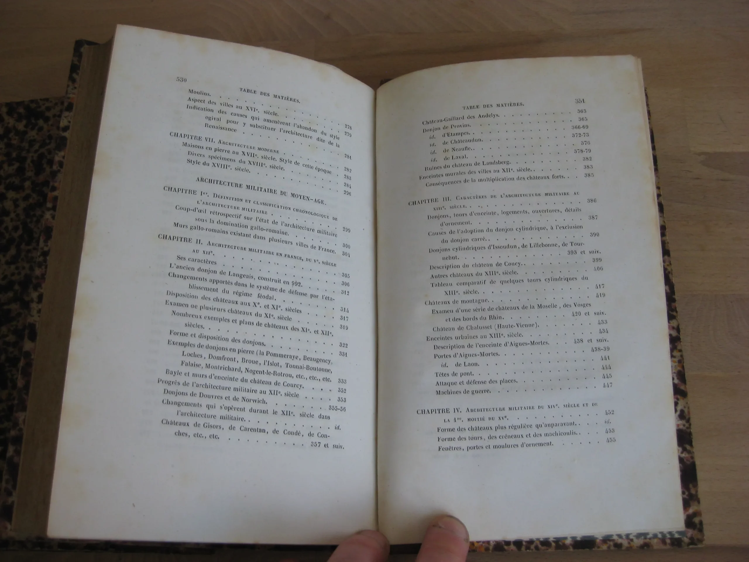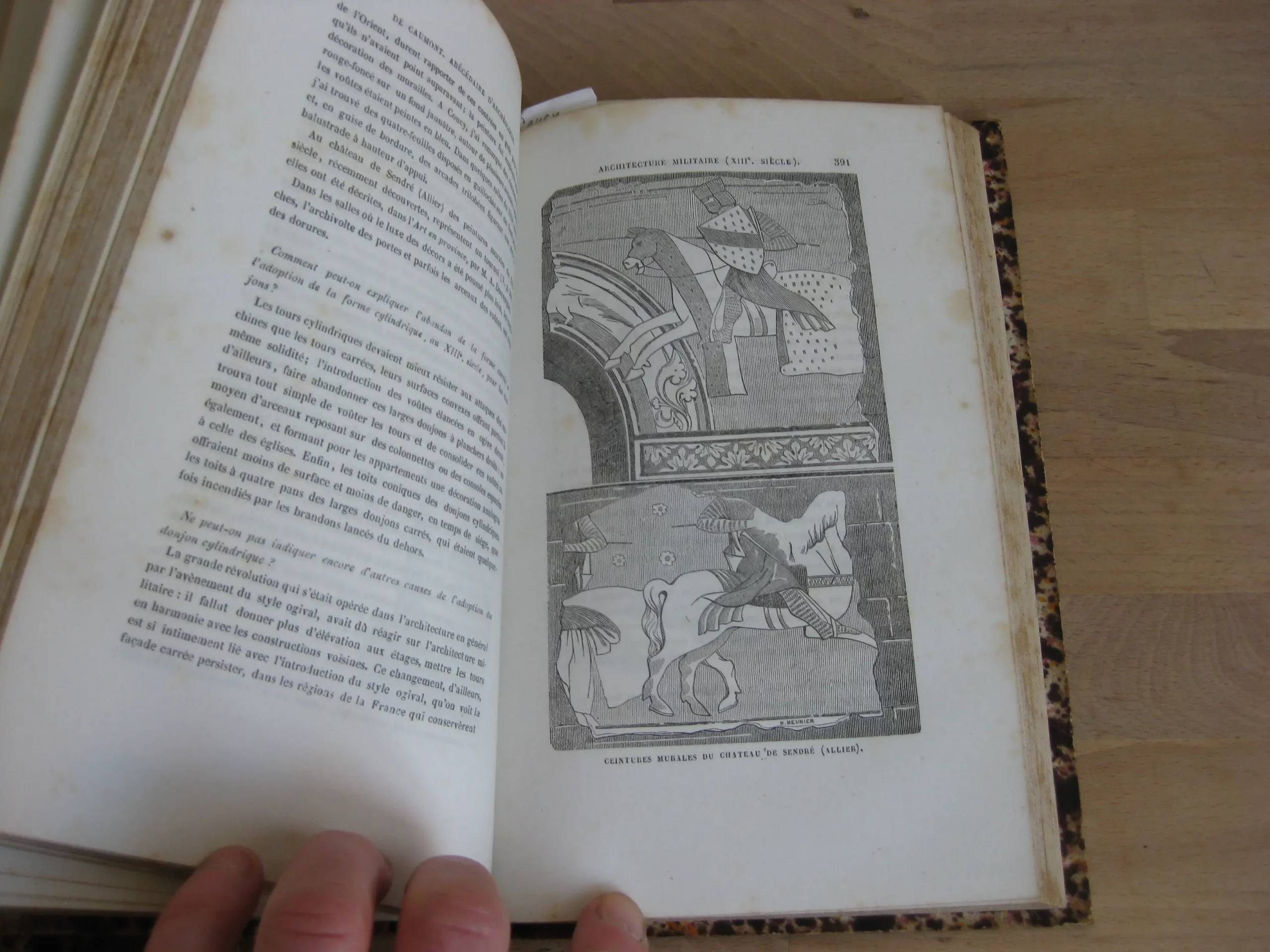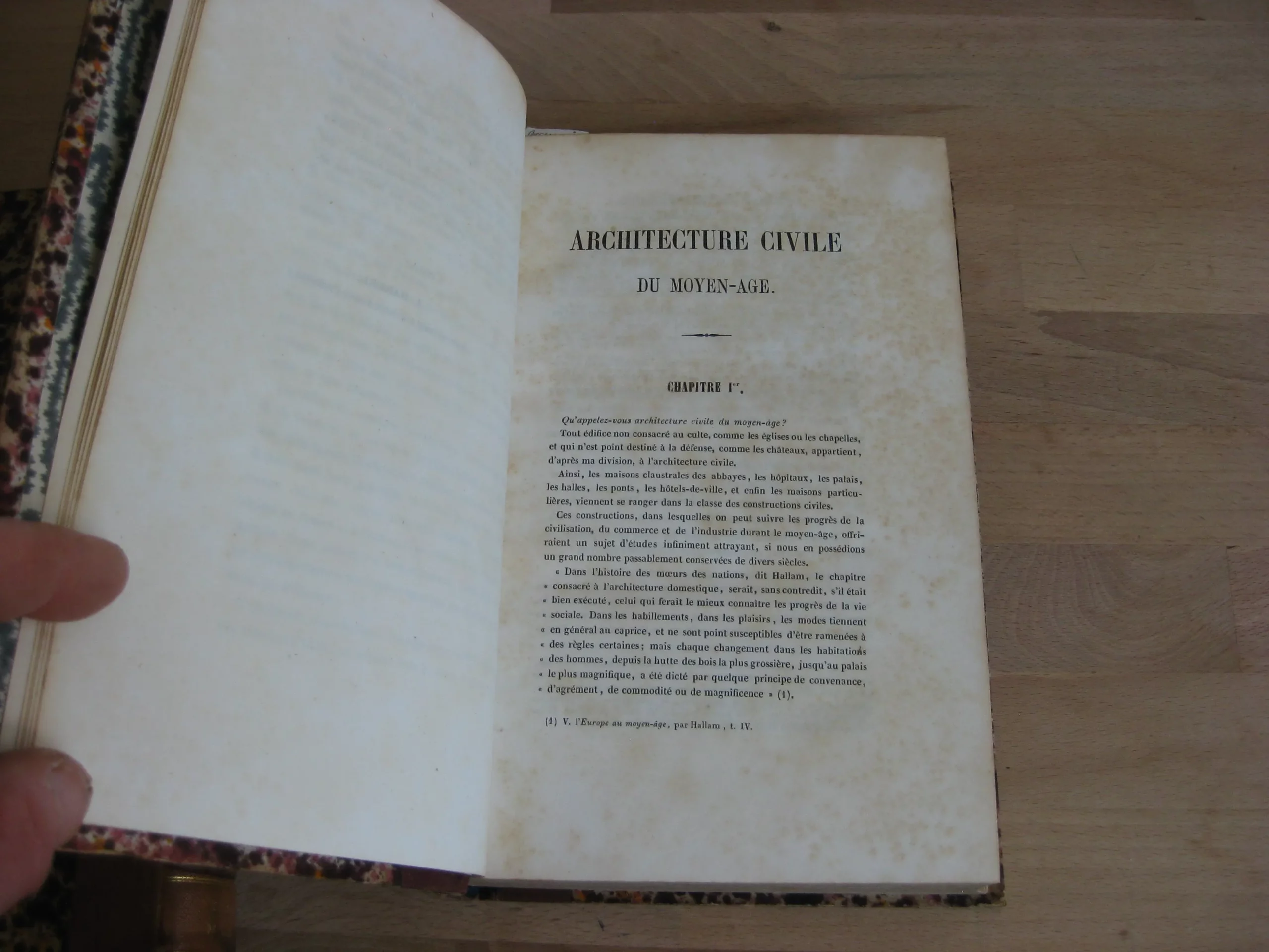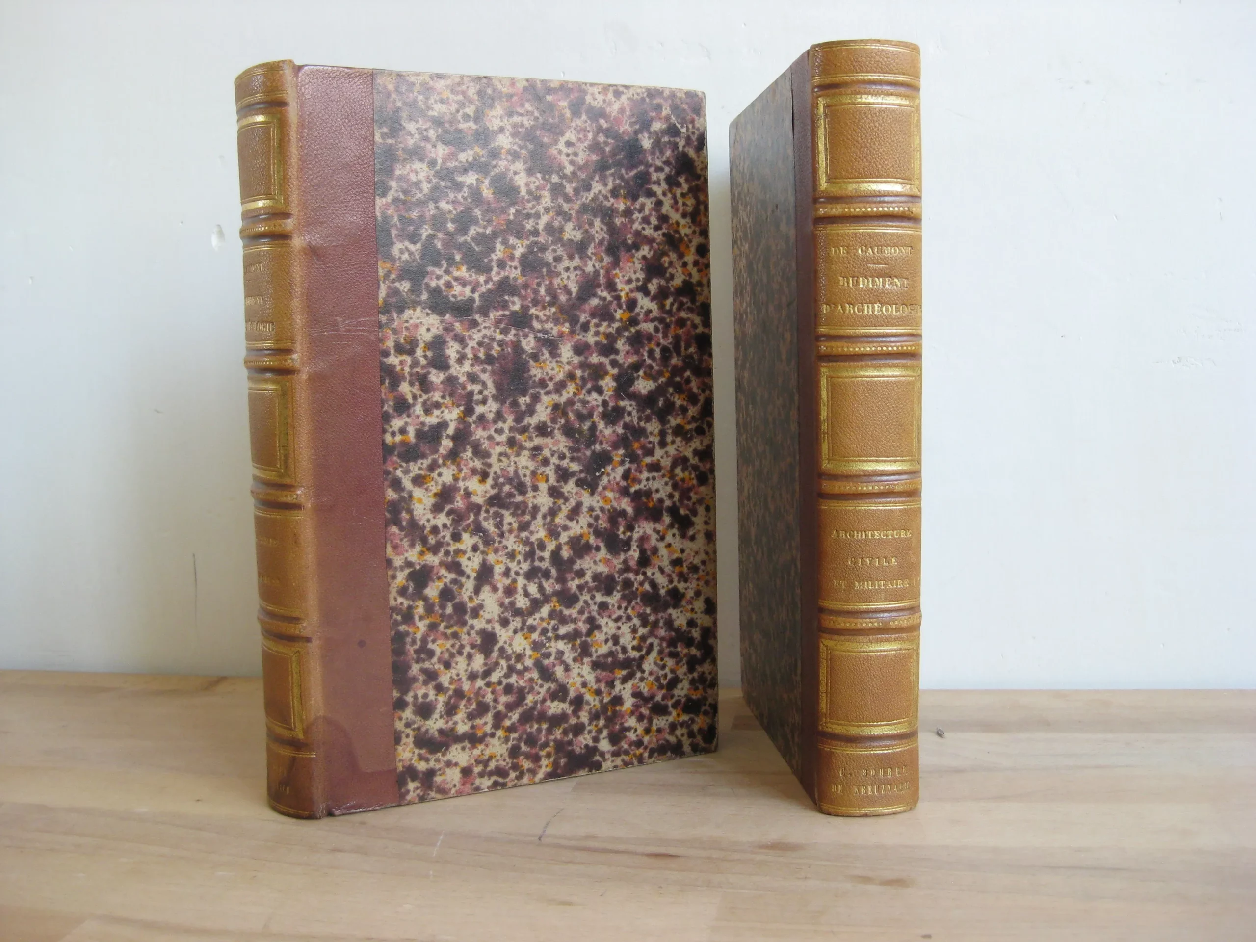 Demi-chagrin blond, dos à faux nerfs orné des titre, auteur et de la provenance en pied «  C. Bohrer de Kreuznach » (provenance appuyée par l’étiquette collée en contreplat supérieur), 218 x 142, Architecture religieuse, 692p. 1859, 4ème éd. Architecture civile et militaire, 532p. 1858. 2ème éd. Frontispice, et nombreuses illustrations dans le texte pour les deux volumes. Des rousseurs marginales. Bon état intérieur pour les deux volumes. Reliure en bel état, légère insolation des plats. De légères épidermures en coiffe et queue, une légère trace noire en pied de dos du volume religieux. Coins et champs frottés. Rousseurs sur les tranches. Beaux exemplaires bien fermes.