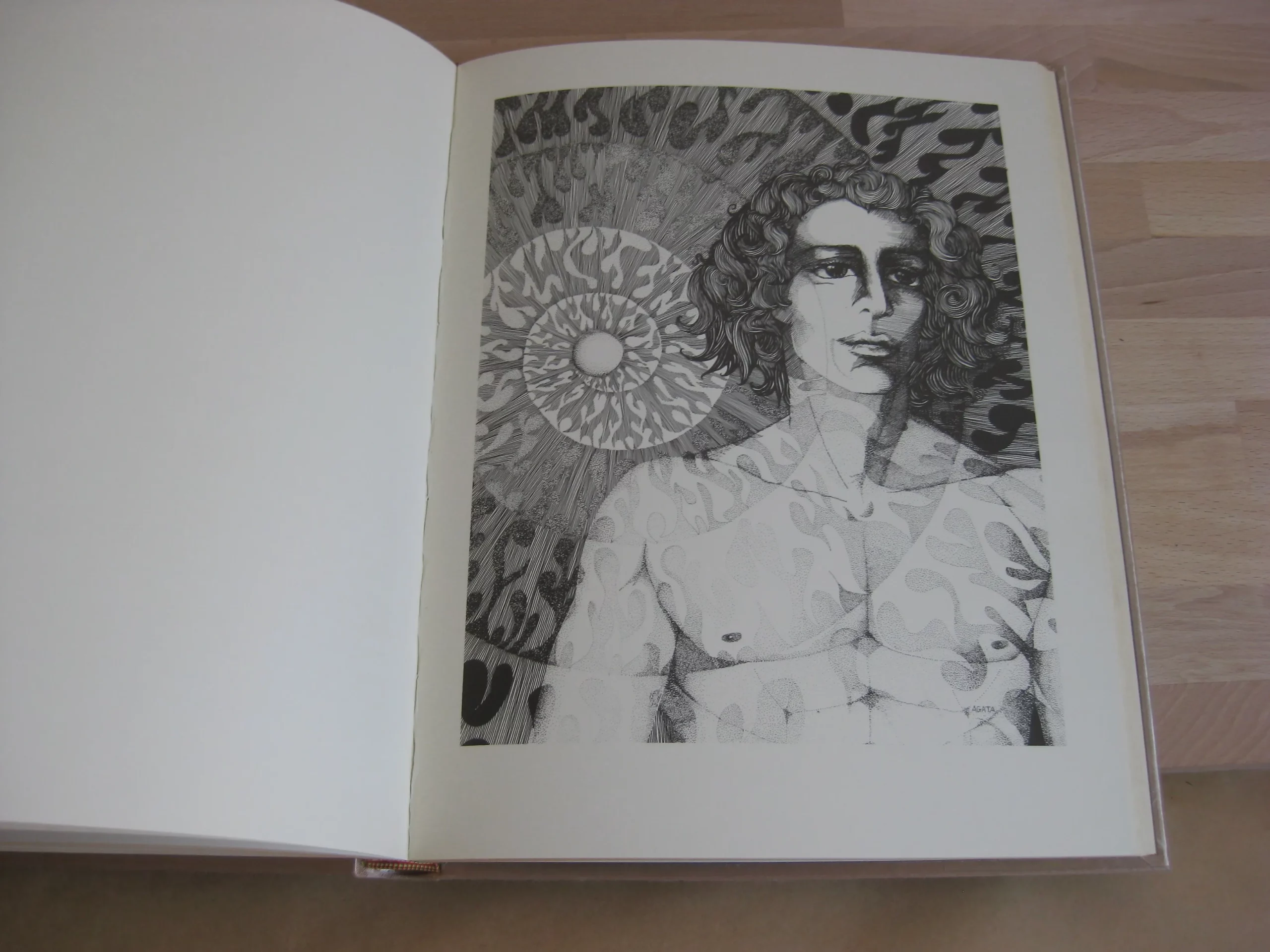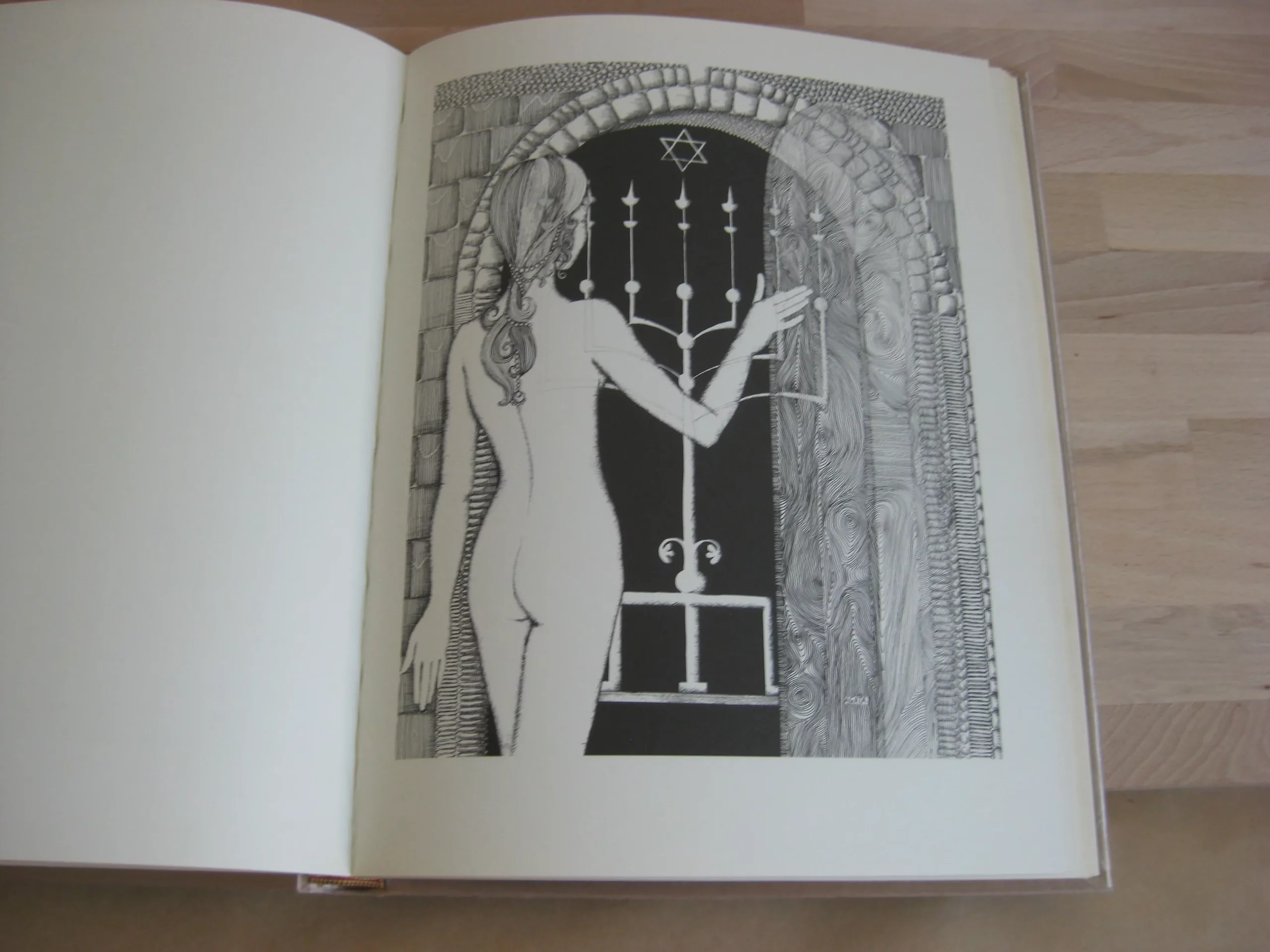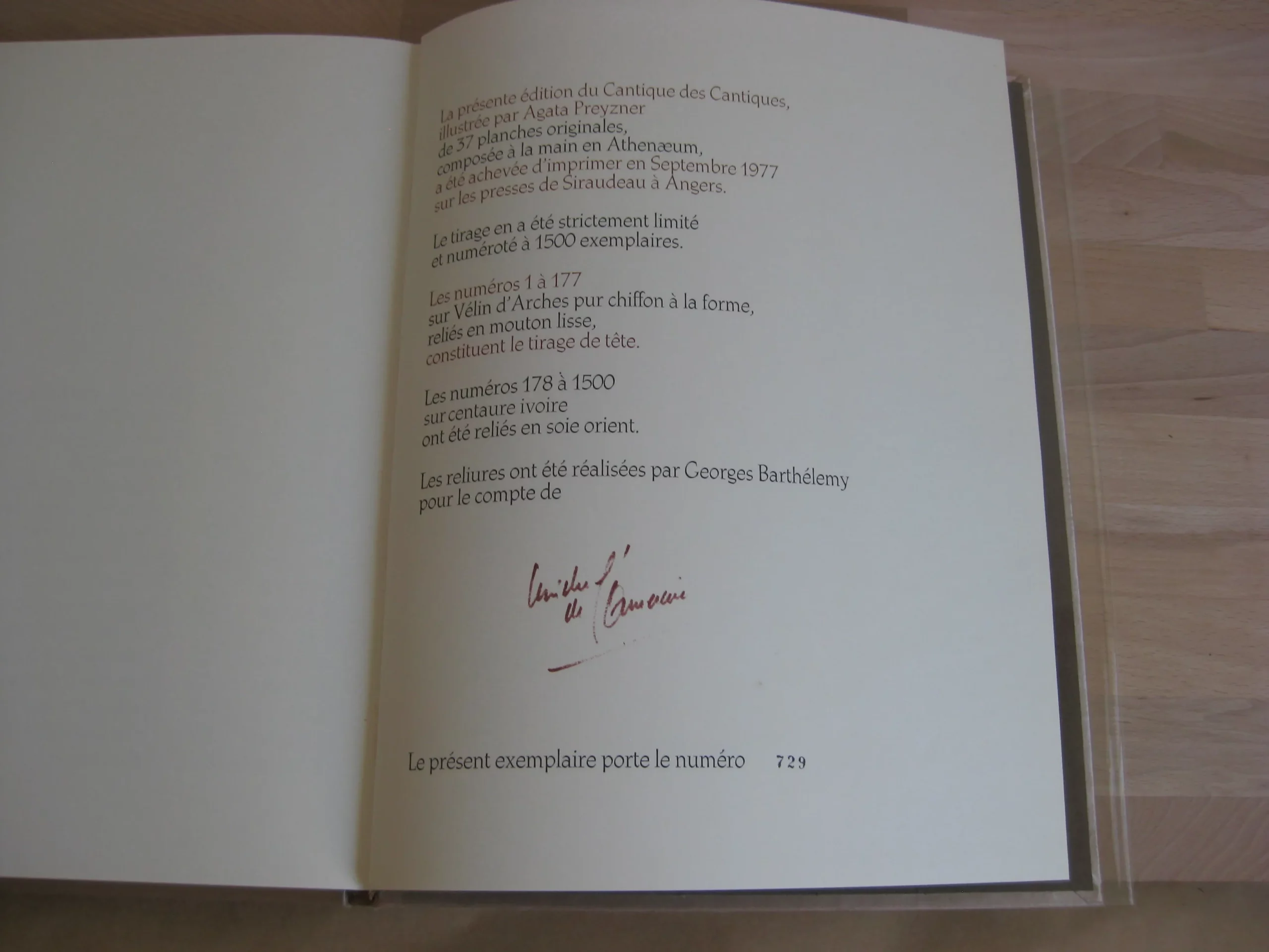 Chez Michel de L’Ormeraie – Cartonnage pleine soie illustré à dos titré sous rhodoïd, 330 x 250, 1977. Edition originale numérotée 729. (1500 tirage total), un des exemplaires sur centaure ivoire, reliés en soie d’orient. Reliure réalisée par George Barthélémy. Avec 37 planches originales de Agata Preyzner, composées à la main en Athenaeum, dont 9 couleur (noir, blanc rouge). Texte dans la version de Zaduc Kahn. Excellent exemplaire propre et intègre. Légers frottements en coiffe et queue.