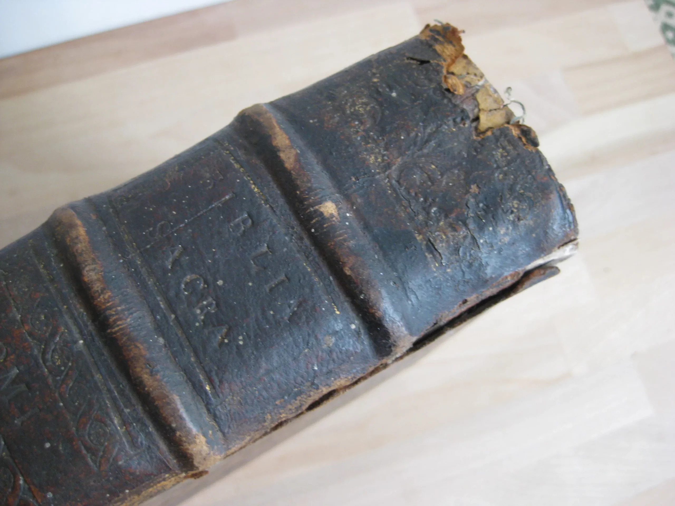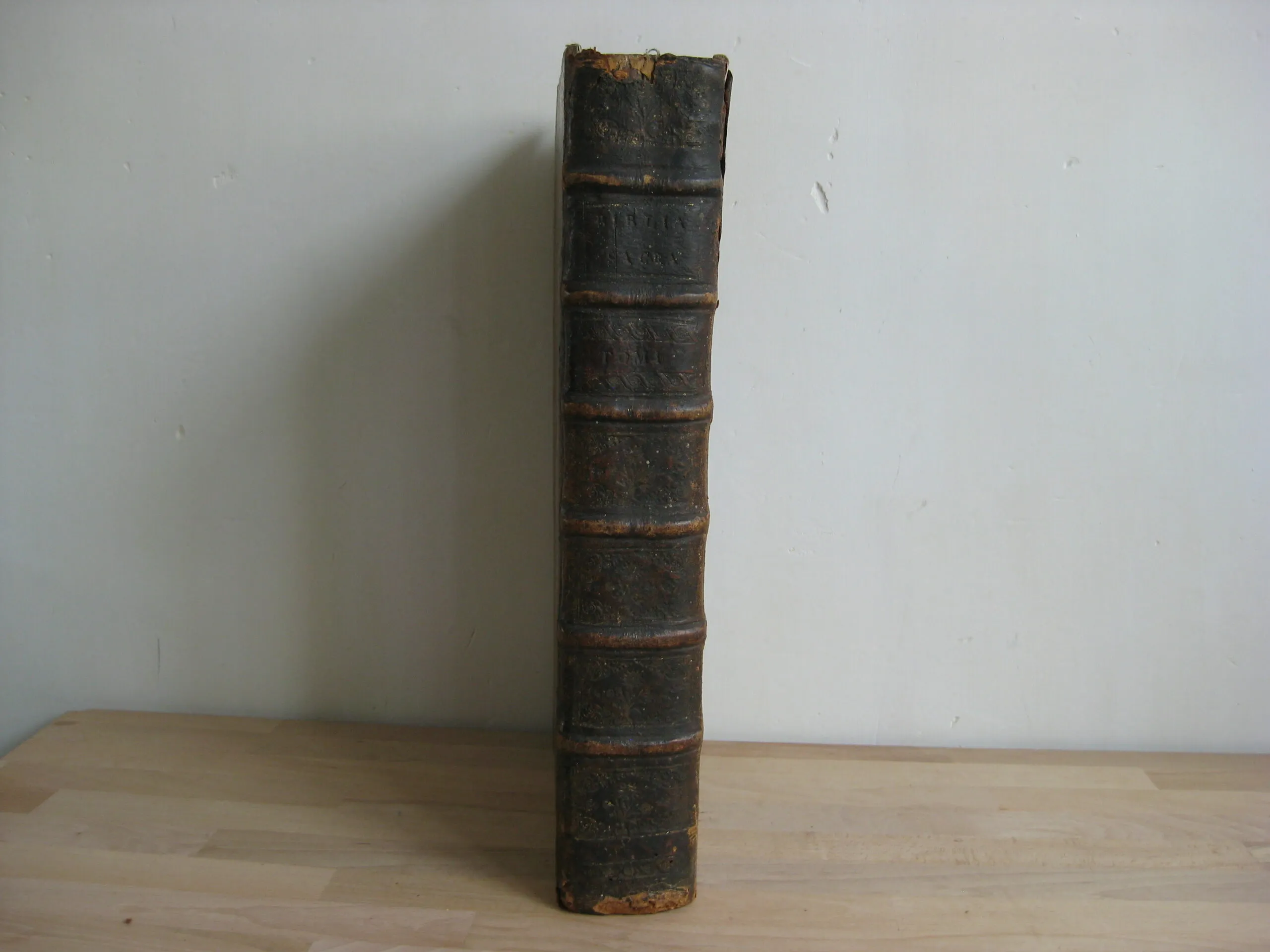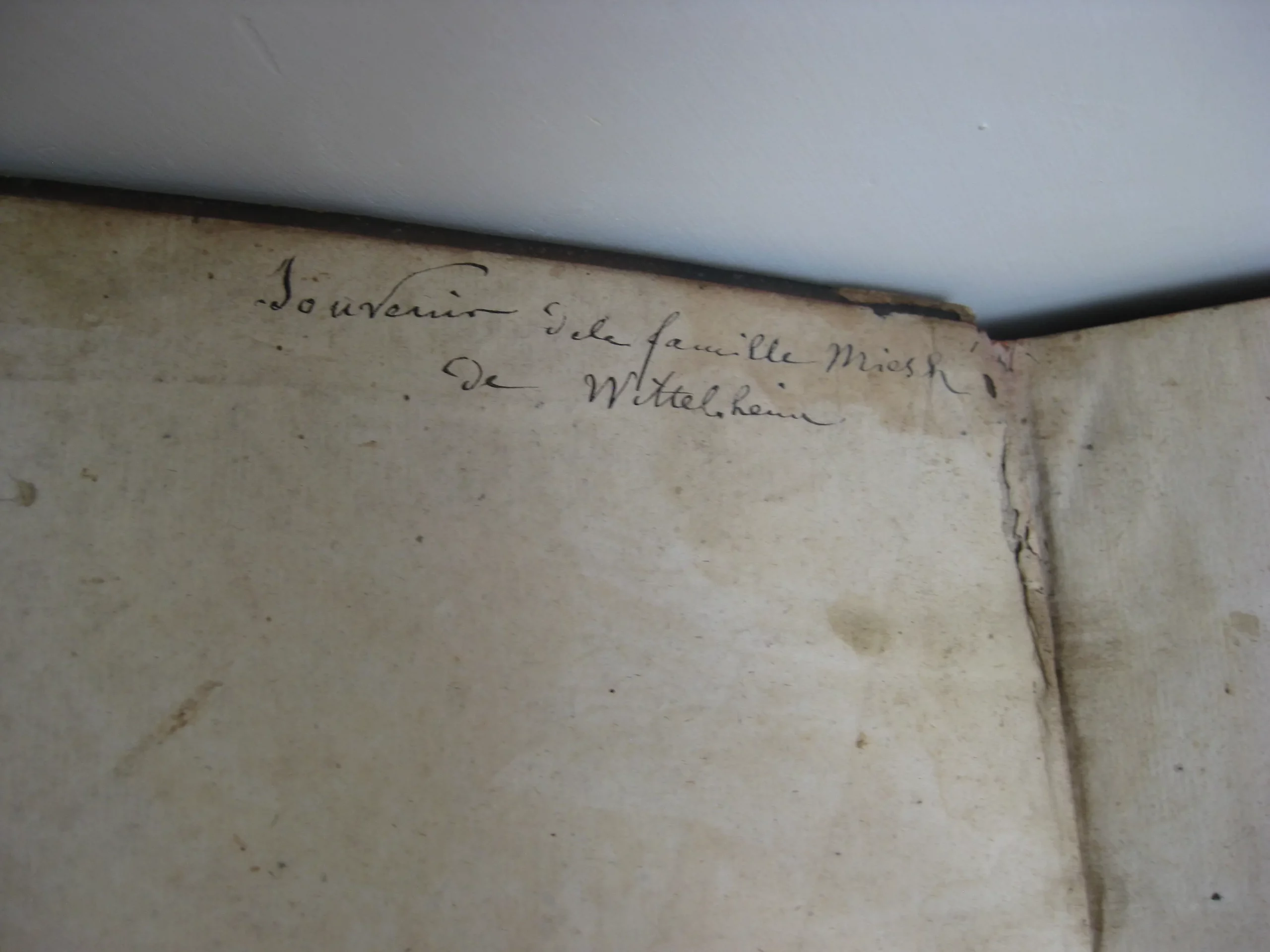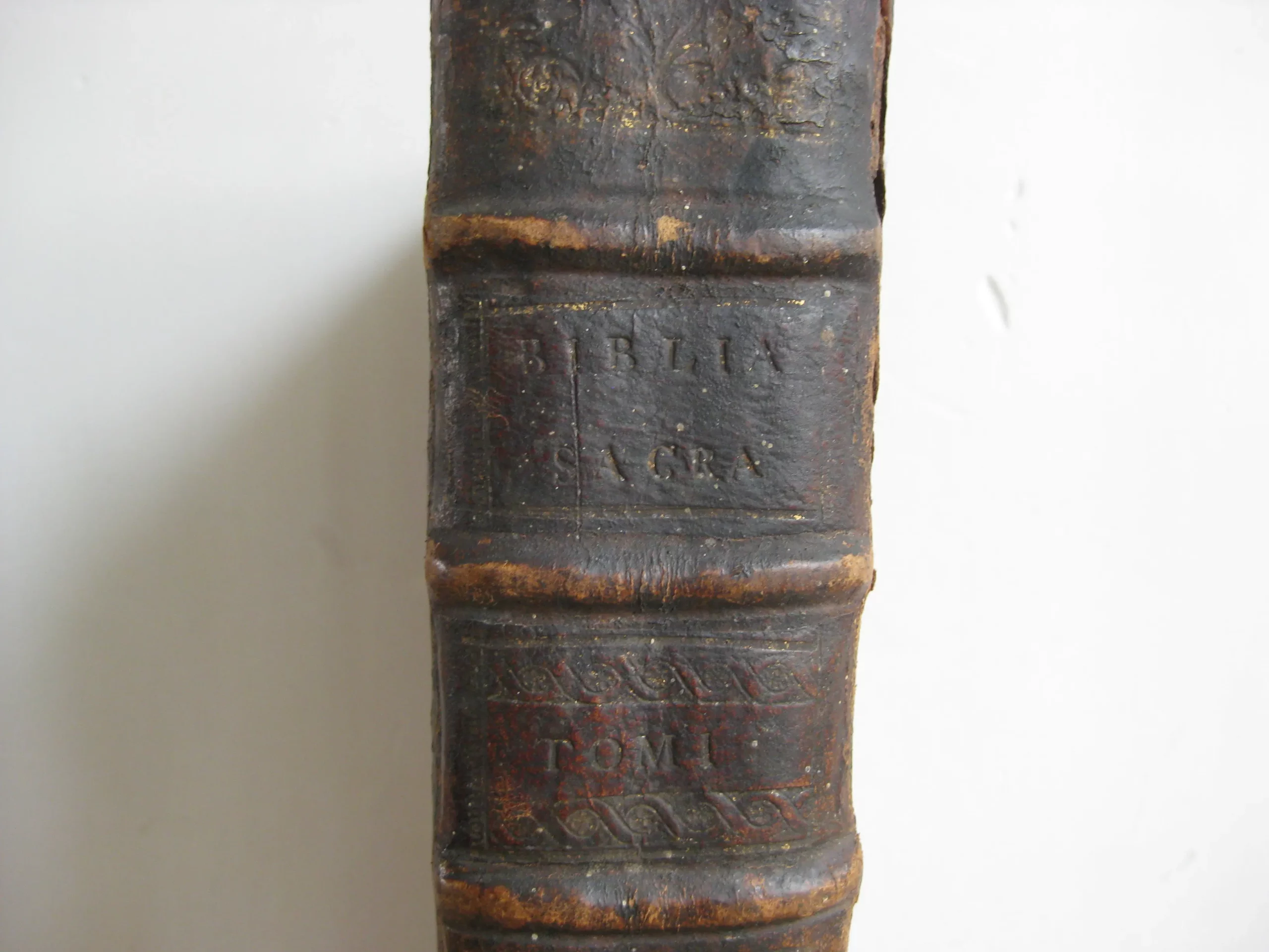 In-folio plein veau marbré, dos à 6 nerfs, estampé aux caissons, qui fut orné d’une pièce de titre, tomaison et de fleurons (mais estompés), tranches rouges, 378 x 255. Graz and Innsbruck, 1749. Garde, Faux-titre, titre, Tabula omnium, Praefacio bibliopolae, Adresse à Innocent VIII, Censura, Approbatio, Facultas, Privilegium, Praefacio ad lectorem, non paginé, 26 feuillets  ; et le texte 844p. Complectens veteris testamenti legem et legis historiam ; Moysis pentateuchum. [De la Genèse au chapitre 51 de l(Ecclésiaste]. Provenance manuscrite en tête de contreplat supérieur « Souvenir de la famille Miesch de Wittelsheim ». Comprend également un feuiller volant « Avis au Archiprêtres, curés et desservans du diocèse de Strasbourg ».Texte sur deux colonnes, allemand gothique – latin, et notes en marges. Rousseurs continues mais globalement légères, rares mouillures marginales. Trous de vers en pied de page en marge en tout de début de volume (garde et 26 feuillets de tête, et en pied et tête de contreplat supérieur) et en fin de volume en pied de page en marge (3 derniers feuillets et pied de contreplat inférieur). Concernant le reliure, travail de vers limité en plats ; un petit manque en tête de plat supérieur. Coins et champs frottés, coins de pied émoussés. Mors supérieur fendu sur les deux premiers nerfs, et mors inférieur brièvement en pied. Dos frotté avec épidemrures, coiffe manquante, un manque en caisson de tête, un manque en caisson de pied, queue frottée avec un manque. Cette édition de la Vulgate est faite sur l’édition de la Bible dite de Clément VIII (Vatican, 1592) qui est devenu le texte authentique de la Vulgate.  Le texte allemand est basé sur la traduction de Kaspar Ulenberg, dite « Bible de Mayence ».