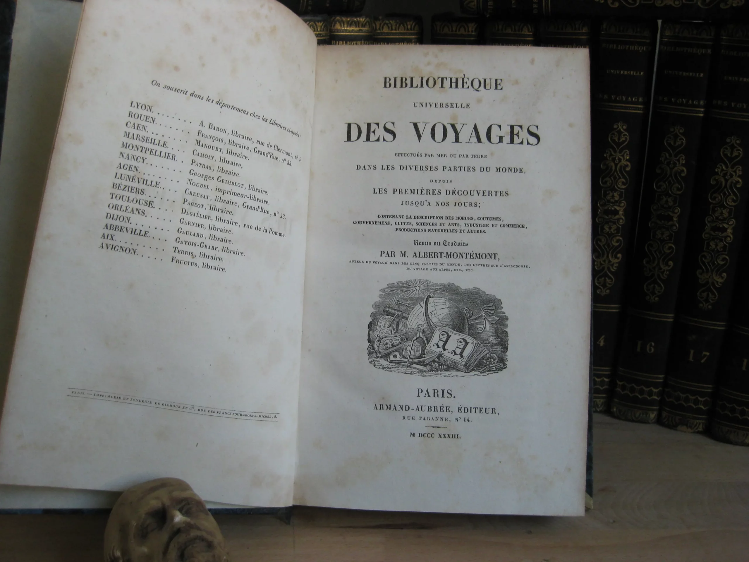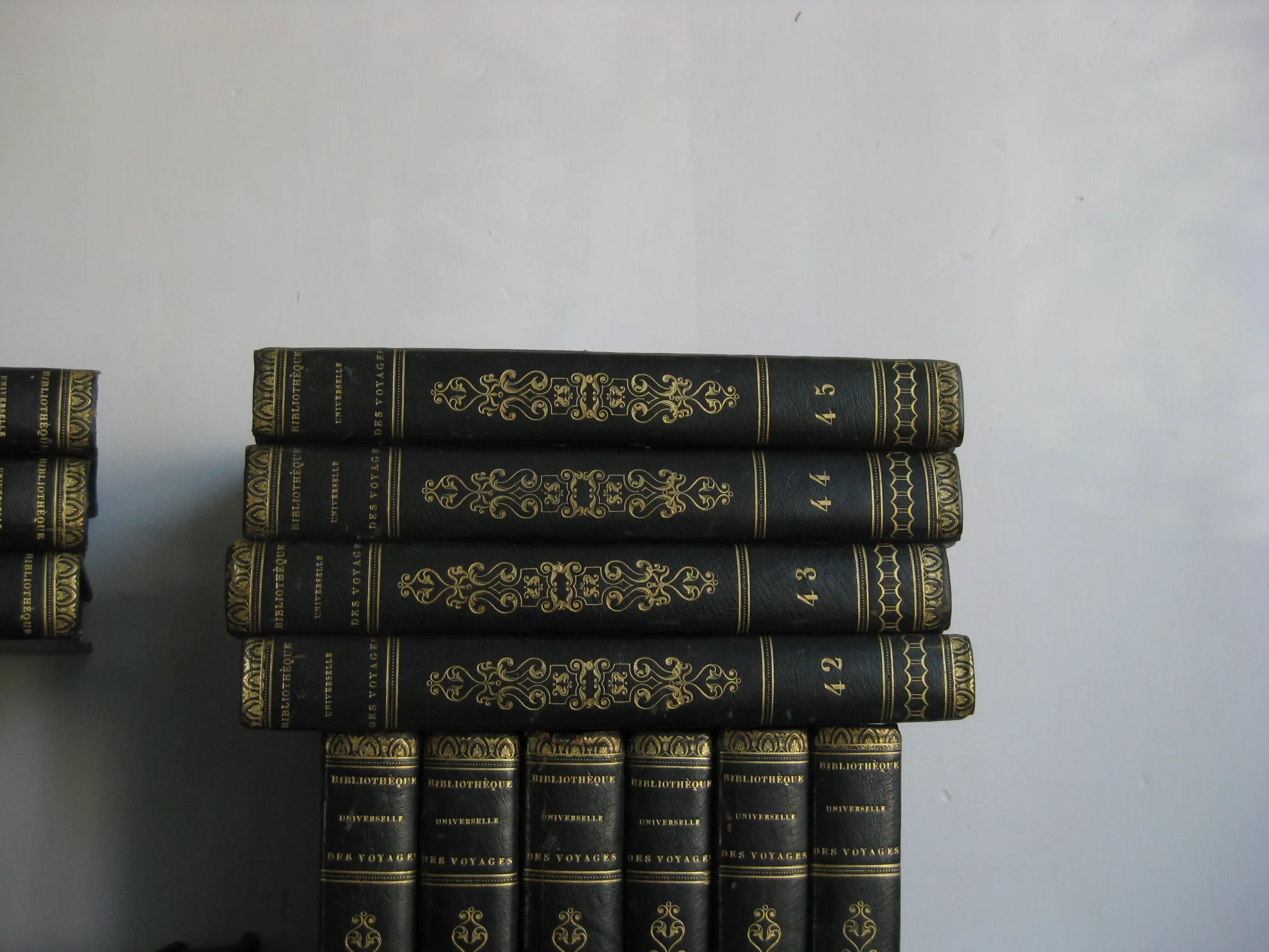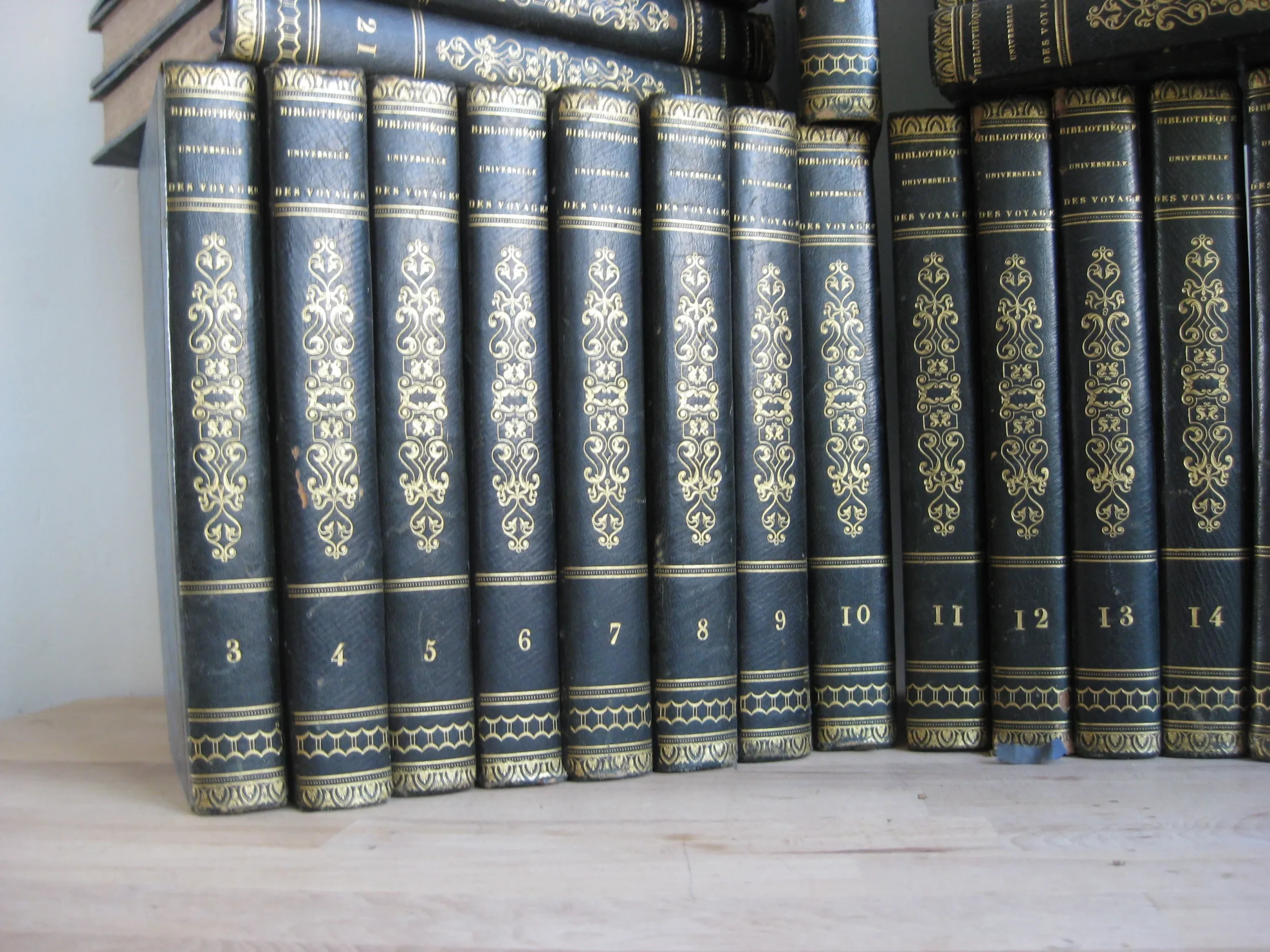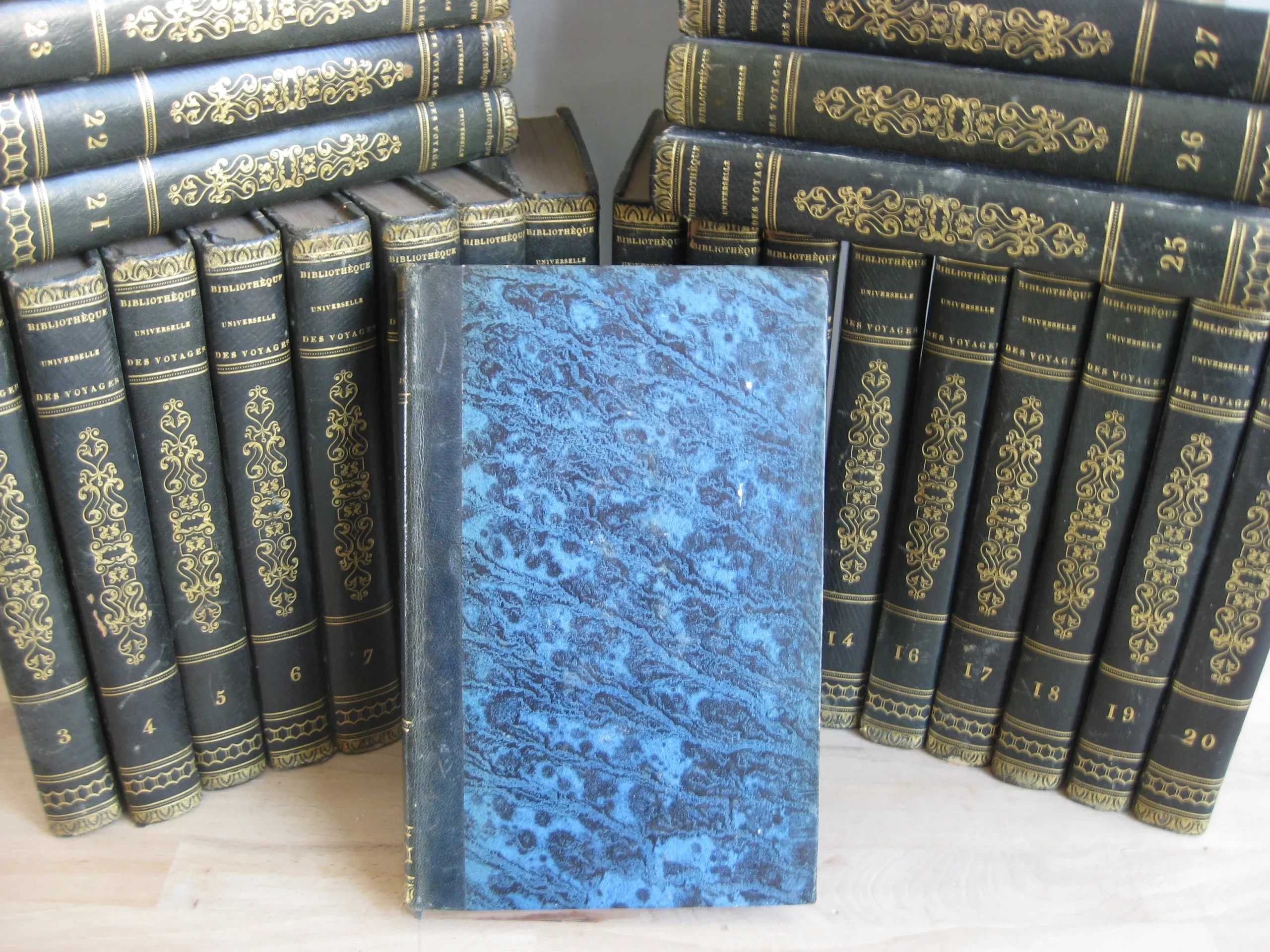 Demi-veau brun-bleu, plats papier marbré bleu, à dos long orné de frises en coiffe et queue, de liserés, du titre et de la tomaison, d’un joli décor en plein, 209 x 133, 1833-1837. Edition originale. Page de titre identique pour tous les volumes, tomaison reprise en page de faux-titre pour chaque volume. 43 volumes sur 46, soit les tomes manquant suivants : 2, 15, et 46. Pagination avec table, entre 450 et 500p. par volume. Intérieur propre pour tous les volumes. Des petits accidents aux reliures, frottement épidermures, petites déchirures sans manque, sauf pour 4 volumes, avec un défaut plus important : T11 et 25 : un coin de pied manquant ; T28 et 35, un manque en pied de dos. Sinon bel ensemble bien uniforme. Édition originale de cette importante compilation de voyages, publiés, revus et parfois traduits par Albert Montémont.  Les 21 premiers volumes concernent les relations de voyages autour du monde; viennent ensuite les voyages en Afrique (tomes 22 à 30), en Asie (tomes 31 à 37), en Amérique (tomes 38 à 42), en Océanie (tome 43), puis en Europe (tomes 44 à 46). Afrique, Asie, Océanie, Amérique sont donc ici complets, hors planches.
