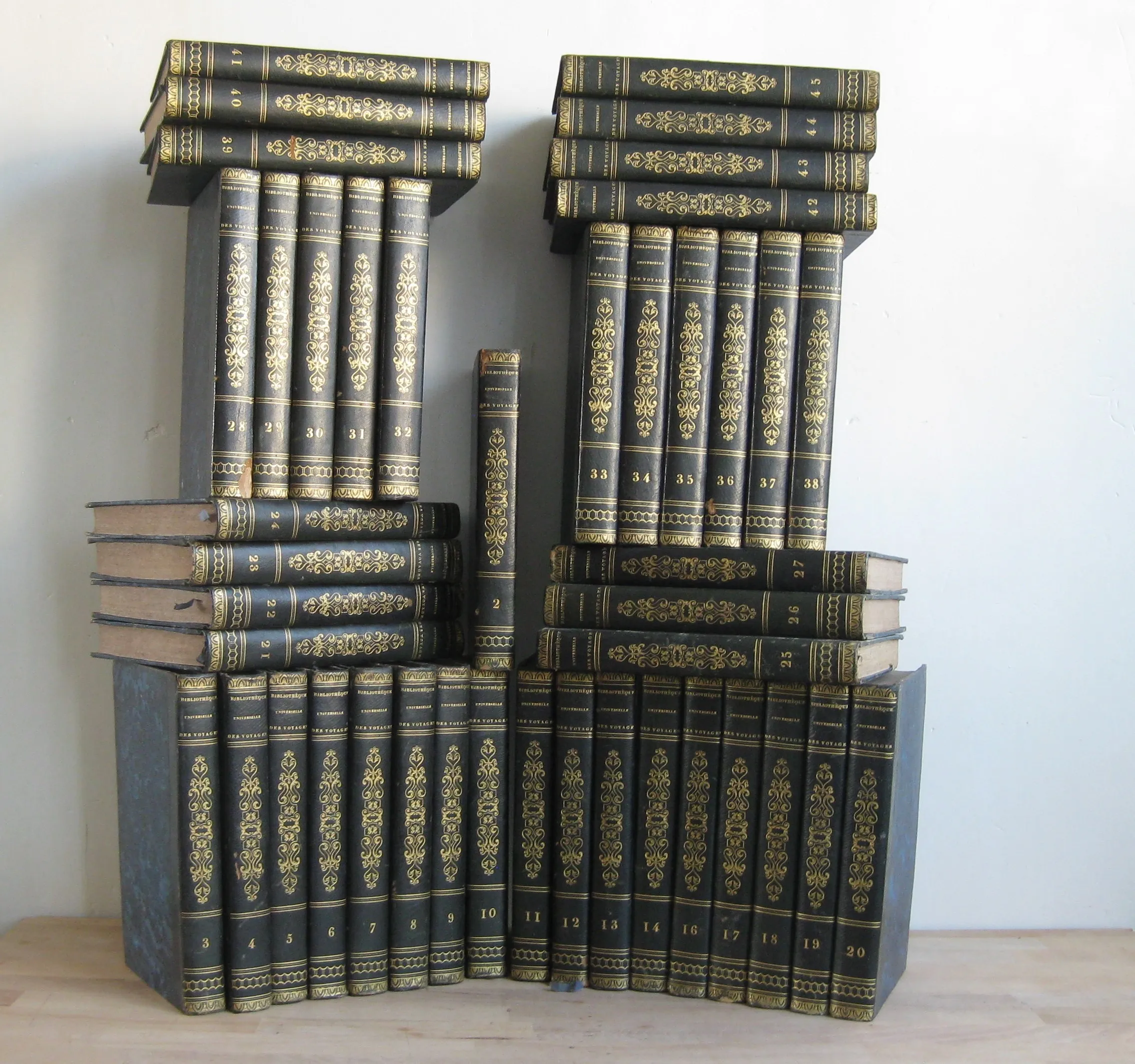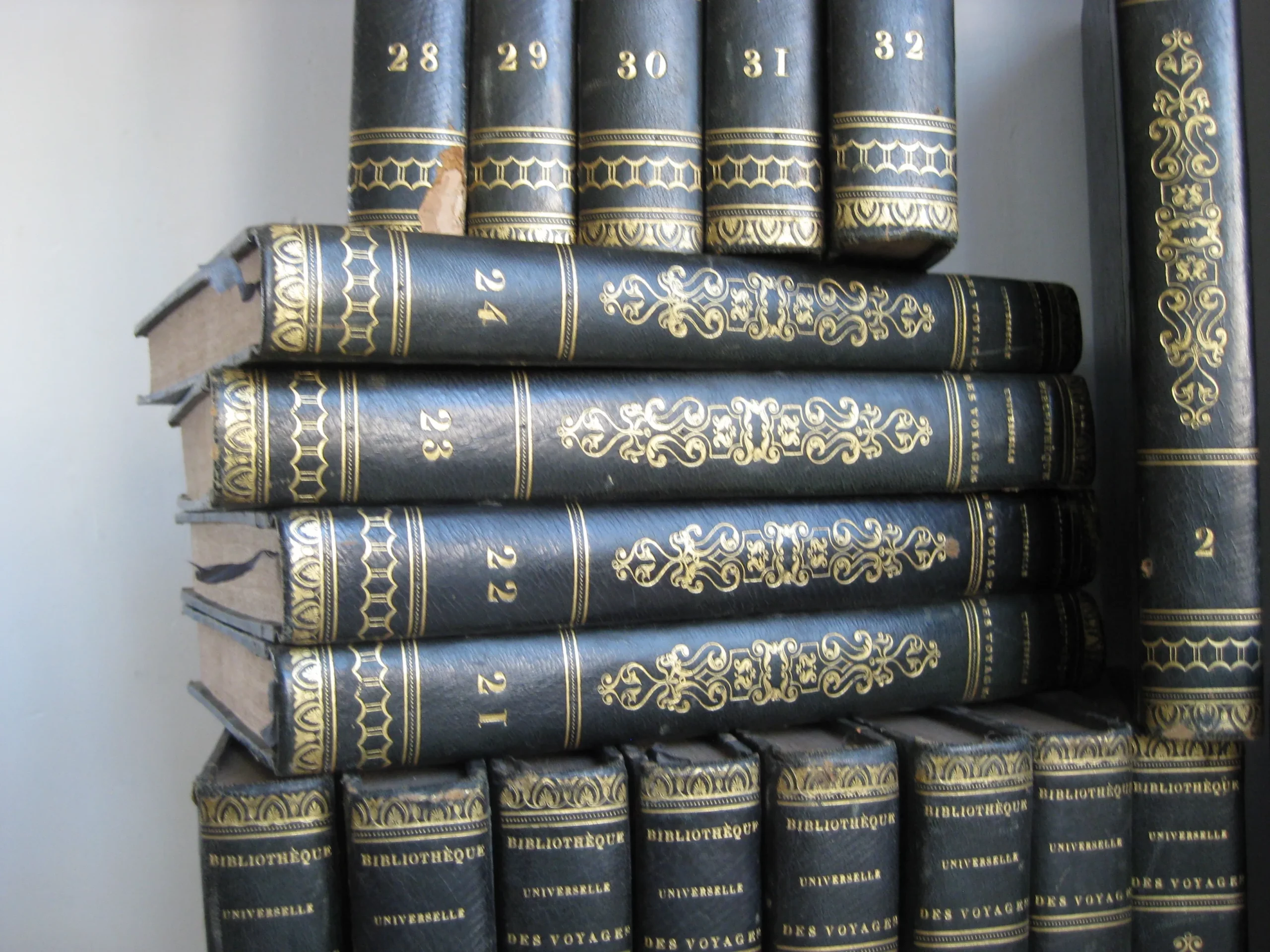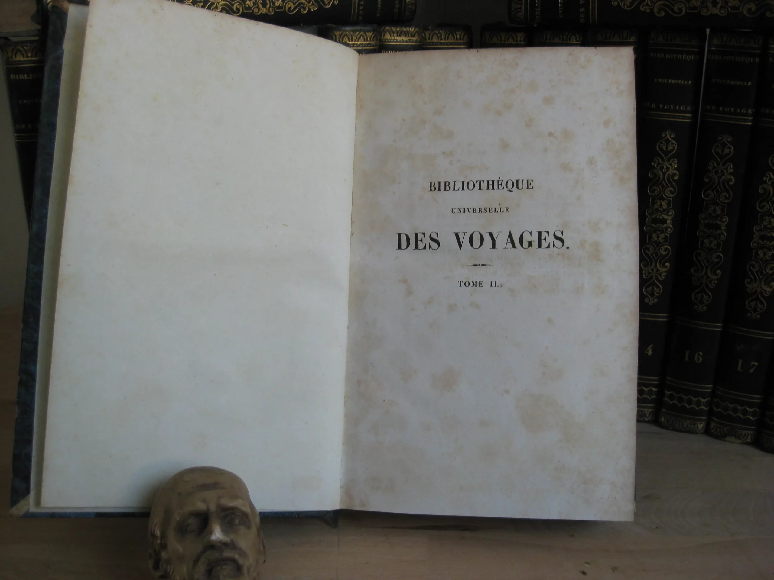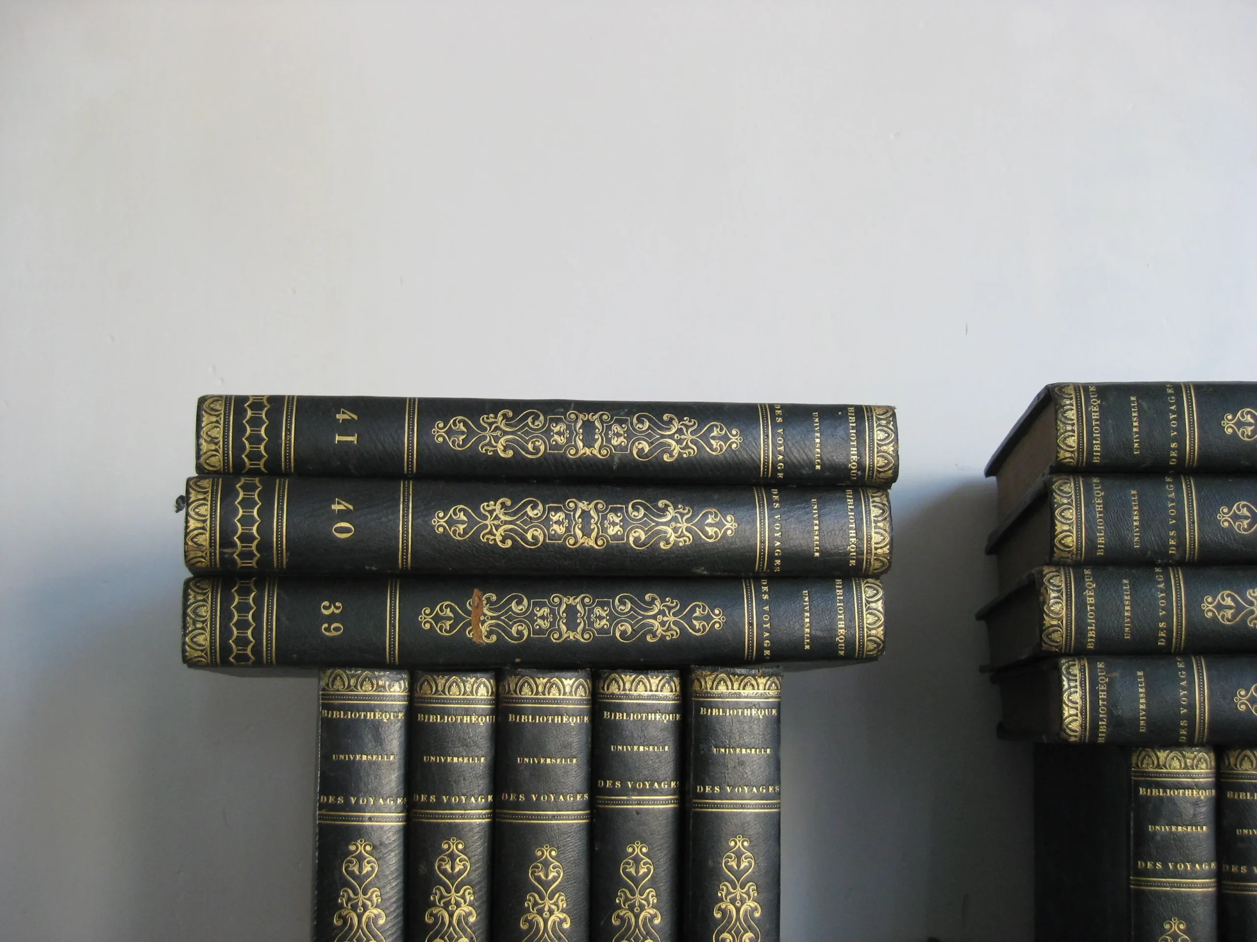 Demi-veau brun-bleu, plats papier marbré bleu, à dos long orné de frises en coiffe et queue, de liserés, du titre et de la tomaison, d’un joli décor en plein, 209 x 133, 1833-1837. Edition originale. Page de titre identique pour tous les volumes, tomaison reprise en page de faux-titre pour chaque volume. 43 volumes sur 46, soit les tomes manquant suivants : 2, 15, et 46. Pagination avec table, entre 450 et 500p. par volume. Intérieur propre pour tous les volumes. Des petits accidents aux reliures, frottement épidermures, petites déchirures sans manque, sauf pour 4 volumes, avec un défaut plus important : T11 et 25 : un coin de pied manquant ; T28 et 35, un manque en pied de dos. Sinon bel ensemble bien uniforme. Édition originale de cette importante compilation de voyages, publiés, revus et parfois traduits par Albert Montémont.  Les 21 premiers volumes concernent les relations de voyages autour du monde; viennent ensuite les voyages en Afrique (tomes 22 à 30), en Asie (tomes 31 à 37), en Amérique (tomes 38 à 42), en Océanie (tome 43), puis en Europe (tomes 44 à 46). Afrique, Asie, Océanie, Amérique sont donc ici complets, hors planches.