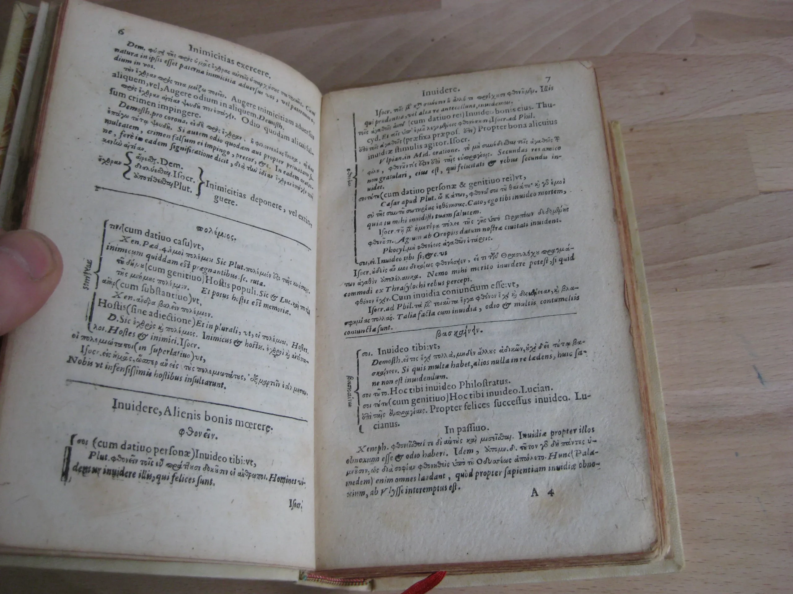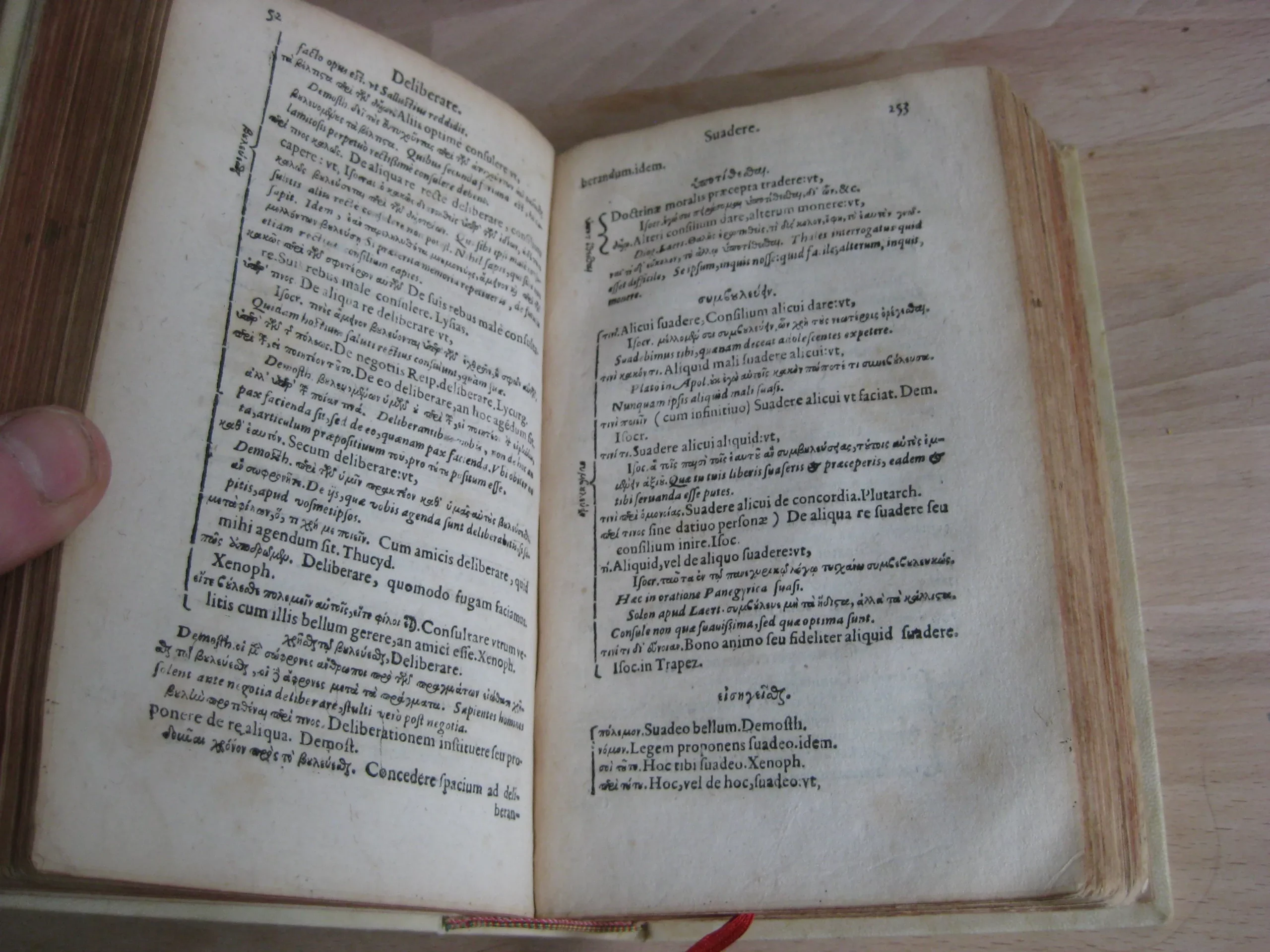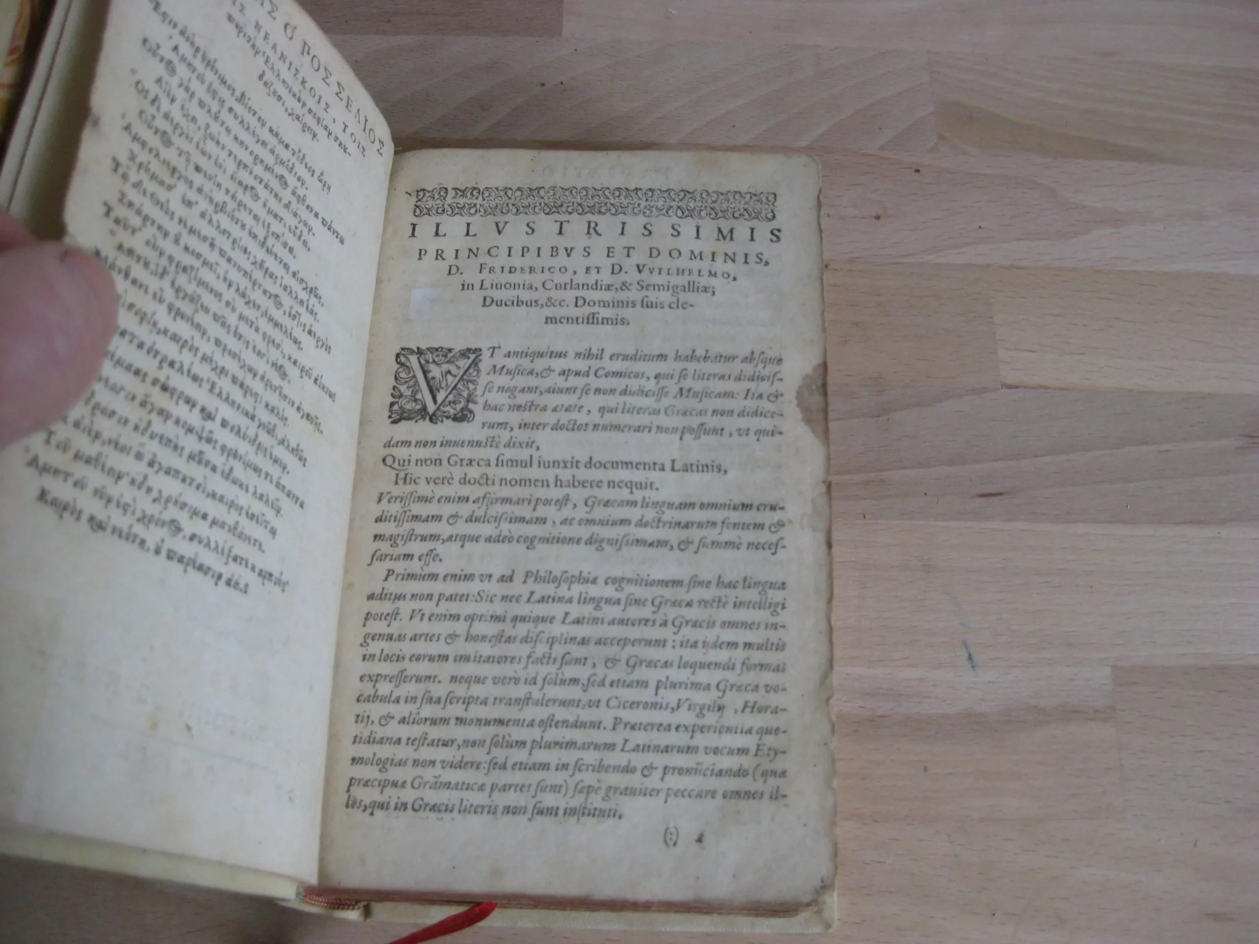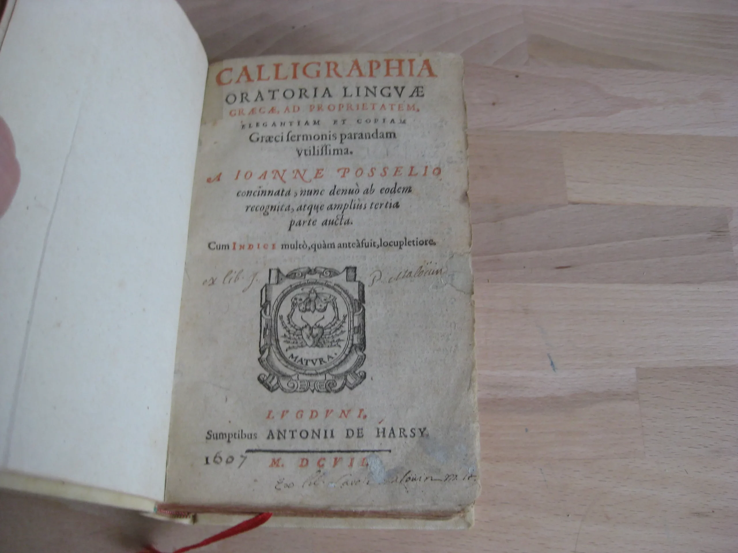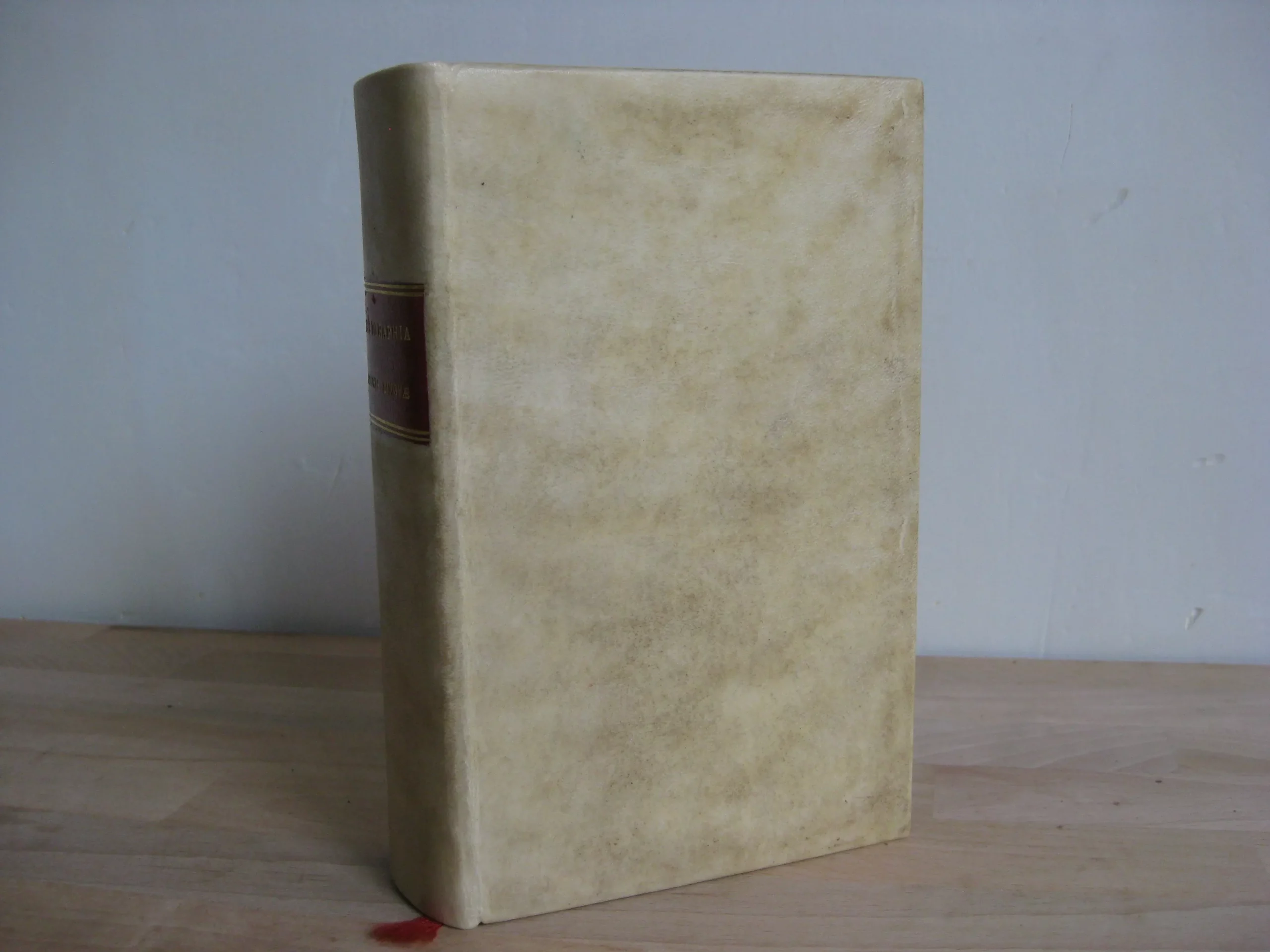 In-8, rel plein vélin rigide moderne, à dos long orné d’une pièce de titre en maroquin rouge, toutes tranches rouges, tranche fil, signet, 173 x 112, 669p. 1607. Au moins une édition antérieure (1594). Suivi de : Index in calligraphiam constructam, non paginé, 47p. Puis de Index in calligraphiam graecus, non paginé, 54p. Cul-de- lampe. Vignette au titre. Entête. 2 Lettrines. 2 ex-libris au titre de la même famille « J.P. Maloüin » et « Caroli Maloüin ». Traces de restauration au titre. Quelques taches en bordure de premières pages. Sinon intérieur globalement propre, insolé, rousseurs légères. Mouillures légères. Petit travail de vers dans les marges intérieures de plusieurs feuillets. La reliure est en excellent état. Très beau volume, bien ferme.
