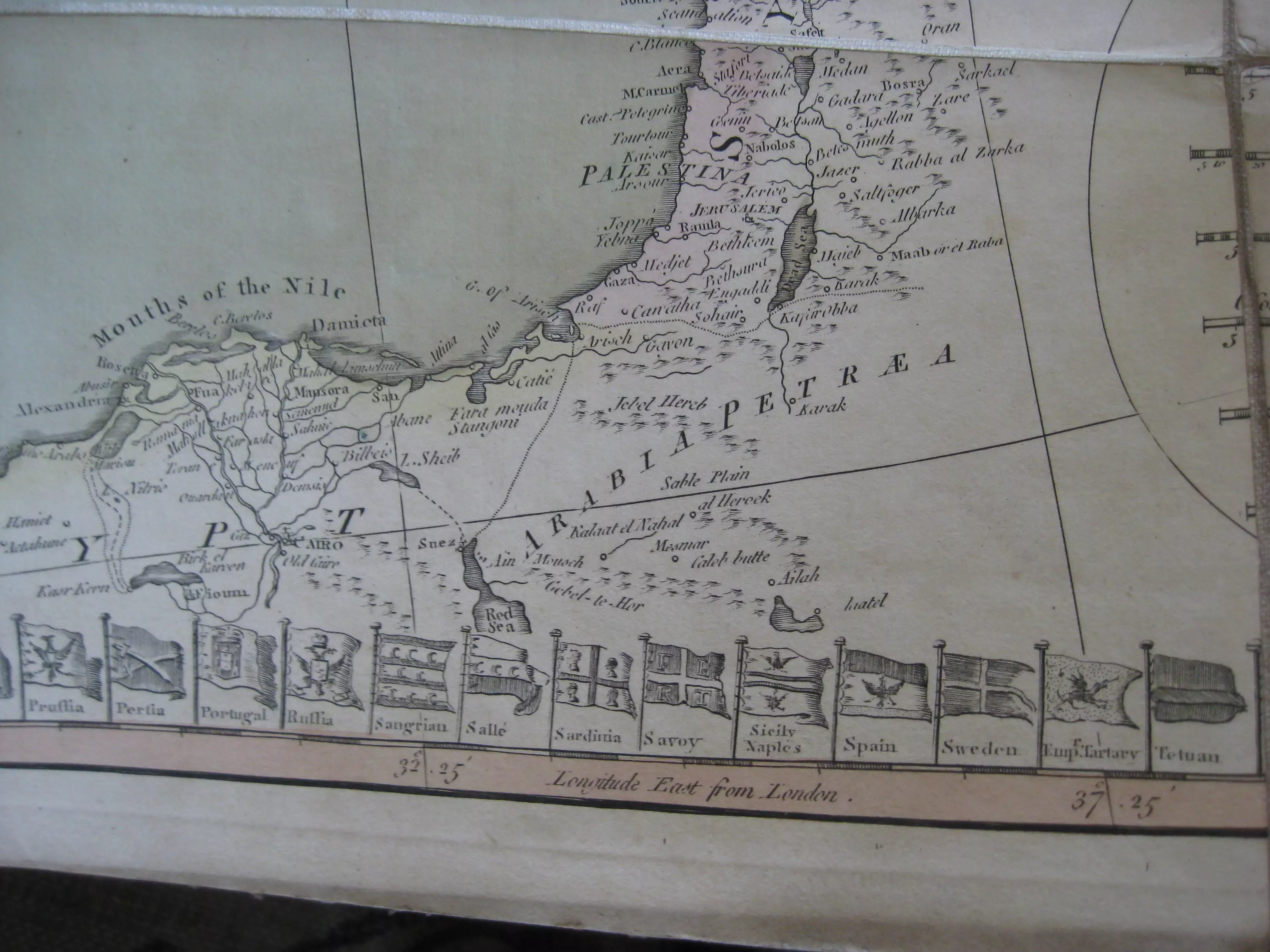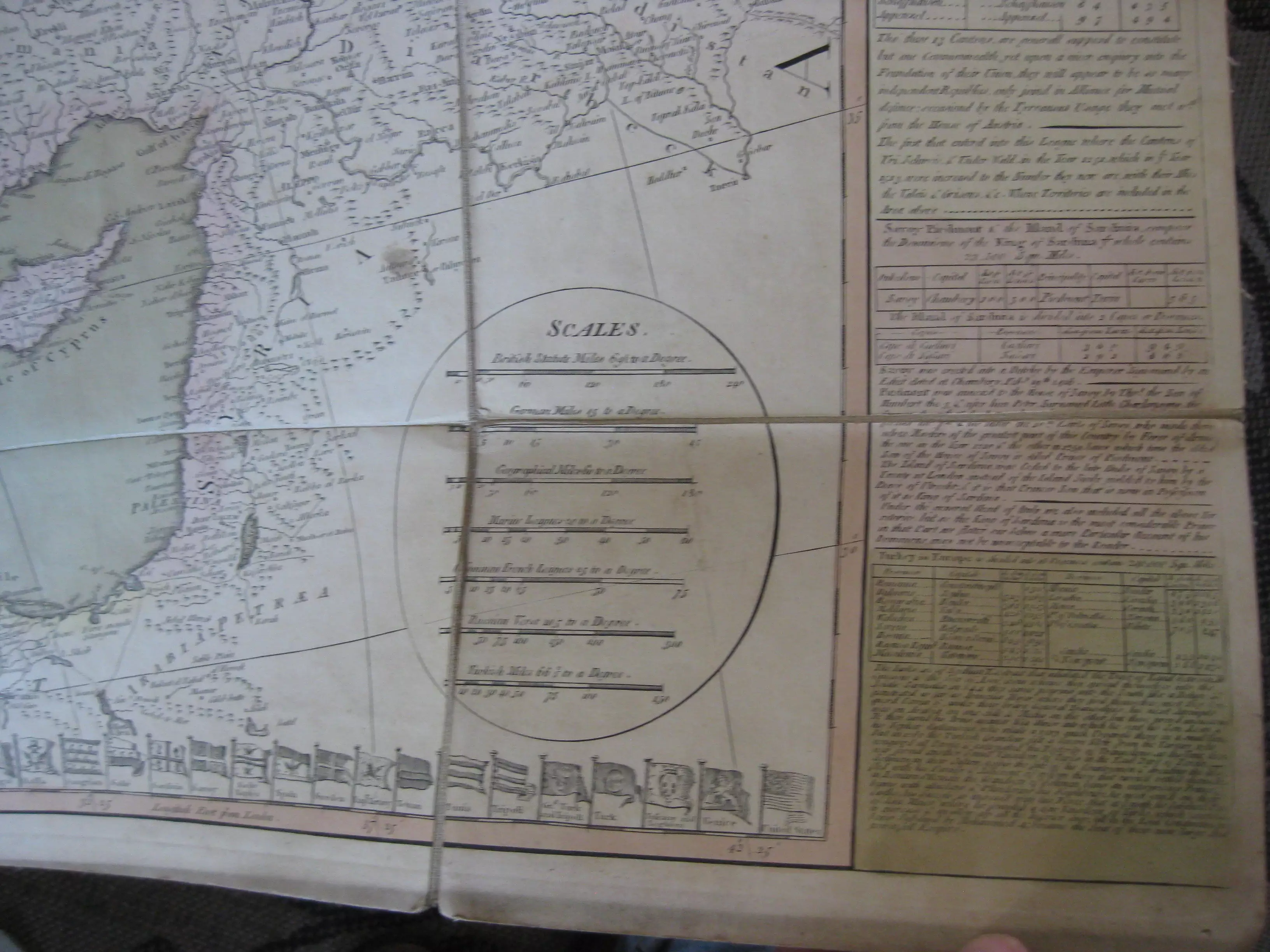 Grande carte entoilée [linen backed], 1250 x 1050. Coloriée à la main ; 3 pliures avec déchirures en marge haute, sinon bon exemplaire. Grande table en marges latérales, drapeaux en marge basse. 2 rabats cartonnés d’origine marbré/chiné vert de protection contre les le temps et l’usage [ folding map ou case map, conçue pour être facilement transportée dans une poche.]