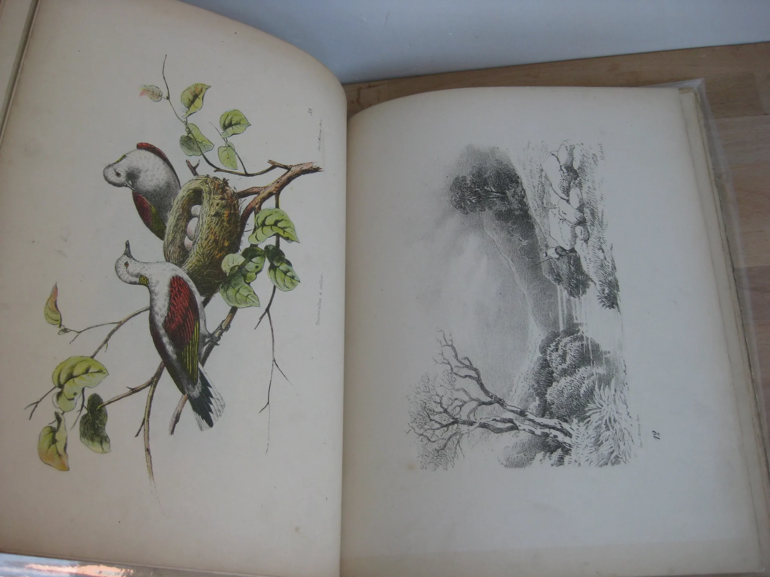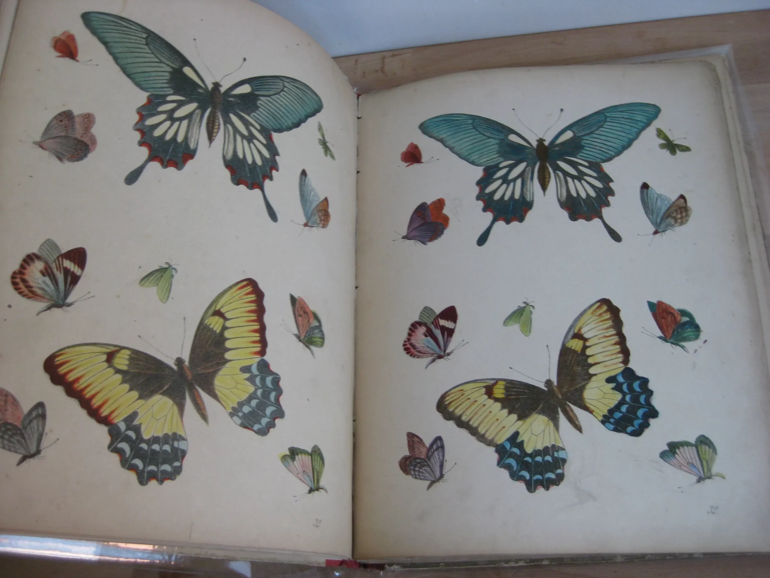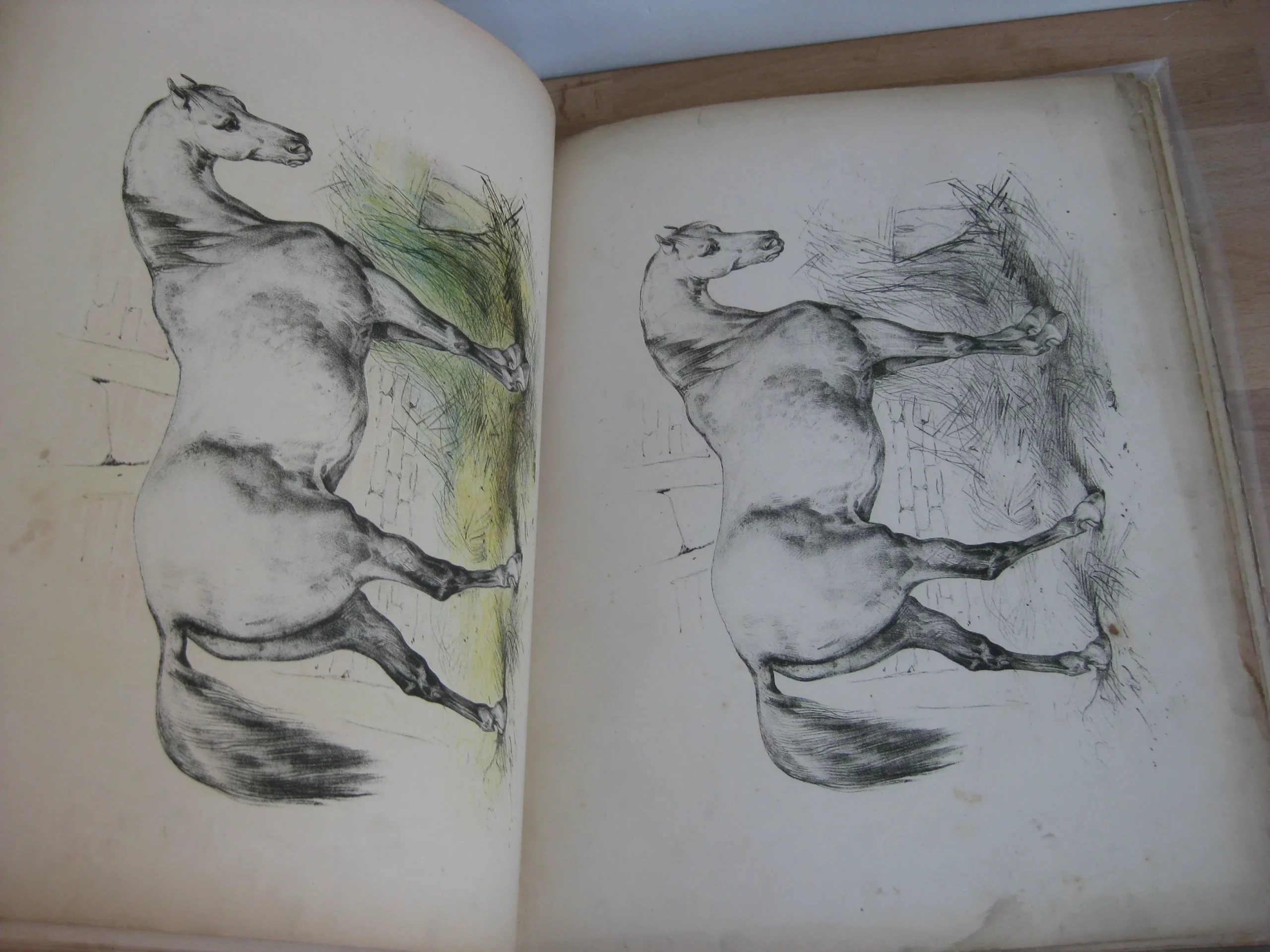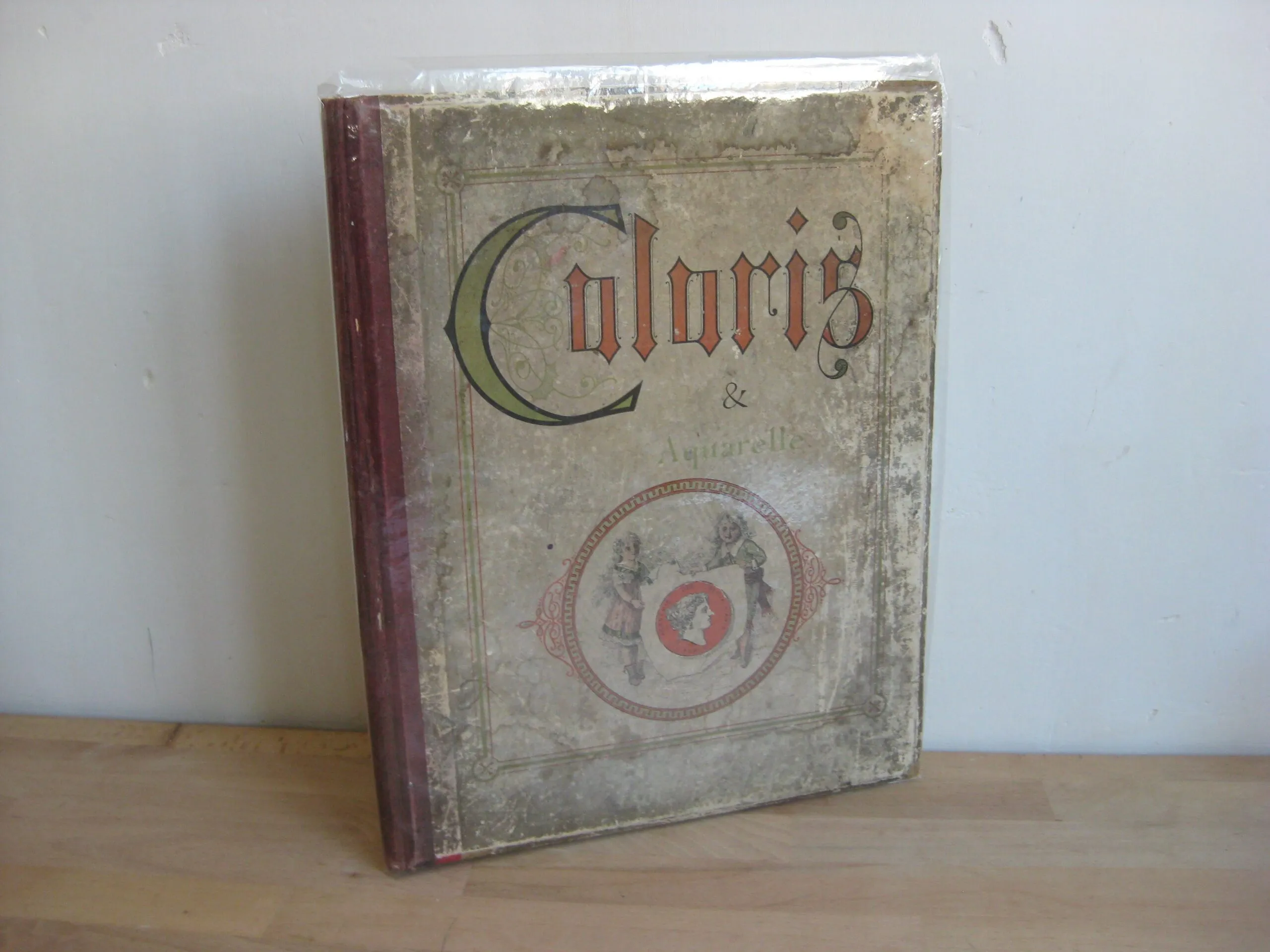 Demi-toilé rouge, 314 x 252, non paginé. Sans date. 1890 ca. Comprend des pages vierges et 15 dessins couleur (coloriés ou d’origine), et noir et blanc à colorier. 2 sont signés : l’un C. Chavatte et le second Geneviève Ledoux. Intérieur propre, pages légèrement insolées, quelques traces. Plats très frottés.