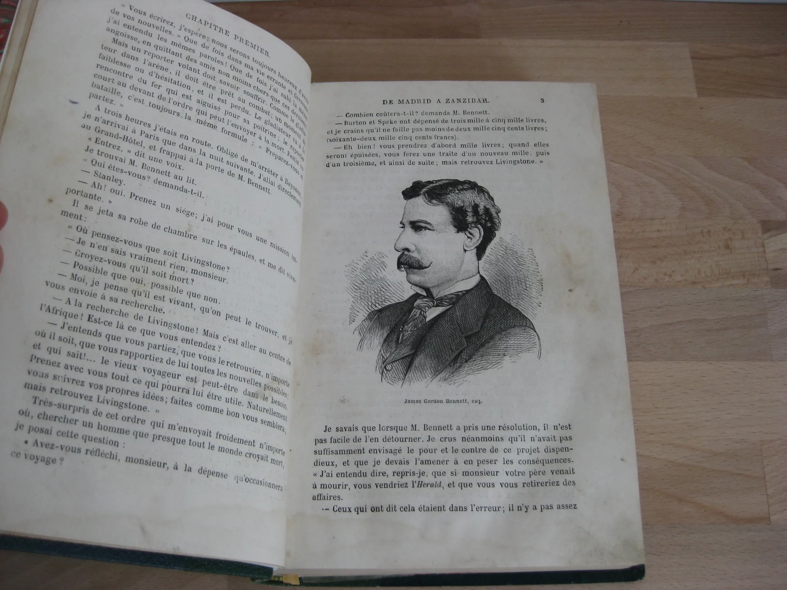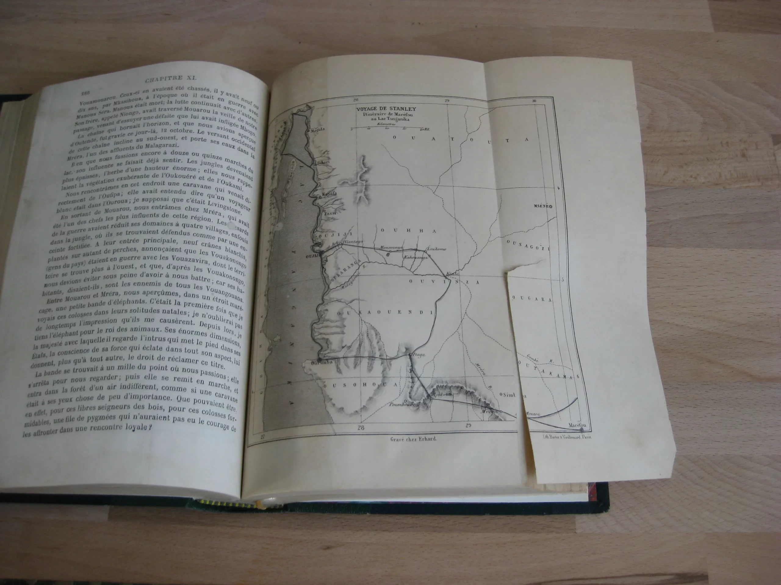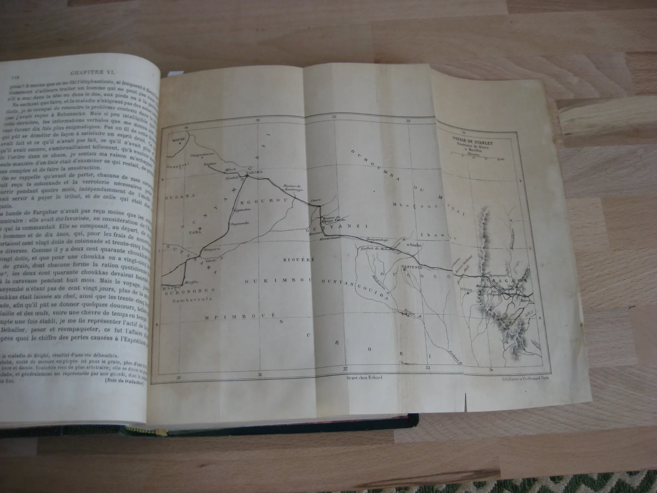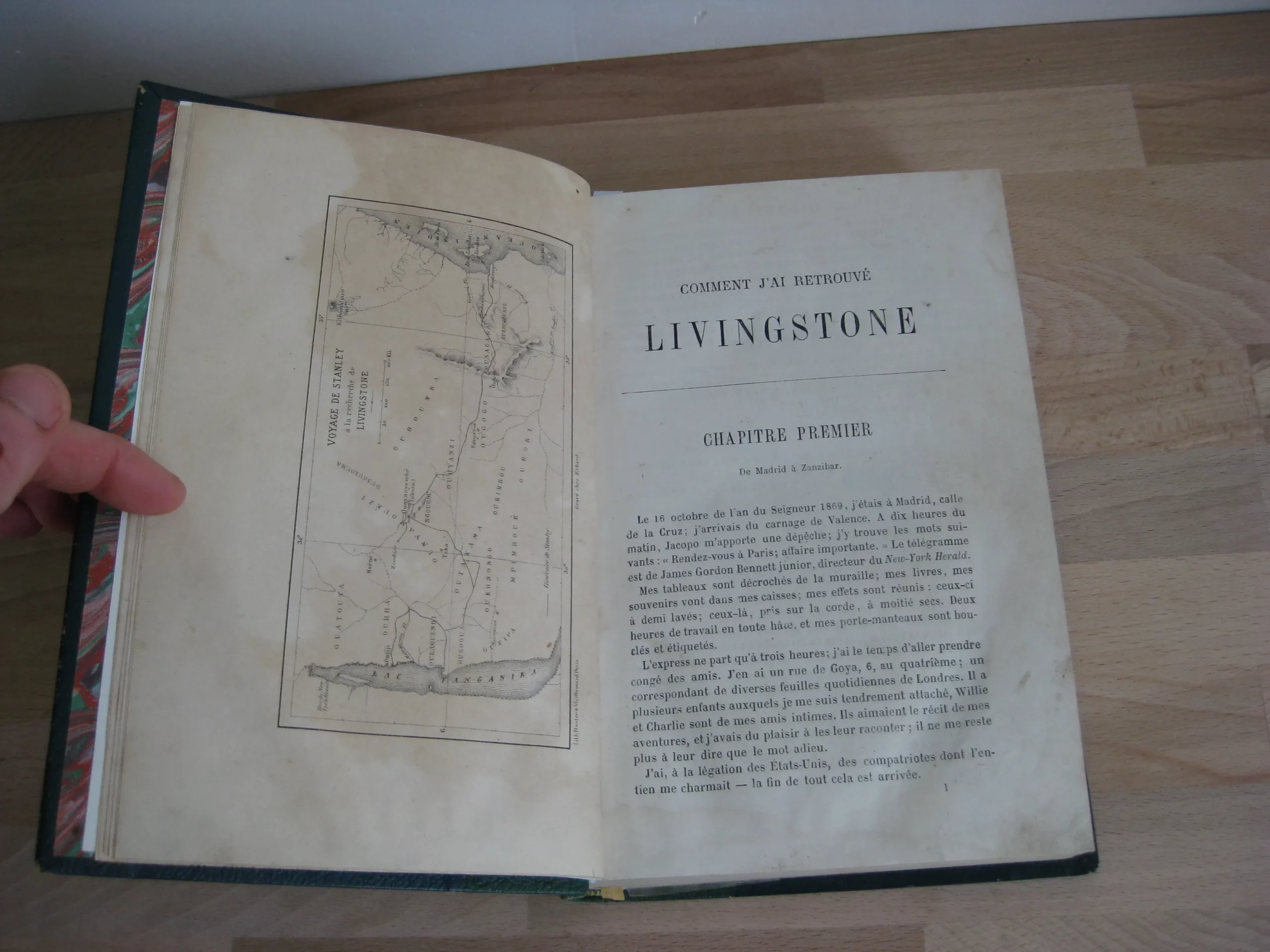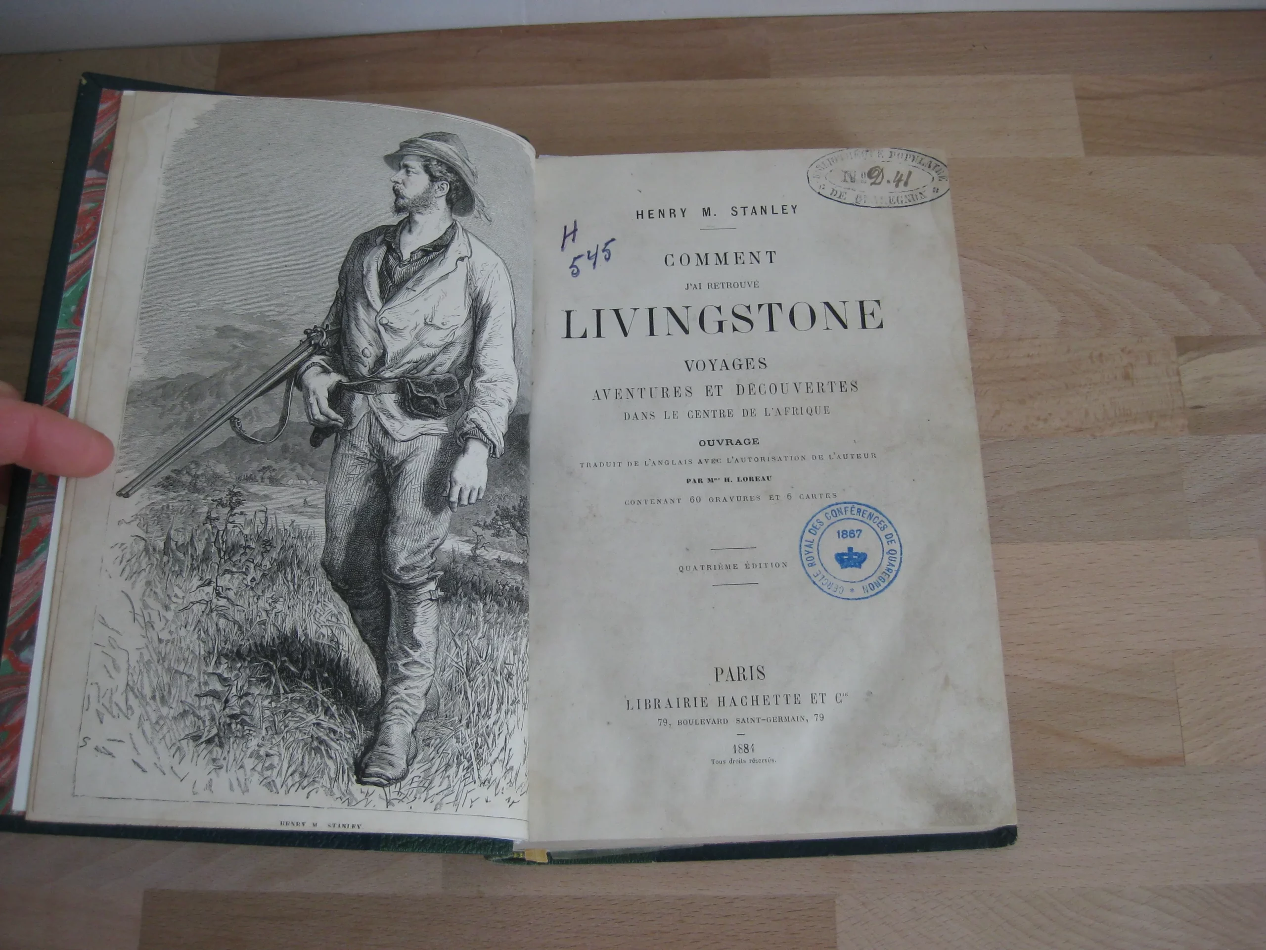 Librairie Hachette – Reliure moderne pleine simili chagrin vert deux tons, à dos long orné des titre et auteur, 230 x 156, 600 p ; Avec table. Ouvrage traduit de l’anglais. par Mme H. Loreau. 1884. Quatrième édition. Avec 60 gravures et 6 cartes, bien complet des six cartes. Feuillet blanc en début et fin de volume. Frontispice. Provenance : cercle royal de Quaregnon : Bibliothèque populaire de Quaregnon, comme l’indiquent les deux tampons en page de titre ; un code au titre également. Intérieur avec rousseurs traces en marges. Une carte avec déchirure sans manque dans la pliure. Une autre avec déchirures consolidées avec bandes adhésives et un manque à une pliure. Bien complet de son appendice avant la table. Coins frottés avec épidermures, mais reliure en très bel état. Bel exemplaire. Comment j’ai retrouvé Livingstone est une histoire vraie racontée par Henry Morton Stanley, chargé par le directeur du New York Herald de retrouver le missionnaire et explorateur David Livingstone. Ce récit d’expédition riche en anecdotes décrit aussi les paysages et les coutumes de la région, mal connue à l’époque
