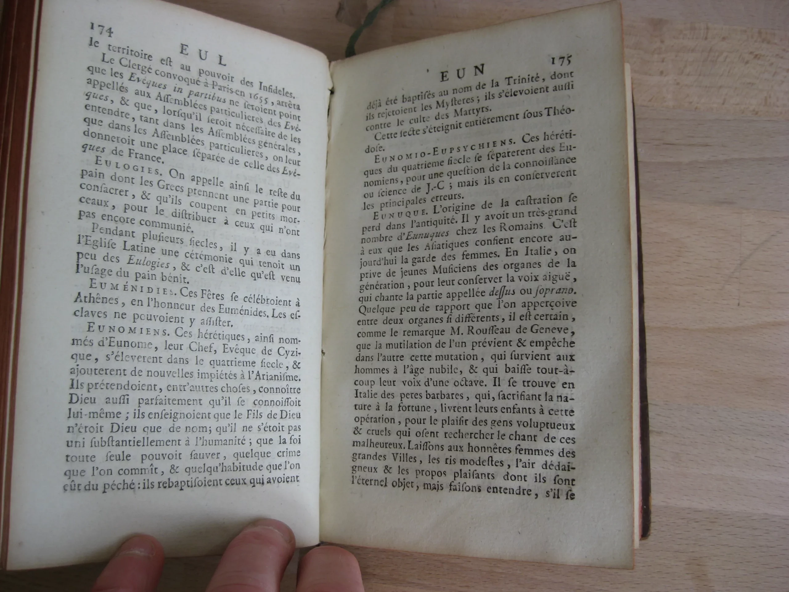 Chez Jean-François Bastien – Plein veau marbré, dos à nerfs, orné aux caissons, sans pièces de titre, tranches rouges, signet. 170 x 112, A-D, 470 p. et. E-G, 458p. 1777. rare première édition pour ces deux volumes d’un dictionnaire qui en compte 6. Pour les deux volumes intérieur propre, tranches propres. Pages de garde du T2 qui se détachent.Coins et champs frottés, 2 coins légèrement émoussés. Plats frottés avec griffes et épidermures parfois marquées. En plat inférieur du T1, une mouillure ancienne et un petit manque. Mors frottés, épidermures, mais bons, tête du mors inférieur du T1 fendu. Dos frottés, muets (ni tomaison, ni pièce de titre), coiffe manquante au T1, en partie manque au T2, un manque en queae du t2. Exemplaires bien fermes.