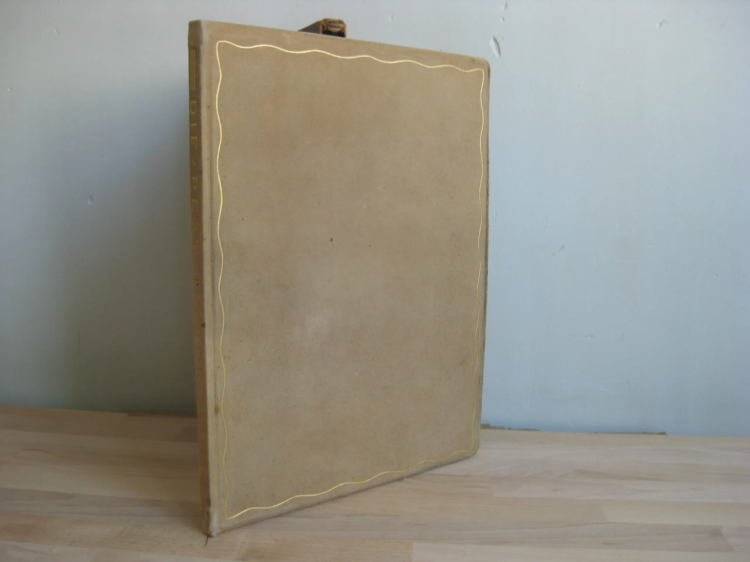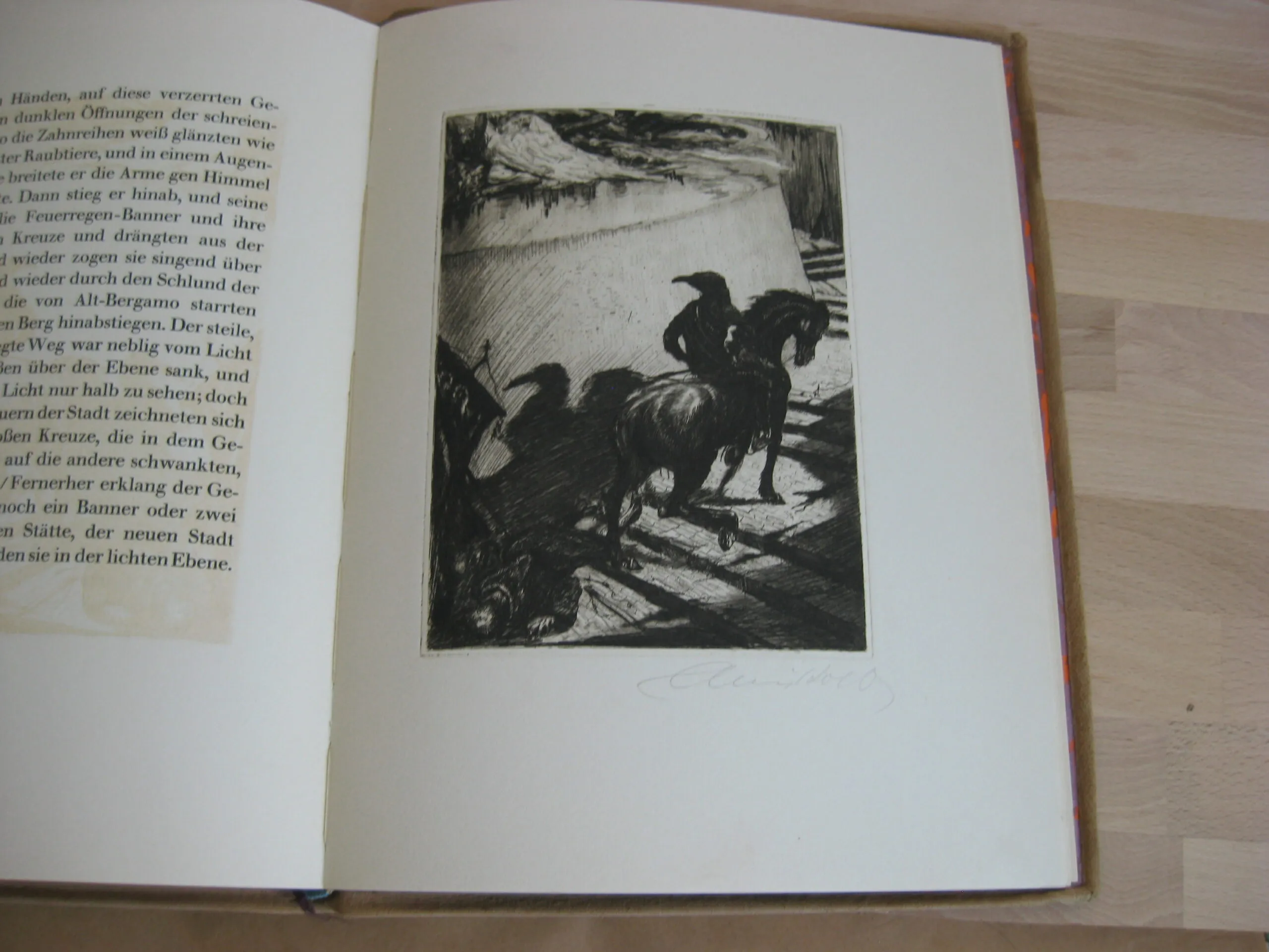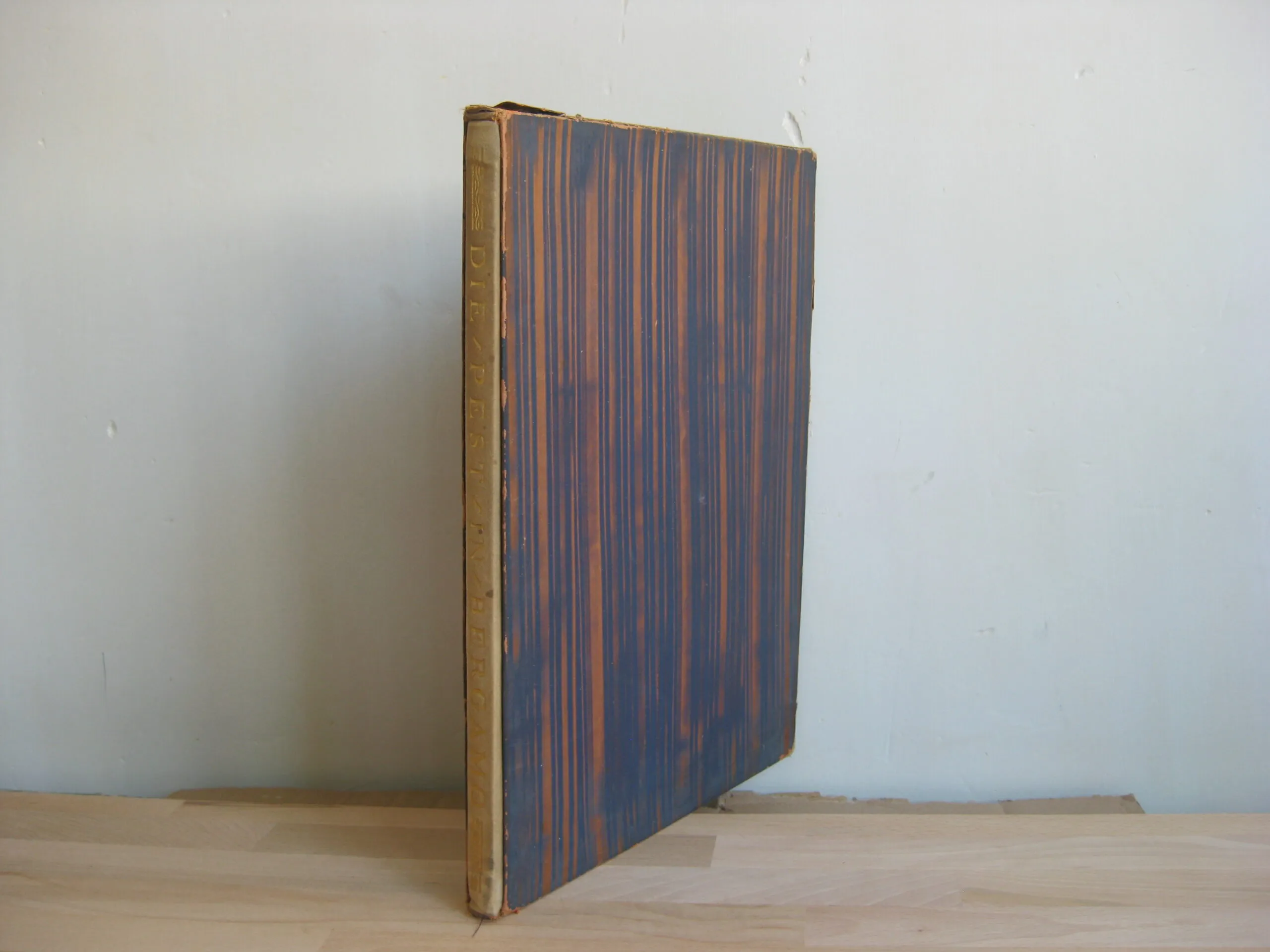 Small folio (30.5 x 23.5 cm) in a slipcase with slightly moiré blue and copper stripes, full blond reversed leather with overlapping edges, long spine decorated with the title and two friezes in an art deco style, gilded top edge, covers decorated with a wavy gilded filer (erased on the lower cover), pretty paper on the endpapers and pastedowns in an art deco style, mauve silk bookmark, unpaginated, 1922. 2 blank leaves, publisher's leaf and finish printing, half-title, engraved title, followed by the 14 leaves of the work. Then justification of the print run, and 2 blank leaves. First edition numbered 69 out of four hundred copies in the translation by Leo Johannes Feddersen. This print run is justified in full leather with full-page engravings signed by the artist by hand. Engraved title and eleven original engravings, printed under the direction of the artist on the hand press of the State Academy of Graphic Arts and Book Trade in Leipzig. Distributed as follows: 5 signed full-page engravings, and 1 heading, 1 small vignette and a drop cap, and three large vignettes in the text. The composition and printing of the text were carried out at the Walbaum-Antiqua on handmade paper under the direction of Professor Georg A. Mather in the workshops of the State Academy. All bindings are handmade in the workshop of H. Sperling in Leipzig. Interior impeccable, clean and intact. Skin in good condition, rubbed with light scuffs and rare stains. Spine lightly rubbed but in good condition. Slipcase slightly sunned and rubbed with small tears at the corners, and a small dent on the spine.