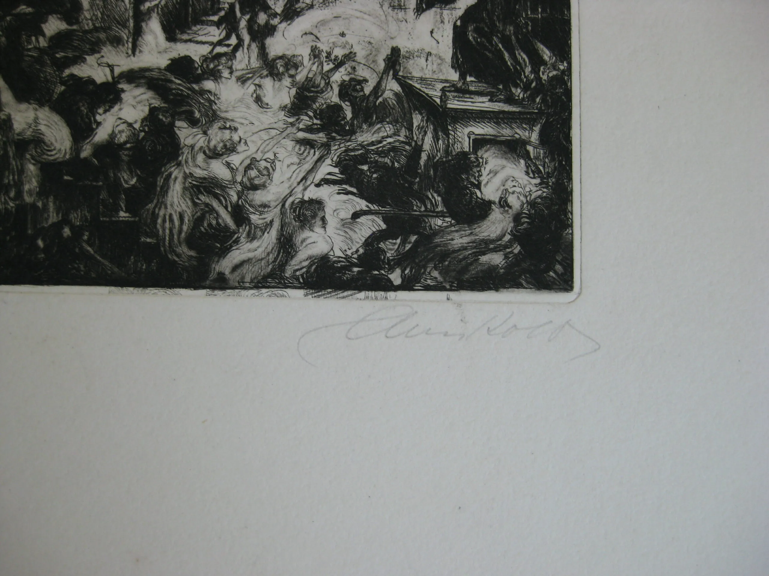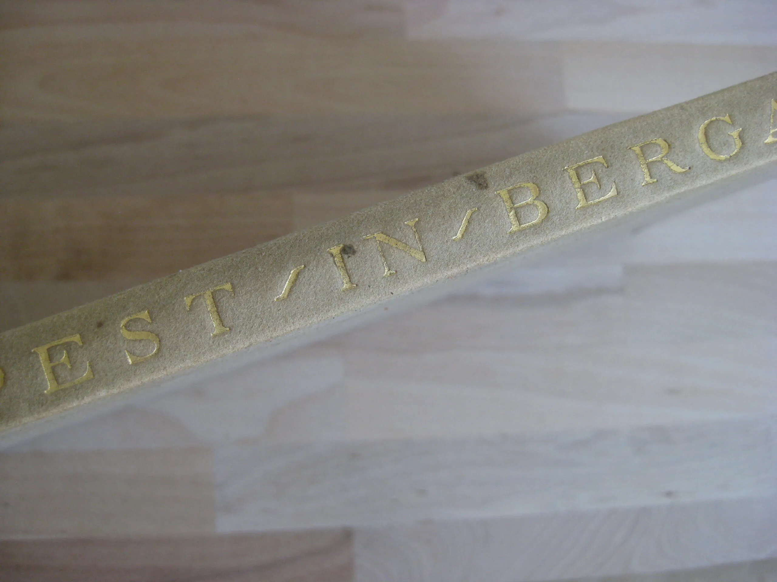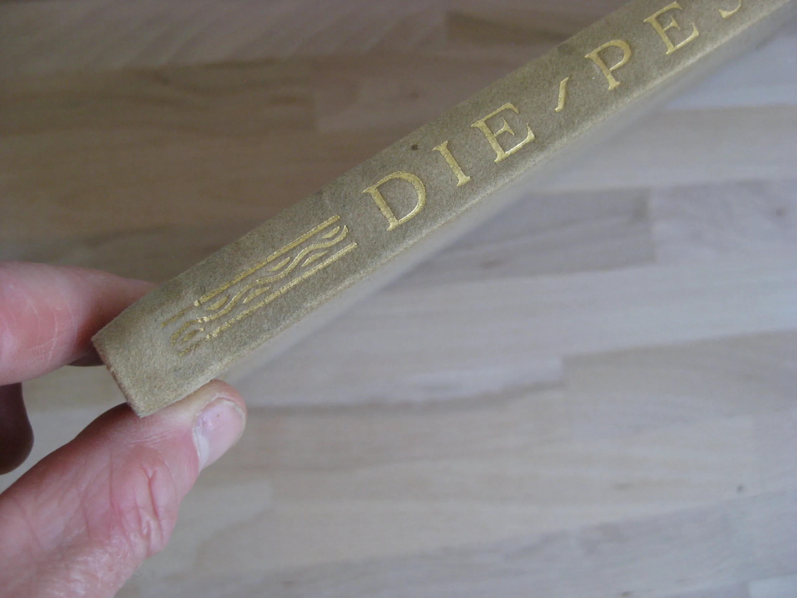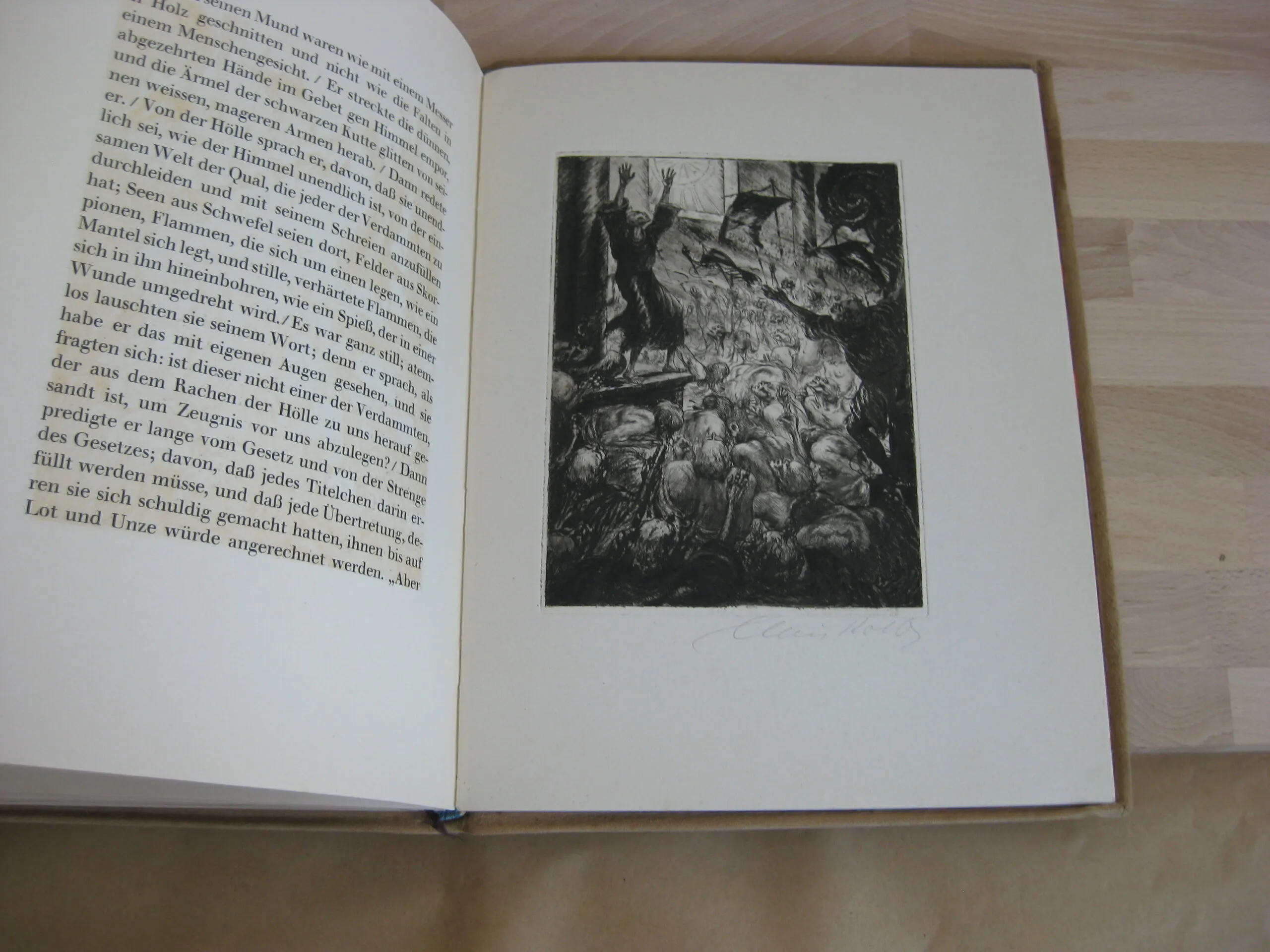 Small folio (30.5 x 23.5 cm) in a slipcase with slightly moiré blue and copper stripes, full blond reversed leather with overlapping edges, long spine decorated with the title and two friezes in an art deco style, gilded top edge, covers decorated with a wavy gilded filer (erased on the lower cover), pretty paper on the endpapers and pastedowns in an art deco style, mauve silk bookmark, unpaginated, 1922. 2 blank leaves, publisher's leaf and finish printing, half-title, engraved title, followed by the 14 leaves of the work. Then justification of the print run, and 2 blank leaves. First edition numbered 69 out of four hundred copies in the translation by Leo Johannes Feddersen. This print run is justified in full leather with full-page engravings signed by the artist by hand. Engraved title and eleven original engravings, printed under the direction of the artist on the hand press of the State Academy of Graphic Arts and Book Trade in Leipzig. Distributed as follows: 5 signed full-page engravings, and 1 heading, 1 small vignette and a drop cap, and three large vignettes in the text. The composition and printing of the text were carried out at the Walbaum-Antiqua on handmade paper under the direction of Professor Georg A. Mather in the workshops of the State Academy. All bindings are handmade in the workshop of H. Sperling in Leipzig. Interior impeccable, clean and intact. Skin in good condition, rubbed with light scuffs and rare stains. Spine lightly rubbed but in good condition. Slipcase slightly sunned and rubbed with small tears at the corners, and a small dent on the spine.