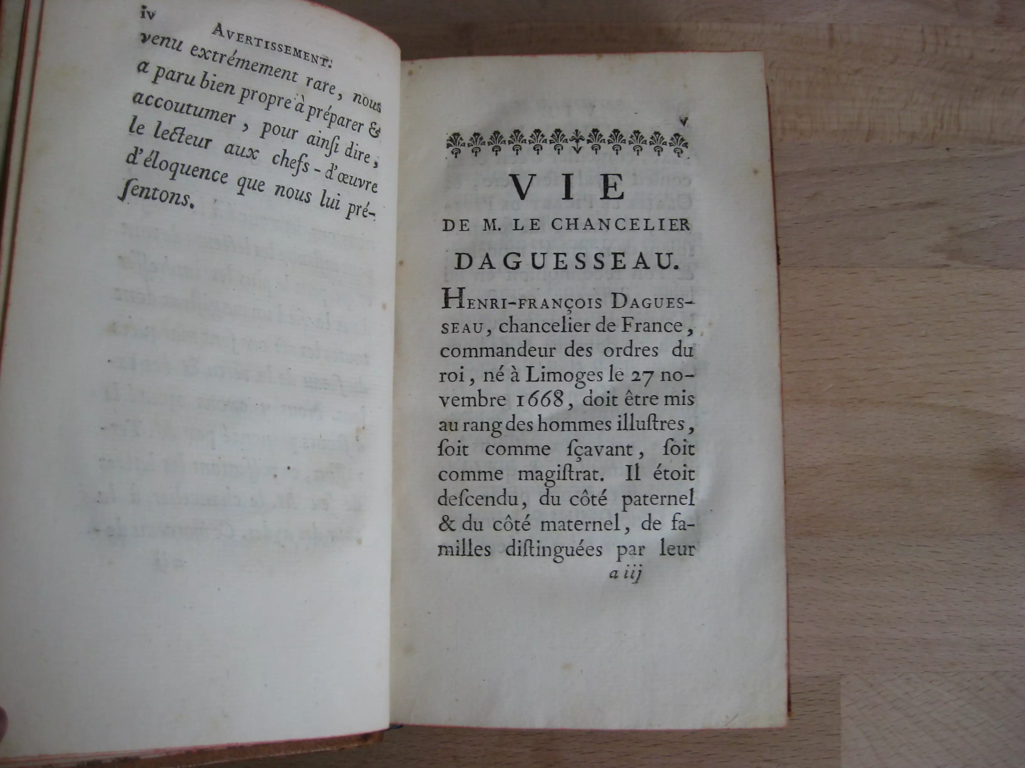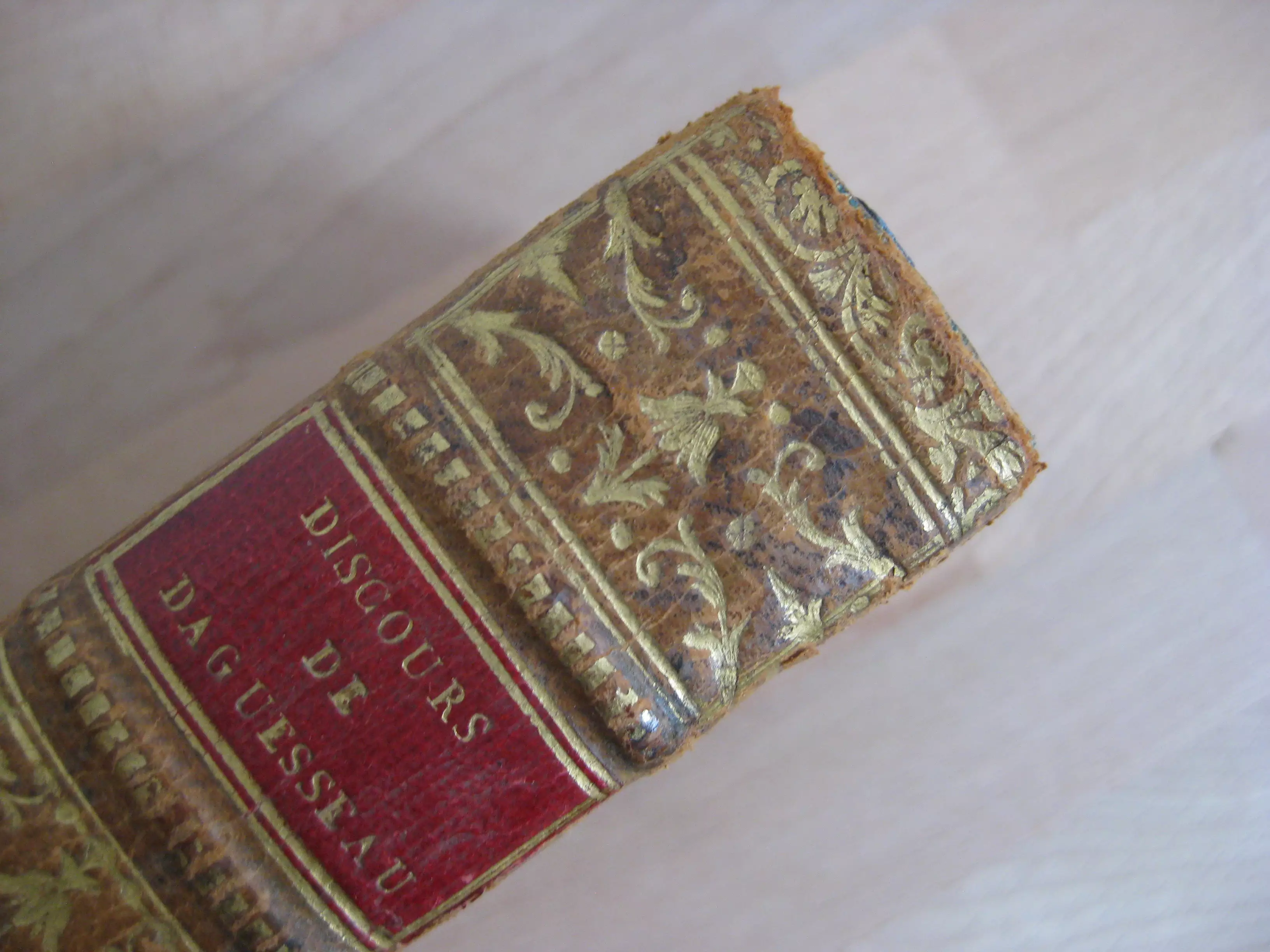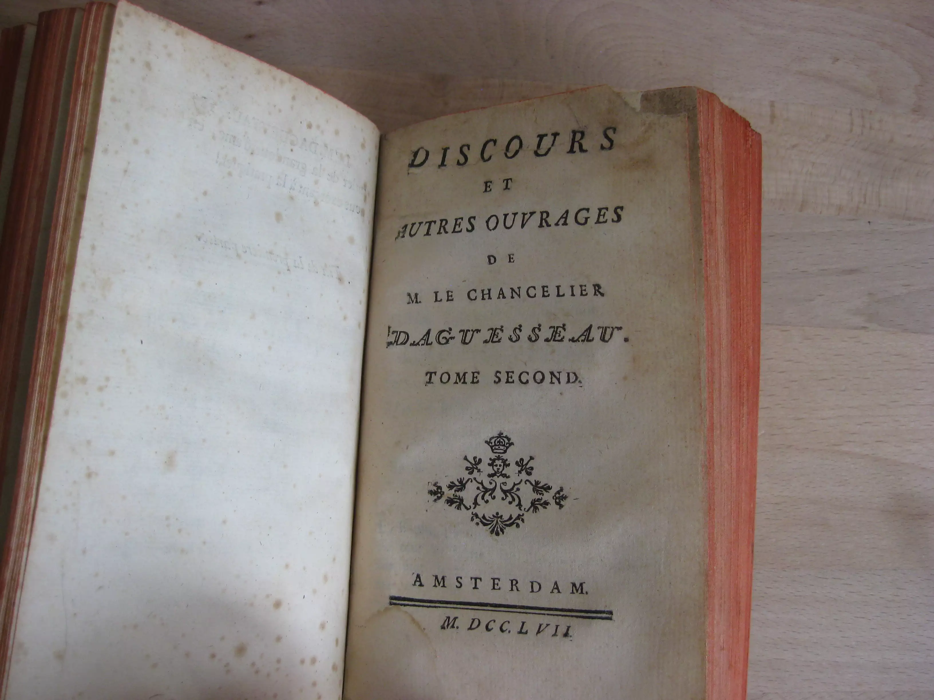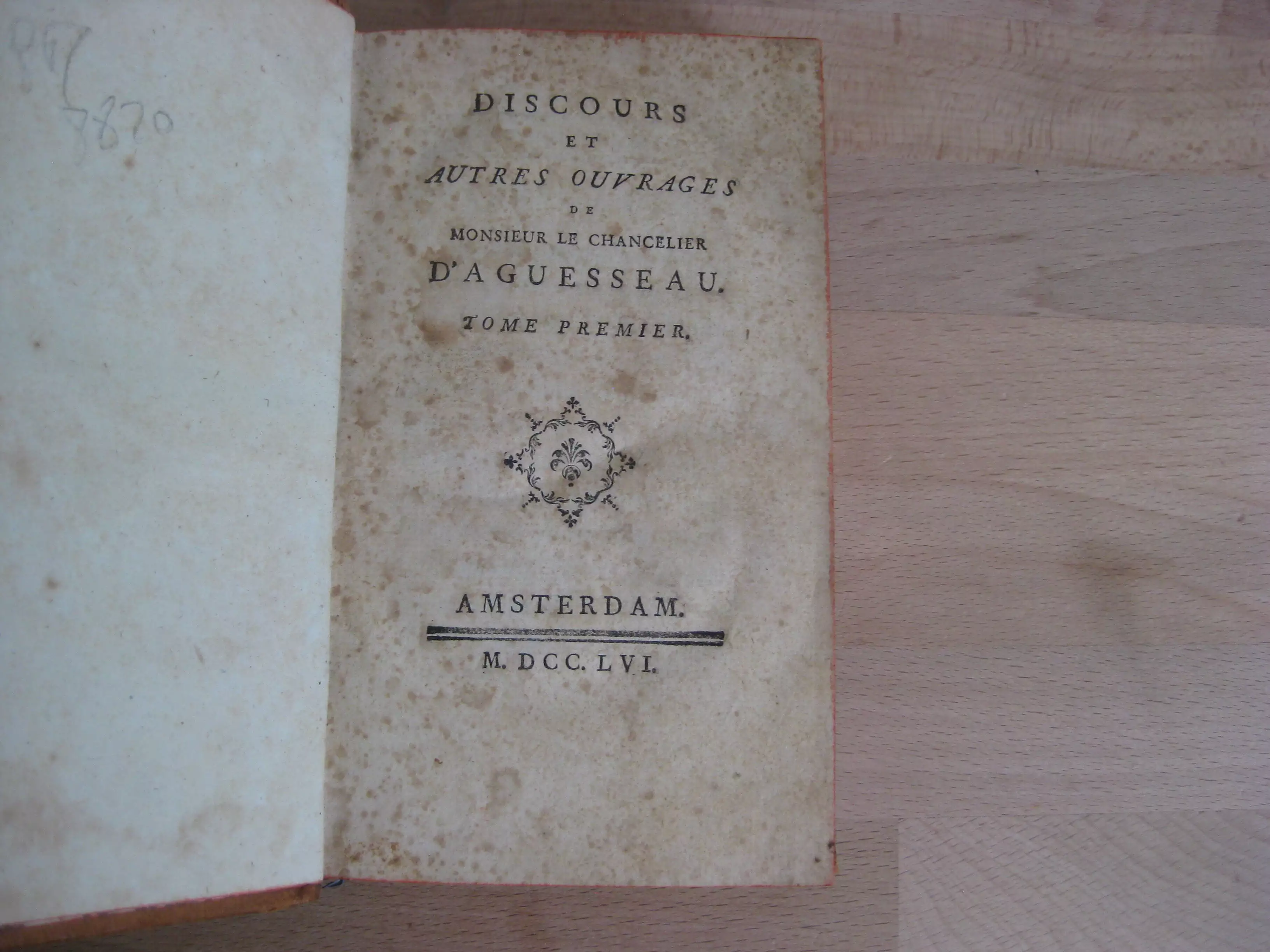 DescriptionS.N.Amsterdam – Plein veau marbré, dos à cinq nerfs richement orné, pièce de titre rouge, tranches rouges, 174 x 103, 1756 et 1757 (T2). Précédé pour le T1 de : Avertissement ; Une vie de M. le Chancelier d’Aguesseau ; Discours prononcé par M. Terrasson ; Extrait de l’histoire de Saintonge, par Armand Maichin, sur la famille d’Aguesseau, paginés ii- lxij. Tome I sans table, T2 avec table in fine.