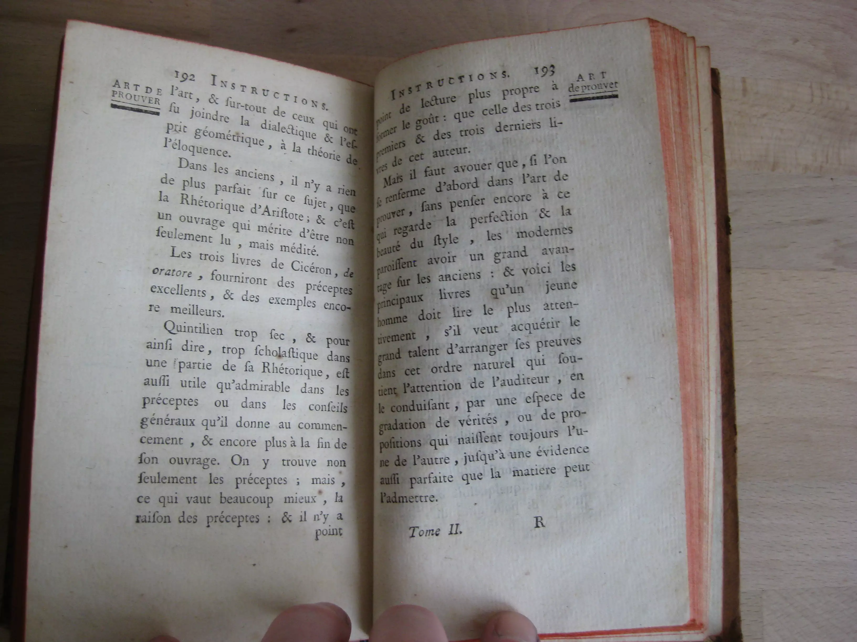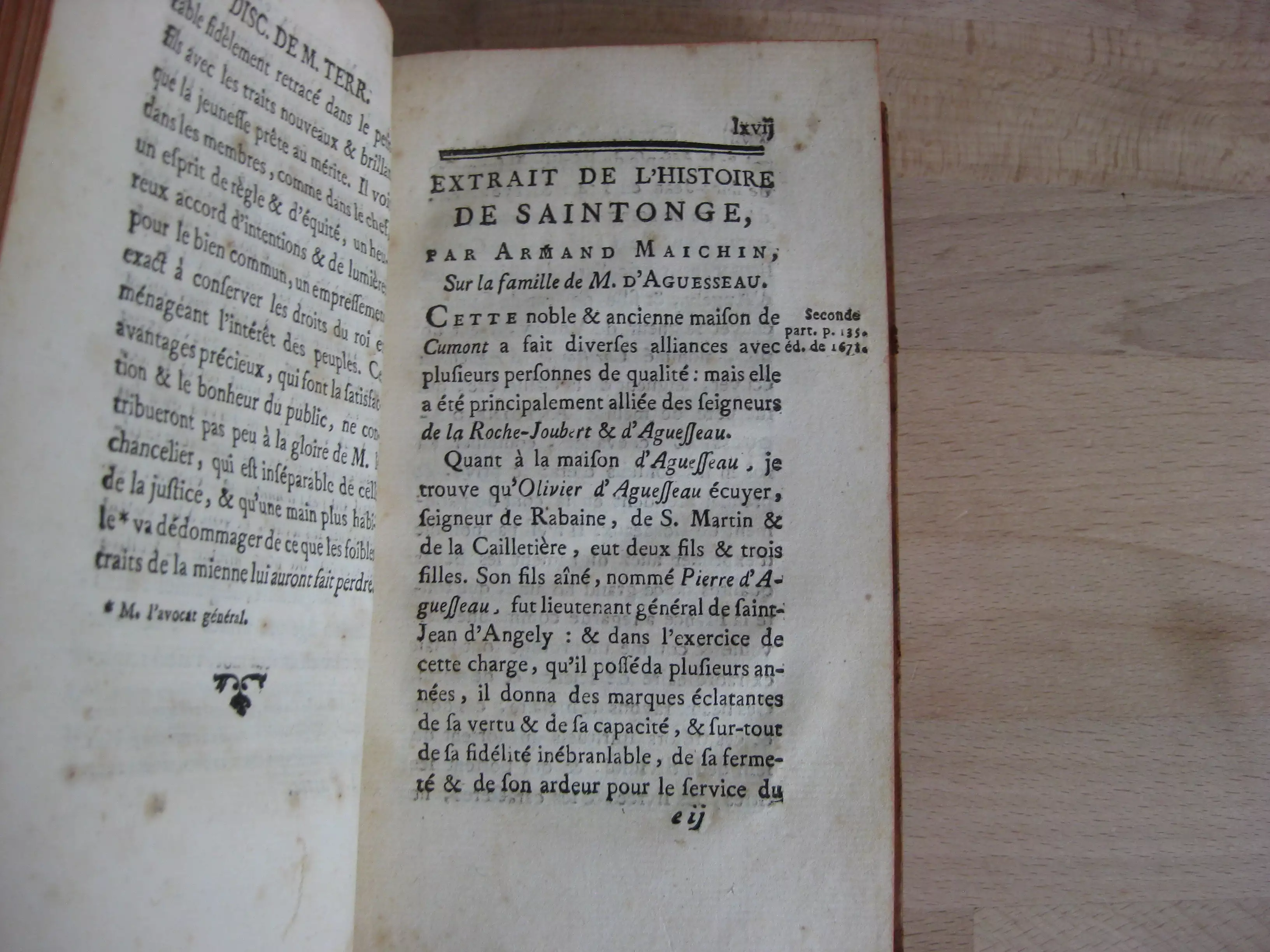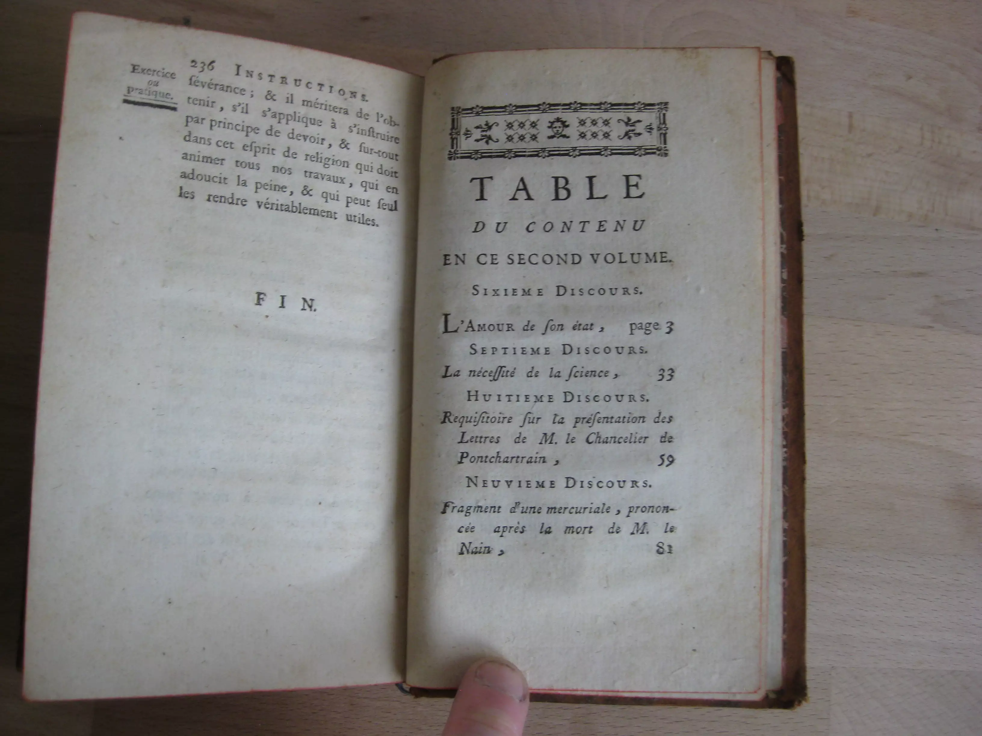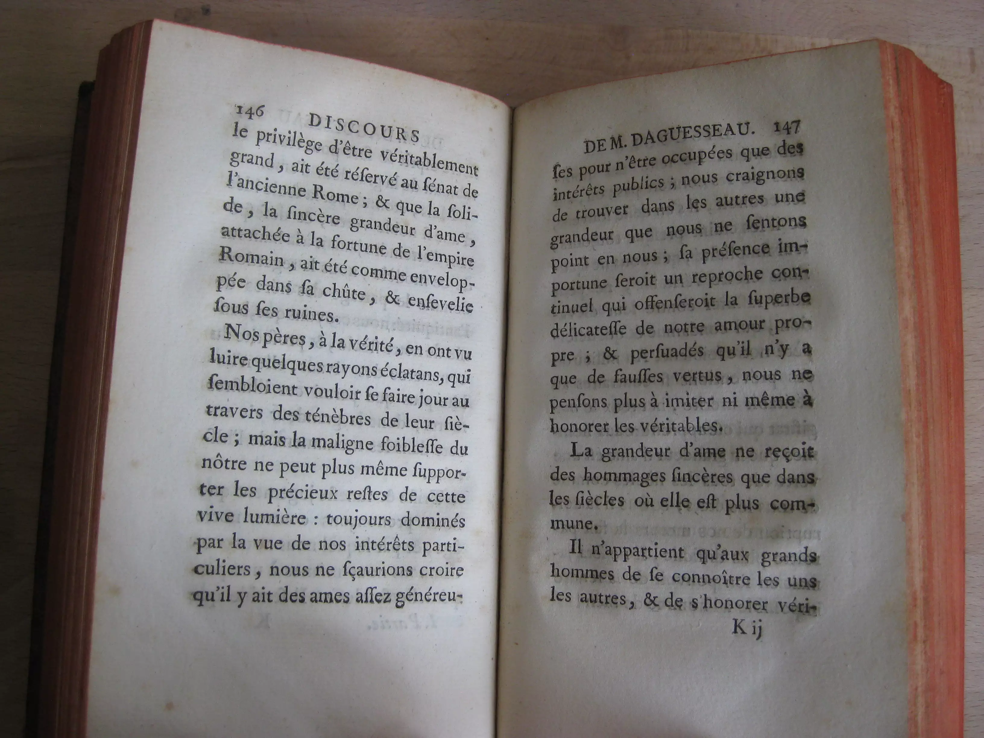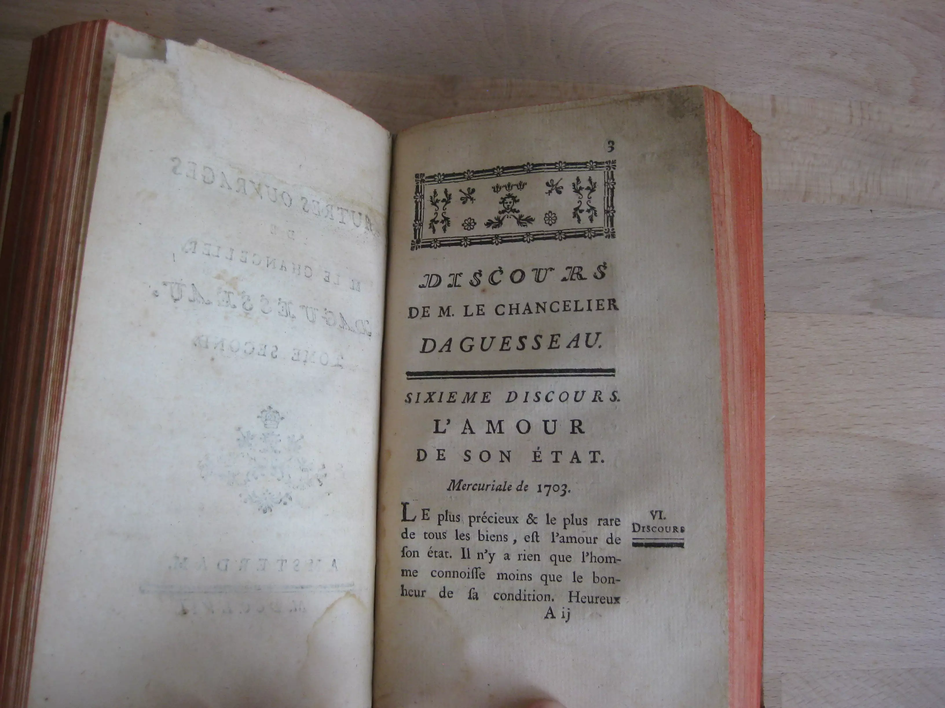 DescriptionS.N.Amsterdam – Plein veau marbré, dos à cinq nerfs richement orné, pièce de titre rouge, tranches rouges, 174 x 103, 1756 et 1757 (T2). Précédé pour le T1 de : Avertissement ; Une vie de M. le Chancelier d’Aguesseau ; Discours prononcé par M. Terrasson ; Extrait de l’histoire de Saintonge, par Armand Maichin, sur la famille d’Aguesseau, paginés ii- lxij. Tome I sans table, T2 avec table in fine.