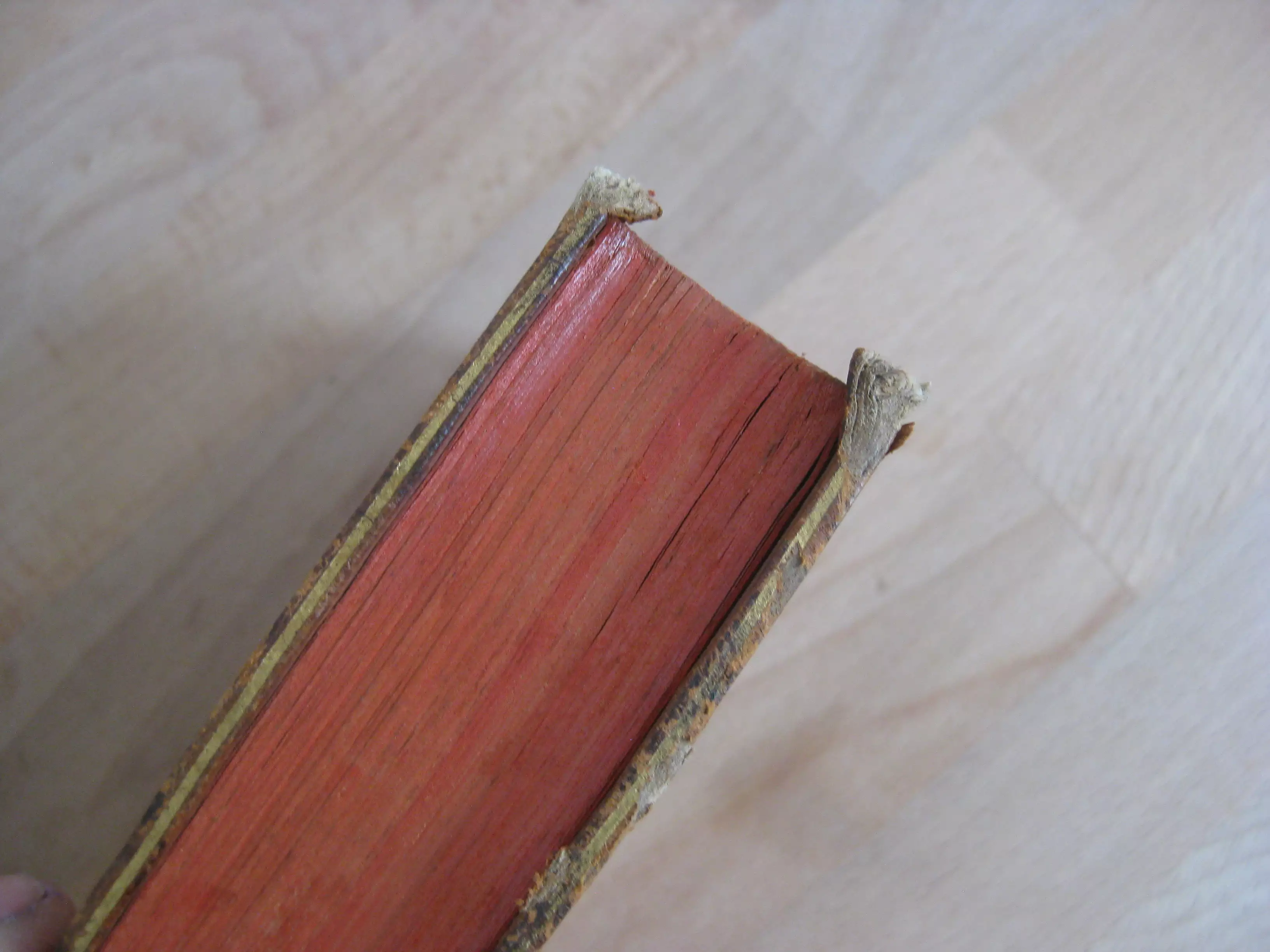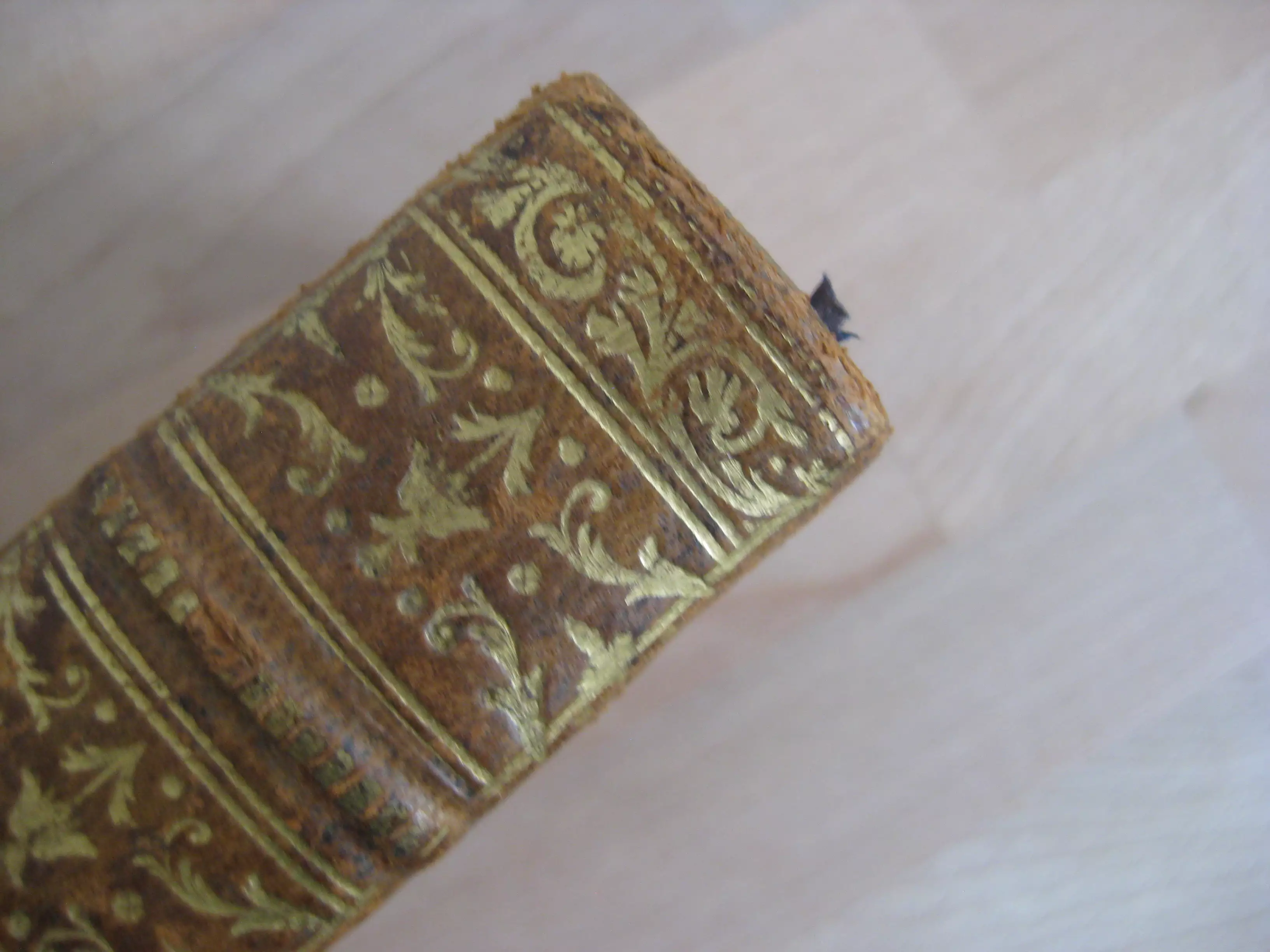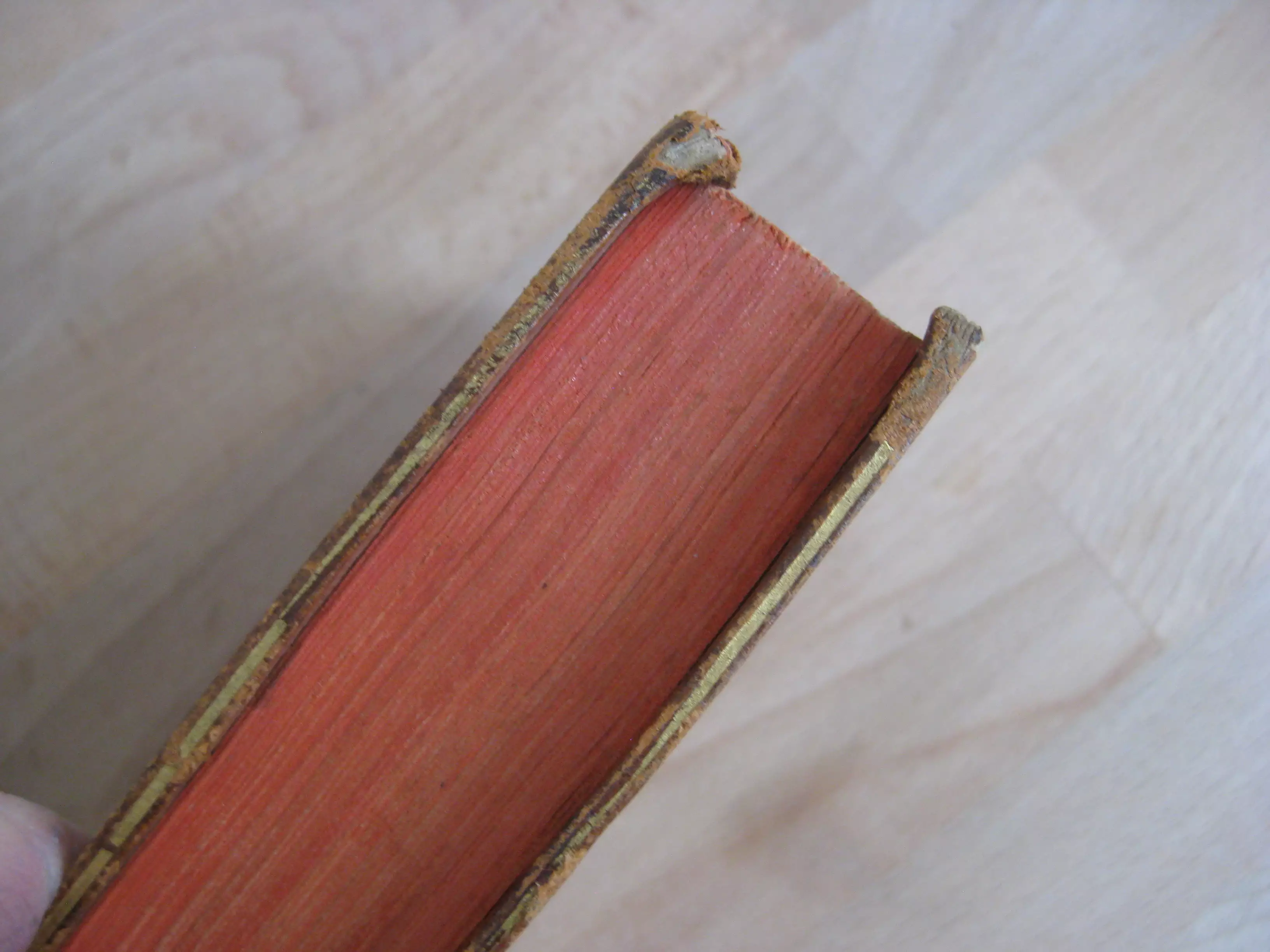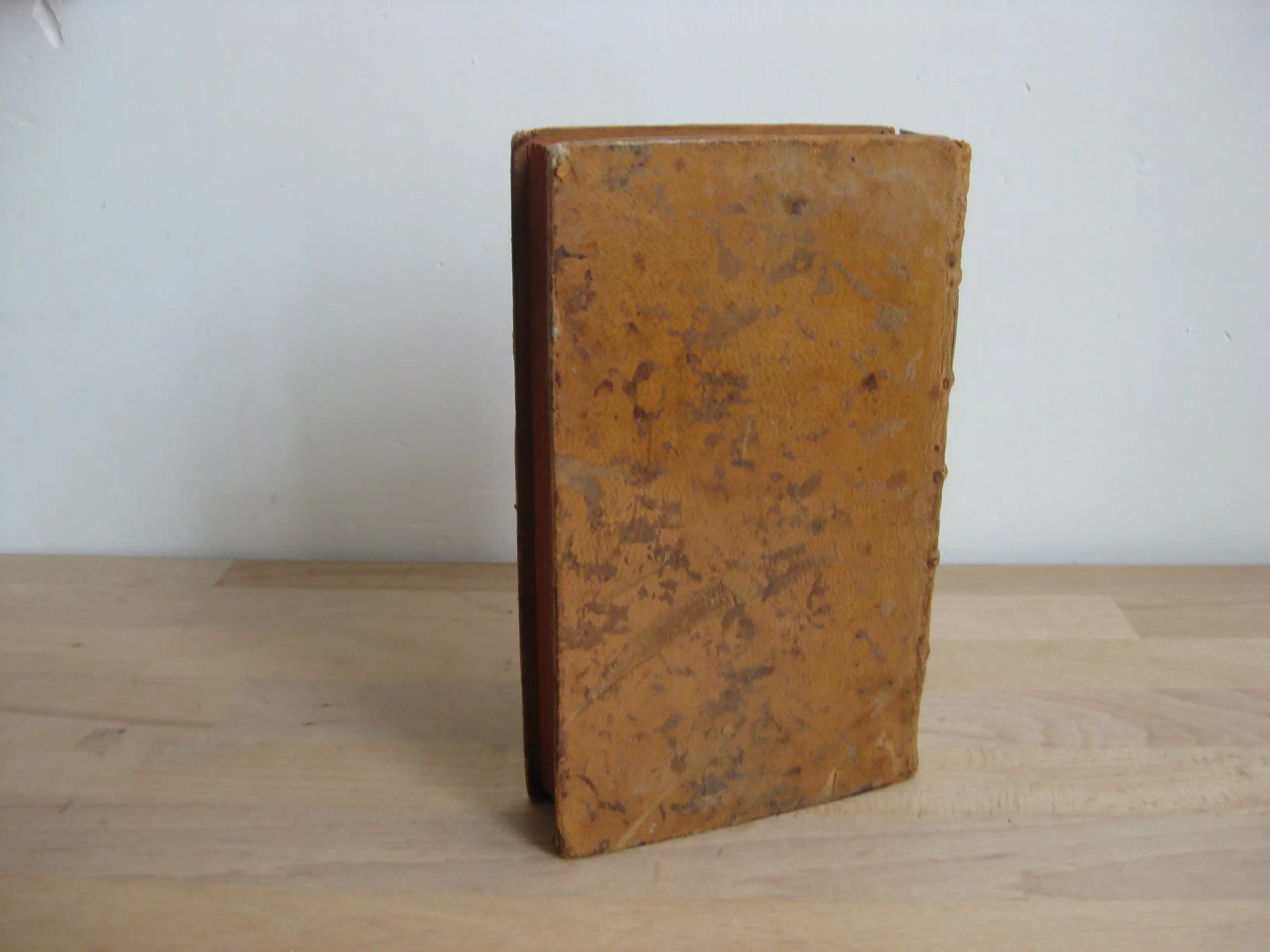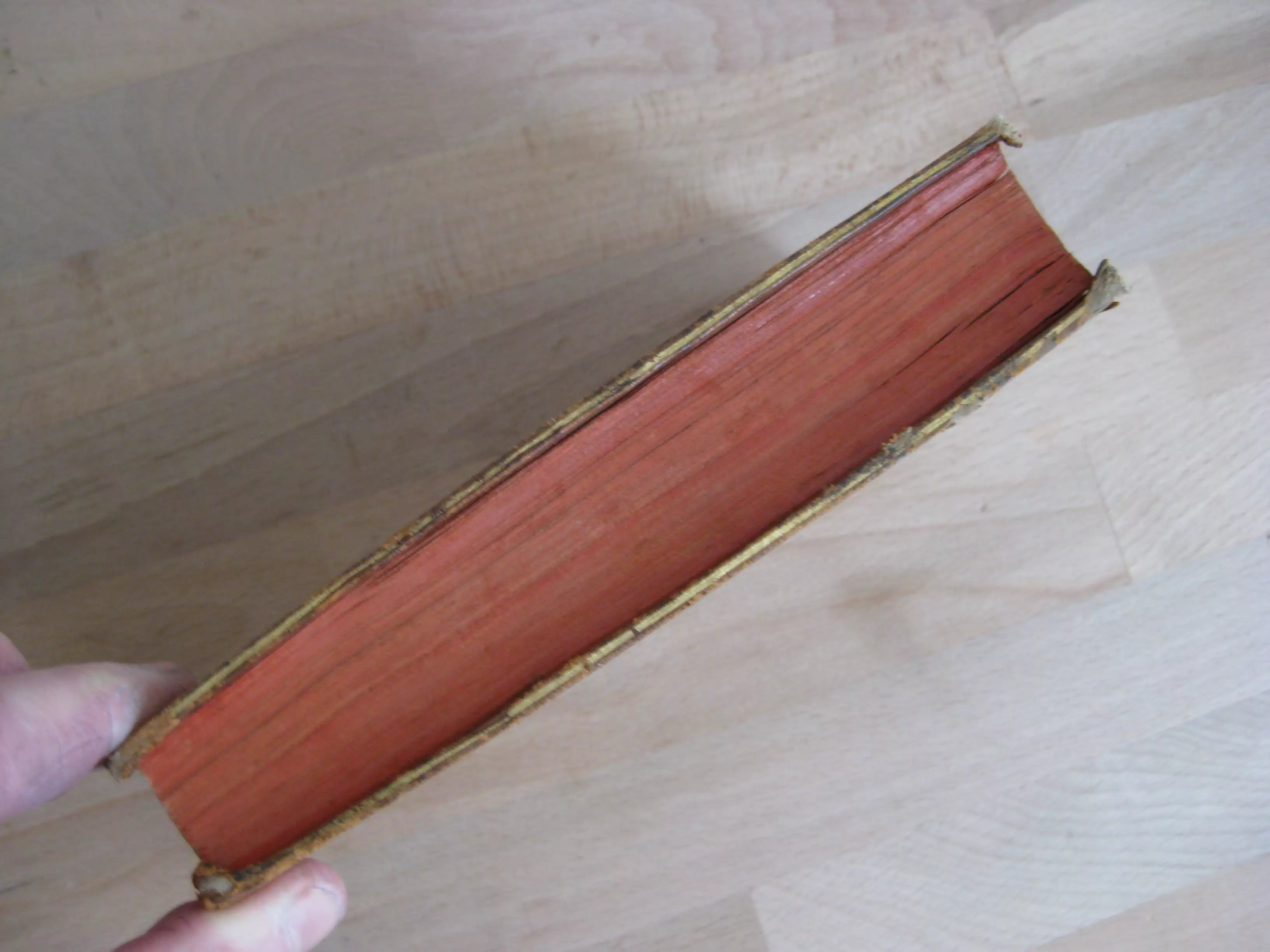 Plats frottés avec épidermures, mais bons ; coins et champs frottés, coins légèrement émoussés. Dos en bel état avec cependant coiffe arasée ; épidermures en queue. Bel exemplaire bien ferme.
