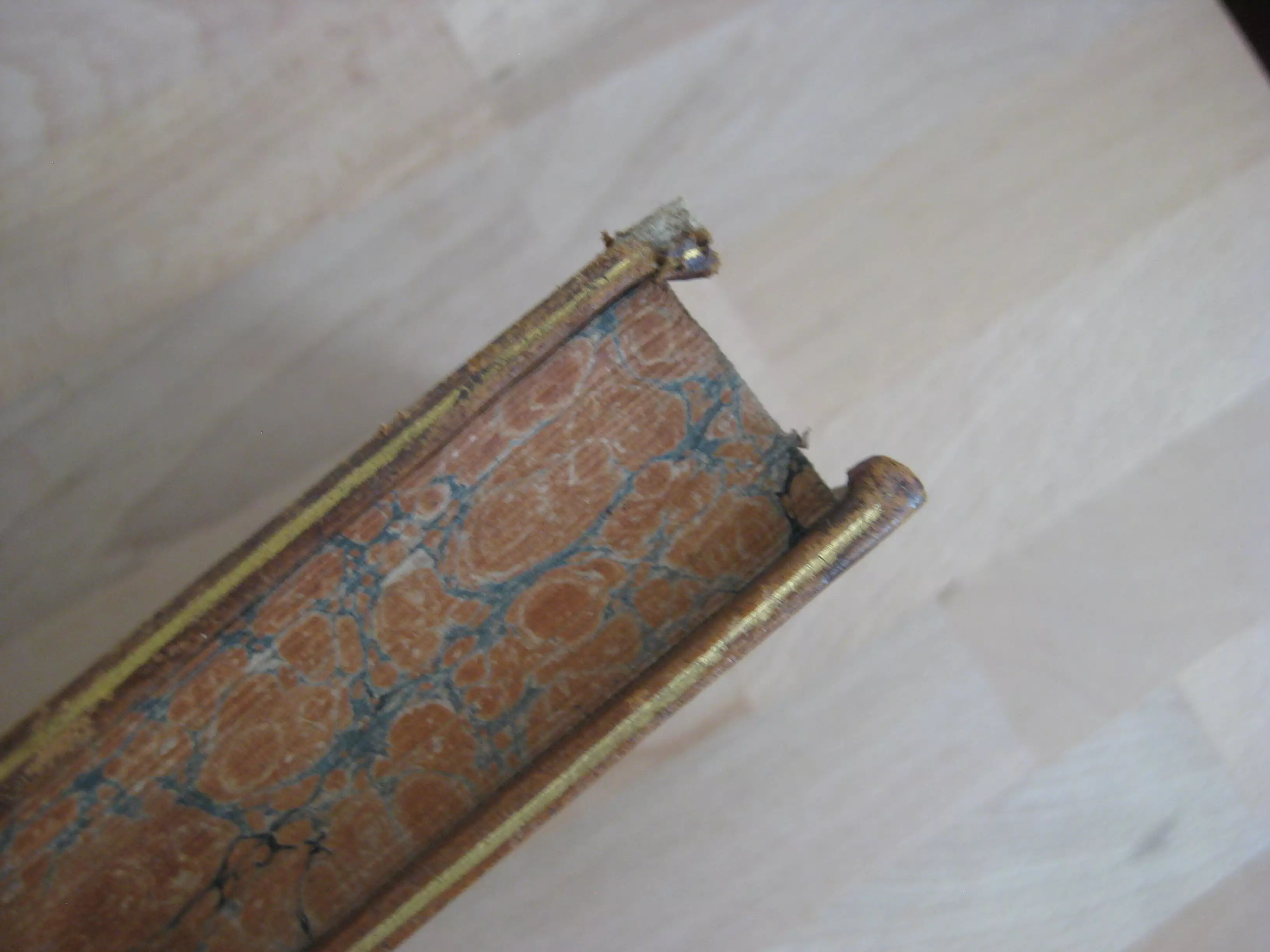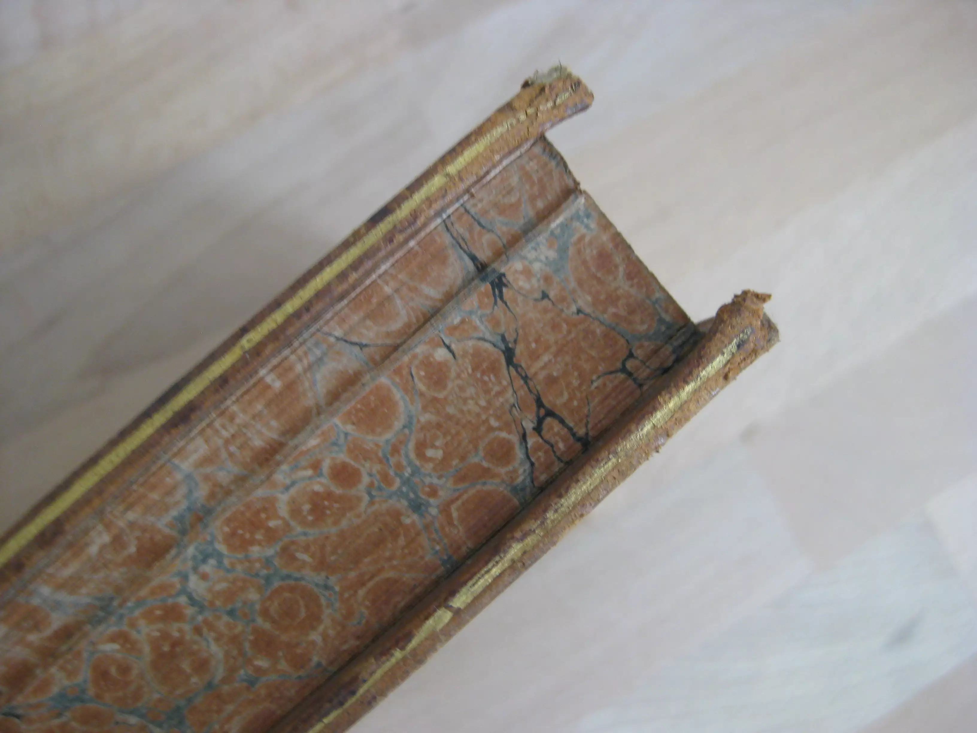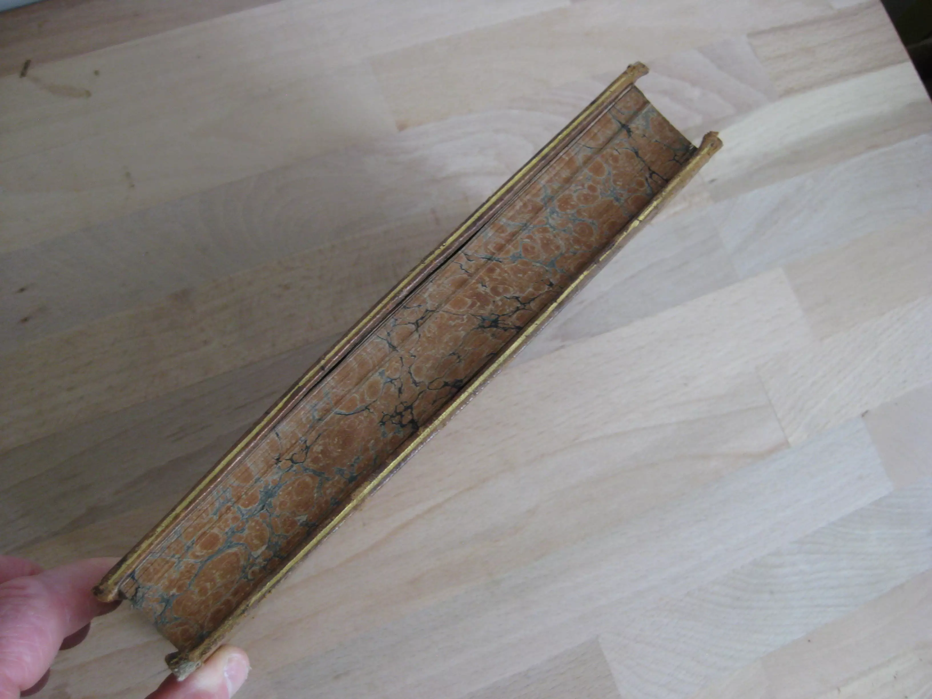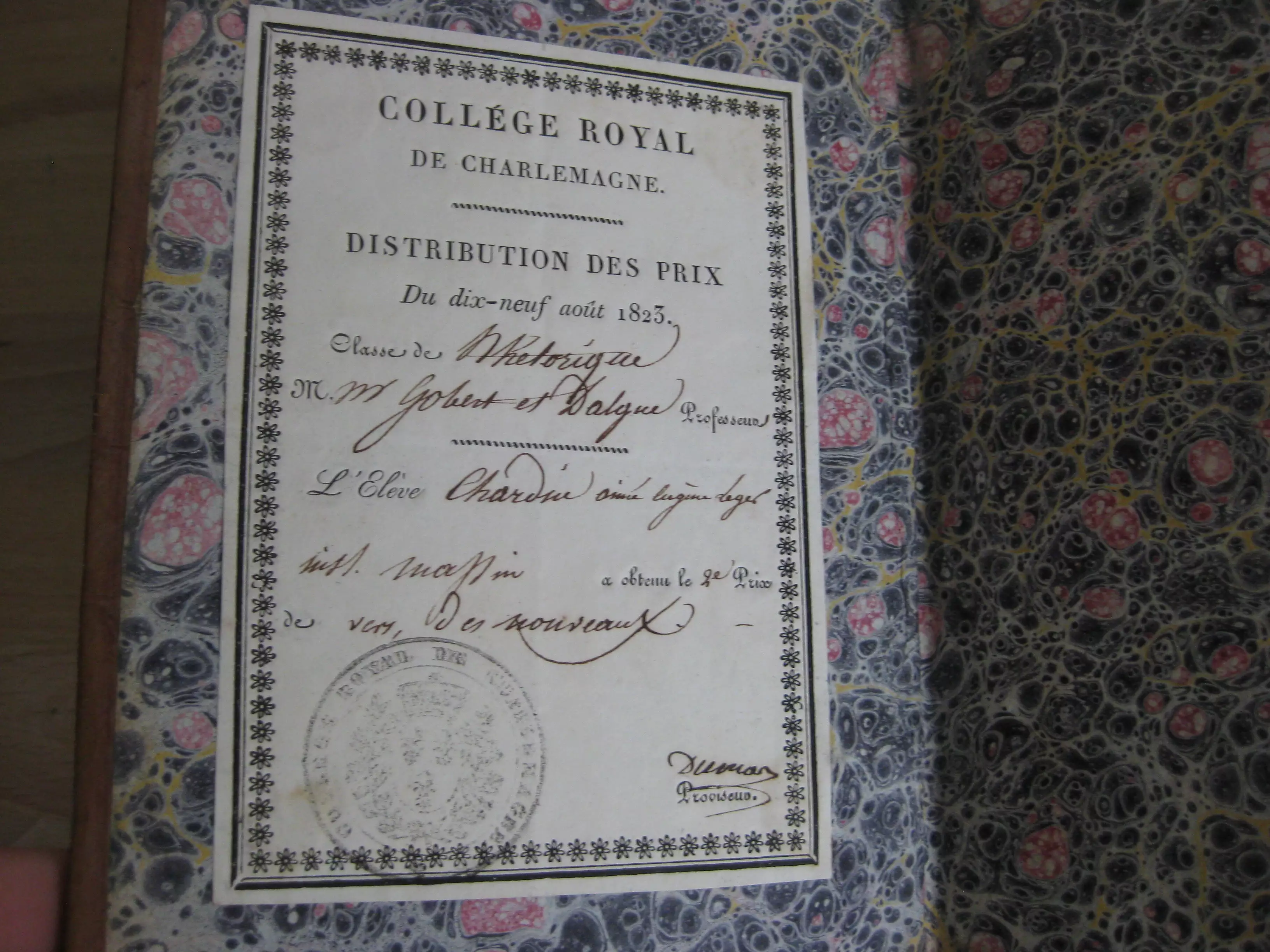 DescriptionChez Ladvocat Libraire – Joli plein veau marbré, dos long orné d’une pièce de titre en maroquin rouge, et joliment décoré, toutes tranches marbrées, 210 x 130, 432p. 1723. Avec une très belle vignette de remise de prix du Collège Royal de Charlemagne, signé du proviseur et tamponné. Intérieur propre, rousseurs marginales, un cahier qui sort légèrement. Reliure en bel état général, dos avec frottements et épidermures, notamment en coiffe et queue. Bon exemplaire bien ferme.