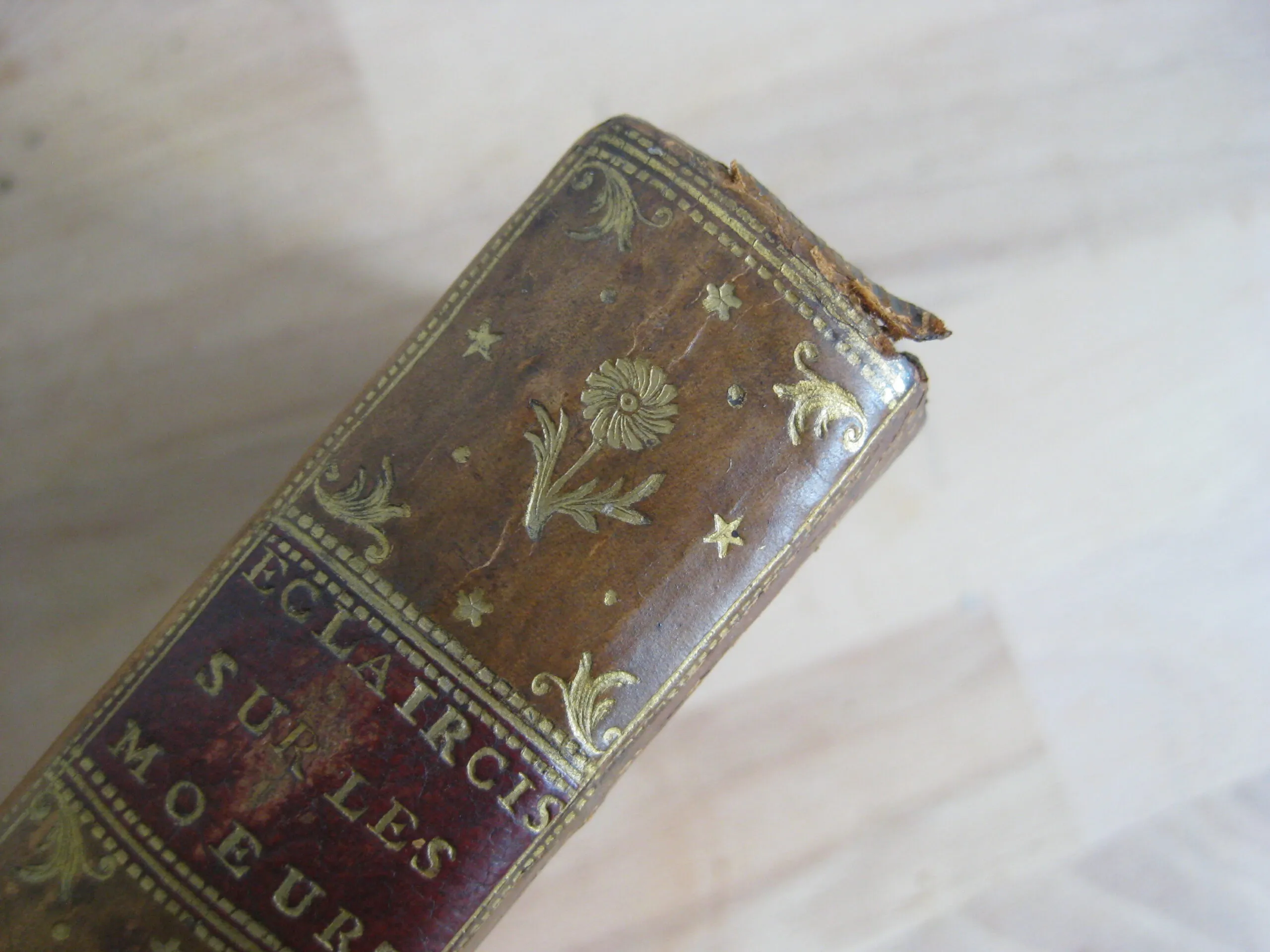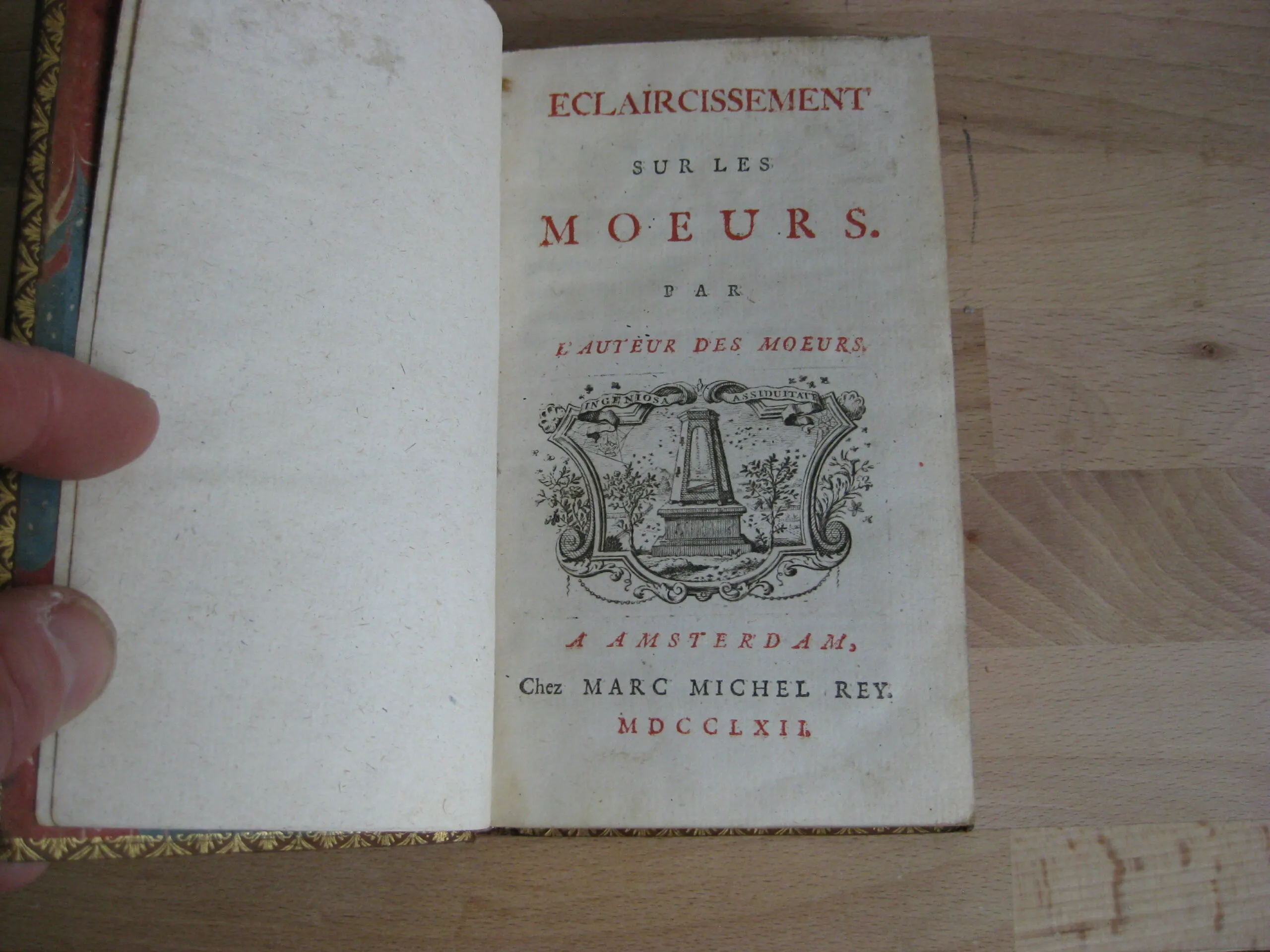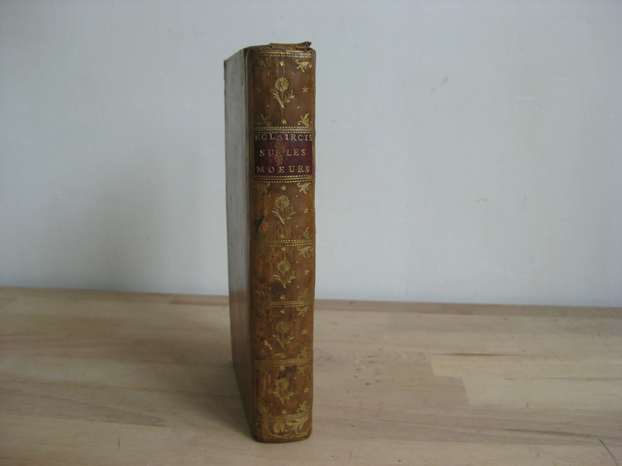 Full waxed Havana calf, lightly marbled, with a richly decorated long spine, title label in red morocco, covers decorated with a triple-edged frame and moral motif on the corners, all edges gilt, 162 x 100. 1752. First edition. Vignette to the title. 412p. After a long preface paginated iv-lx, and 6p. of table of chapters and errata. Very good interior, clean and intact. Covers, fields and corners rubbed, with marked rubbing on the upper cover. Spine slightly rubbed with headcap with a tear without loss. Beautiful copy, very firm. Also in stock in the same binding the fifth edition of Moeurs, the book that led the author to write this defense. François-Vincent Toussaint is known for this work, which caused a scandal and was banned upon its publication in 1748. The book was nevertheless very successful, and some articles were included in the Encyclopedia. This work is based on morality and natural justice, and rejects the need for revealed religion, natural morality being independent of the social laws brought about by religion. In 1752, he published Éclaircissements sur les mœurs, to defend the first work.