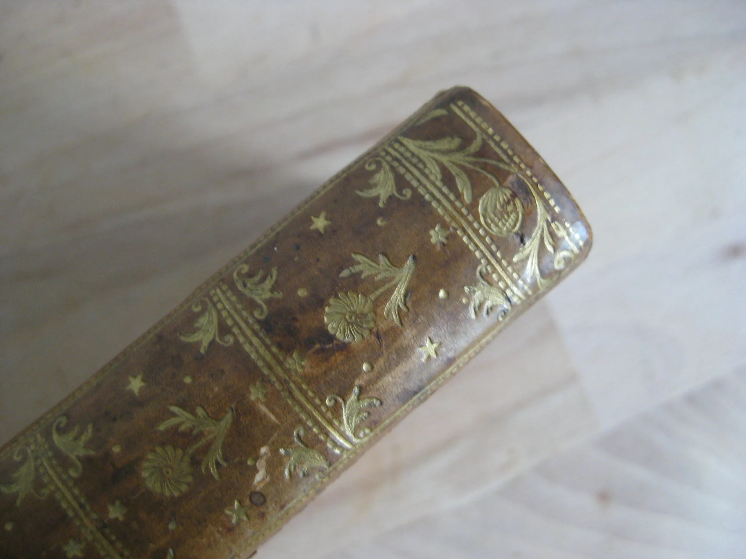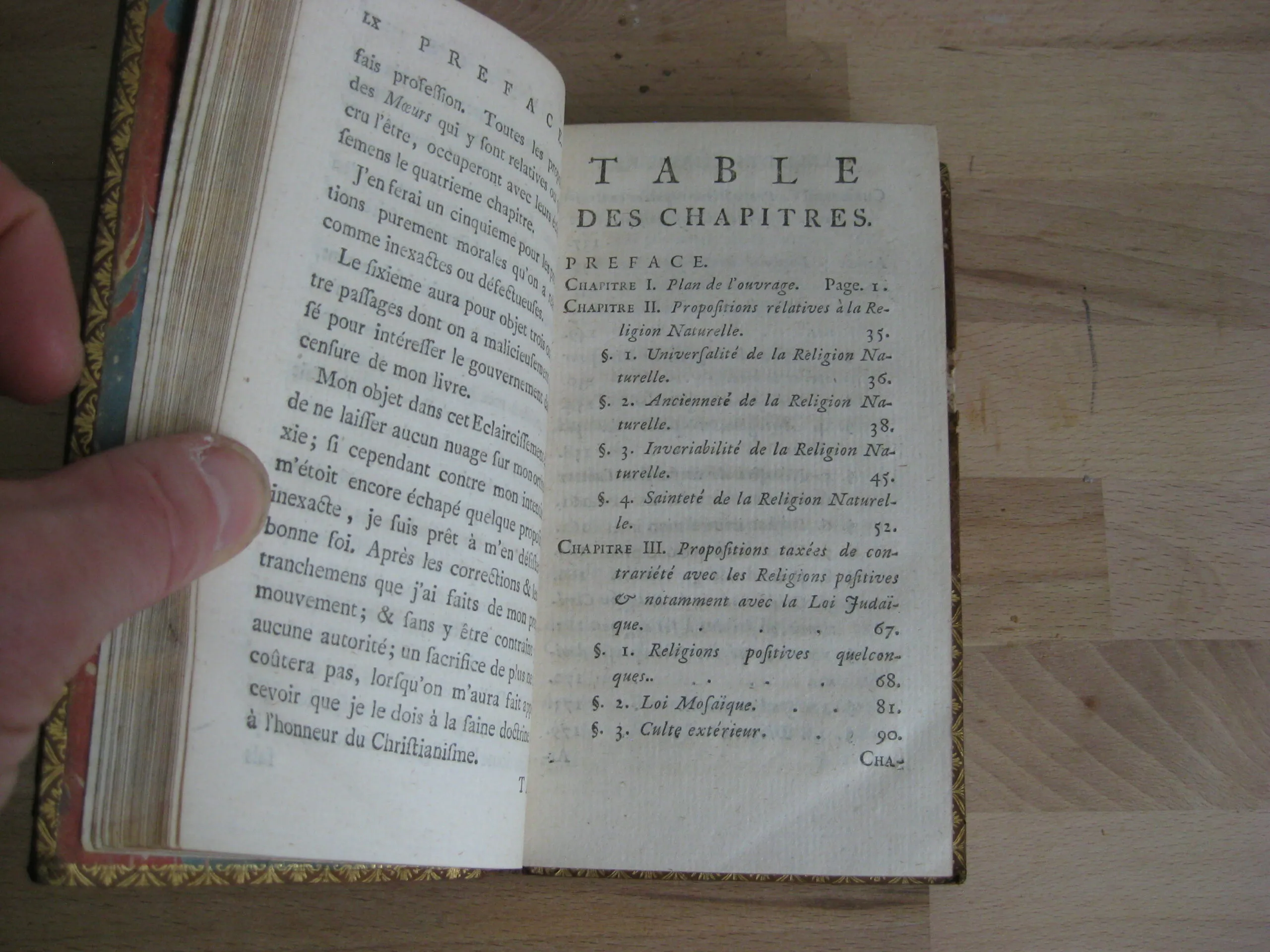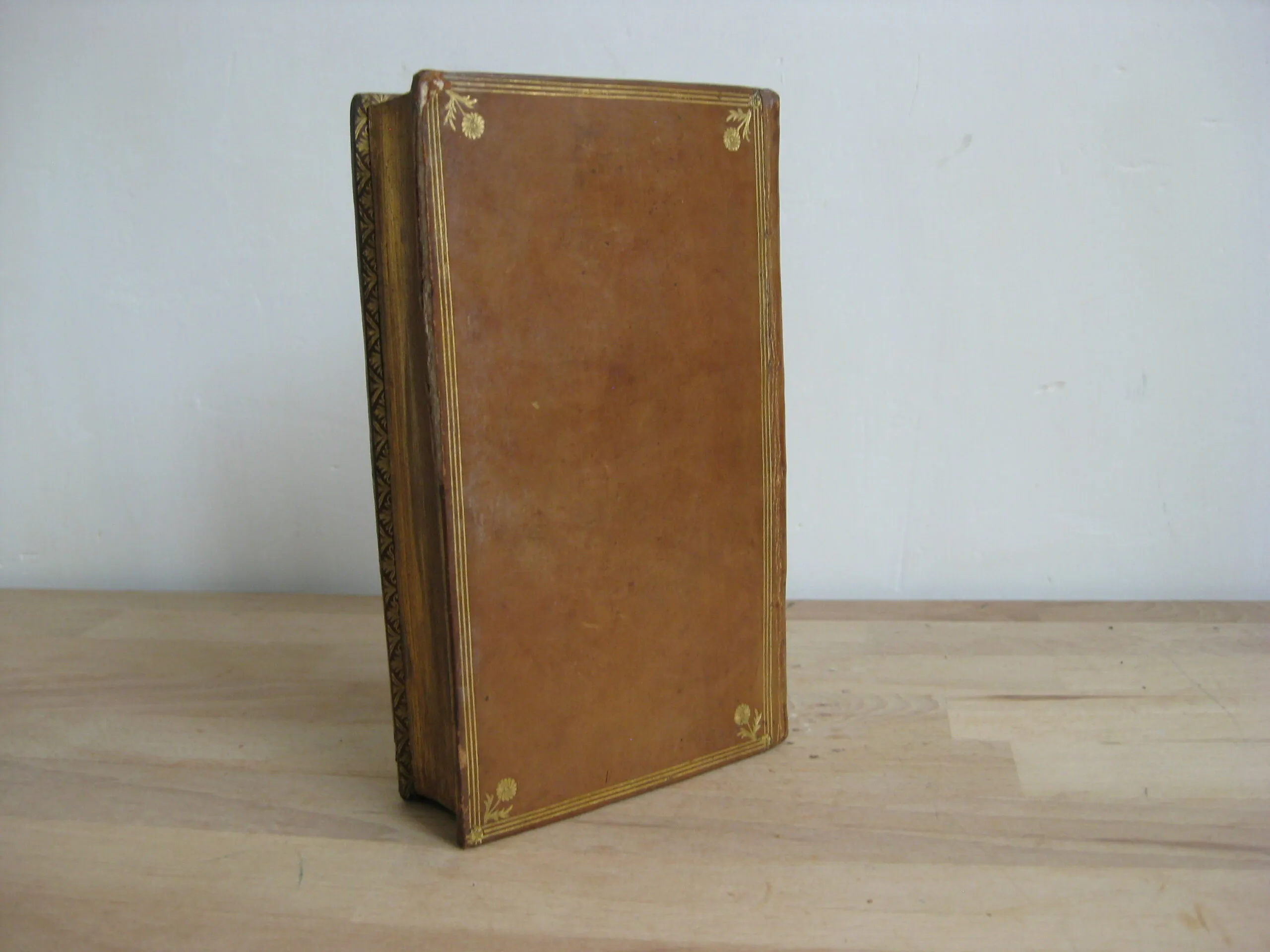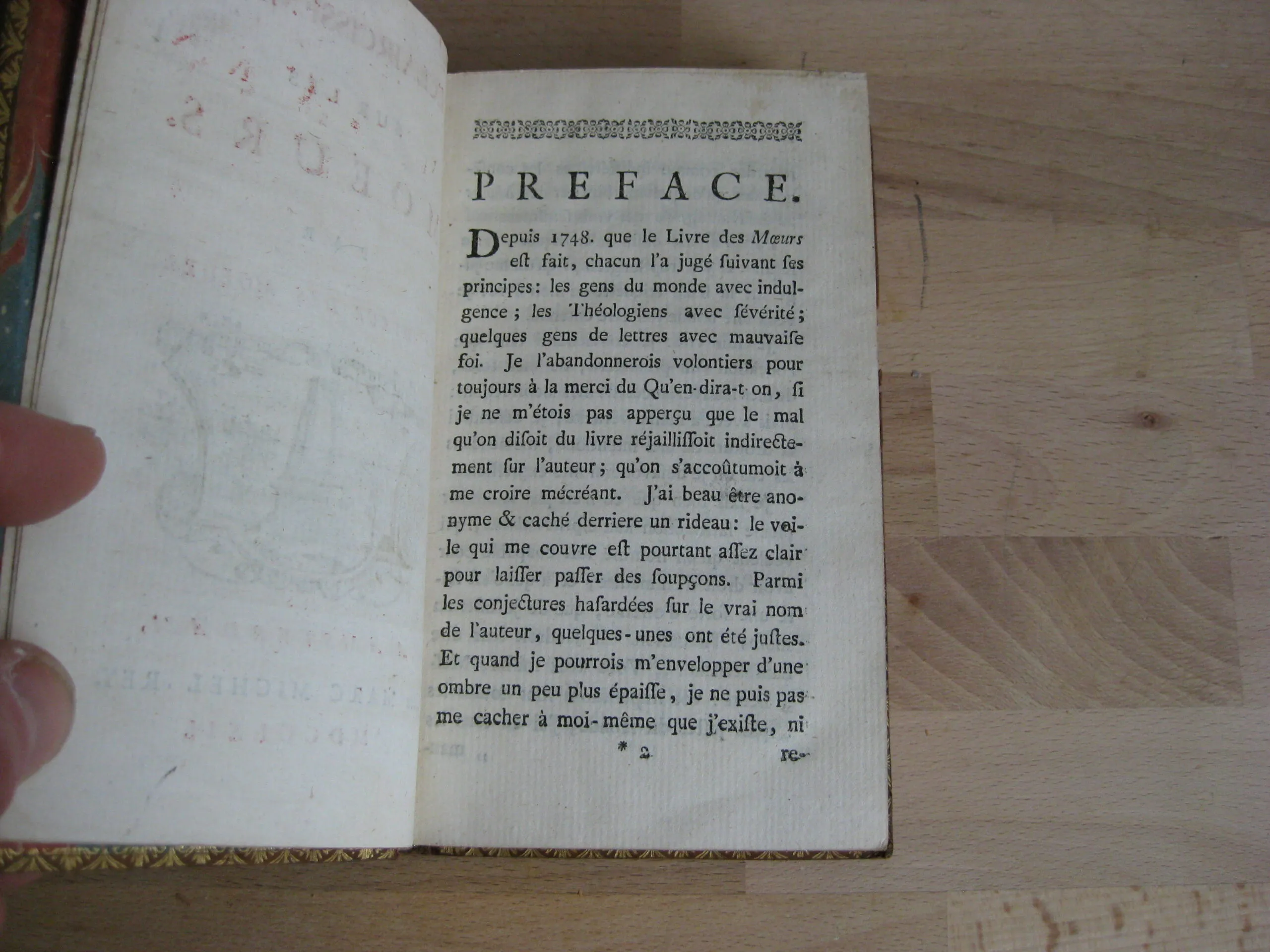 Full waxed Havana calf, lightly marbled, with a richly decorated long spine, title label in red morocco, covers decorated with a triple-edged frame and moral motif on the corners, all edges gilt, 162 x 100. 1752. First edition. Vignette to the title. 412p. After a long preface paginated iv-lx, and 6p. of table of chapters and errata. Very good interior, clean and intact. Covers, fields and corners rubbed, with marked rubbing on the upper cover. Spine slightly rubbed with headcap with a tear without loss. Beautiful copy, very firm. Also in stock in the same binding the fifth edition of Moeurs, the book that led the author to write this defense. François-Vincent Toussaint is known for this work, which caused a scandal and was banned upon its publication in 1748. The book was nevertheless very successful, and some articles were included in the Encyclopedia. This work is based on morality and natural justice, and rejects the need for revealed religion, natural morality being independent of the social laws brought about by religion. In 1752, he published Éclaircissements sur les mœurs, to defend the first work.