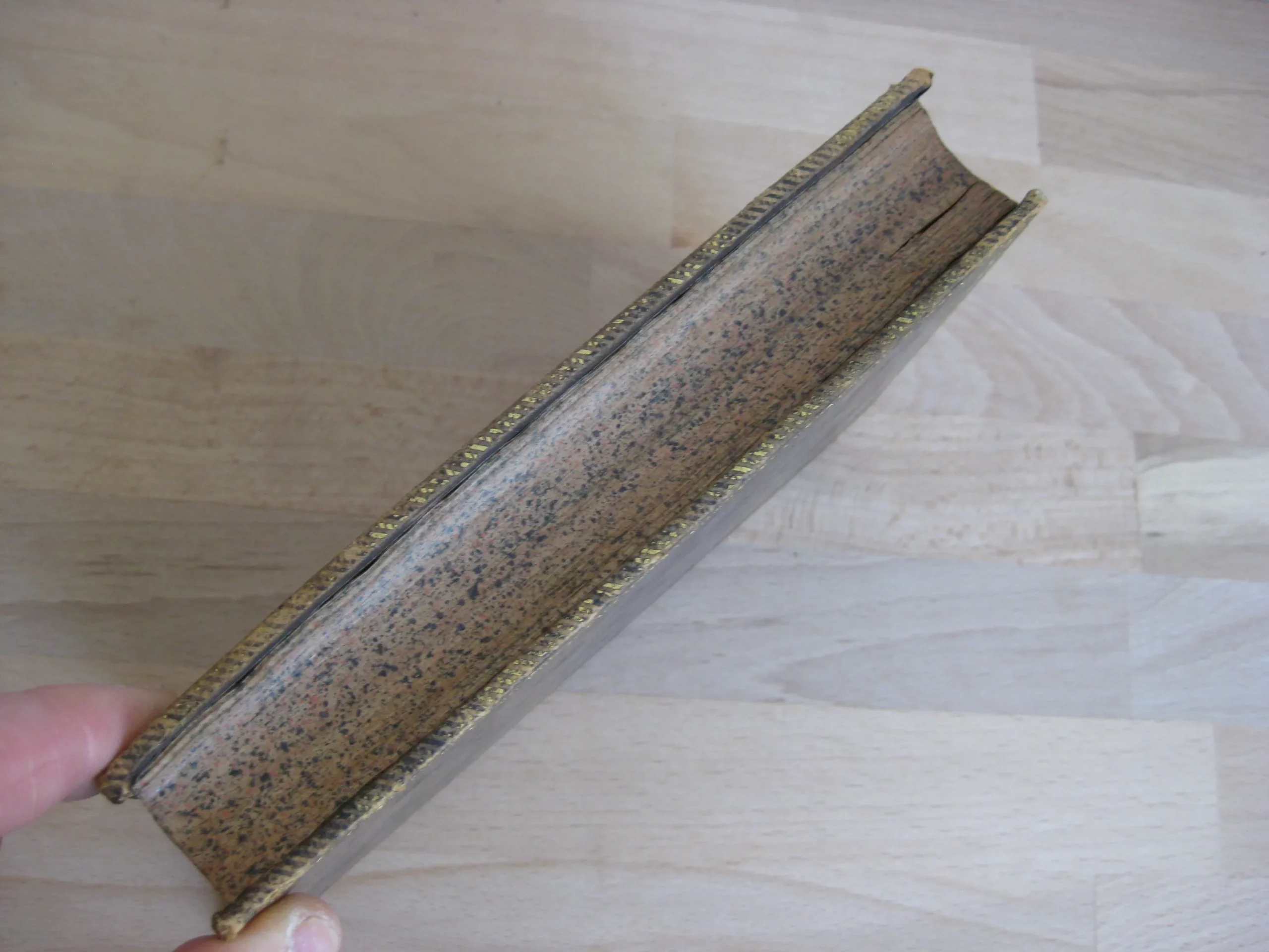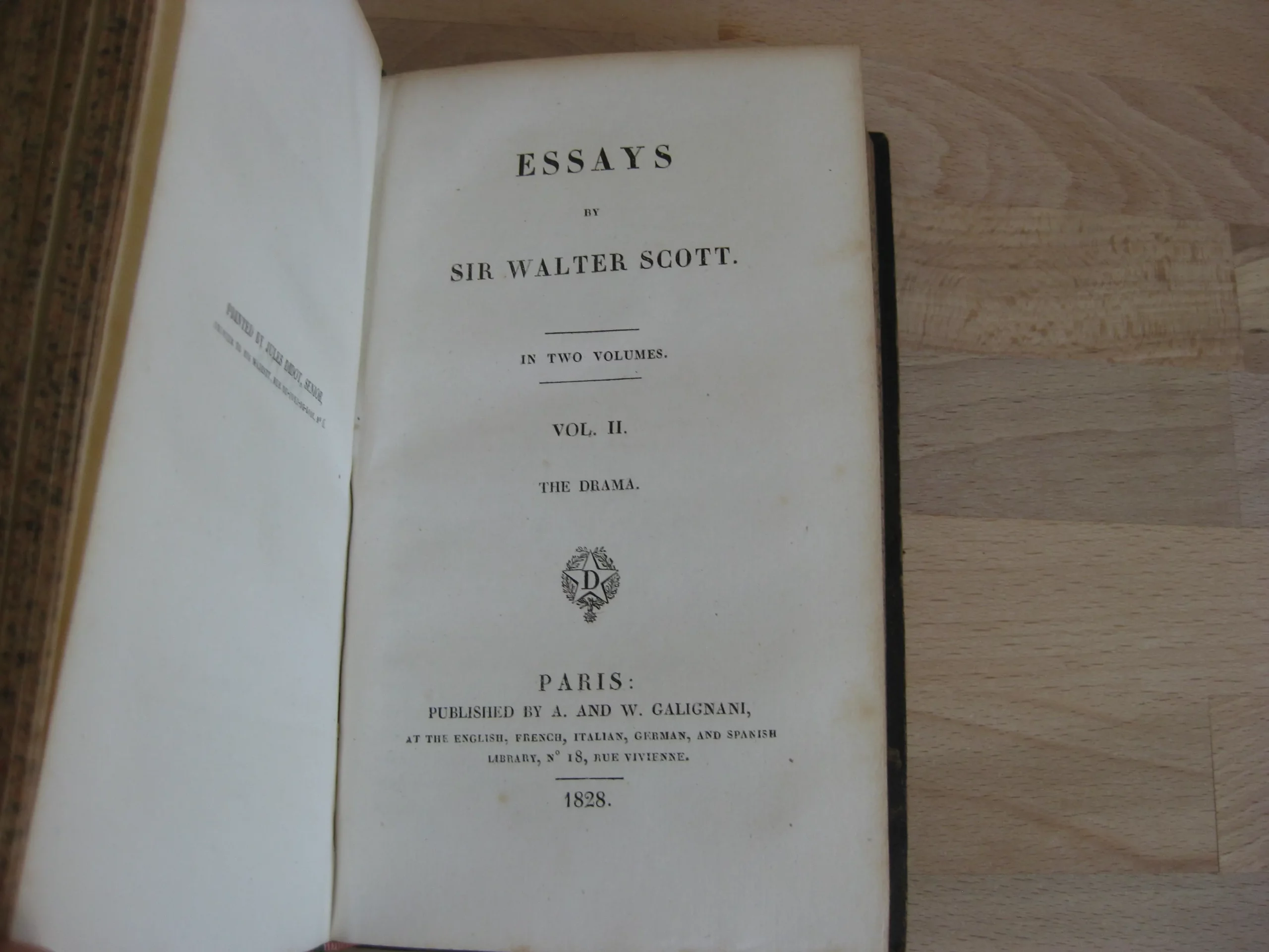 2 tomes en un volume complet. Suivi de Religious Discourses – A. and W. Galignani Plein veau marbré, dos long orné d’une pièce de titre et de tomaison en maroquin rouge, dos richement décoré frises et fleurons, plats à encadrement à liseré et frise, tranches jaspées, 174 x 105, 2 tomes en un volume. 1828. Première édition sous cette forme de trois essais de Scott, extraits du Supplement to the Encyclopaedia Britannica. I, Chevalry, Romance, 237p. II, The Drama, 202p. Suivi de Religious Discourses, 68p. The Christian and the Jewish dispensations compared ; The Blessedness of The Righteous. Rousseursen début et fin de volume, intérieur propre. Coins, plats et champs frottés, avec épidermures ; mors frottés avec épidermures. Dos en bel état avec épidermures en coiffe et queue. Première édition en livre de ces essais de Walter Scott. Également en stock dans la même reliure : Waverley ; Woodstock ; Guy Mannering ; Kennilworth ; Peveril of the Peak