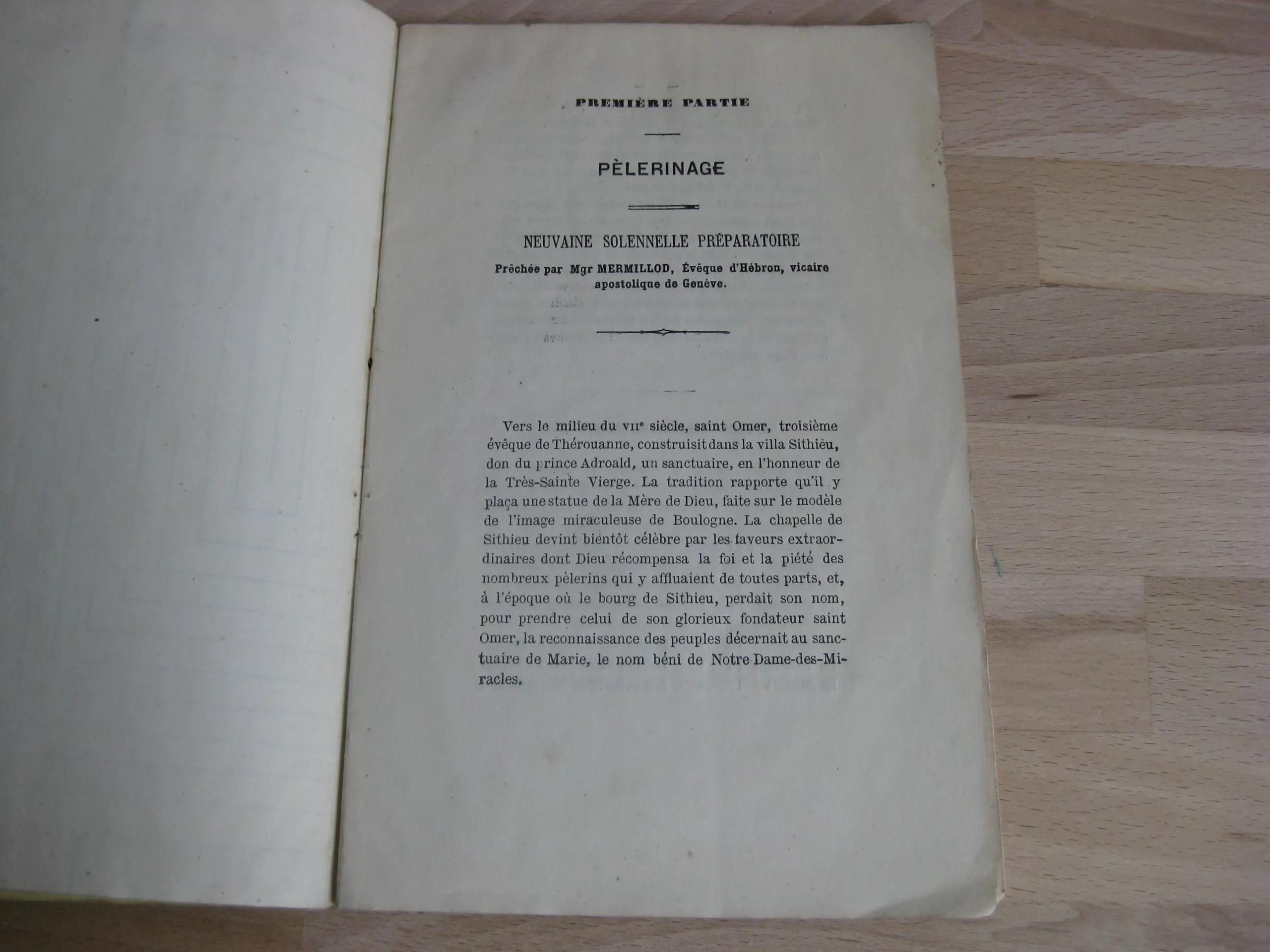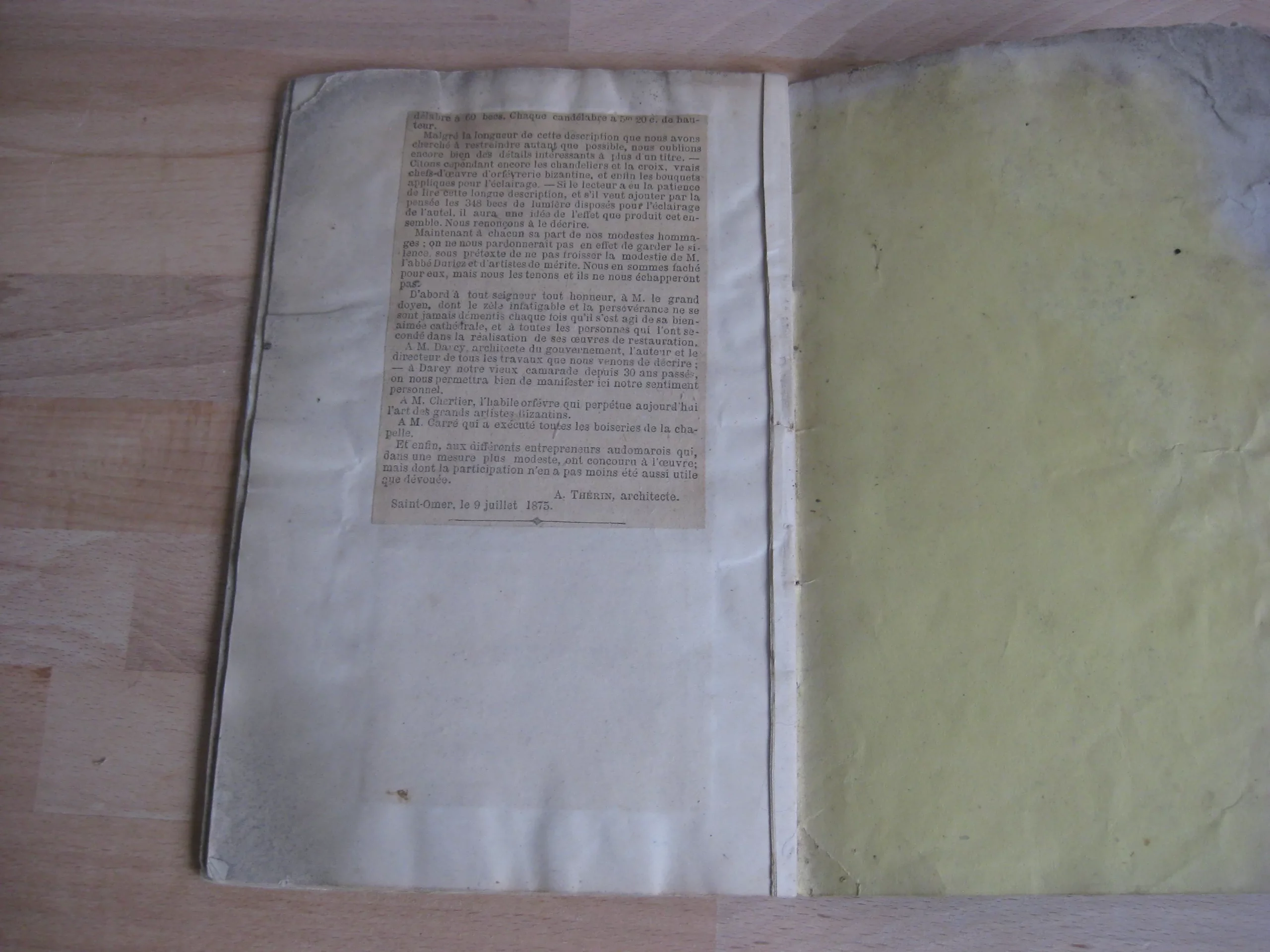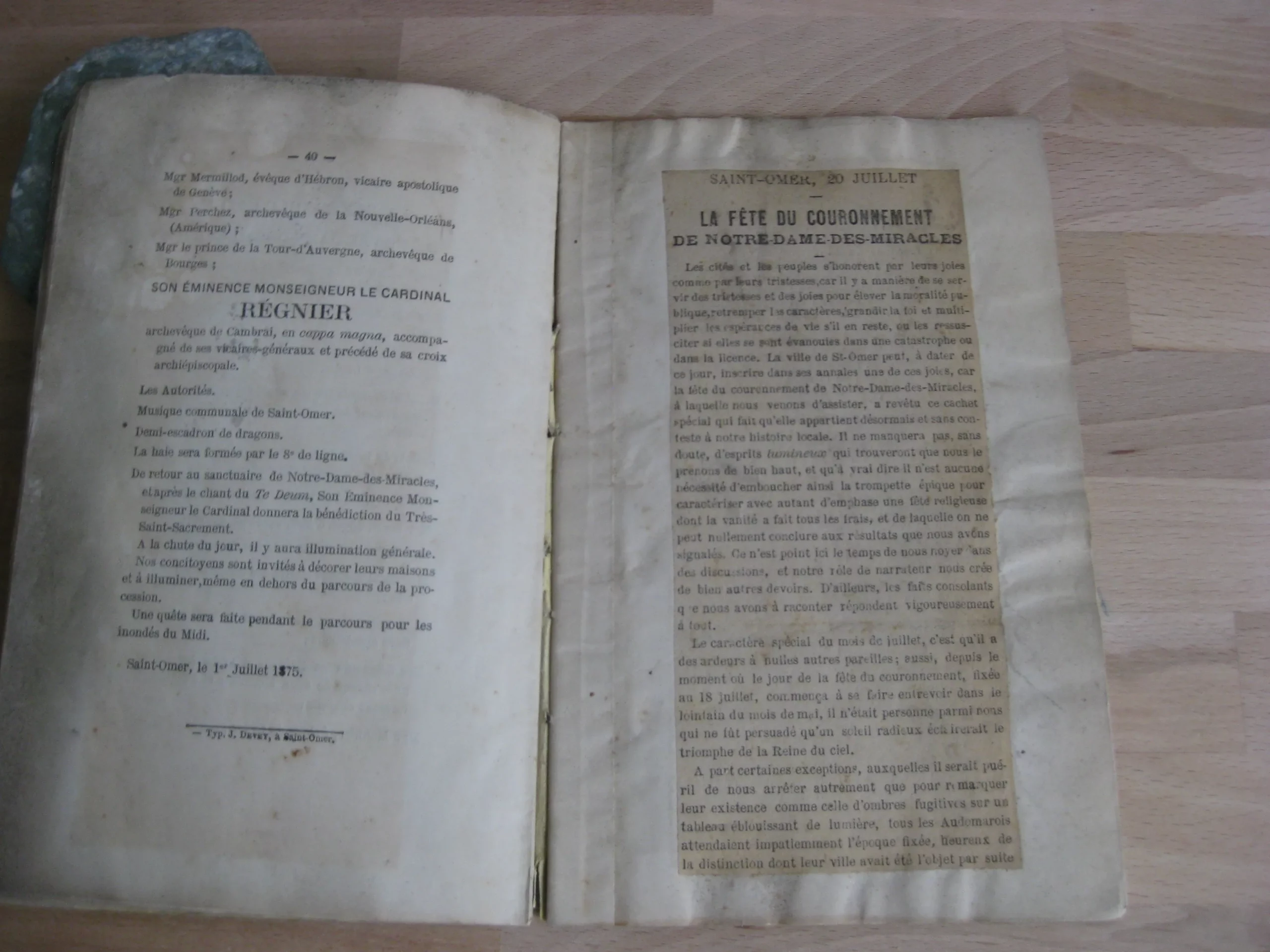 Brochure d’attente bleue, 222 x 142, 40p. 1875. Edition originale. Enrichie in fine de deux coupures de journal l’une du du 20 juillet, signée G. Boyaval, 9p. Et donnant récit des fêtes ; suivi de 6p. signées de A. Thérin, architecte, et datée du 06/07/1875, portant sur la cathédrale Notre-Dame de Saint-Omer. En frontispice en double page : Disposition de la procession sur la Grand’Place. Bon exemplaire : intérieur propre ; couvertures défraîchies avec frottements et tâches.