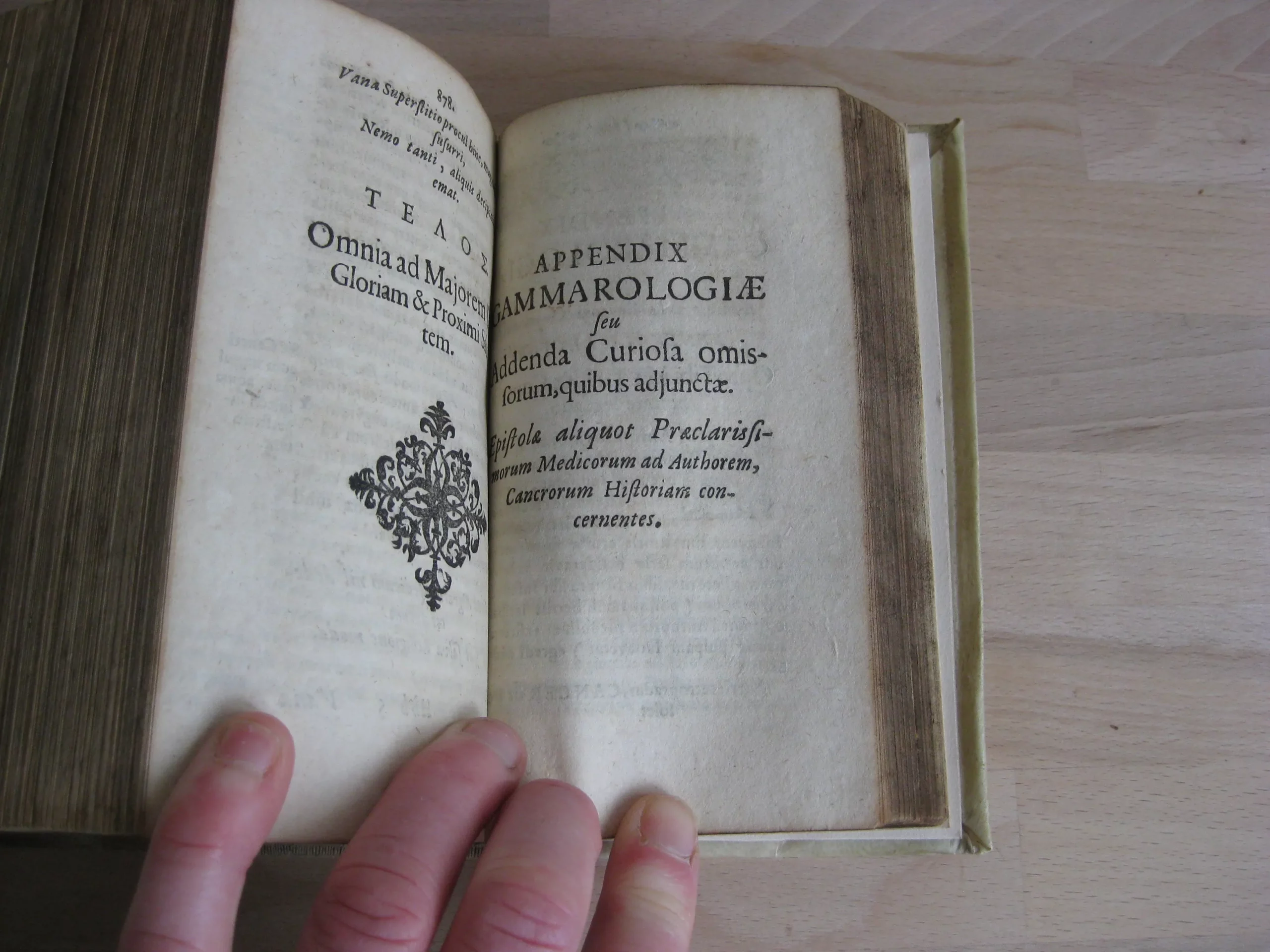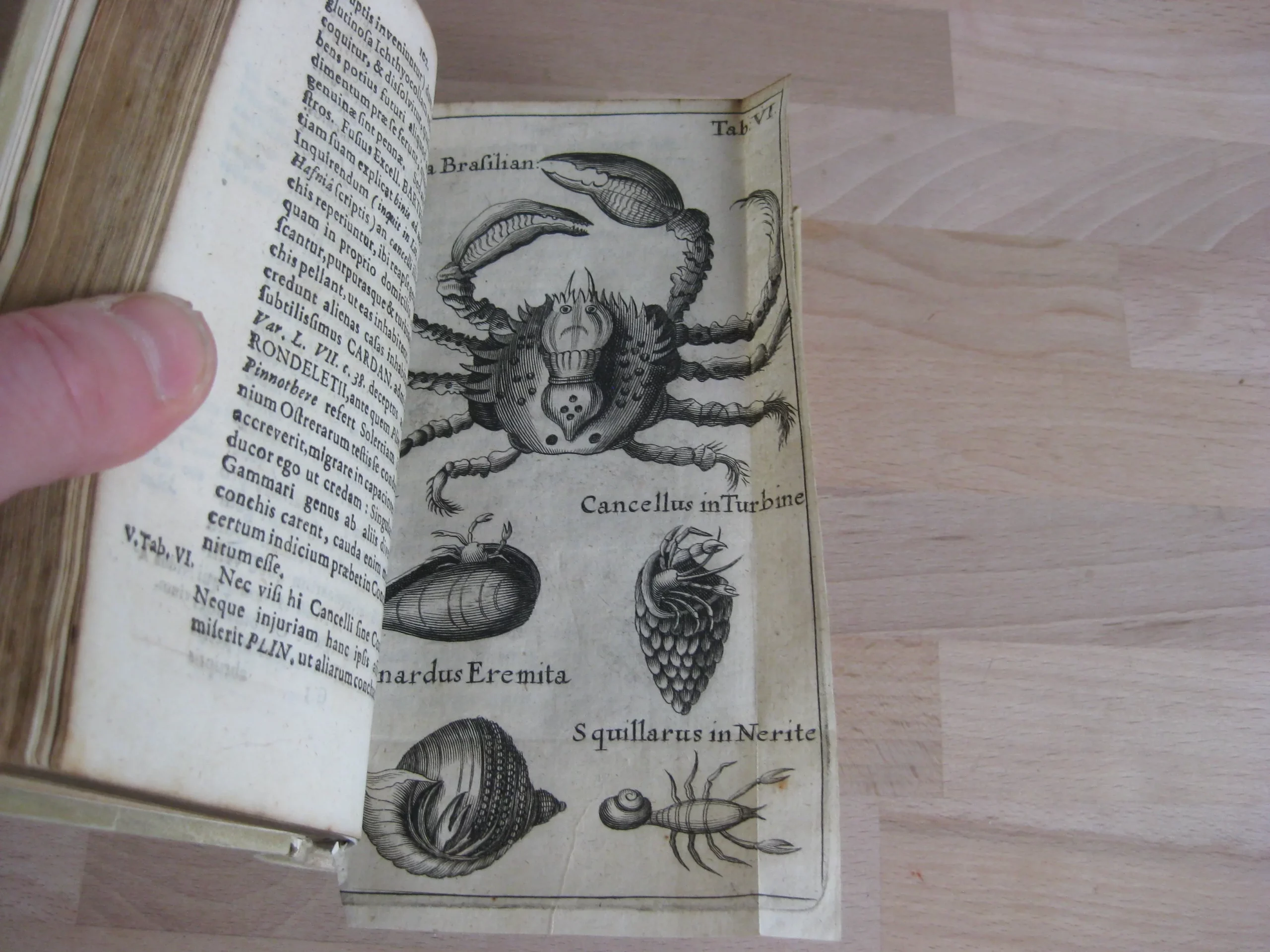 Vélin moderne à recouvrement, dos long muet, tranches bleues, 165 x 110, 1665. Première édition Avec un superbe frontispice gravé sur double page, allégorique, avec titre dans un filet de pêche tenu par le trident de Poséidon et la rame d’un pêcheur, et le Dieu semblant s’adresser à ce dernier : «Oceanus viadrus. Nunc crustata cohors remeabis ad aequara salsa gammare nam viadritis mihi sole place, rapta ex orbe novo renuis sic fercula canos. ». (excellent état de la gravure). Titre deux couleurs, avec ex-libris tamponné : « Freistandesherrliche Majorats Bibliothek zu Warmbrunn», présent également au verso du frontispice, et dans le texte une fois. Comprend : Adresse de l’auteur à l’archevêque Guidobaldi [Guidobald von Thun], 17p. Suivi des éloges du travail et de son auteur par : Johannes Michael ; Thomas Bartolinus D. ; Johannes Theodorus Schencki ; Johannes Laurentus Bausch ; Johannes Michael Fehr D. ; Georg Segerus ; Johannes Wepferus ; David Spielenberger ; Johann Daniel Major ; Paulus Amman ; Elias Schmidt D. ; Metzger, Martinus Christophorus ; Fridericus Ortlob ; Wenceslaus Maximilianus ; 16p. Puis Adresse de l’auteur au lecteur, 8p. Puis table et texte, 962p. Les 50 dernières pages du texte étant les Epistolarum Clarissimorum medicorum ad aucthrorem. In fine : Index generalis et index specialis. 50p. ; Catalogus auctorum, 22p. ; Errata, 4p. Avec 4 lettrines, 2 cul-de-lampe et 10 gravures dont 8 dépliantes, toutes intègres, en très bel état. [Remarque : en raison de marges intérieures courtes, le dépliement des cartes demande du soin et de travailler la reliure qui est bien ferme et solide] Parmi ces planches, les 8 premières dépliantes concernent les crustacés, et les deux dernières pleine page sont plutôt mystérieuses, dont celle de l’enfant chauve de Silésie avec une main à six doigts, et des pieds « fous » à deux appuis… Bloc-livre certes serré mais bien réglé. Intérieur propre et frais, très rares taches, cornes et rousseurs. Quant à la reliure ivoire, elle est impeccable. Médecin, naturaliste et rédacteur en chef allemand d’ Ephemerides Academiae naturae curiosorum, revue savante consacrée à la médecine te l’histoire naturelle Philipp Jakob Sachs fut également médecin d’État à Breslau et l’un des fondateurs de l’ Academia Naturae Curiosorum (Leopoldina). Son oeuvre comporte donc notamment ce premier travail scientifique sur les crabes.