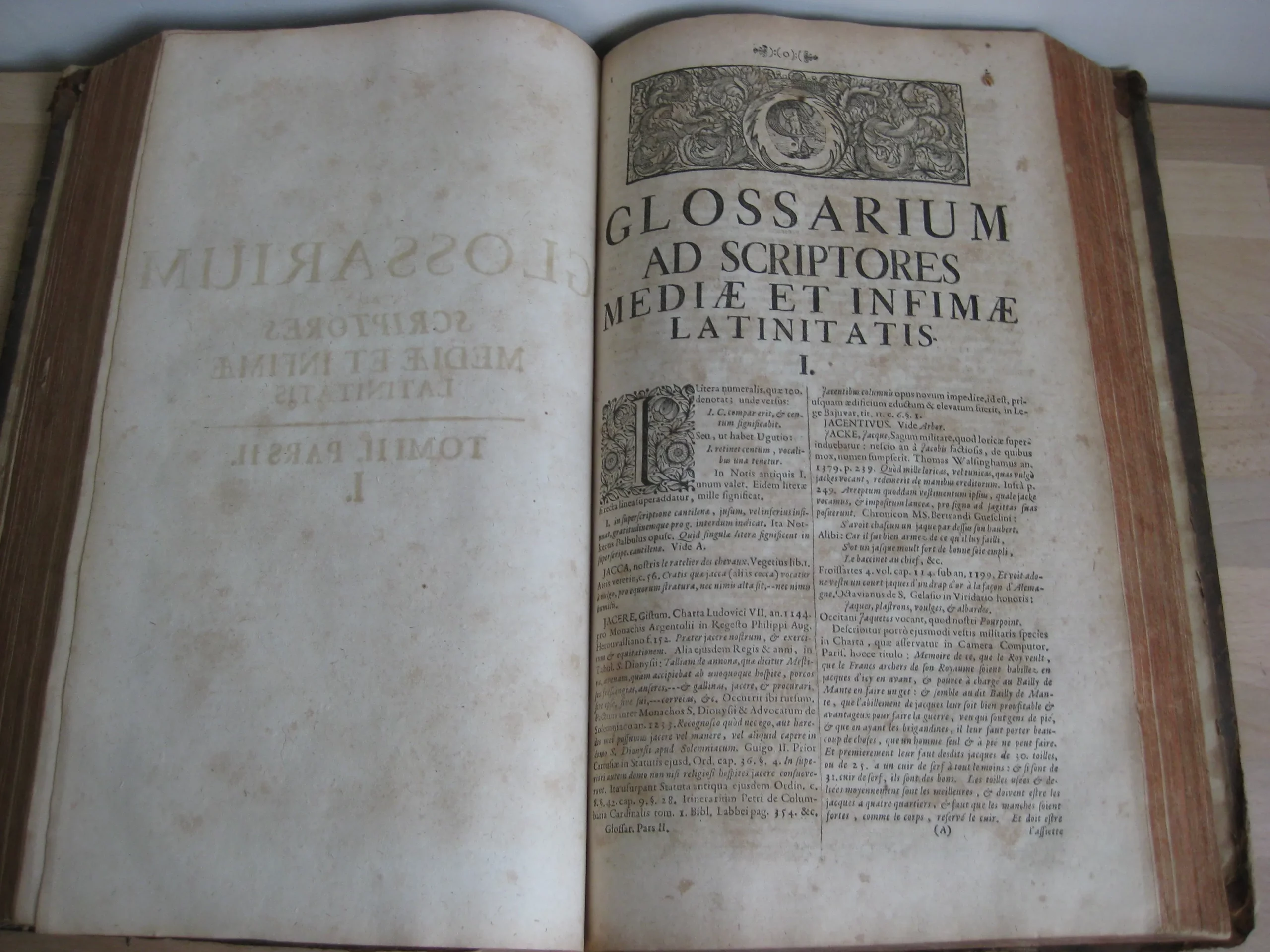 Publié en 1678, le Glossarium ad scriptores mediæ et inifinimæ latinitatis contient près de 140 000 mots expliqués en latin “moderne”. Rousseurs. Rares déchirures, petit manque de texte suite à une adhésion de pages, planches intègres. Reliure avec nombreux accidents et manques.