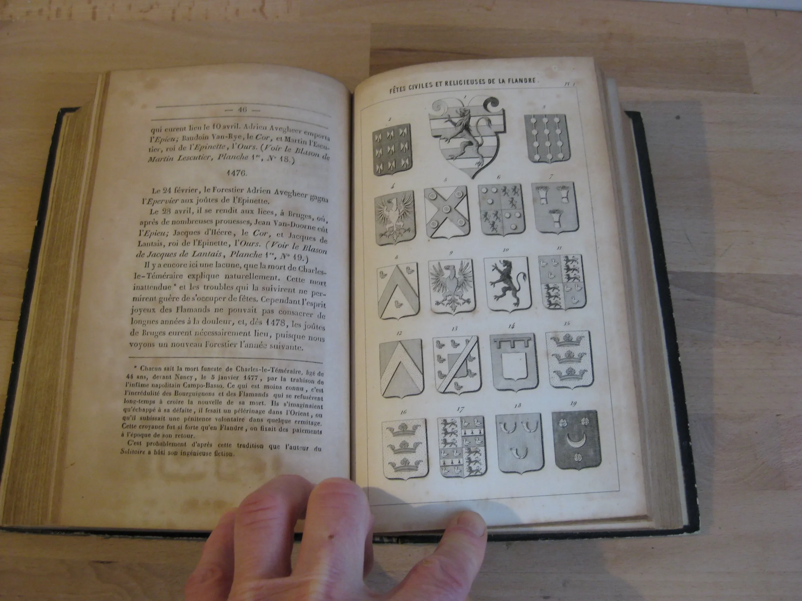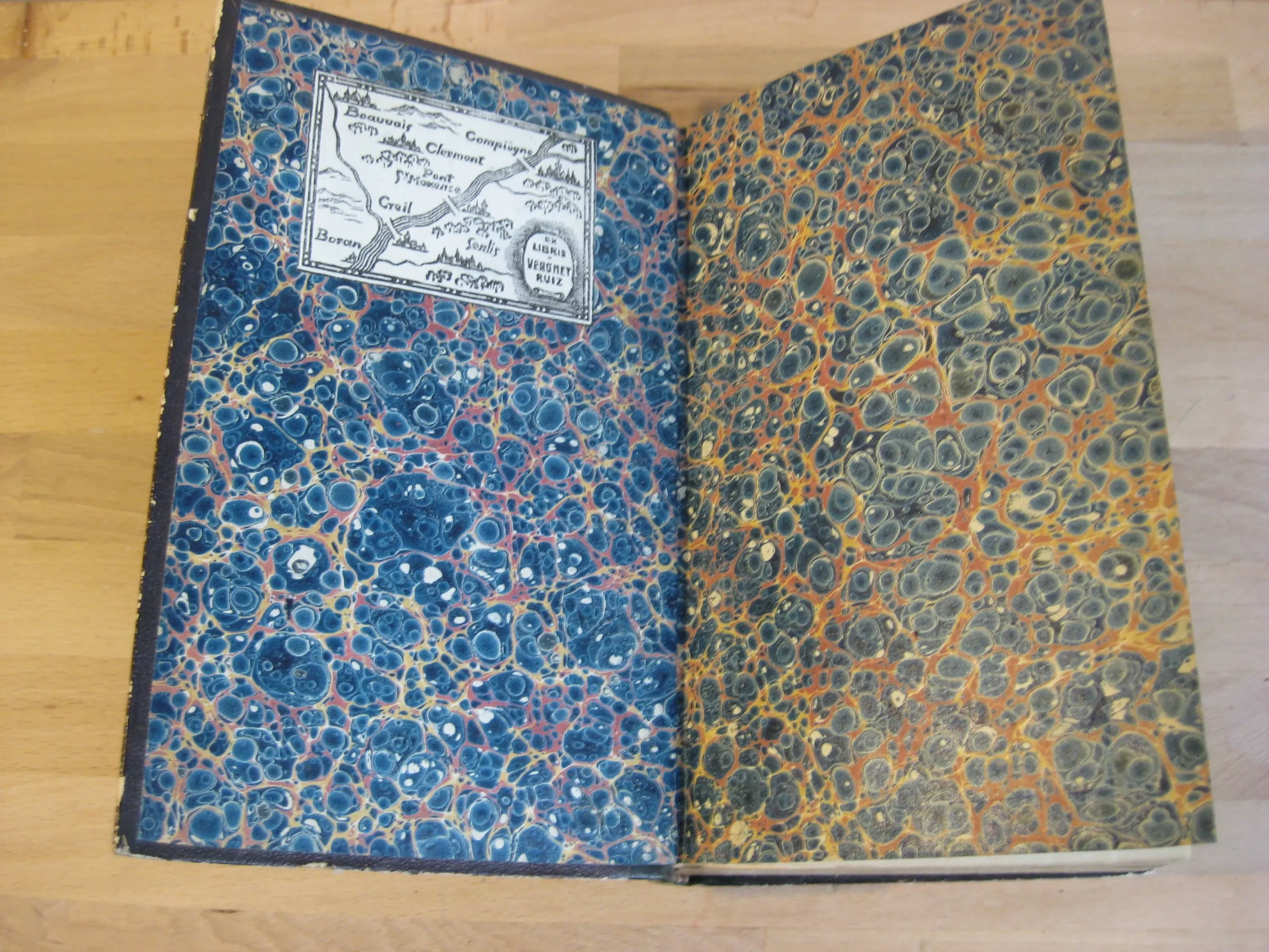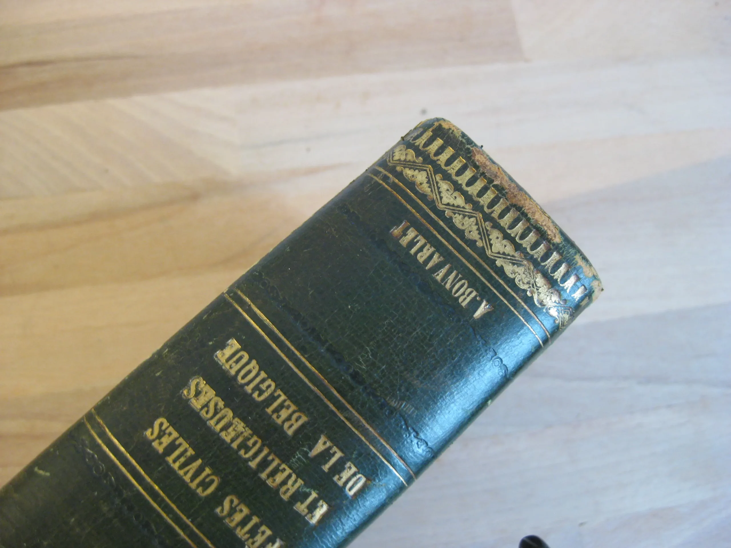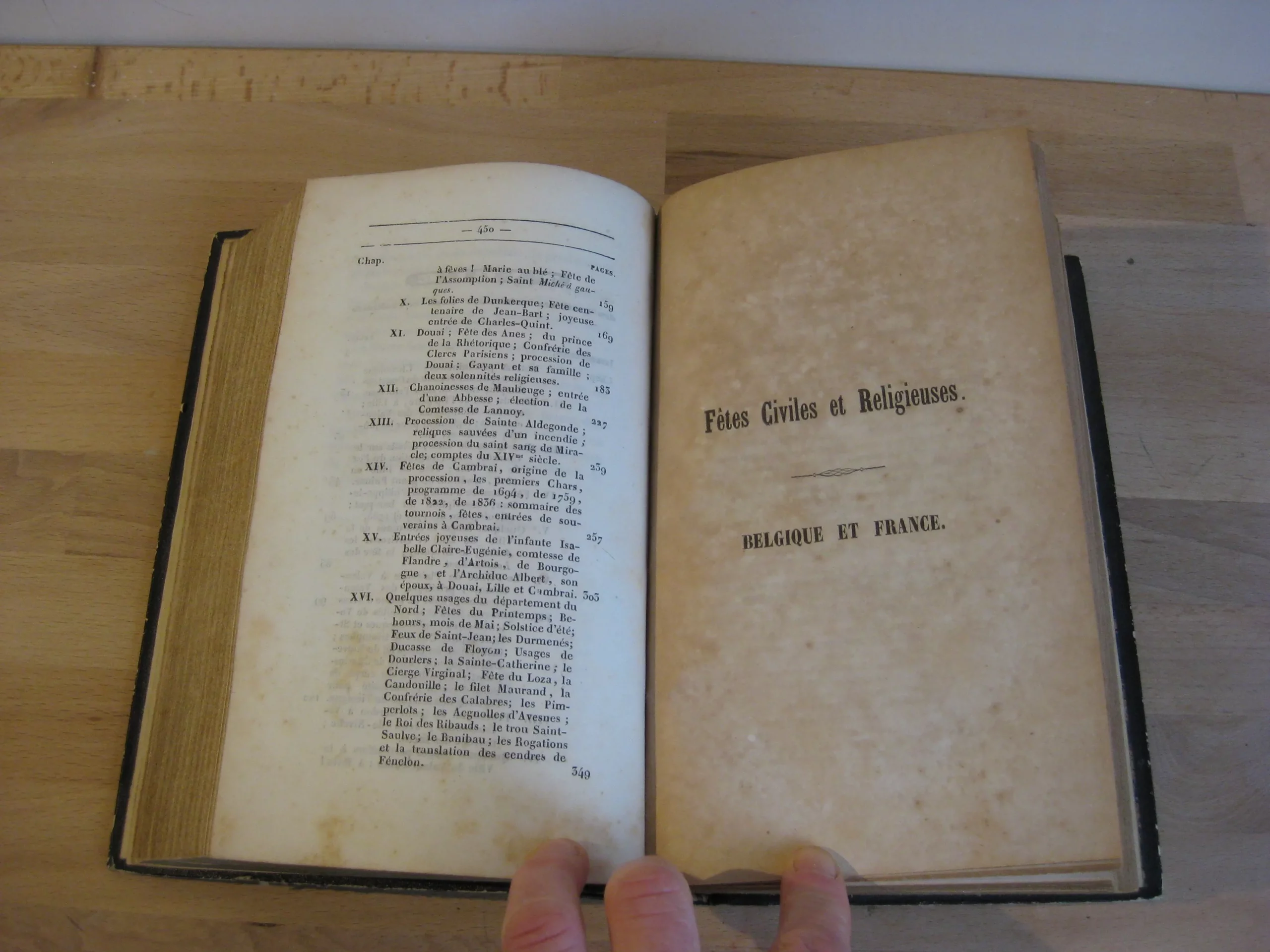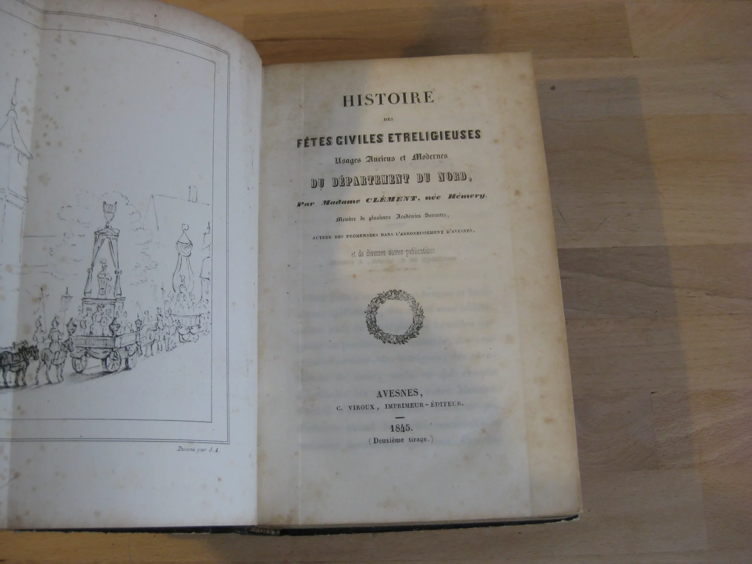 Brown half-calf with long back, decorated with the author, titles and possibly a super-libris “A. Bonvarlet”, 219 x 140, Avesnes, 1845, first edition, second printing. Frontispiece (folding plate with foxing but intact: Communal Festival of Cambrai), 450p. Followed by civil and religious holidays. Ancient and modern uses of southern Belgium and a small number of towns in France, Avesnes, 1846, First edition. Frontispiece (plate 7). Foreword, 5p. And 499p. With 6 plates of coats of arms out of text, and 1 of score and lyrics of the song “El’Doudou”. Interior with foxing, but clean. Flats, corners and fields rubbed but intact. Bits rubbed with scuffs. Headdress and tail (more strongly) with scuffs. Back with claws. Beautiful, firm copy. Note on the upper cover a superb ex-libris “Vernet Ruiz” in the form of a map of the Oise (Senlis etc.)