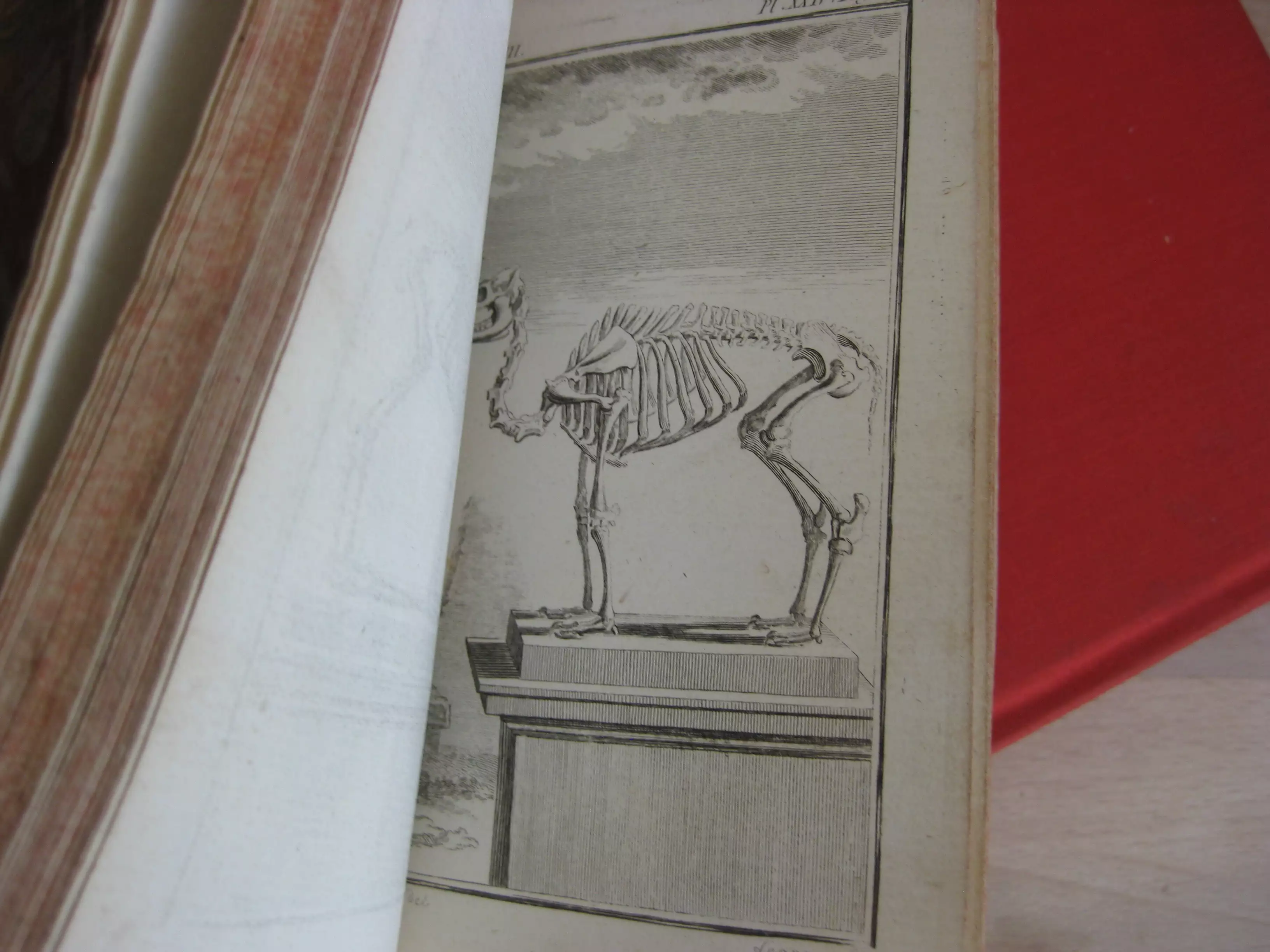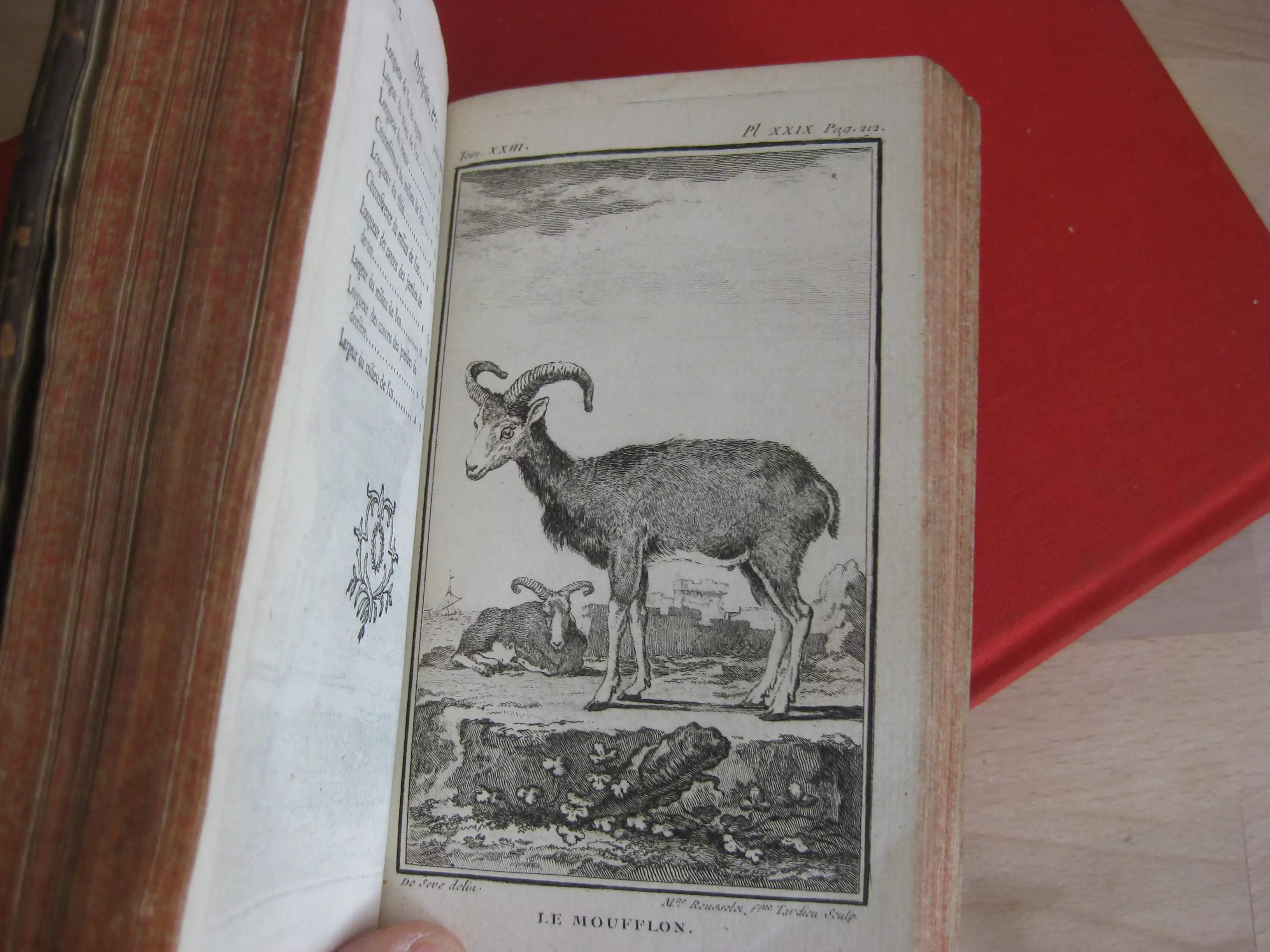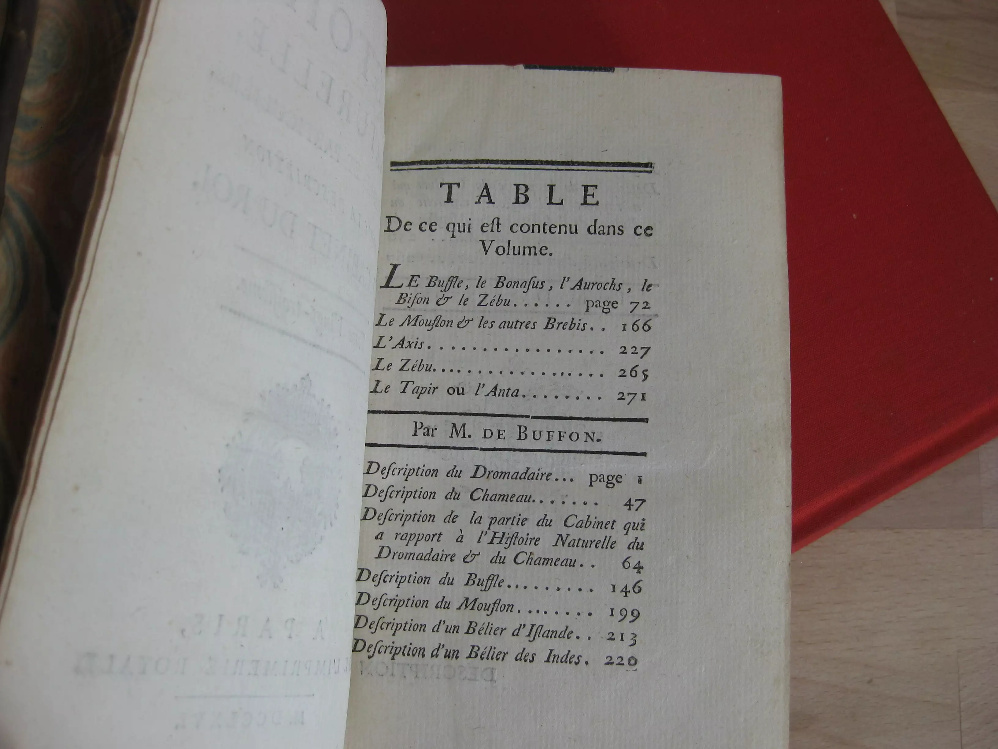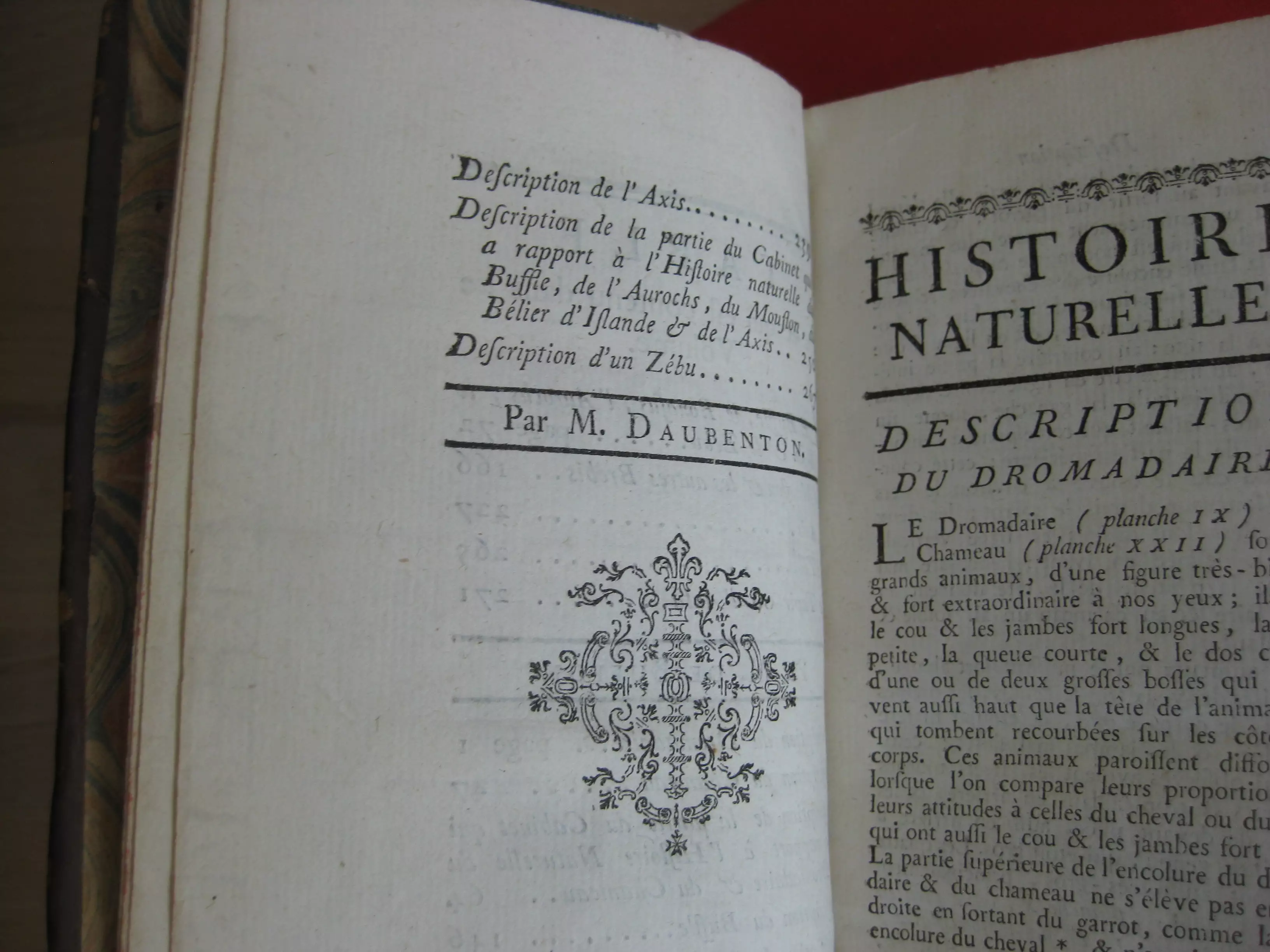 Plein veau, dos à cinq nerfs, tranches jaspées rouges, signet, 168 x 107, 279p. 1766. Table générale avant la lettre. Comprend des études de Daubenton et Buffon, avec 32 planches à pleine page des animaux abordés dans ce volume, ou de leurs organes, squelettes… (Buffle, moutons, axis, zébu, tapir, dromadaire, chameau, bélier). Intérieur très bon, mais reliure très médiocre : manques en champs supérieur,plats et mors supérieurs et inférieurs, et dos et pièce de titre.