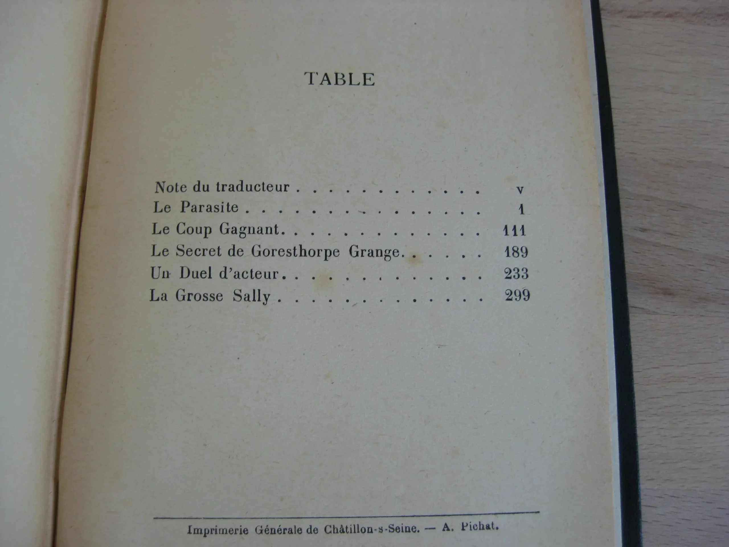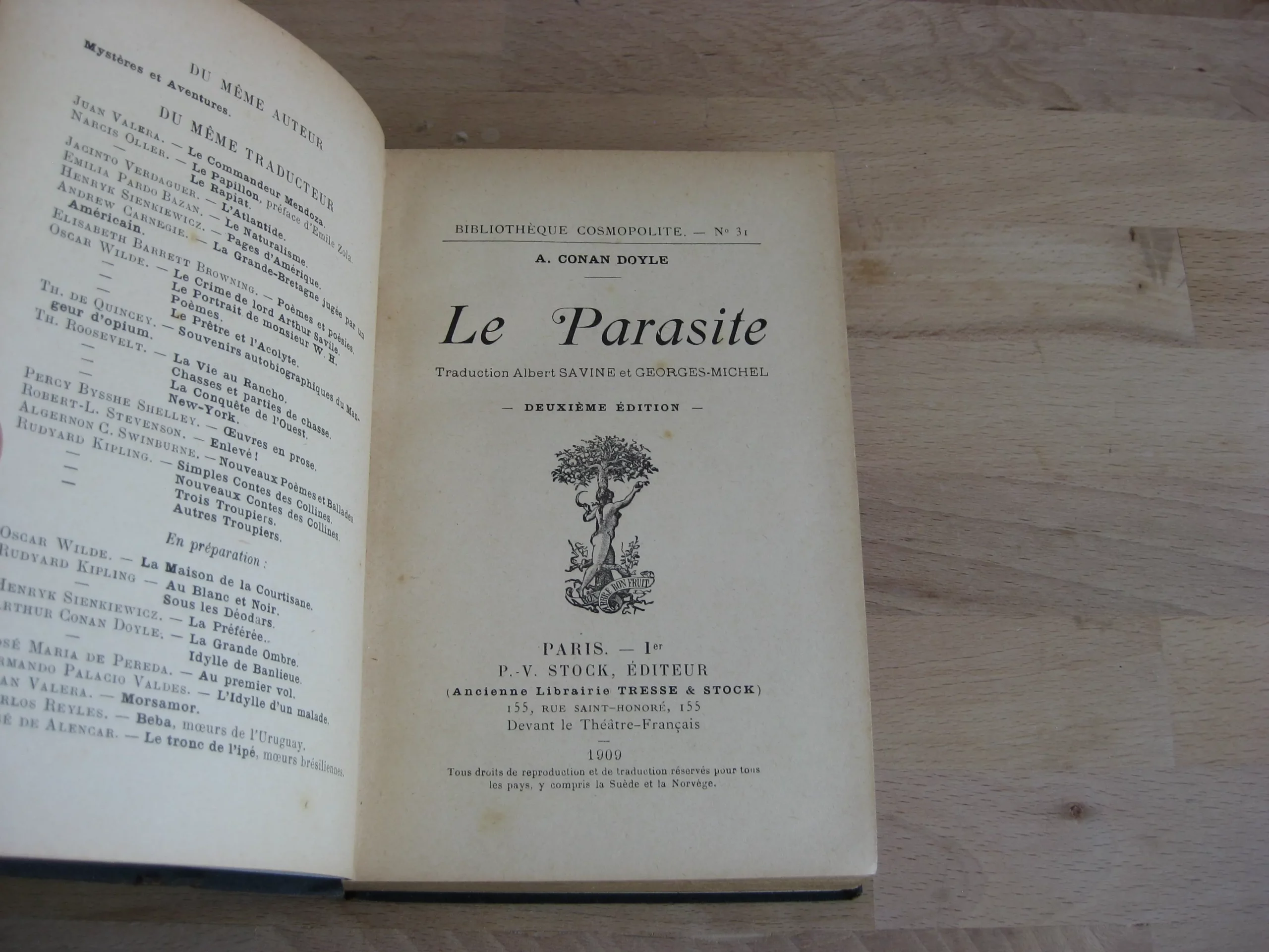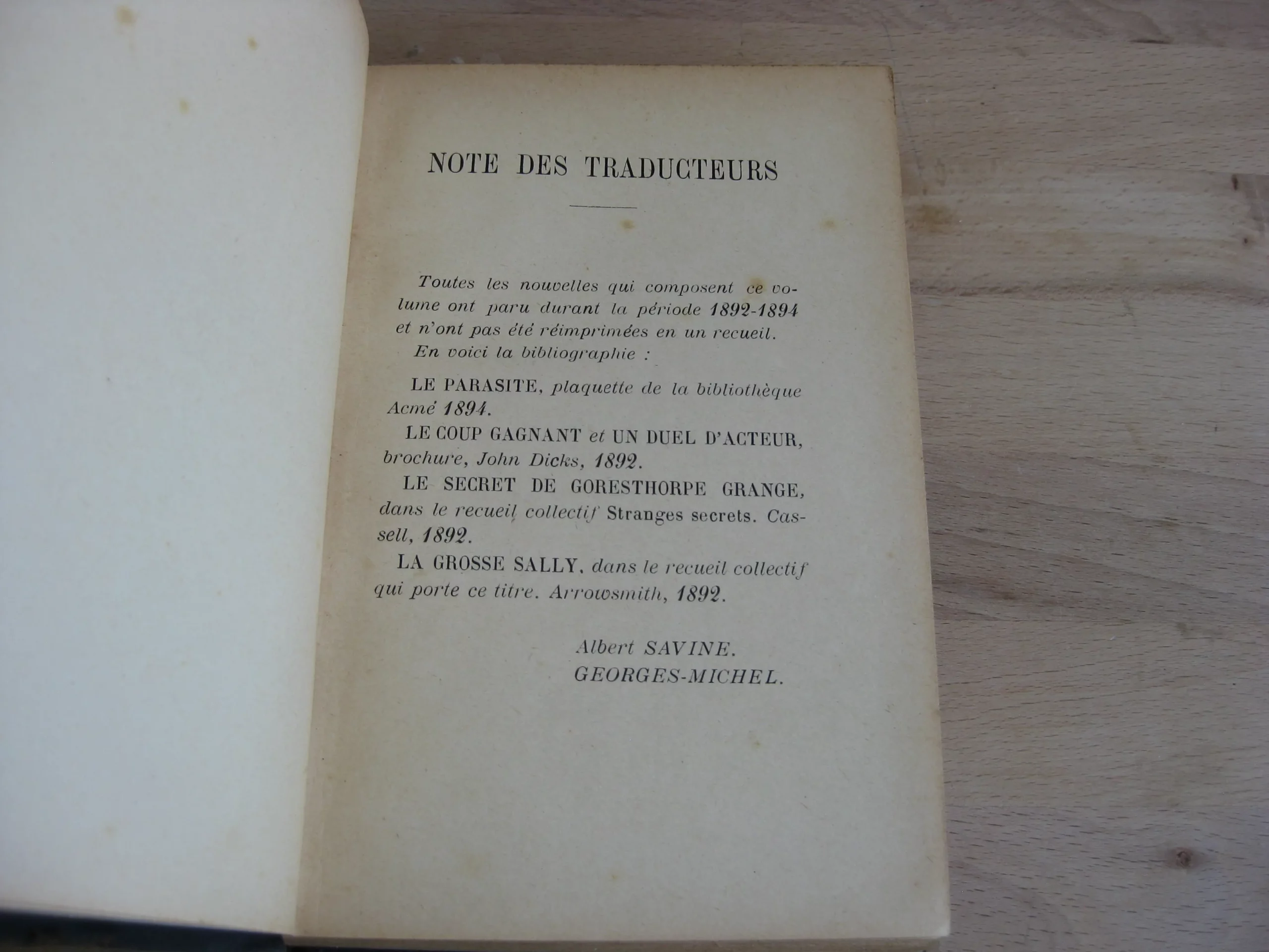 DescriptionP.-V. Stock – Pleine percaline noir à dos long, 182 x 120, 321p.. Hors table. 1909. Traduction de Albert Savine et Georges-Michel. Mention de deuxième édition, possiblement fictive, une justification de tirage figure au verso des notes du traducteur (indiquant 8 exemplaires sur hollande seul grand papier). Sans doute donc la première édition en français. Comprend 5 nouvelles : Le parasite / Le coup gagnant / Un duel d’acteur / Le secret de Goresthorpe Grange / La grosse Sally. Intérieur propre, avec quelques rousseurs en début et fin de volume. Reliure frottée mais propre. Bon exemplaire bien ferme. Également en stock du même auteur, même traduction, chez le même éditeur : La merveilleuse découverte de Raffles Haw