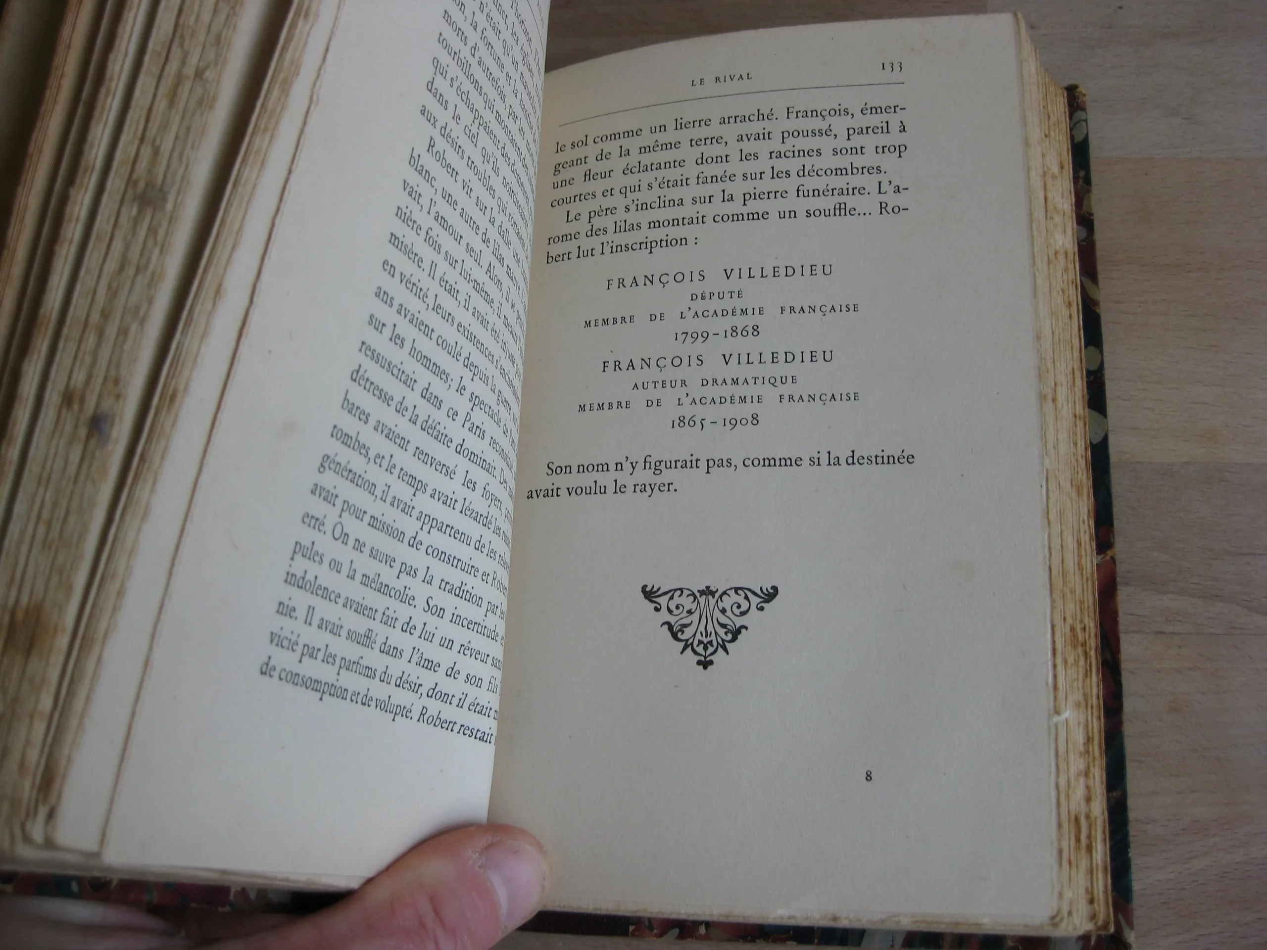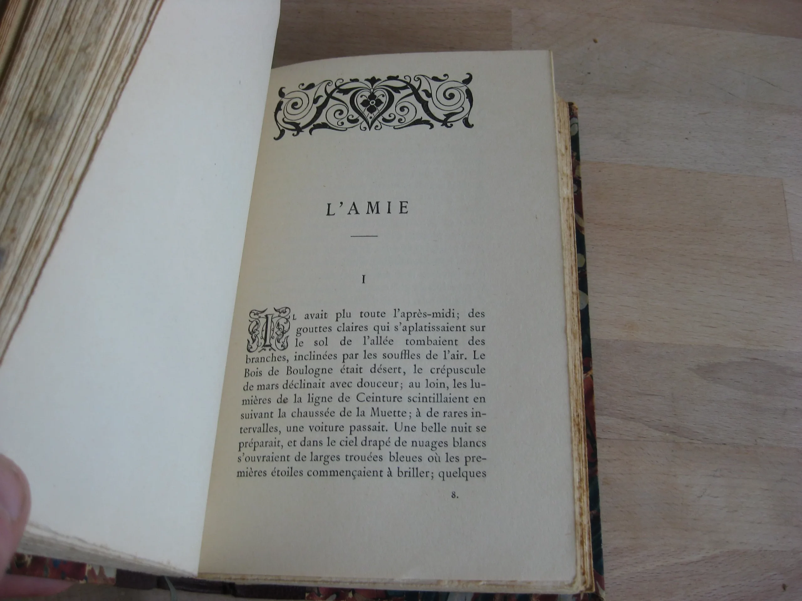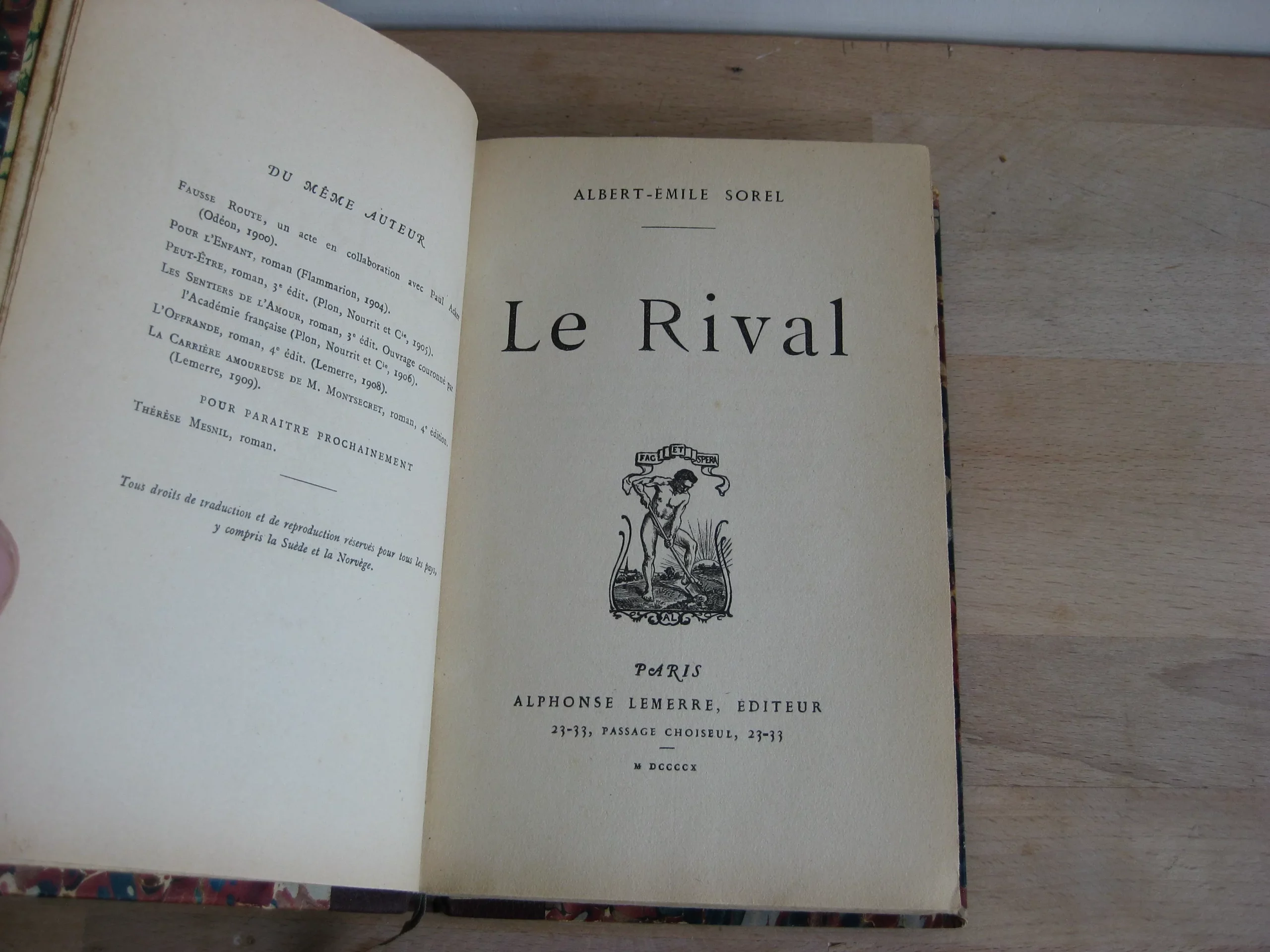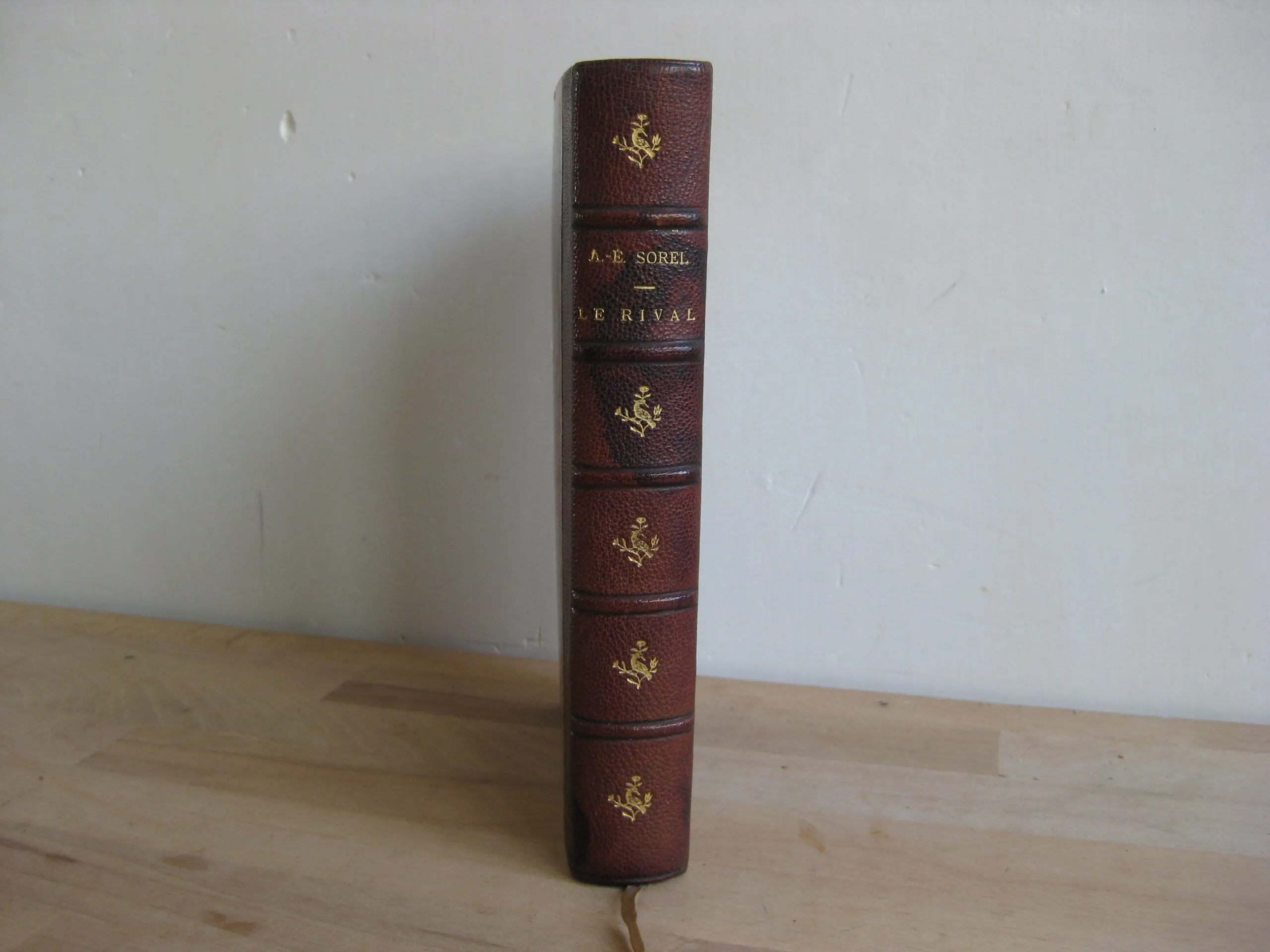 Demi-chagrin chocolat, dos à faux-nerfs, fleuronné aux caissons, orné des titre et auteur, 190 x 125, 133p. 1910. Première édition. Suivi de L’amie, 300p. Rousseurs sur tranches, mais intérieur propre.Excepté des taches sombres, reliure en bel état. Bon exemplaire bien ferme. Fils d’Albert Sorel, Albert-Émile Sorel est un homme de lettres et fut bibliothécaire de la Fondation Thiers.