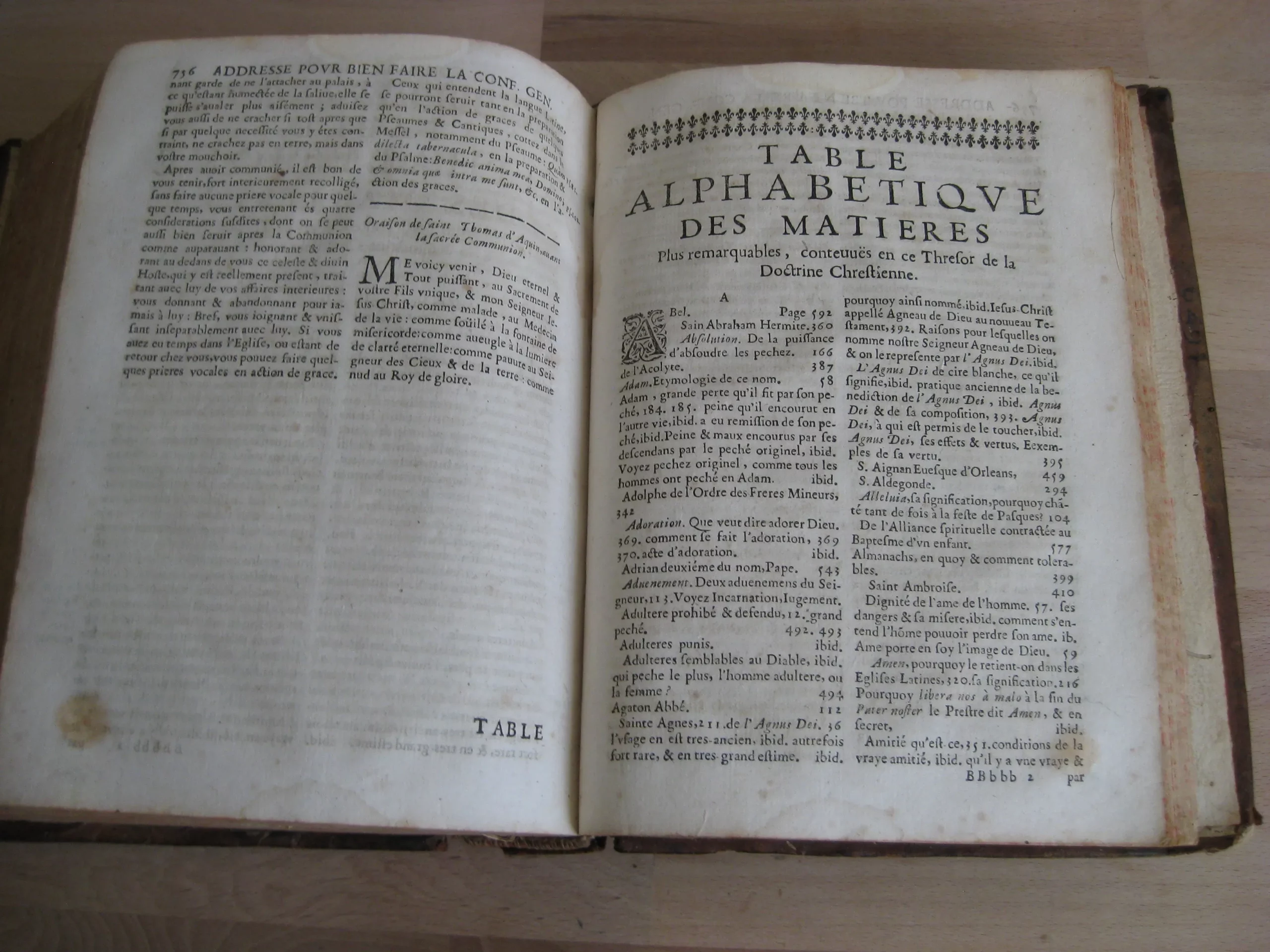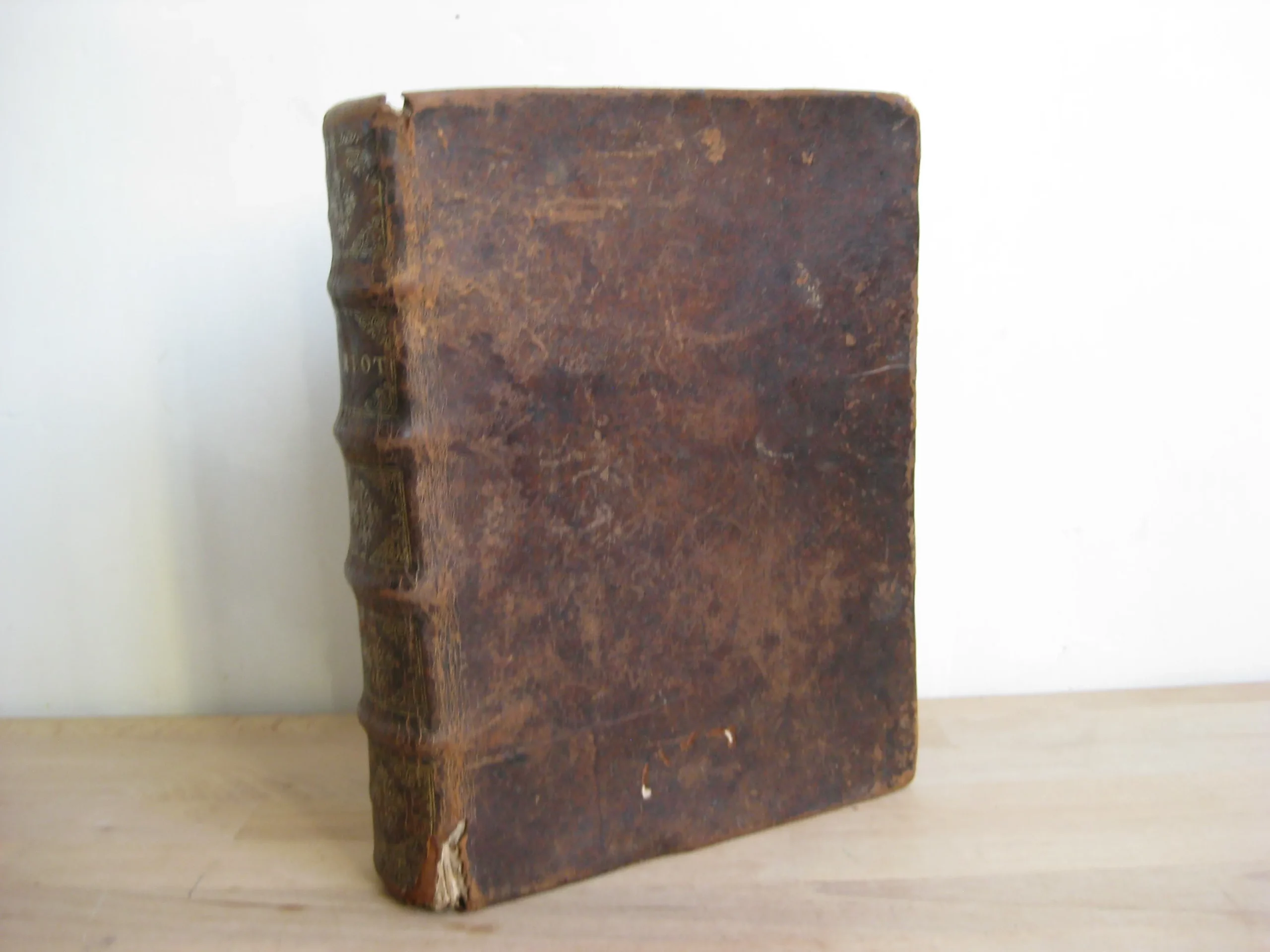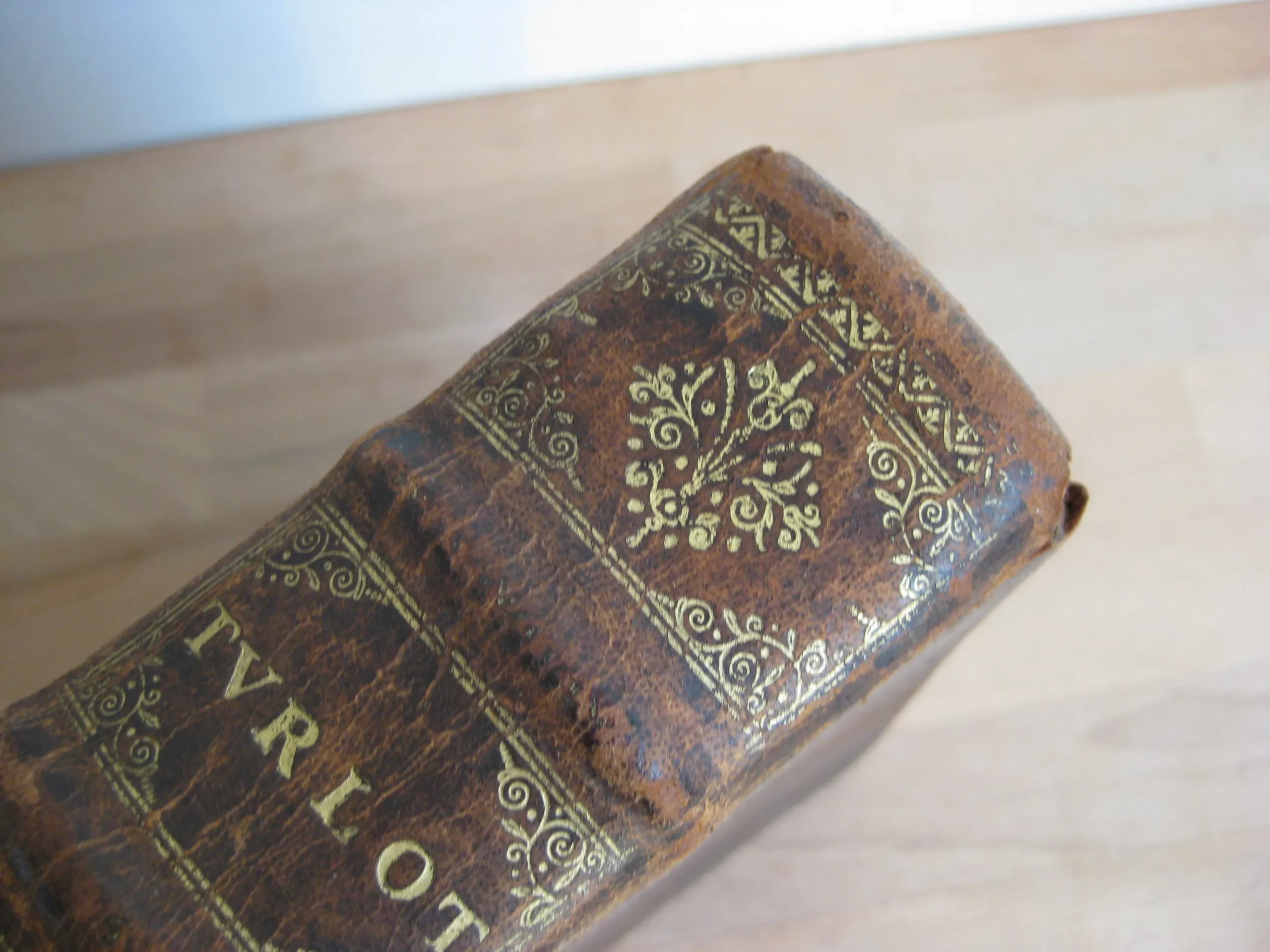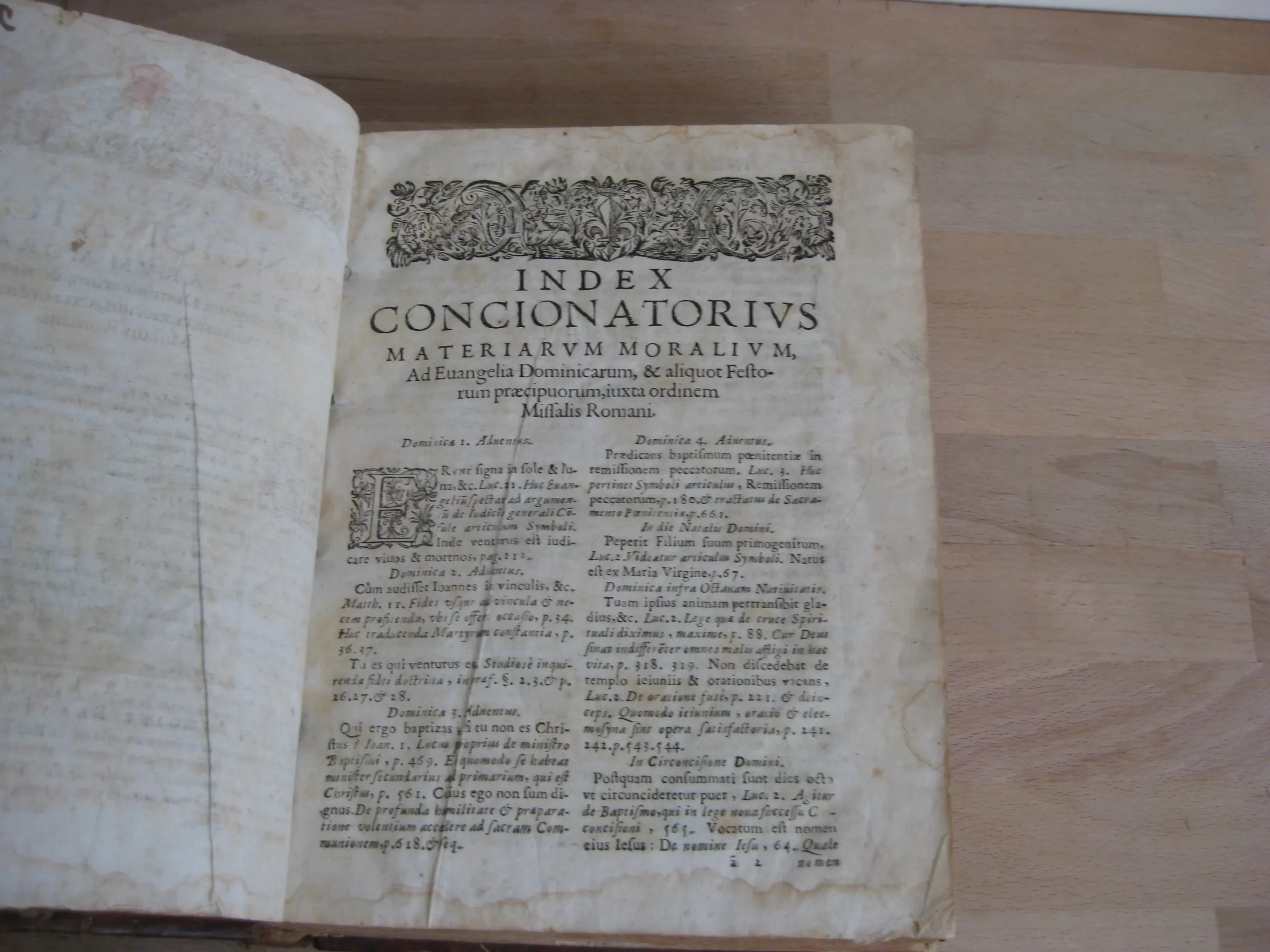 Plein veau, dos à nerfs, orné aux caissons, tranches jaspées rouges, 239 x 185, 1673. 756p. Suivi de la table. Précédé de Index concionatorius …,6p. Entête, cul-de-lampe. Vignette au titre. Garde manquante. Ex-libris au titre, un autre en contreplat supérieur illisible et présent en dernière page et en contreplat inférieur également ; deux autres ex-libris lisibles en dernière page vierge : « La Rouvière » et « Antonij Cosse, humanioribus litteris studientis. Die vigessima marlis 1717 ». Texte sur 2 colonnes. 1Ère partie, 216p. 2Nde part. 217-346 pp. 3Ème part. 347-558 pp. 4Ème part. 559-748 pp. Et Adresse pour bien faire la confession générale, 749 à 756, suivie de la table générale. Intérieur avec rousseurs variables, plus souvent légères, et mouillures en pied de page, modérées. Plats frottés avec épidermures et petits manques et trous de vers. Champs et coins frottés, 3 coins émousés. Dos frotté aux nerfs, coiffe et queue, avec deux trous de vers, et manque en pied ; manque que l’on retrouve en pied de mors supérieur. Exemplaire bien ferme.