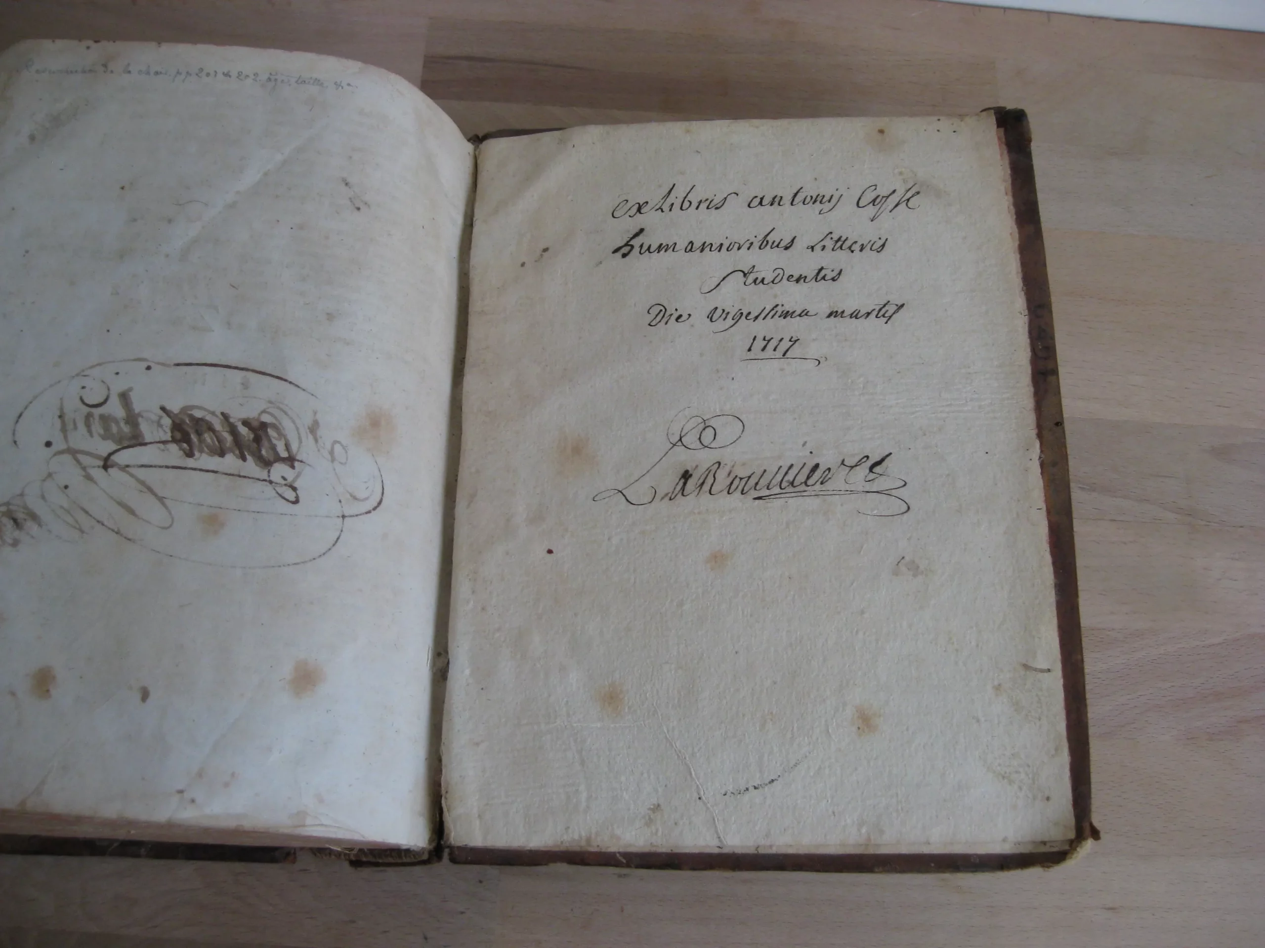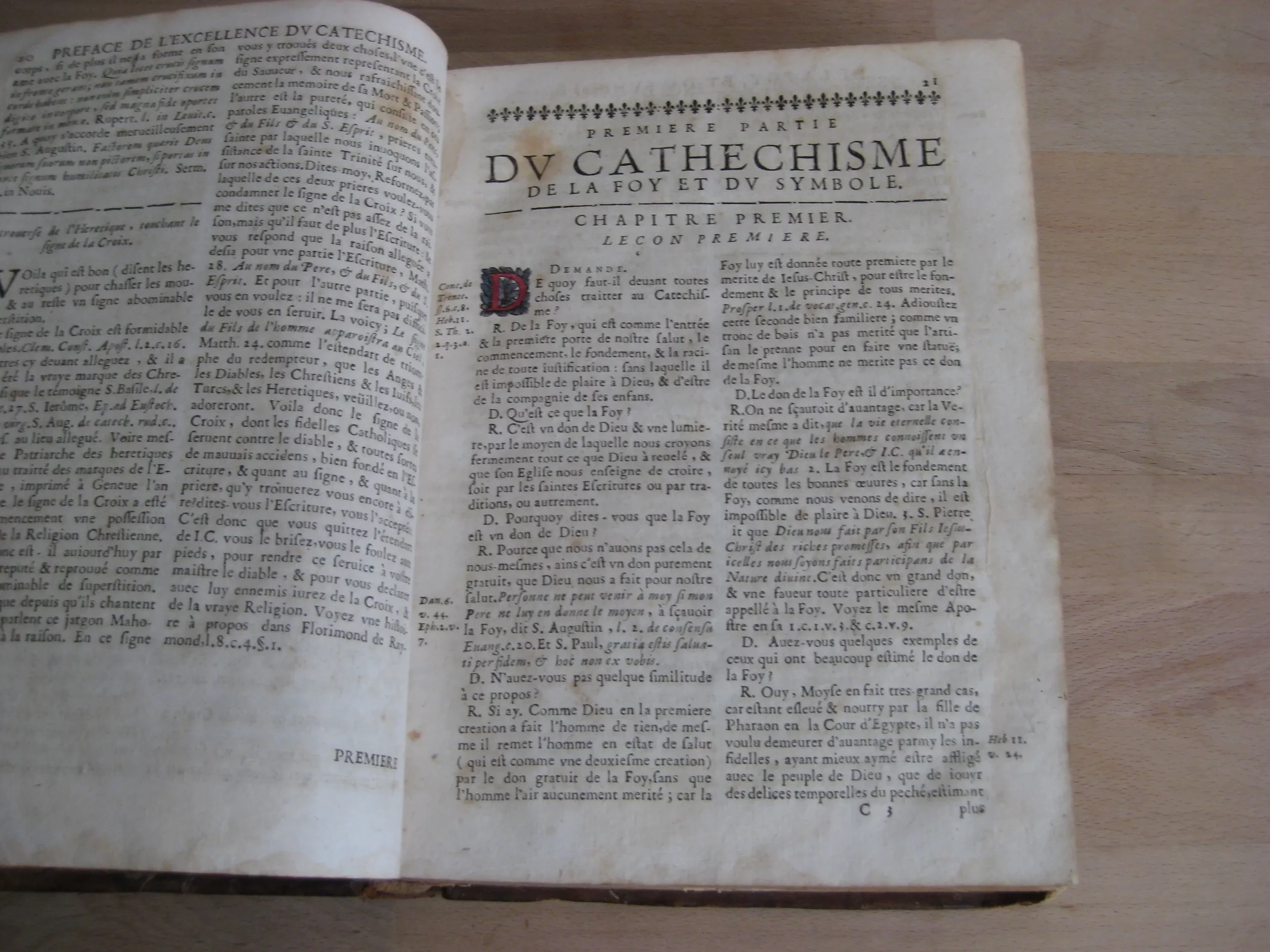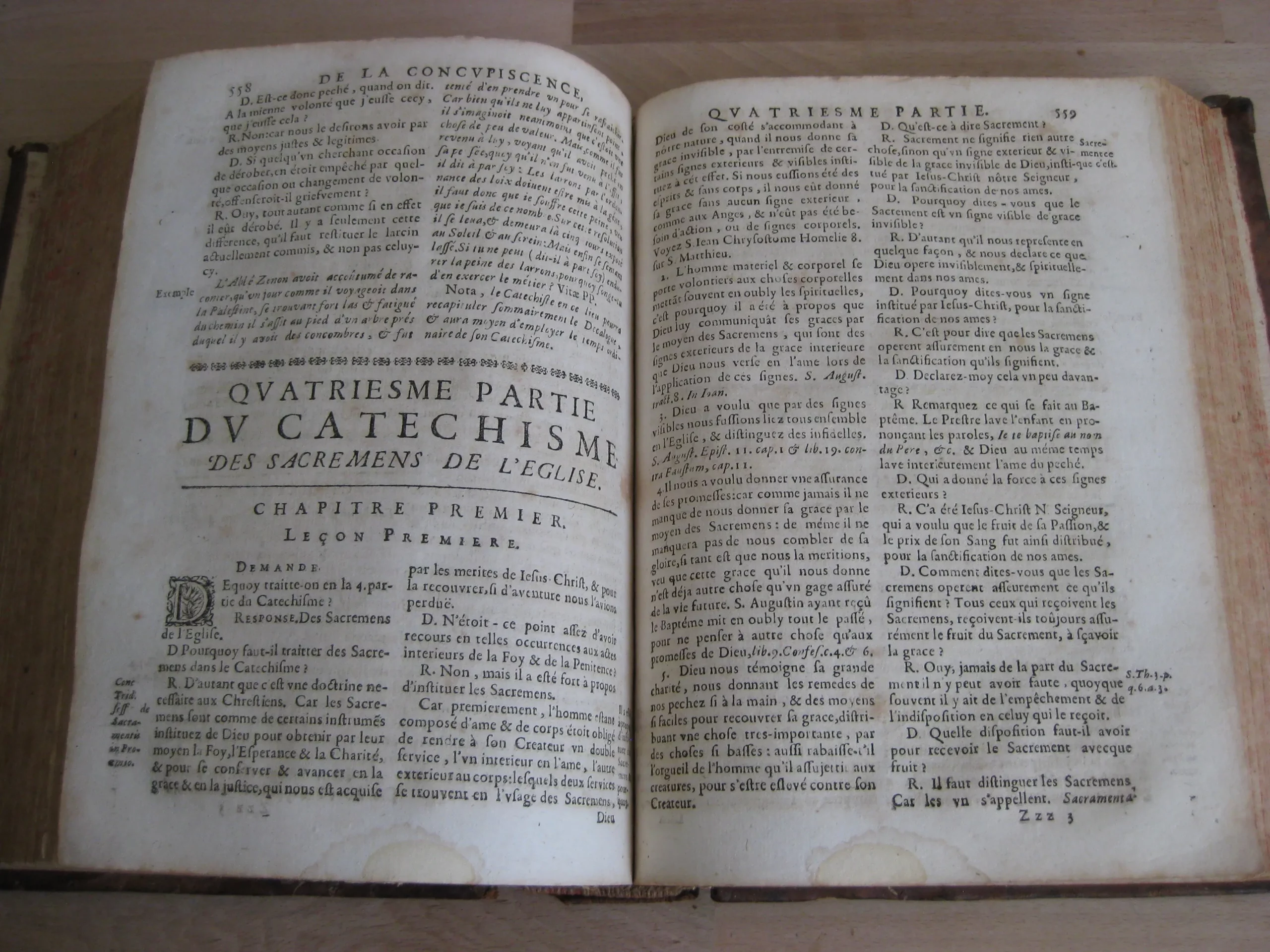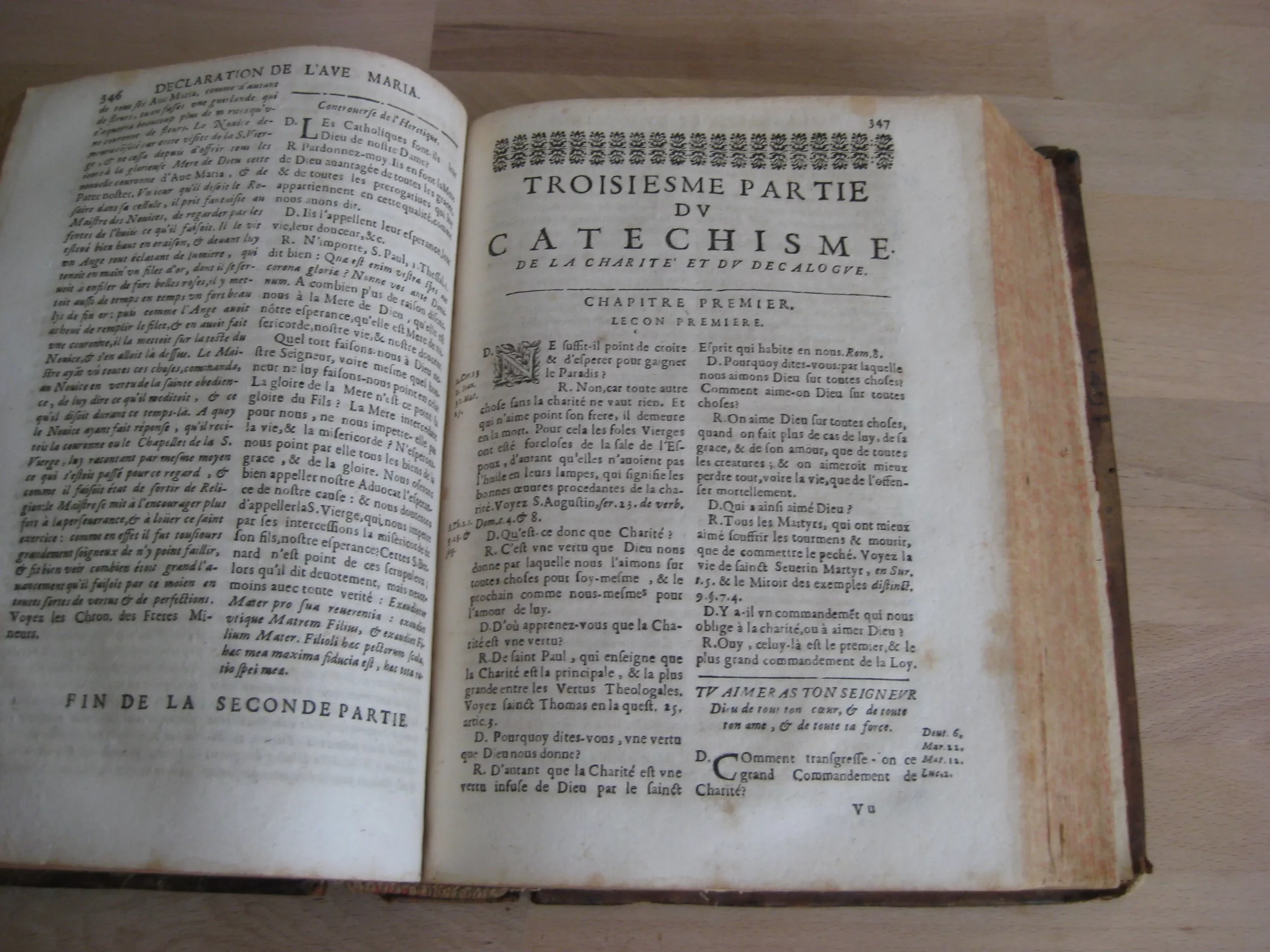 Plein veau, dos à nerfs, orné aux caissons, tranches jaspées rouges, 239 x 185, 1673. 756p. Suivi de la table. Précédé de Index concionatorius …,6p. Entête, cul-de-lampe. Vignette au titre. Garde manquante. Ex-libris au titre, un autre en contreplat supérieur illisible et présent en dernière page et en contreplat inférieur également ; deux autres ex-libris lisibles en dernière page vierge : « La Rouvière » et « Antonij Cosse, humanioribus litteris studientis. Die vigessima marlis 1717 ». Texte sur 2 colonnes. 1Ère partie, 216p. 2Nde part. 217-346 pp. 3Ème part. 347-558 pp. 4Ème part. 559-748 pp. Et Adresse pour bien faire la confession générale, 749 à 756, suivie de la table générale. Intérieur avec rousseurs variables, plus souvent légères, et mouillures en pied de page, modérées. Plats frottés avec épidermures et petits manques et trous de vers. Champs et coins frottés, 3 coins émousés. Dos frotté aux nerfs, coiffe et queue, avec deux trous de vers, et manque en pied ; manque que l’on retrouve en pied de mors supérieur. Exemplaire bien ferme.