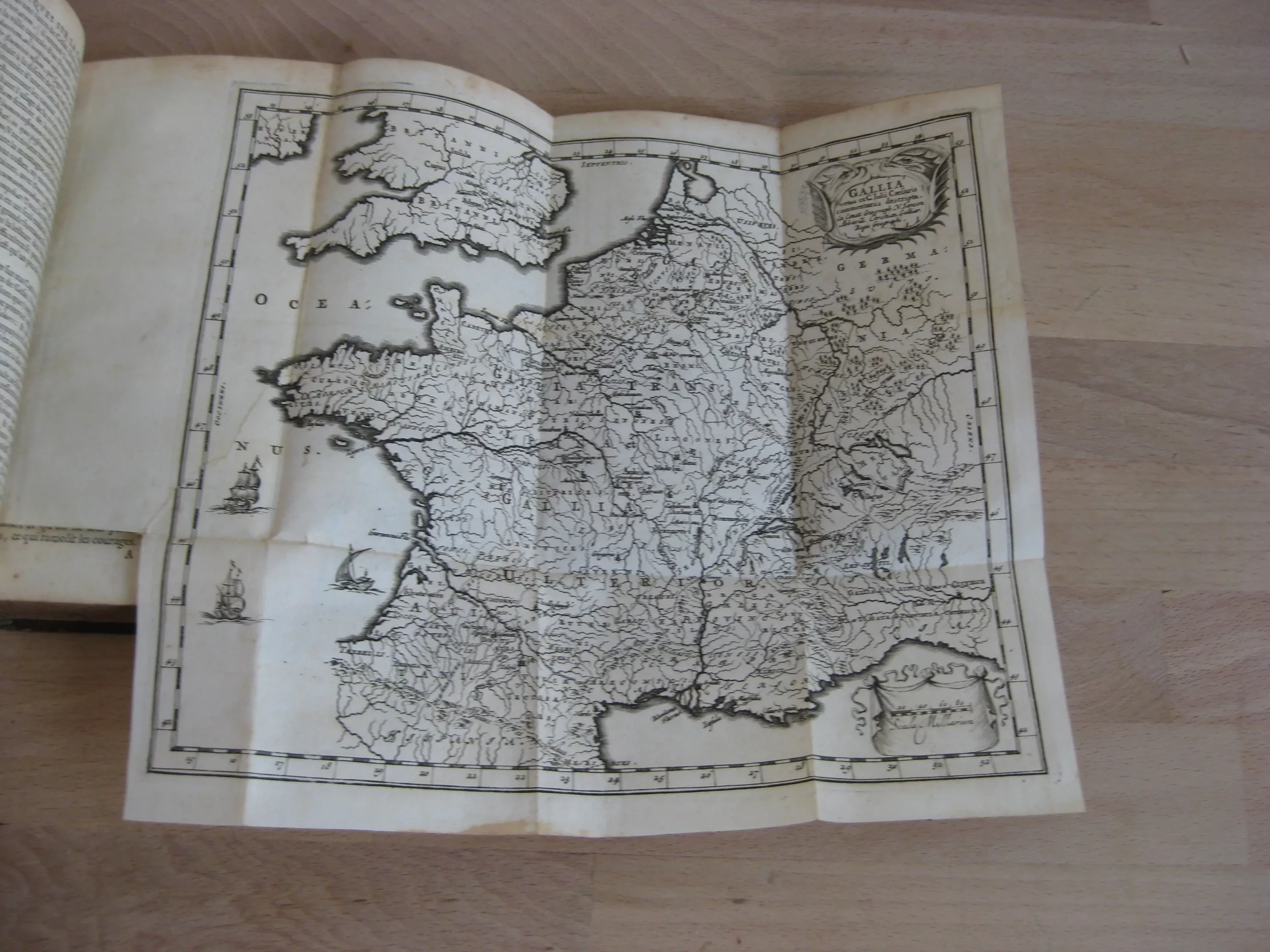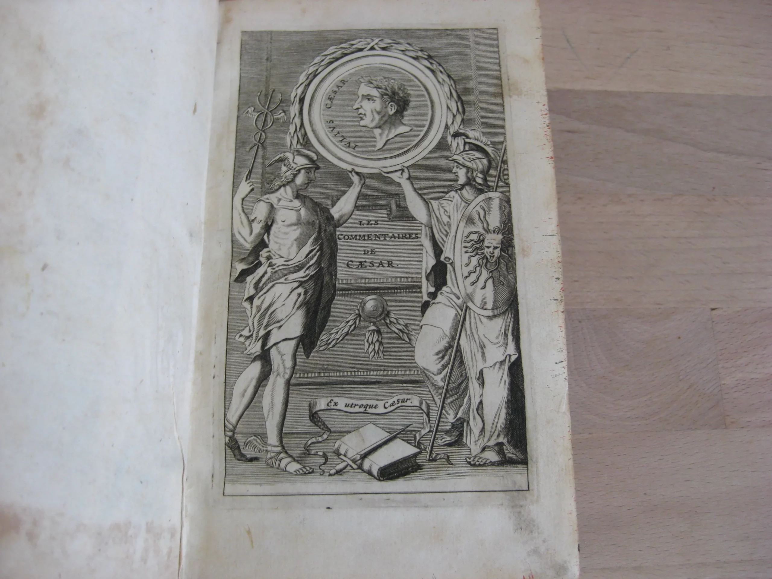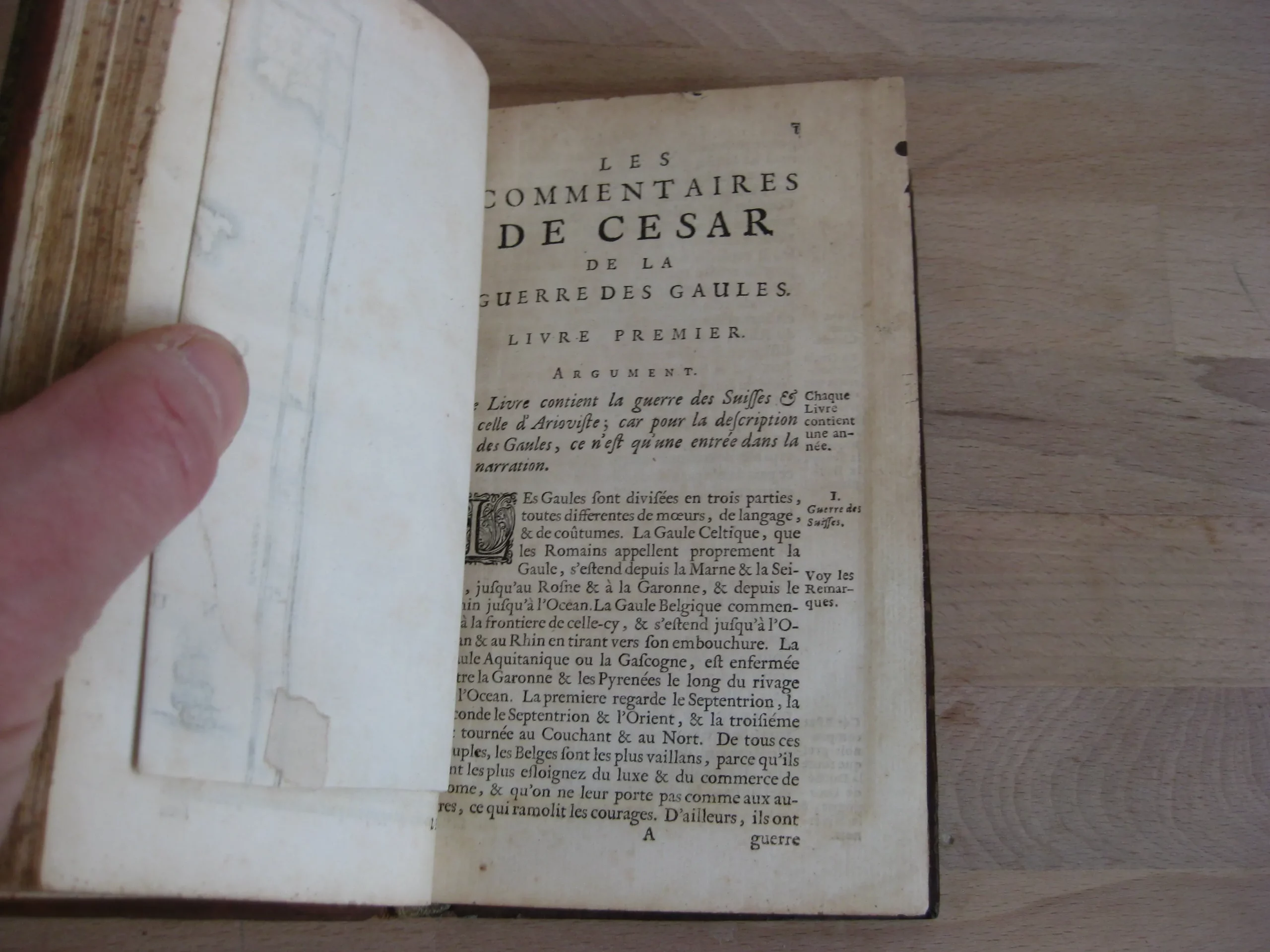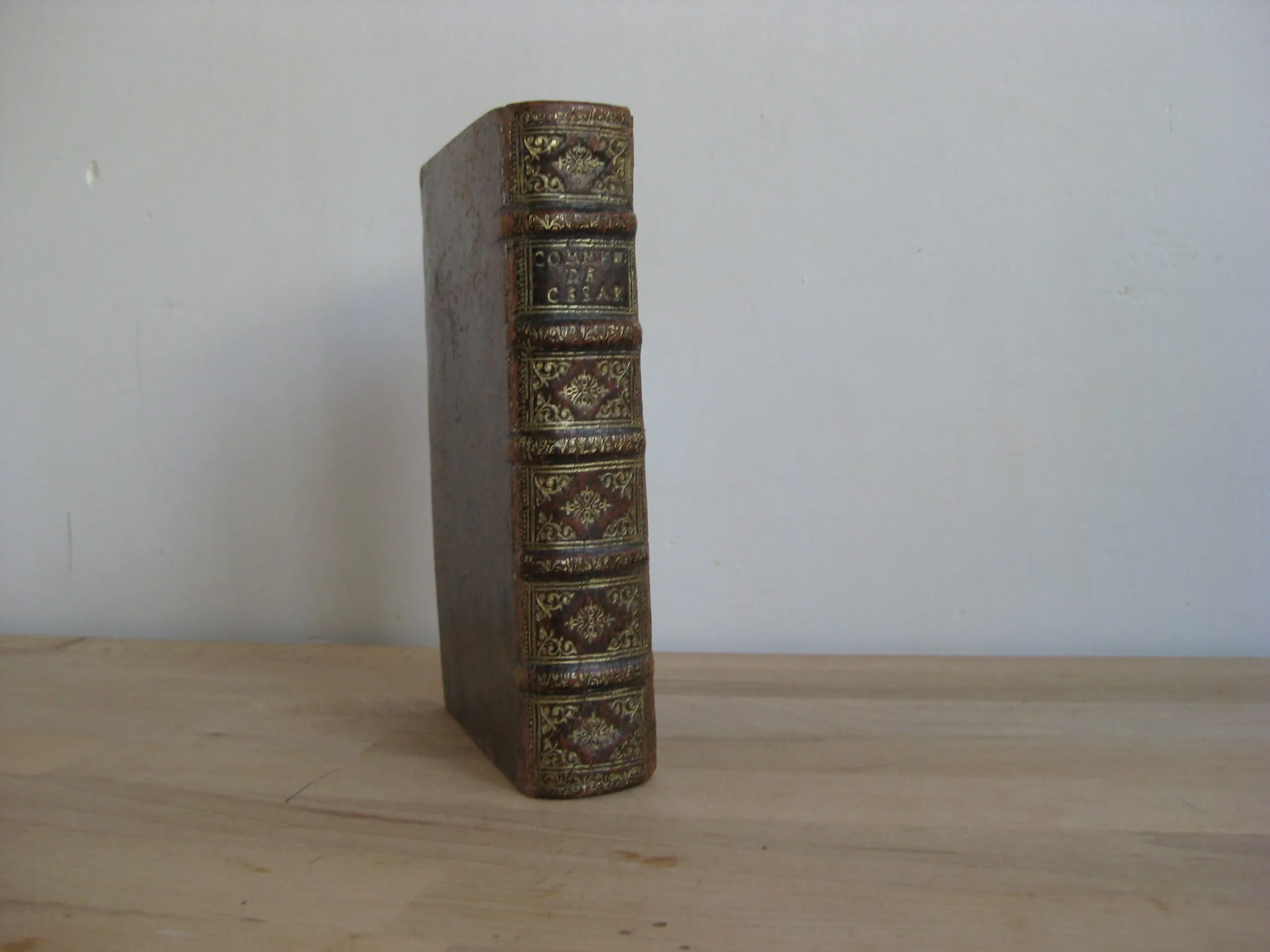 Plein veau à 5 nerfs richement orné aux caissons et d’une pièce de titre en maroquin lie de vin, tranches jaspées, champs ornés, 159 x 100, 444p. Hors table (31p.). 1678. Edition nouvelle revue et corrigée. Avant la lettre : frontispice, Epistre, 10p. , Préface, 7p. Avis au lecteur, 15p. Remarques sur la carte de l’ancienne Gaule, tirées des Commentaires de César, par le Sieur Samson D’Abbeville, géographe du Roy, pp.II-LX, et la carte dépliante (intègre). Comprend également une planche dépliante (intègre). Intérieur propre, rousseurs marginales. Bel état de la reliure : frottements et épidermures en coins, champs et plats. Dos en très bel état, épidermures en coiffe et queue.