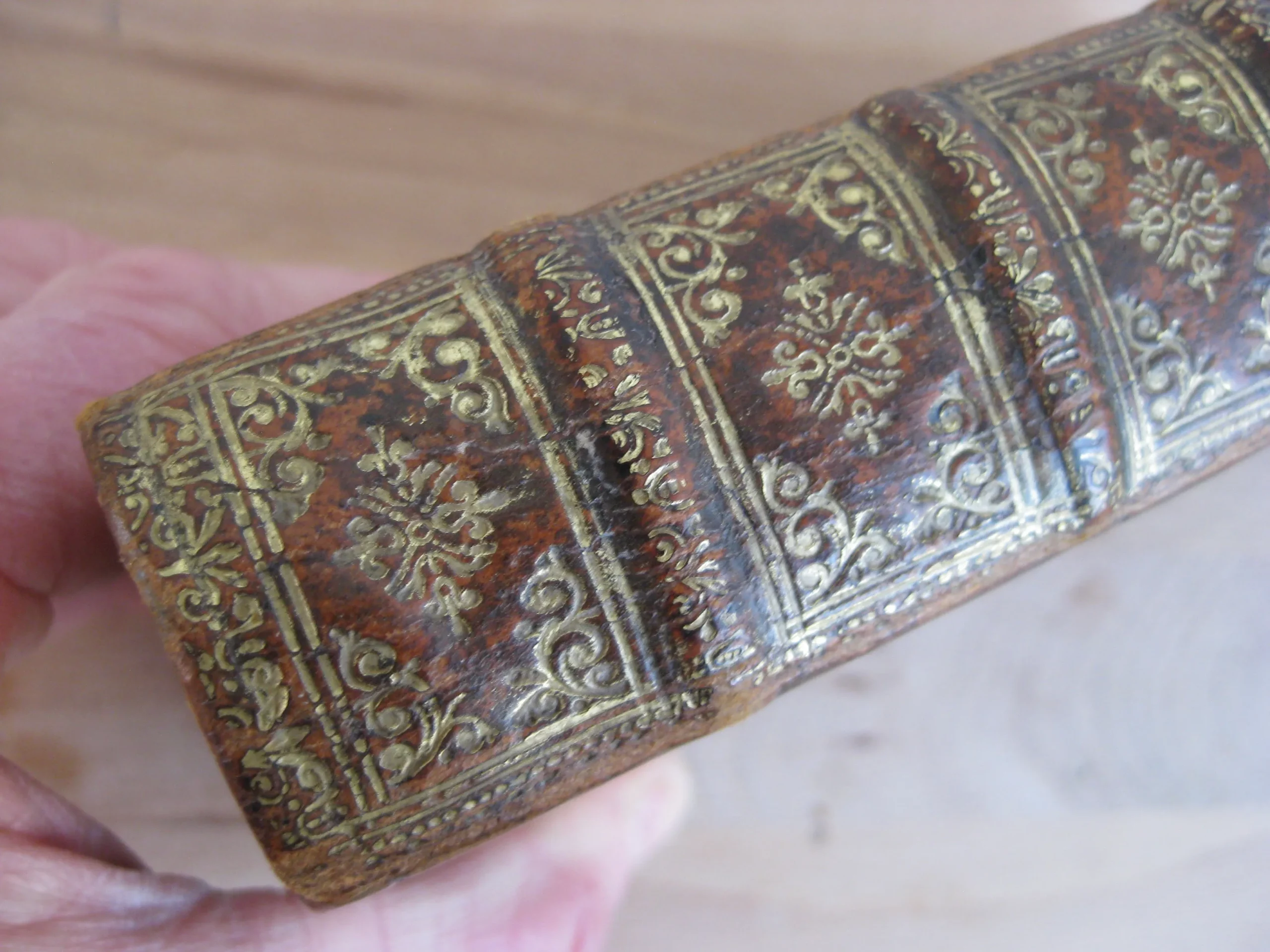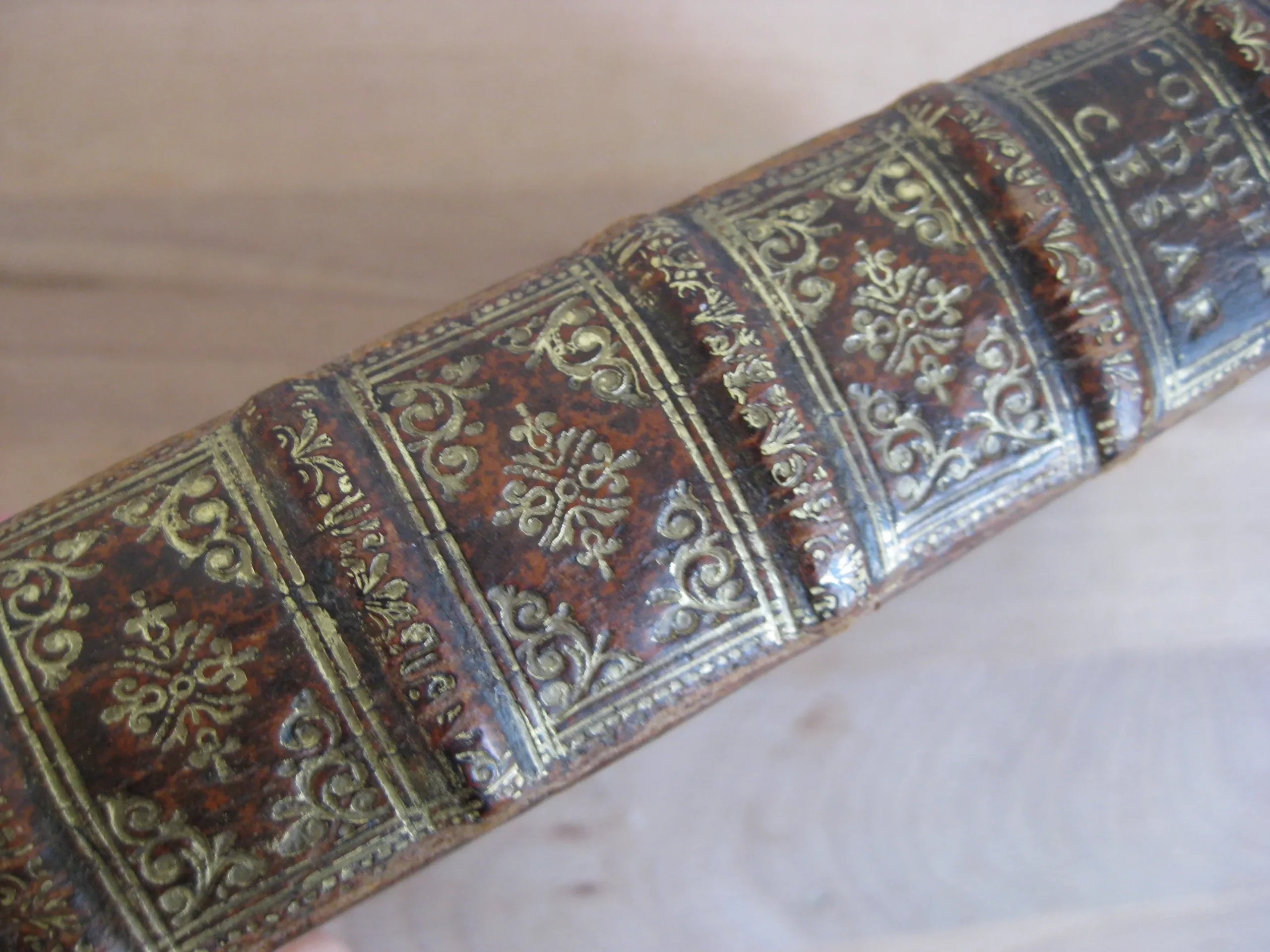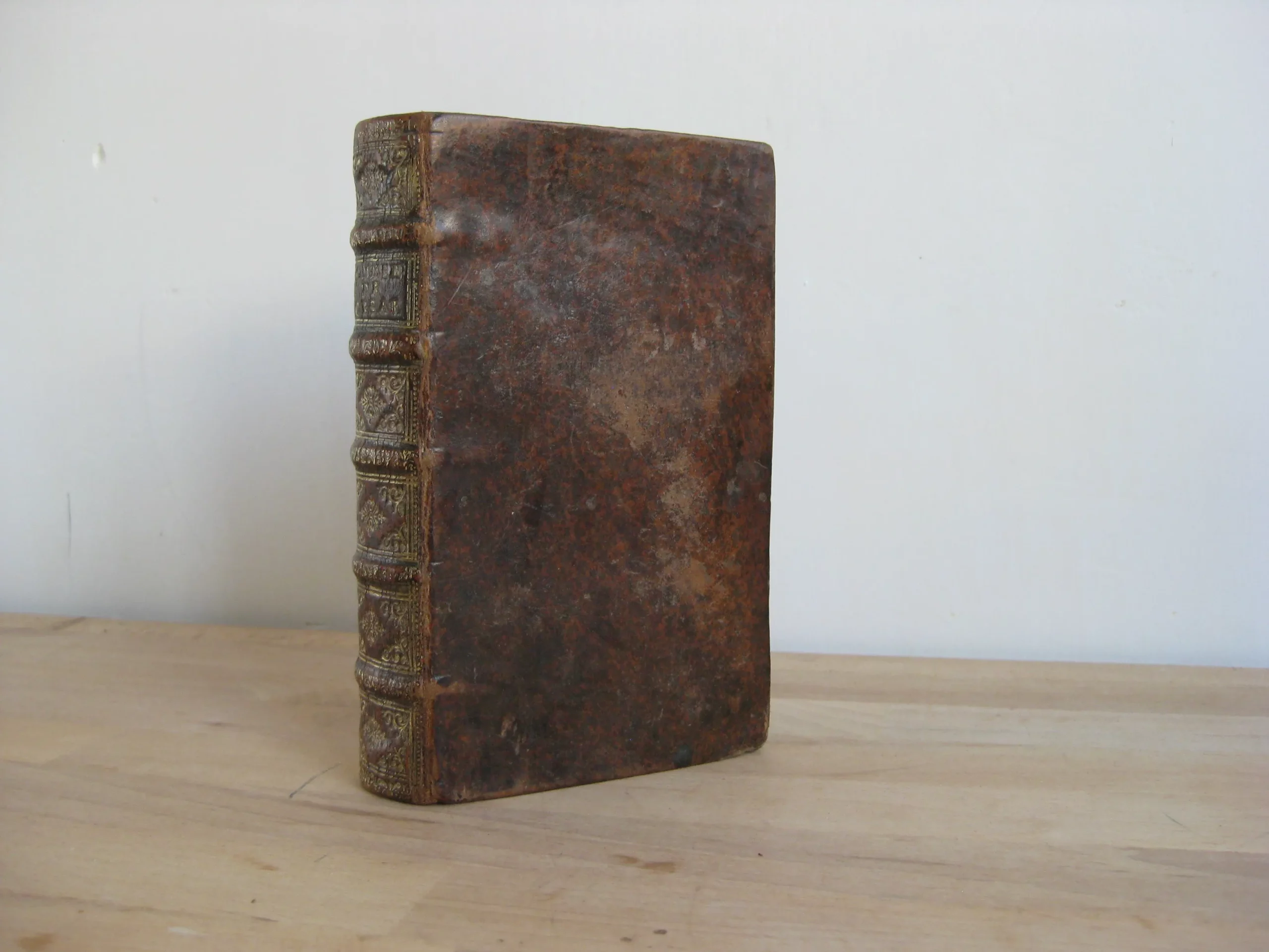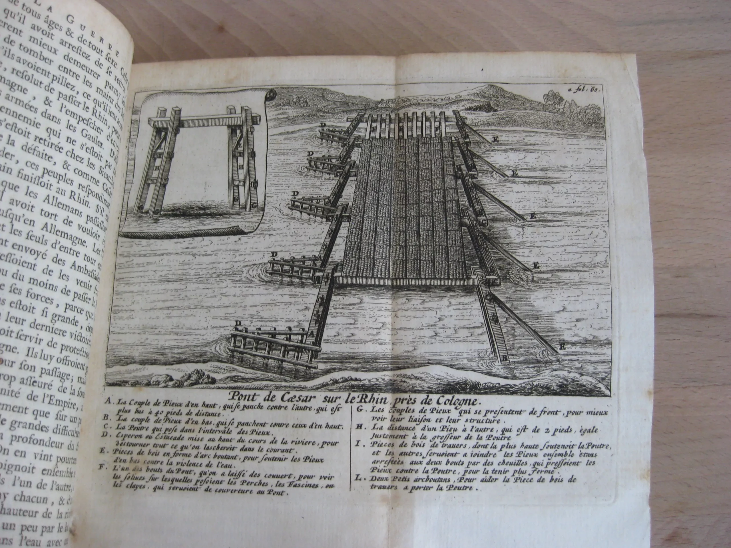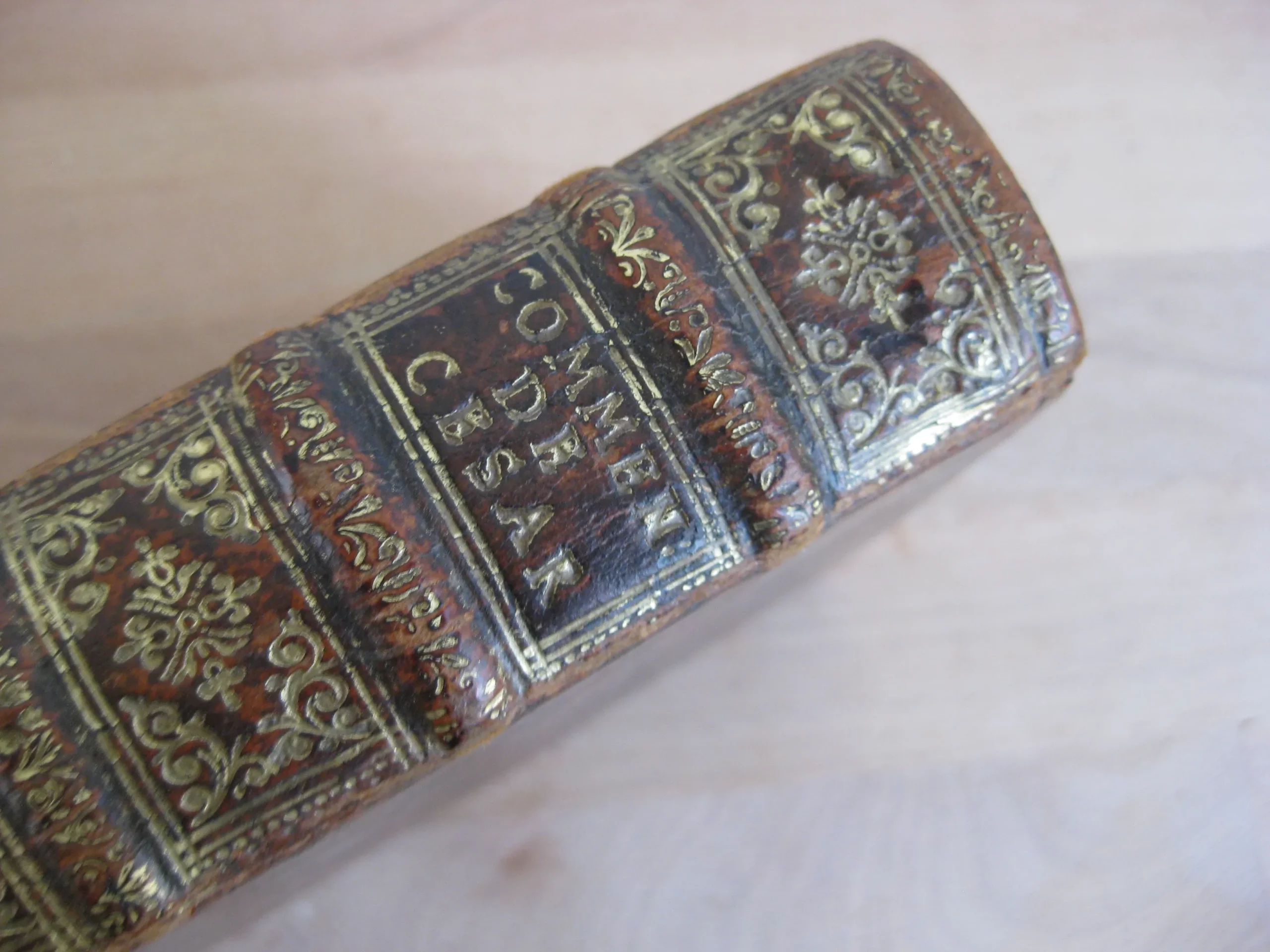 Plein veau à 5 nerfs richement orné aux caissons et d’une pièce de titre en maroquin lie de vin, tranches jaspées, champs ornés, 159 x 100, 444p. Hors table (31p.). 1678. Edition nouvelle revue et corrigée. Avant la lettre : frontispice, Epistre, 10p. , Préface, 7p. Avis au lecteur, 15p. Remarques sur la carte de l’ancienne Gaule, tirées des Commentaires de César, par le Sieur Samson D’Abbeville, géographe du Roy, pp.II-LX, et la carte dépliante (intègre). Comprend également une planche dépliante (intègre). Intérieur propre, rousseurs marginales. Bel état de la reliure : frottements et épidermures en coins, champs et plats. Dos en très bel état, épidermures en coiffe et queue.