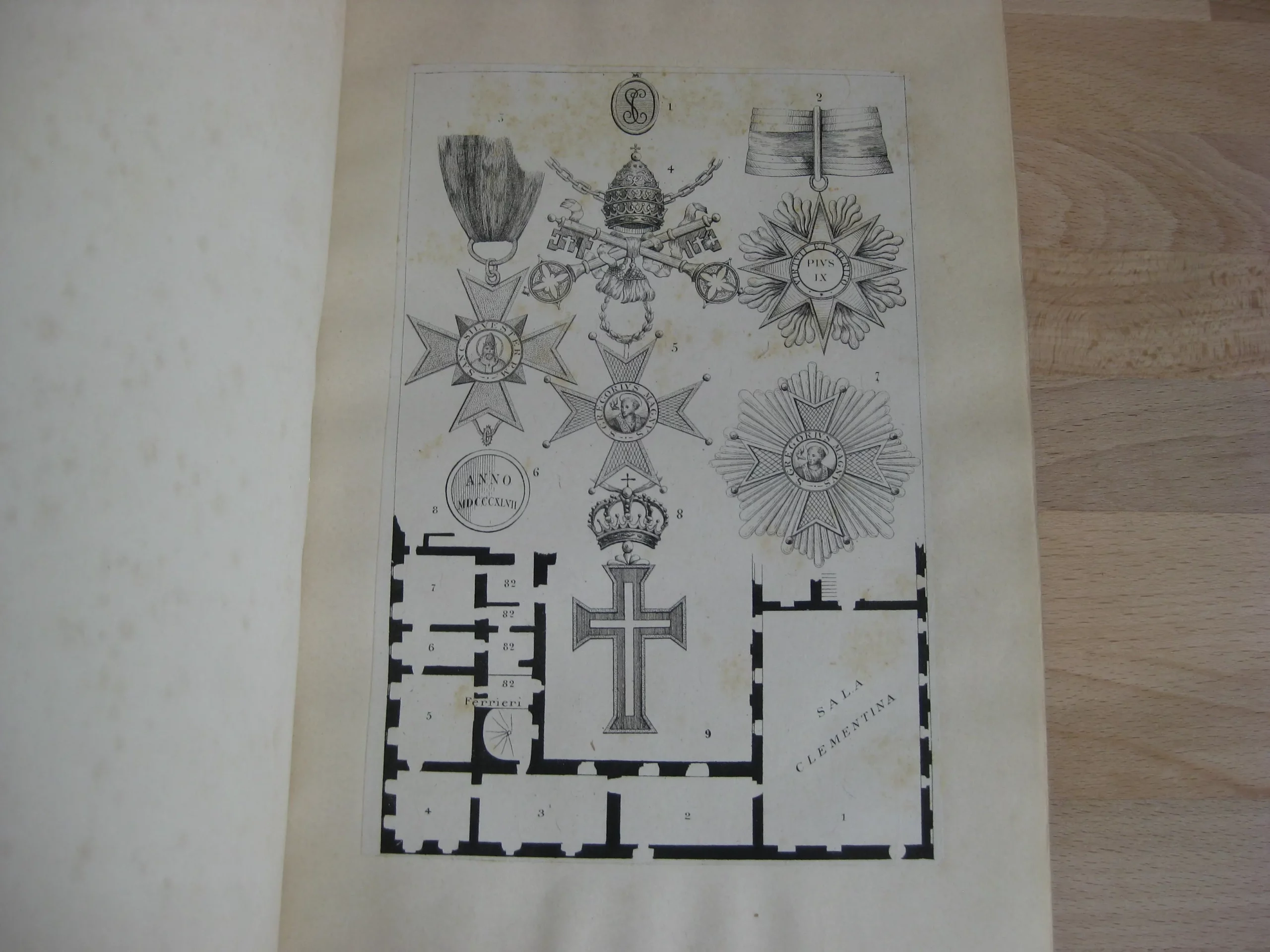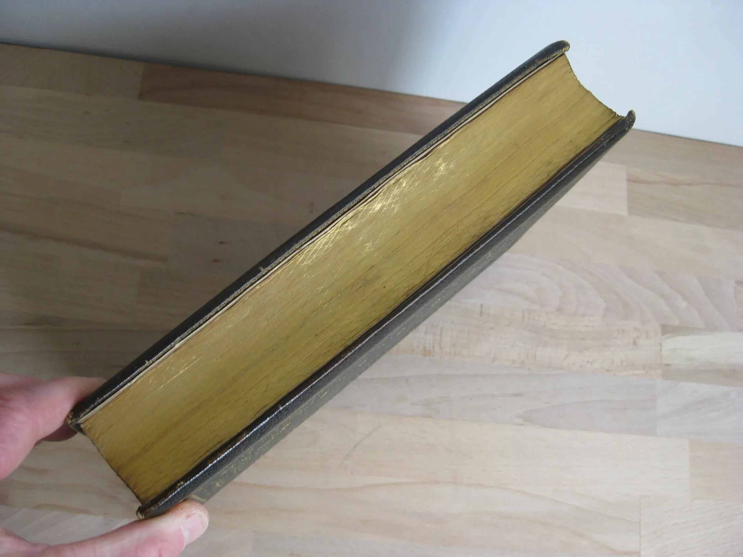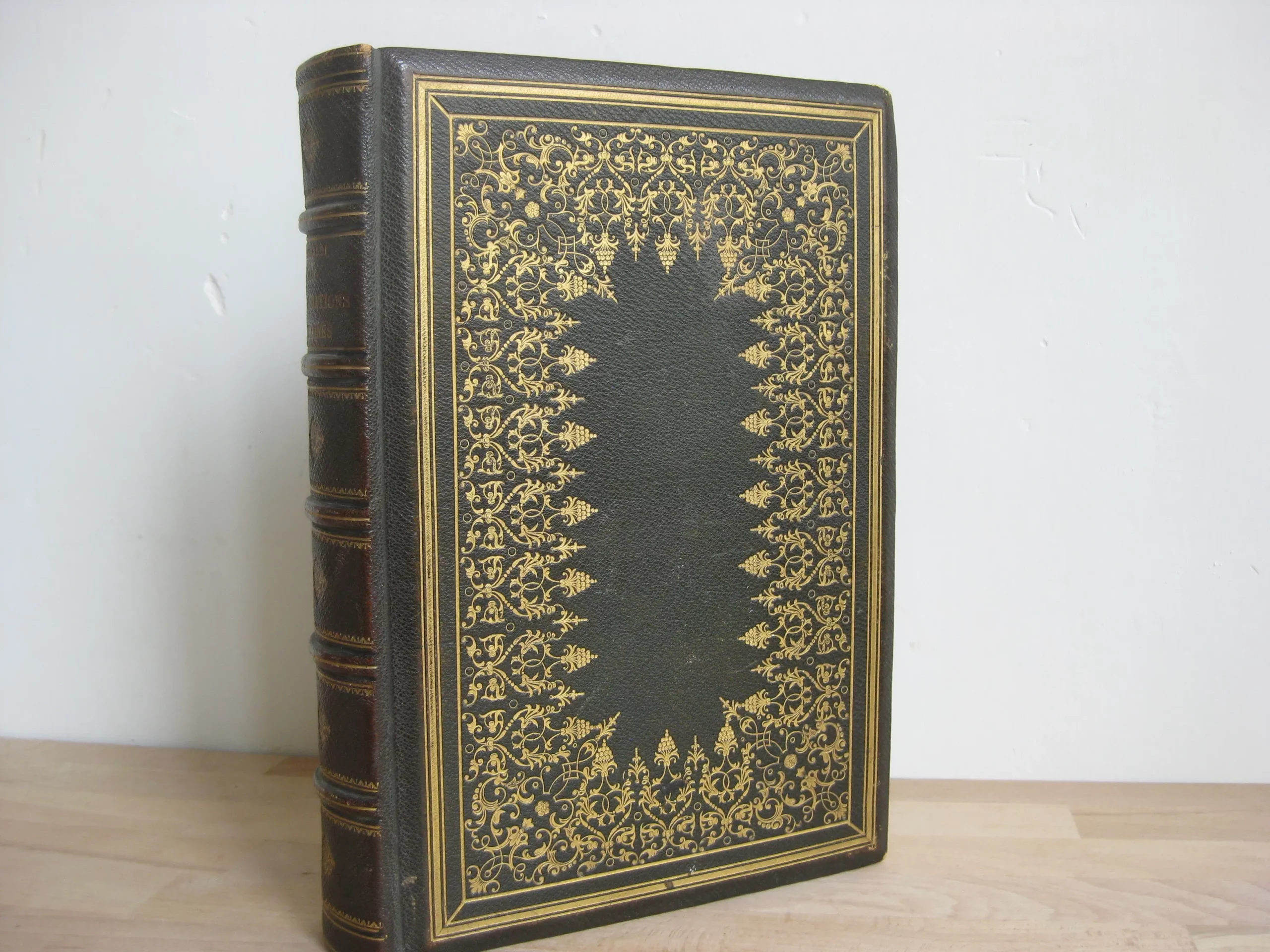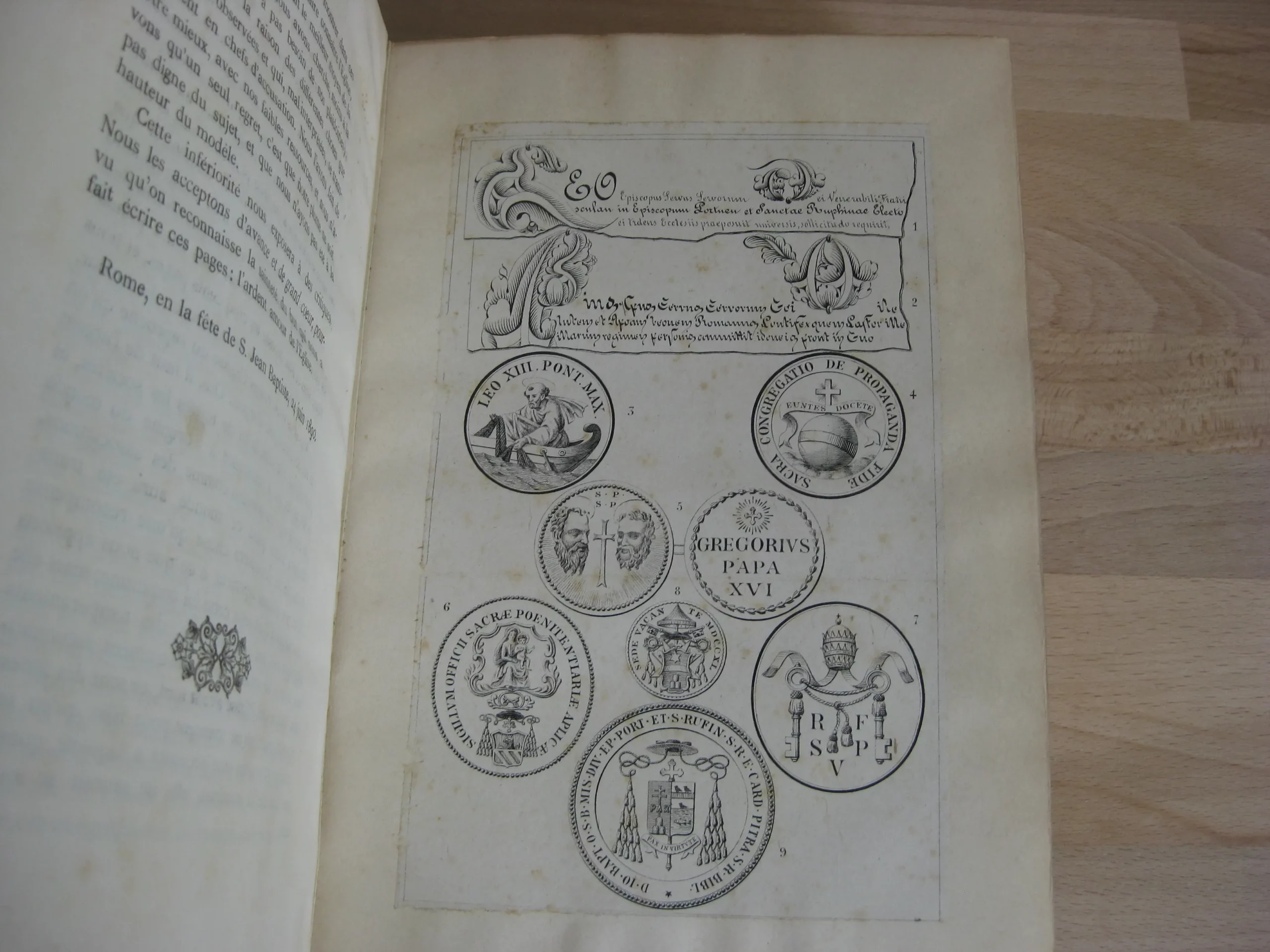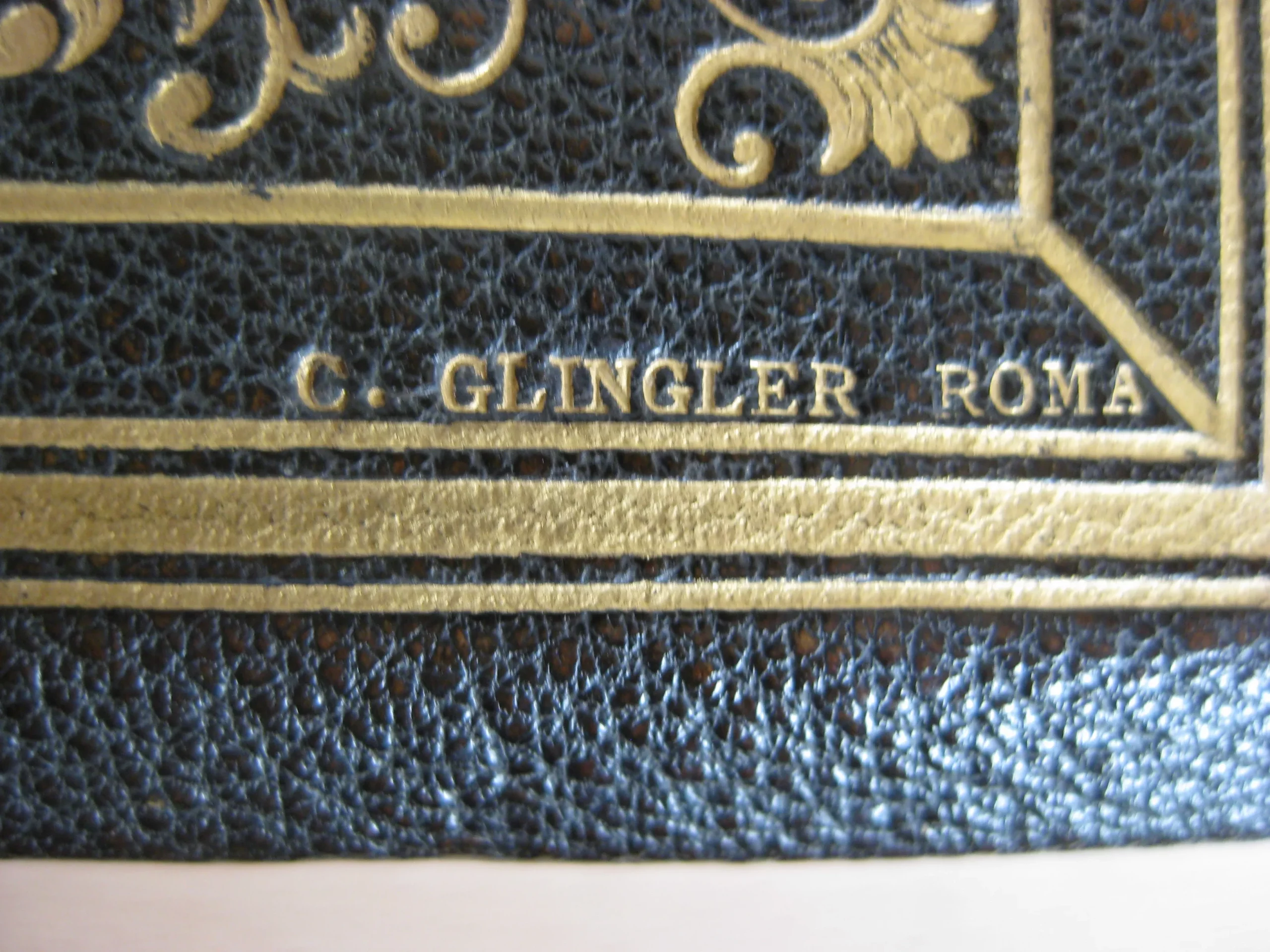 Imprimerie San Bernadino, Sienne – Plein chagrin olivâtre, gaufré, dos à cinq nerfs gaufré, orné des titre, auteur, et de frise, estampés dorés aux caissons, plats biseautés et spectaculairement dorée à encadrements, contreplats doublés de soie dans un encadrement à frise dorée, toutes tranches dorées et gaufrées, première de couverture conservée, une reliure signée Carl. Glingler, [important relieur romain, Via della Merced]. 260 x 183 , 556p. Avec table. 1890. Edition originale. Avec deux planches hors texte [ornementation et sceaux des bulles papales et décorations du Vatican]. Intérieur légèrement insolé mais très bon, propre et intègre. Reliure en très bel état, avec quelques frottements et épidermures aux mors, plats, coins et coiffe. Bel exemplaire bien ferme.