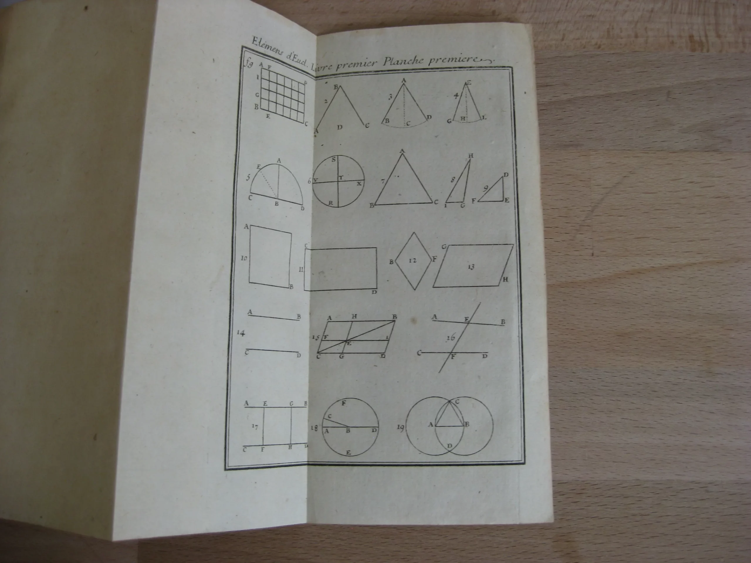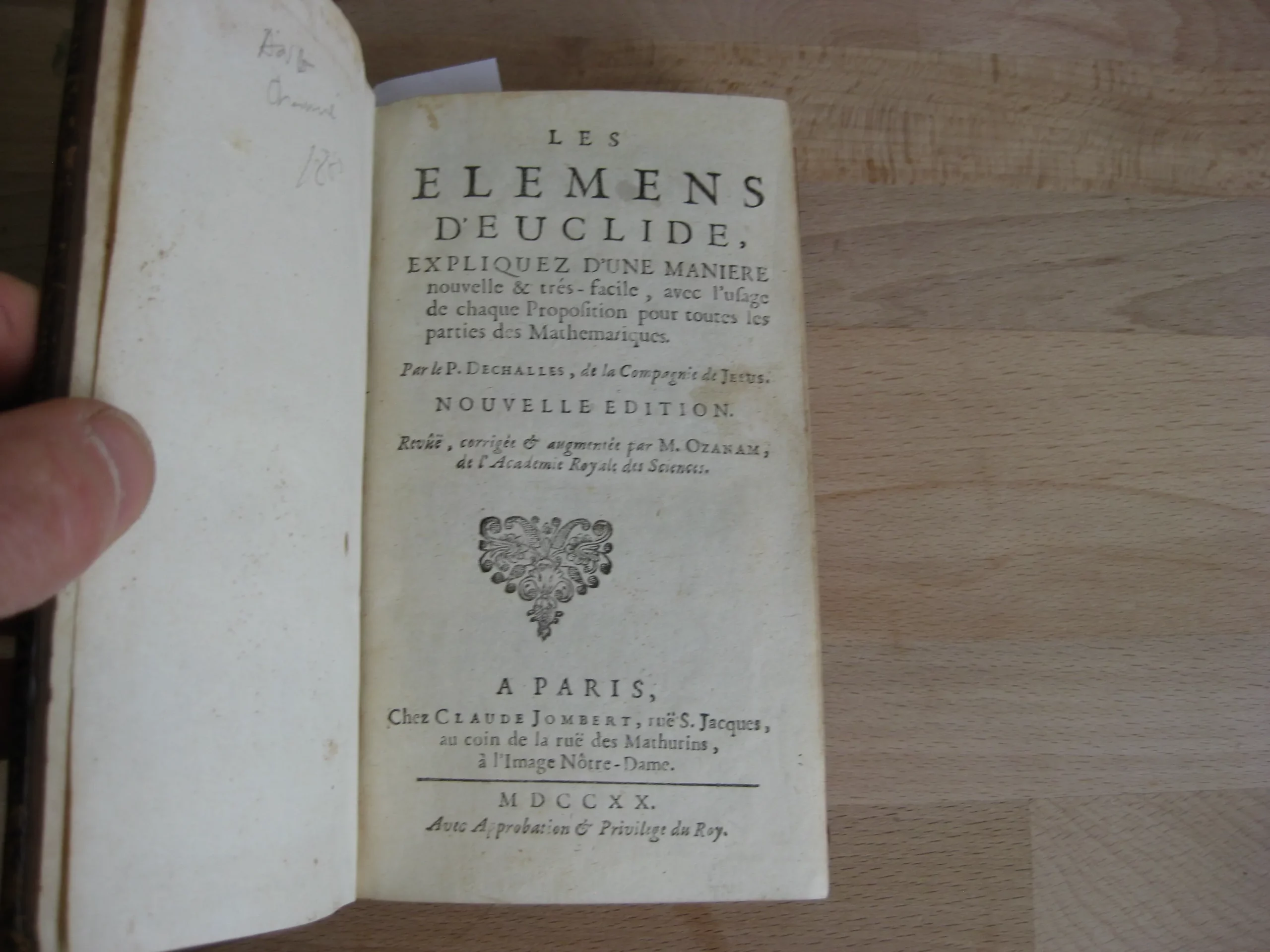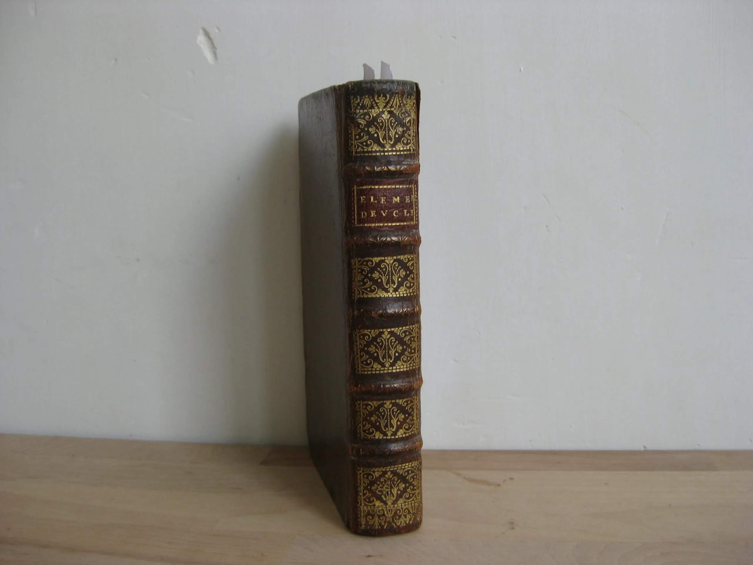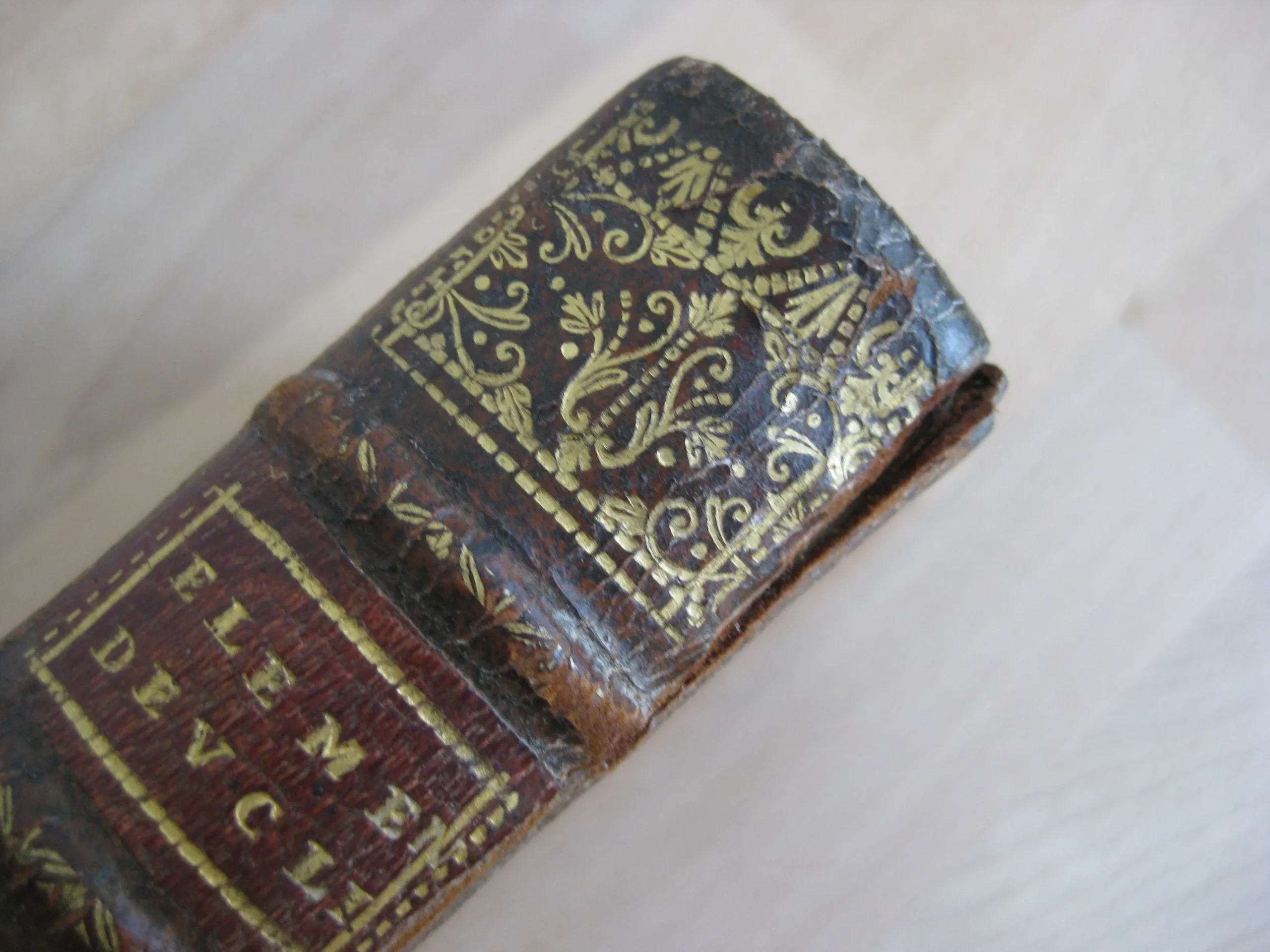 Les Elemens d’Euclide expliquez d’une manière nouvelle & trés-facile, avec l’usage de chaque proposition pour toutes les parties des mathematiques P. Dechalles – Chez Claude Jombert Plein veau marbré, dos à cinq nerfs, fleuronné aux caissons et orné d’un pièce de titre en maroquin lie de vin, tranches jaspées rouges, 170 x 101, 360p. 1720. Nouvelle édition, revûë, corrigée & augmentée.(Livres I à VI, XI et XII, Brunet). Ex-libris manuscrit « Podiani » en page de garde. Avant la lettre : Avertissement, Errata, Adresse au lecteur, Avant-propos, Approbation et Privilège, 10p. Puis le texte : Livre I avec 5 planches dépliantes ; Livre II, 1 planche dépl. ; Livre III, 2 planches dépl. ; Livre IV ; Livre V, avec 1 pl. dépl. ; Livre VI, 2 pl. dépl. ; Livre XI, 2 pl. dépl. Livre XII, 3 pl. dépl. Soit complet de ses 16 planches hors texte, toutes intègres. Intérieur bon, frais, intègre. Coins et champs frottés. Plats frottés avec griffes, rides et épidermures. Mors ridé et frotté, mors supérieur brièvement ouvert en tête. Dos en bel état, nerfs, coiffe et queue avec épidermures. Bel exemplaire bien ferme.