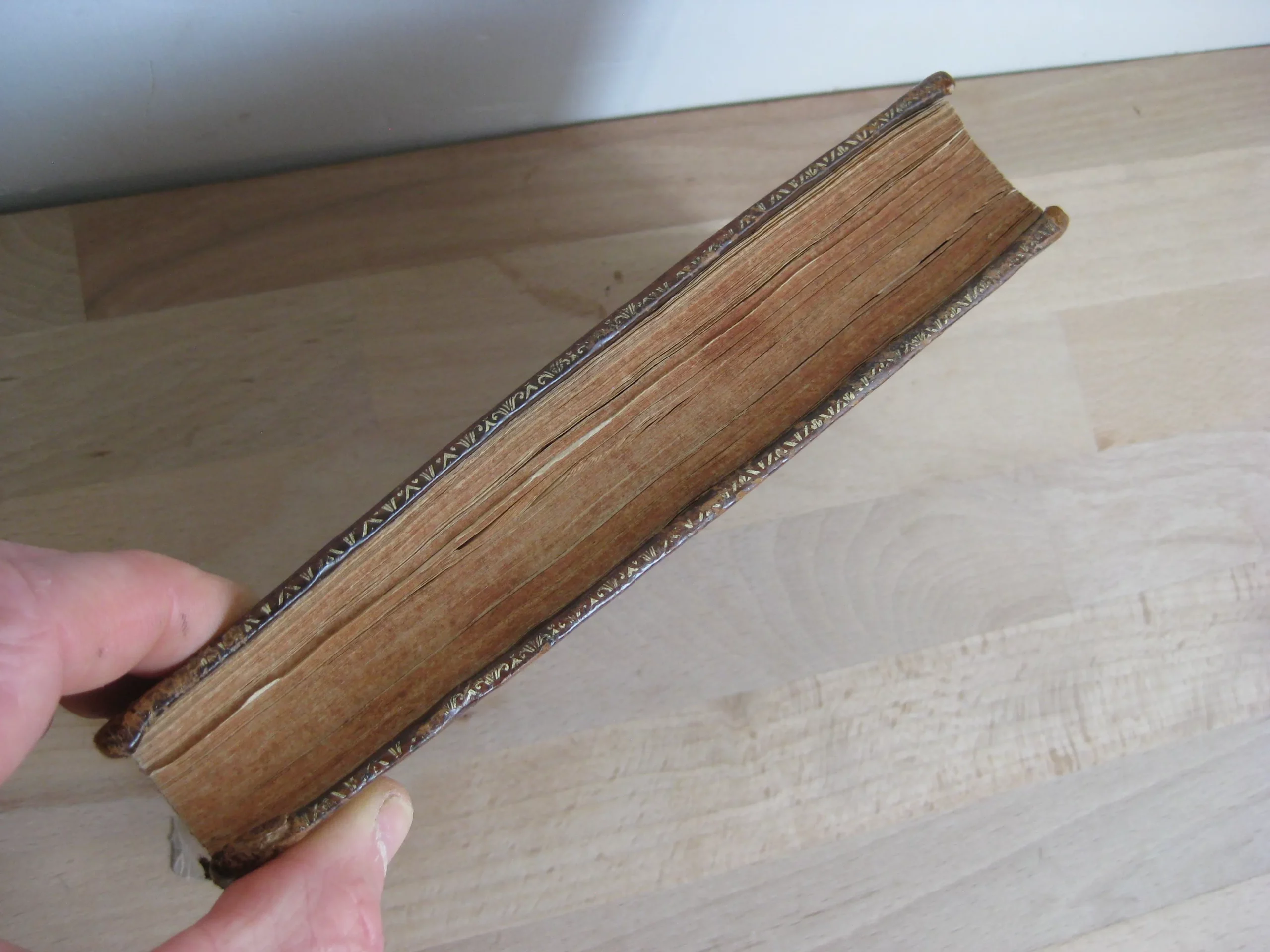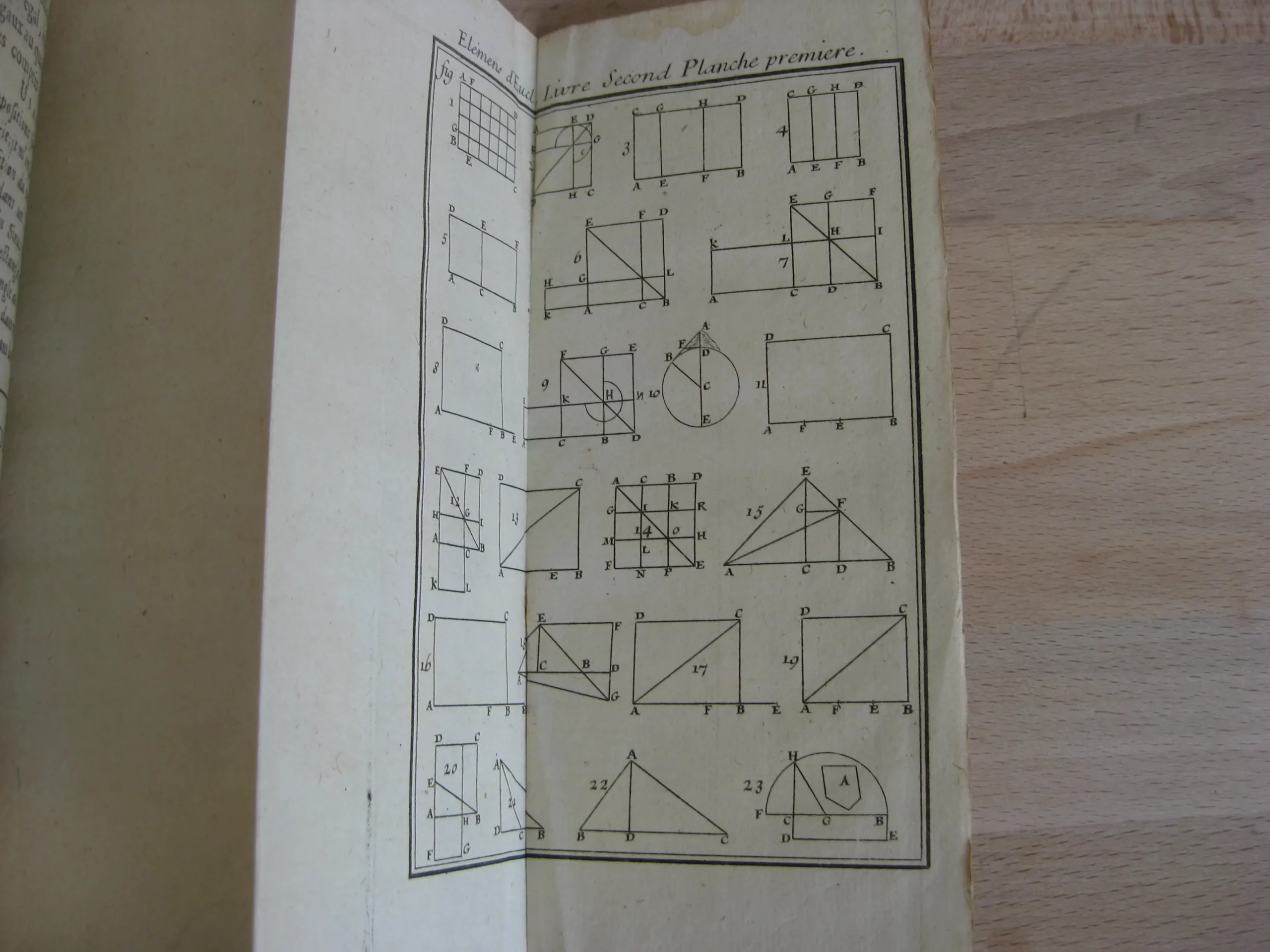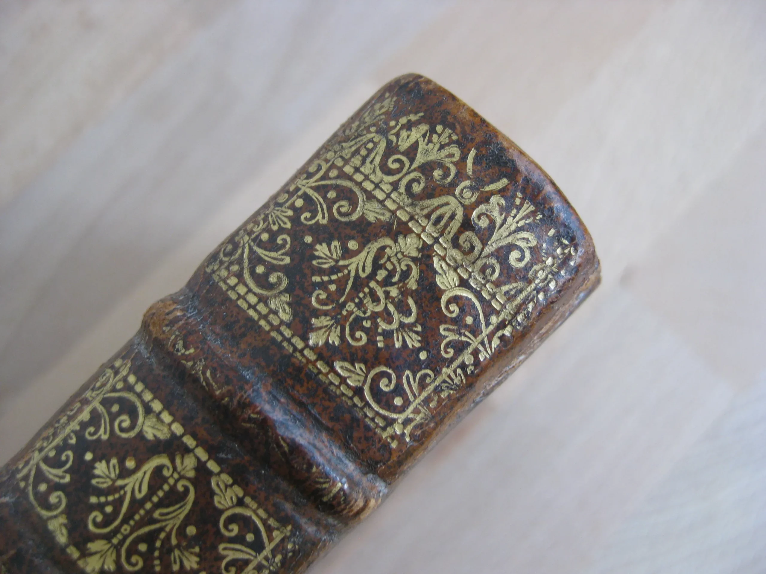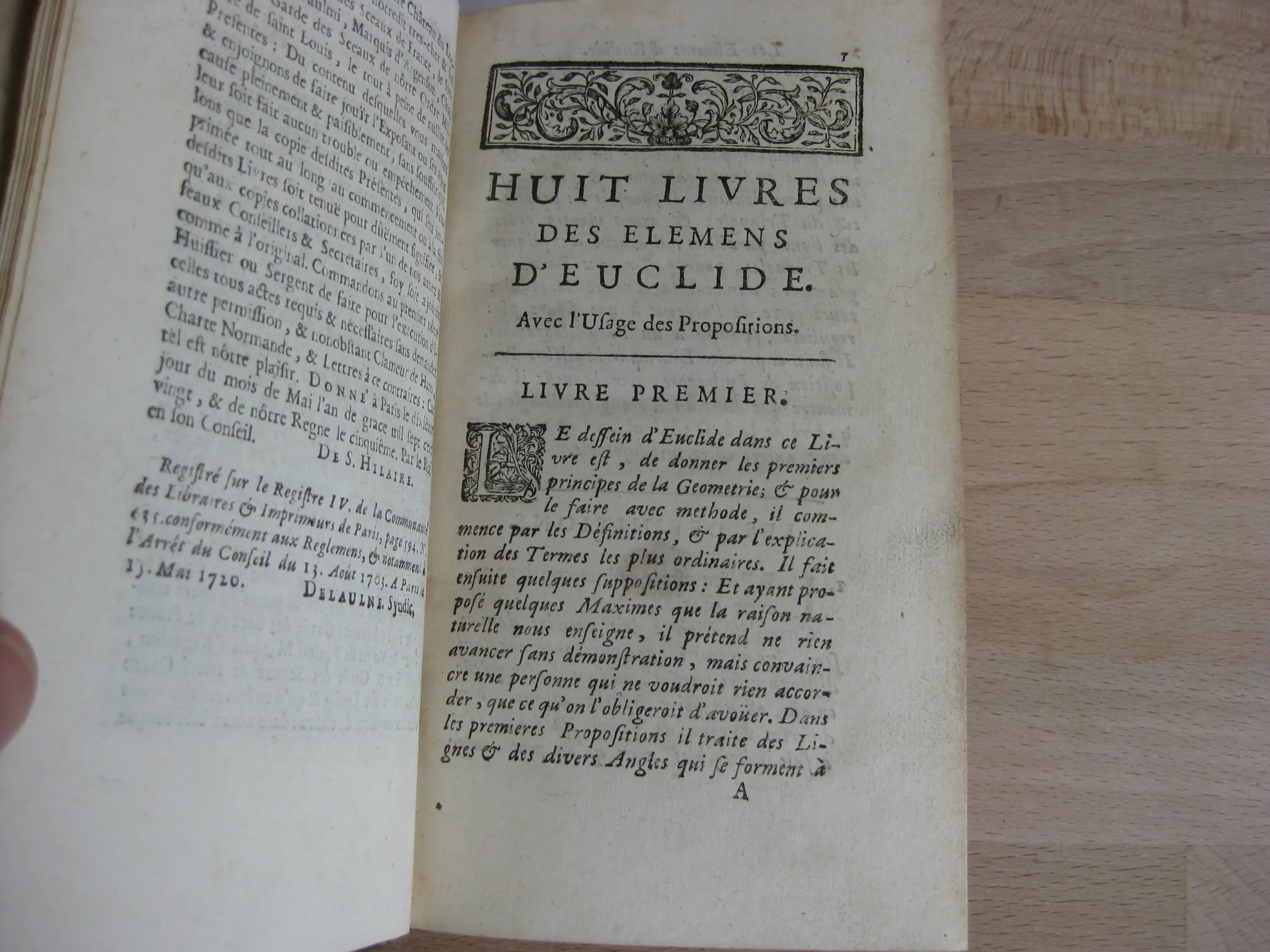 Les Elemens d’Euclide expliquez d’une manière nouvelle & trés-facile, avec l’usage de chaque proposition pour toutes les parties des mathematiques P. Dechalles – Chez Claude Jombert Plein veau marbré, dos à cinq nerfs, fleuronné aux caissons et orné d’un pièce de titre en maroquin lie de vin, tranches jaspées rouges, 170 x 101, 360p. 1720. Nouvelle édition, revûë, corrigée & augmentée.(Livres I à VI, XI et XII, Brunet). Ex-libris manuscrit « Podiani » en page de garde. Avant la lettre : Avertissement, Errata, Adresse au lecteur, Avant-propos, Approbation et Privilège, 10p. Puis le texte : Livre I avec 5 planches dépliantes ; Livre II, 1 planche dépl. ; Livre III, 2 planches dépl. ; Livre IV ; Livre V, avec 1 pl. dépl. ; Livre VI, 2 pl. dépl. ; Livre XI, 2 pl. dépl. Livre XII, 3 pl. dépl. Soit complet de ses 16 planches hors texte, toutes intègres. Intérieur bon, frais, intègre. Coins et champs frottés. Plats frottés avec griffes, rides et épidermures. Mors ridé et frotté, mors supérieur brièvement ouvert en tête. Dos en bel état, nerfs, coiffe et queue avec épidermures. Bel exemplaire bien ferme.