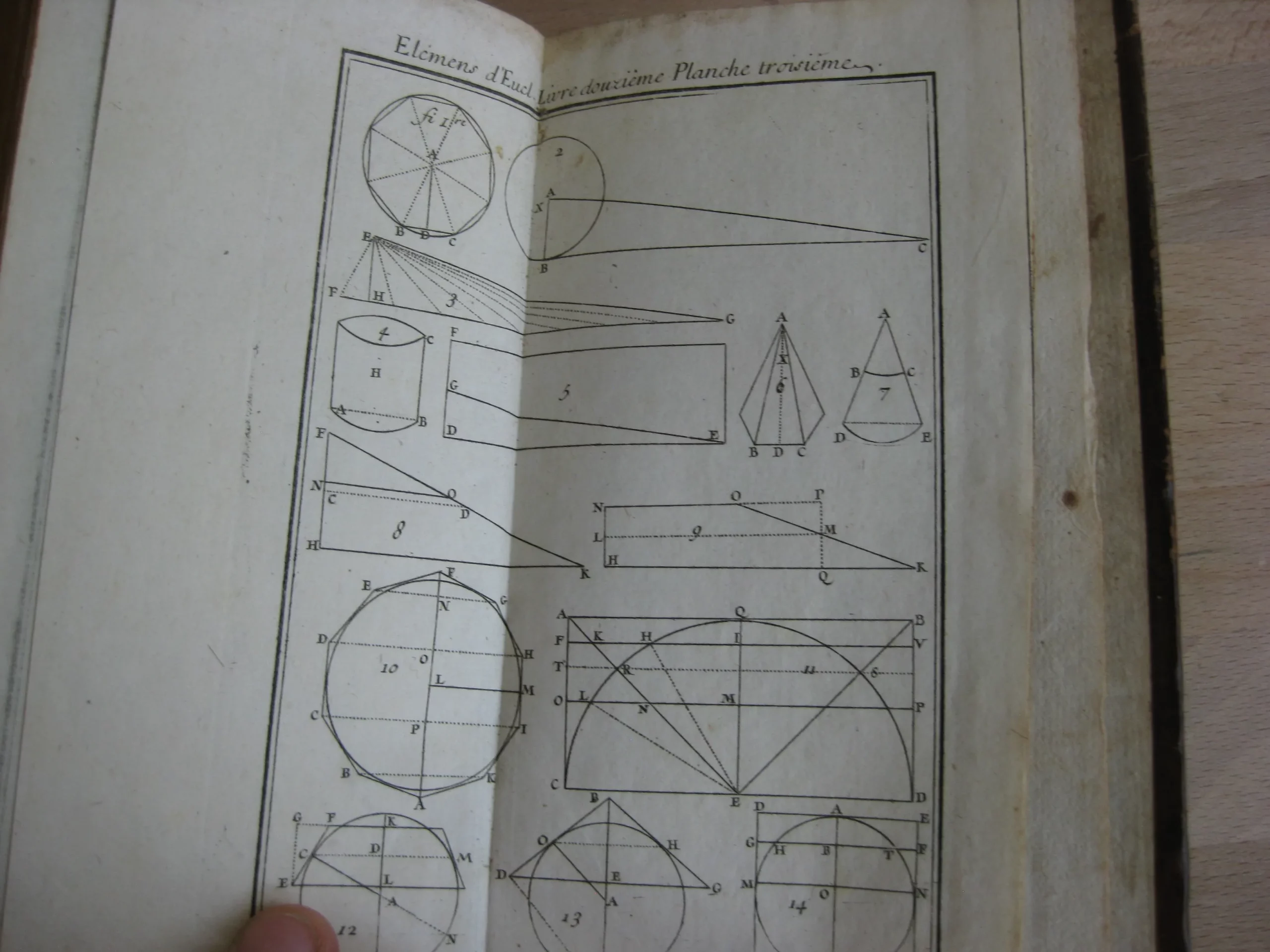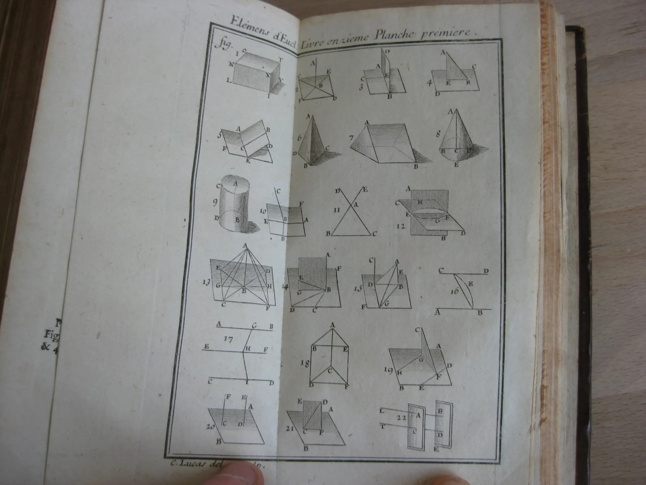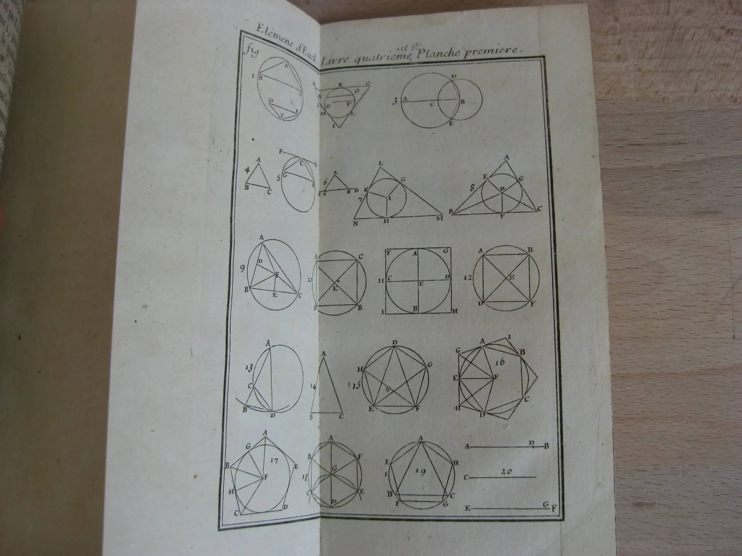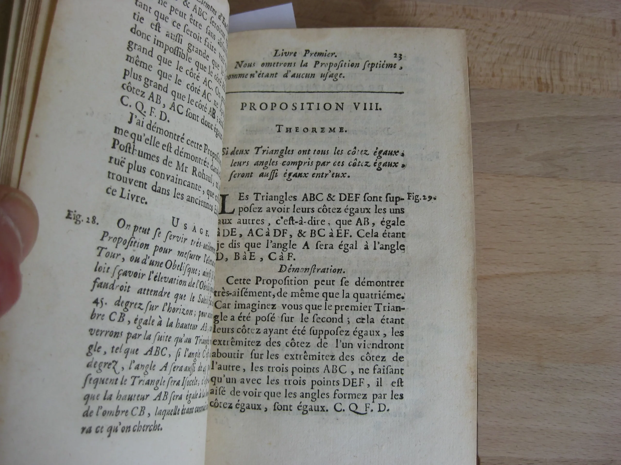 Les Elemens d’Euclide expliquez d’une manière nouvelle & trés-facile, avec l’usage de chaque proposition pour toutes les parties des mathematiques P. Dechalles – Chez Claude Jombert Plein veau marbré, dos à cinq nerfs, fleuronné aux caissons et orné d’un pièce de titre en maroquin lie de vin, tranches jaspées rouges, 170 x 101, 360p. 1720. Nouvelle édition, revûë, corrigée & augmentée.(Livres I à VI, XI et XII, Brunet). Ex-libris manuscrit « Podiani » en page de garde. Avant la lettre : Avertissement, Errata, Adresse au lecteur, Avant-propos, Approbation et Privilège, 10p. Puis le texte : Livre I avec 5 planches dépliantes ; Livre II, 1 planche dépl. ; Livre III, 2 planches dépl. ; Livre IV ; Livre V, avec 1 pl. dépl. ; Livre VI, 2 pl. dépl. ; Livre XI, 2 pl. dépl. Livre XII, 3 pl. dépl. Soit complet de ses 16 planches hors texte, toutes intègres. Intérieur bon, frais, intègre. Coins et champs frottés. Plats frottés avec griffes, rides et épidermures. Mors ridé et frotté, mors supérieur brièvement ouvert en tête. Dos en bel état, nerfs, coiffe et queue avec épidermures. Bel exemplaire bien ferme.