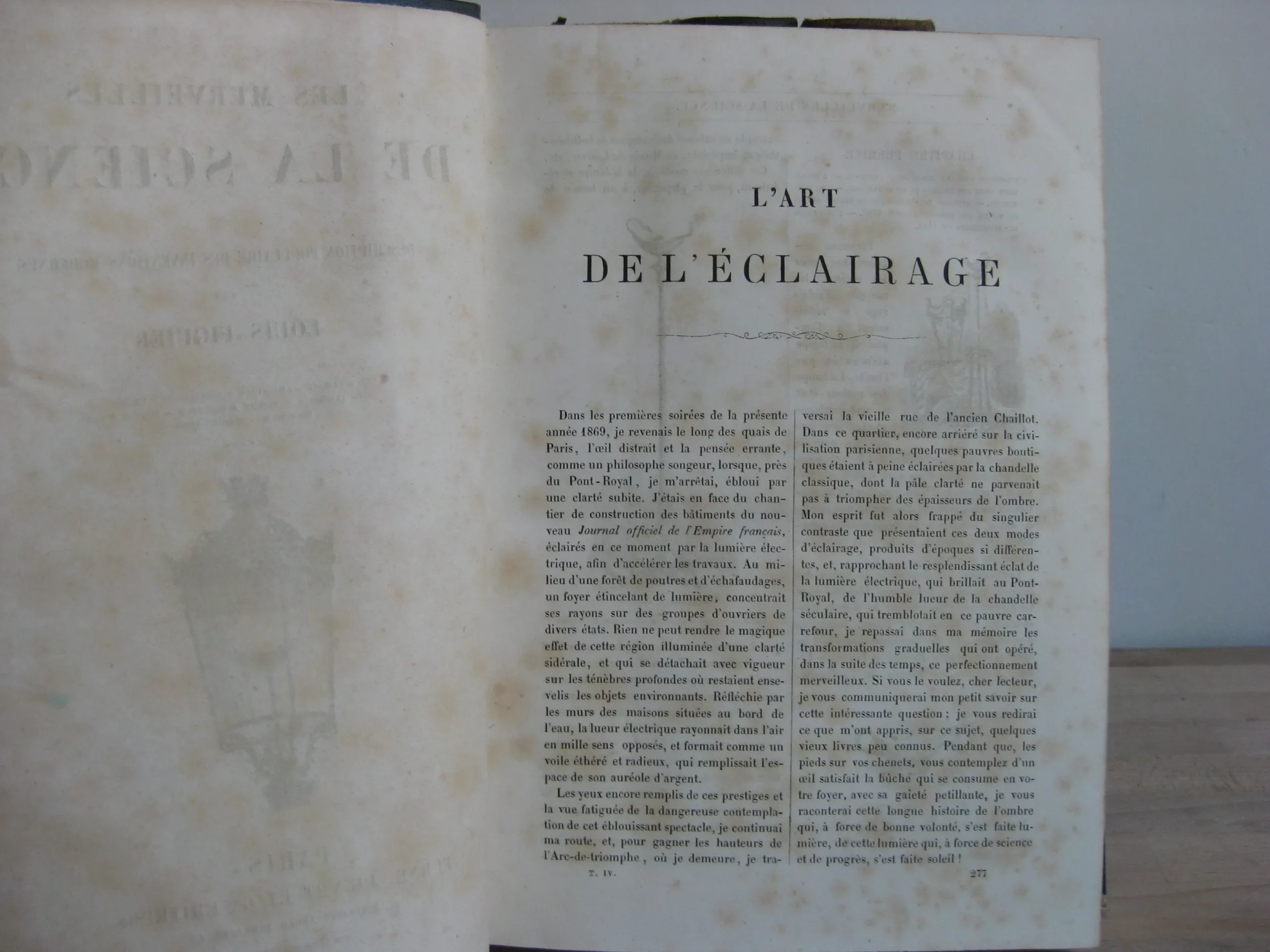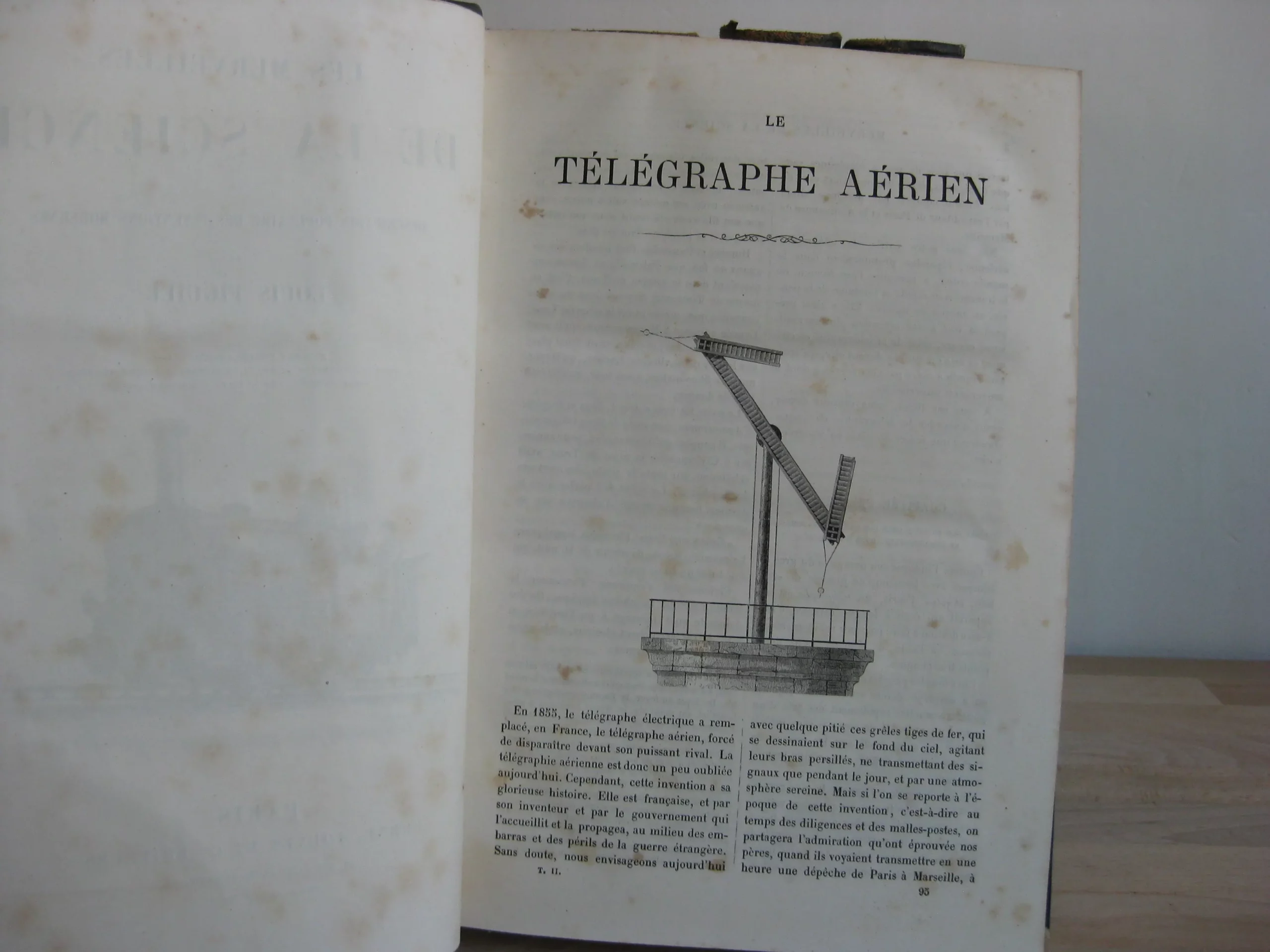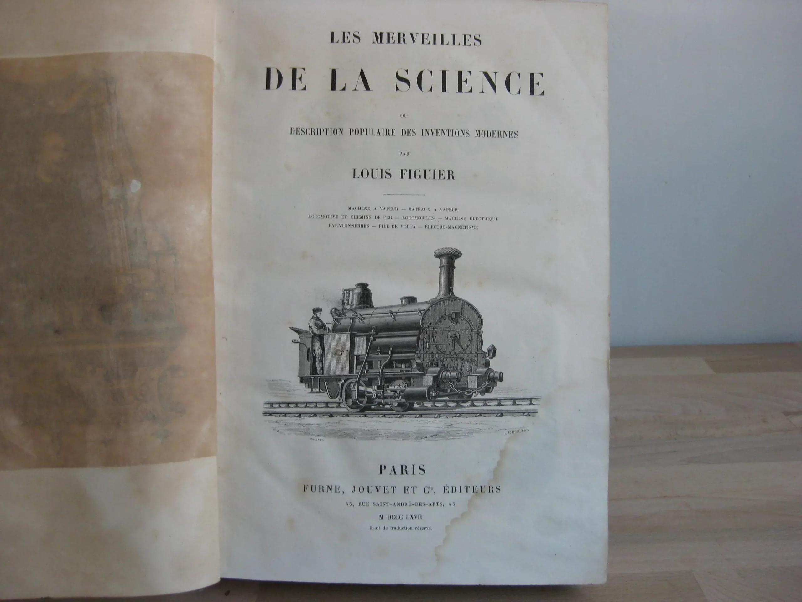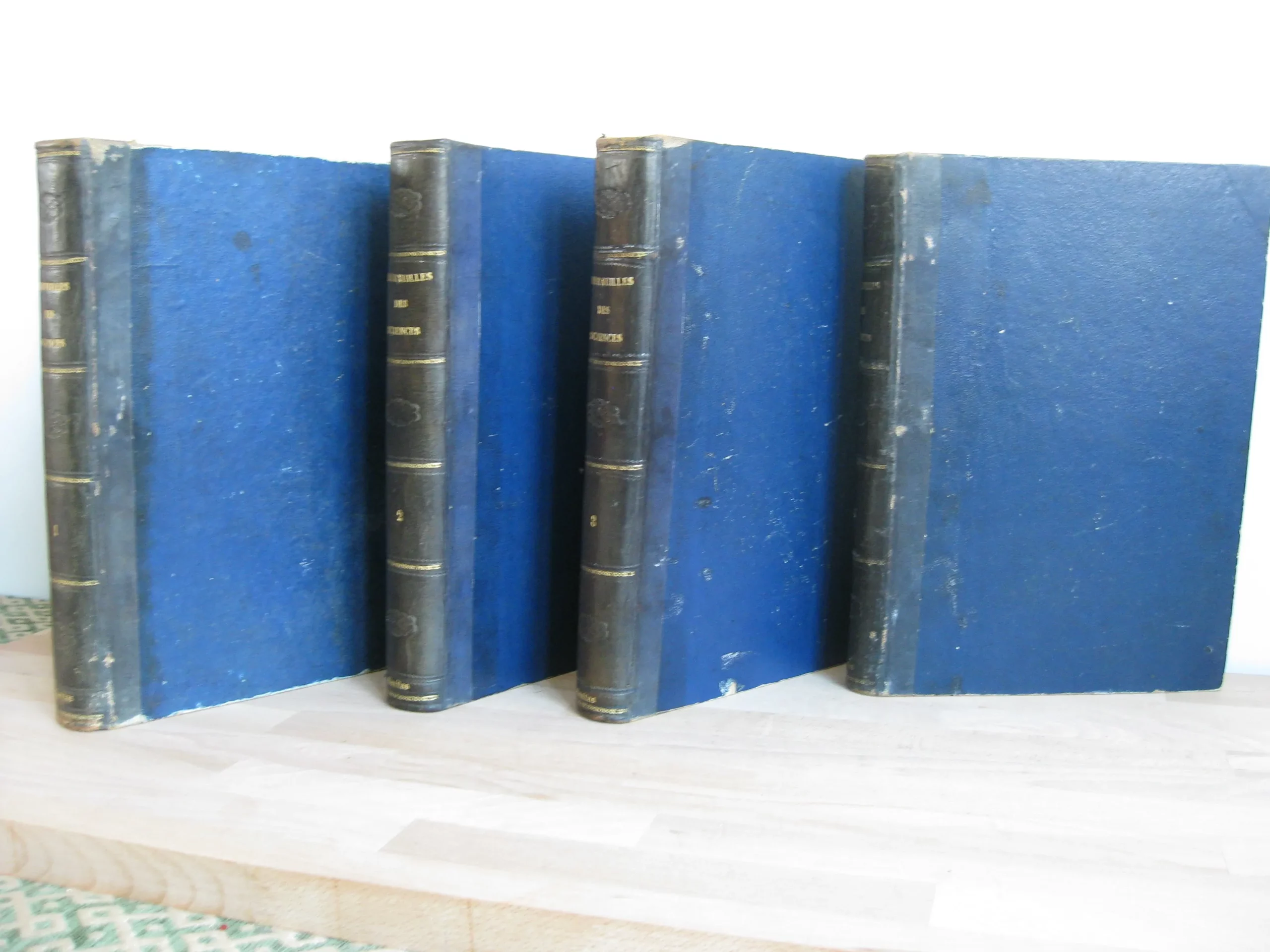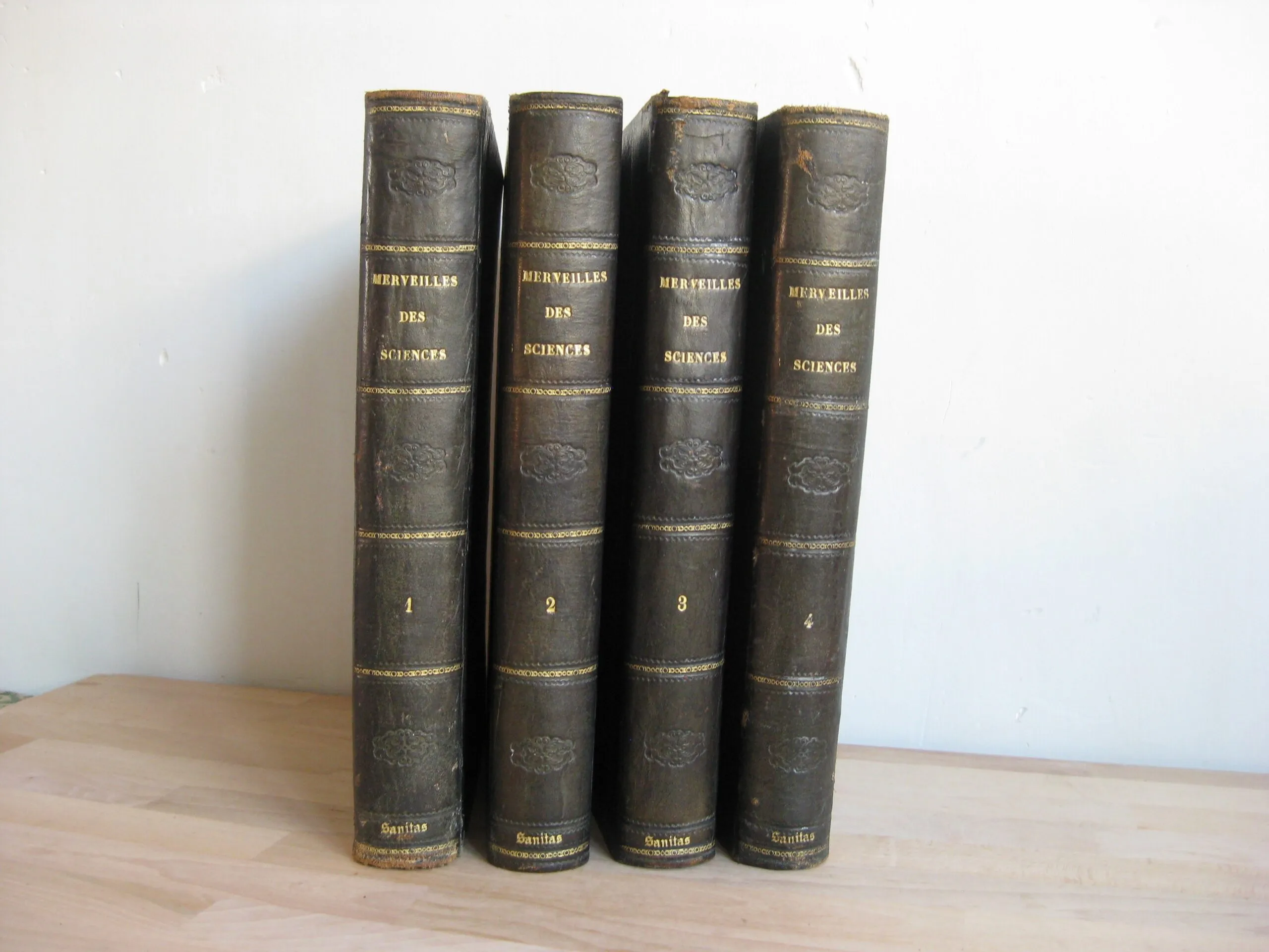 4 volumes, complet (sans les suppléments, 2 volumes) – Demi-veau olive à plats bleus et dos long orné du titre, tomaison, frises et estampé d’un motif floral, et de l’inscription « sanitas » en pied, 253 x 205, 1867. Texte sur 2 col. Nombreuses ill. Edition originale. T1, frontispice, vignette au titre, seconde page de titre, 743p. Avec index. Comprend : machine à vapeau ; bateaux à vapeur ; locomotive et chemins de fer ; locomobiles ; machine électrique ; paratonnerres ; pile de volta ; électro-magnétisme. T2, (frontispice et page de titre du T1), 703p. Avec index. Comprend : Le télégraphe aérien ; télégraphe électrique ; télégraphie sous-marine ; câble transatlantique ; galvanoplastie ; moteur électrique ; horloges électriques ; aérostats ; éthérisation. T3, (page de titre du T2), 752p. Avec index. Comprend : La photographie ; le stéréoscope ; les poudres de guerre ; l’artillerie ancienne et moderne ; les armes à feu portatives ; les bâtiments cuirassés ; le drainage. T4, 744p. Avec index. Comprend : éclairage ; chaufage ; ventilation ; phares ; puits artésiens ; cloche à plongeur ; moteur à gaz ; aluminium ; planète Neptune. Pour tous les volumes : rousseurs de fréquence et d’intensité variable. Plats, coins et champs frottés, un coin légèrement émoussé. Reliures frottés, épidermures, griffes ; une épidermure plus marqué en tête de dos du T4 ; et coiffe T3 et queue T1 plus marquées.