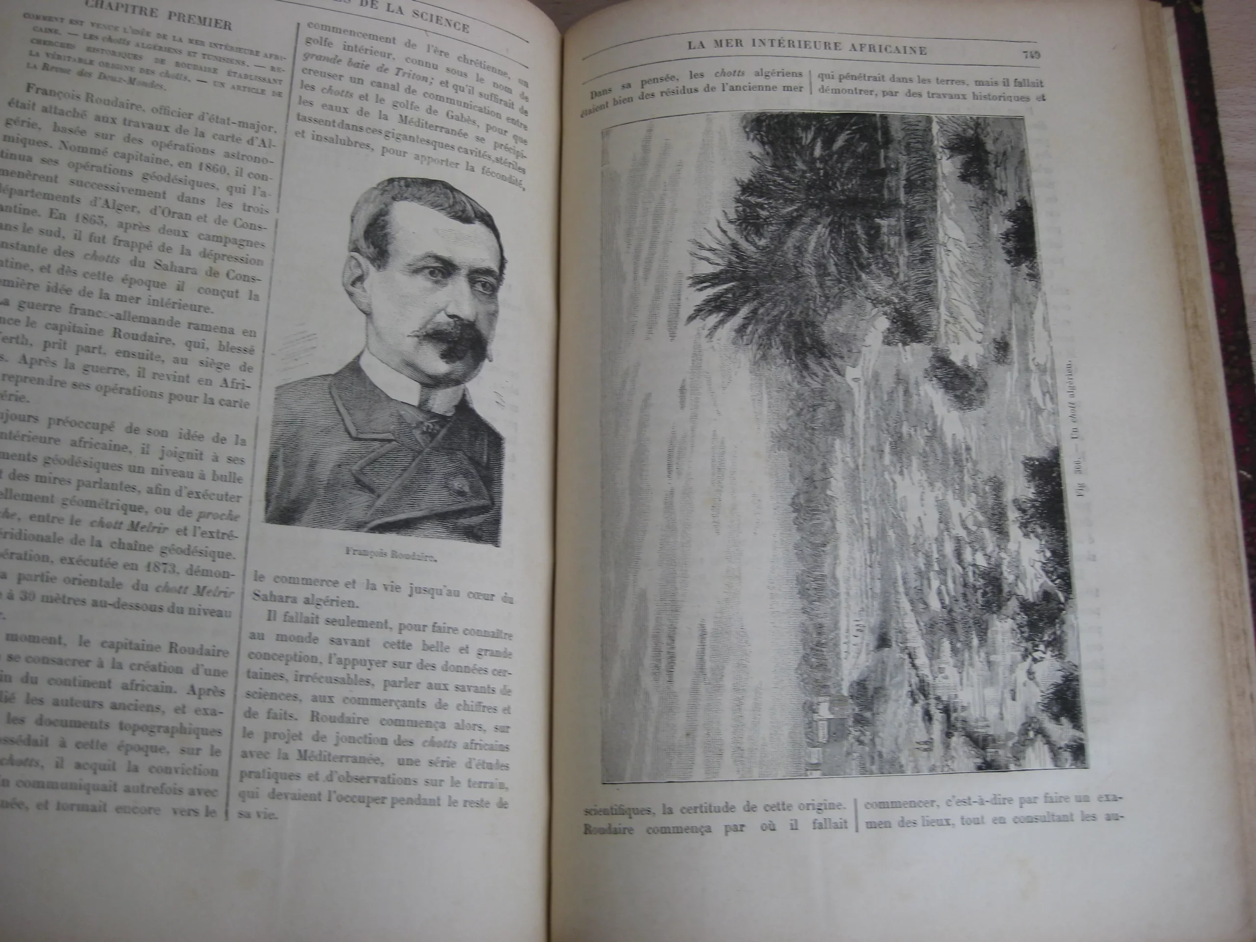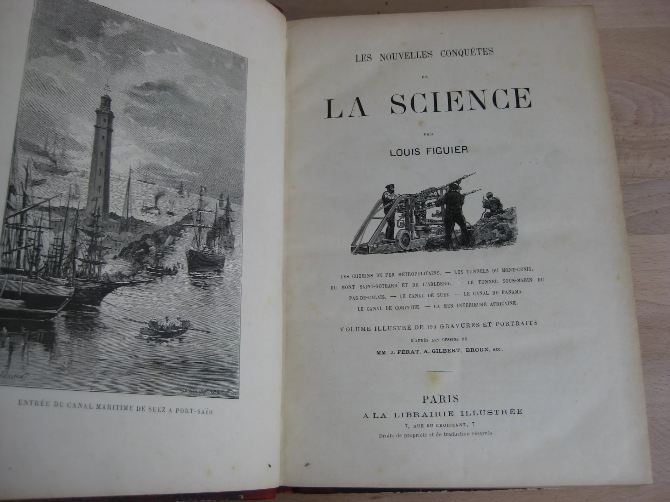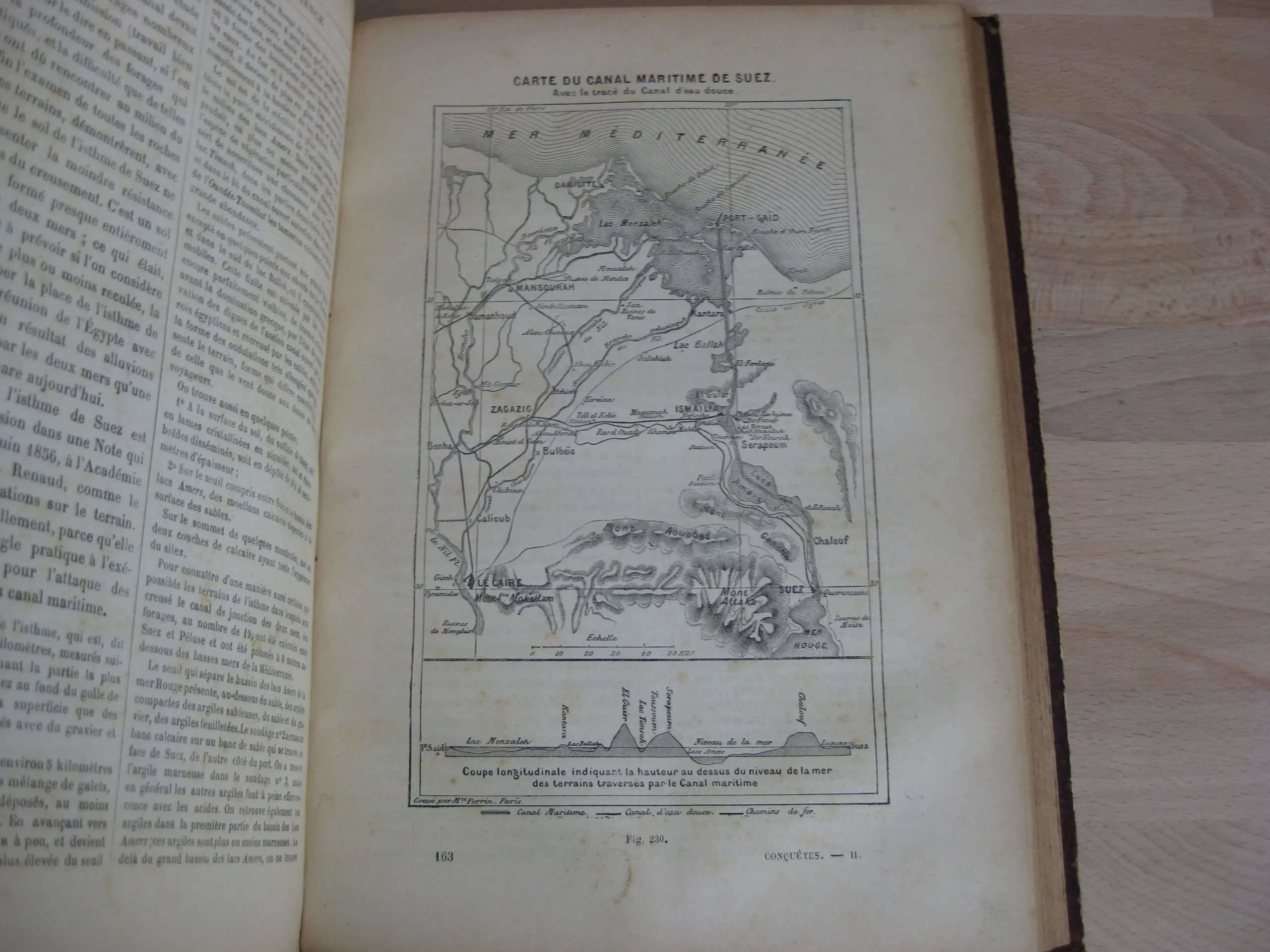 T2, Les chemins de fer, 399 gravures et portraits, comprend : LES CHEMINS DE FER METROPOLITAINS – LES TUNNELS DU MONT-CENIS, DU MONT SAINT-GOTHARD ET DE L’ARLBERG – LE TUNNEL SOUS-MARIN DU PAS-DE-CALAIS – LE CANAL DE SUEZ – LE CANAL DE PANAMA – LE CANAL DE CORINTHE – LA MER INTERIEURE AFRICAINE. Intérieurs propres et intègres. Des frottements et épidermures aux plats, coins et champs. Demi-basane avec épidermures et griffes et mais en bon état. Bons exemplaires bien ferme.