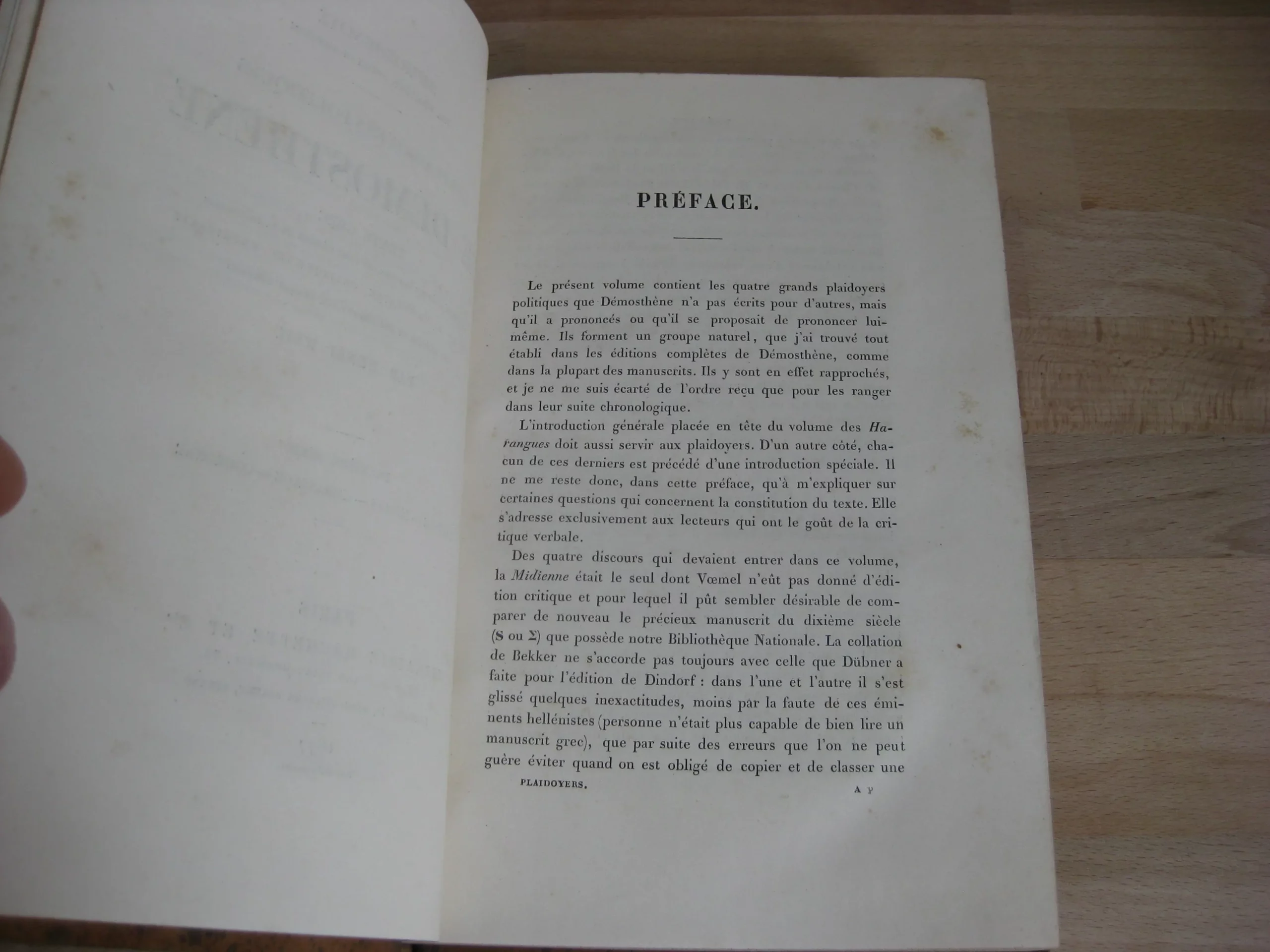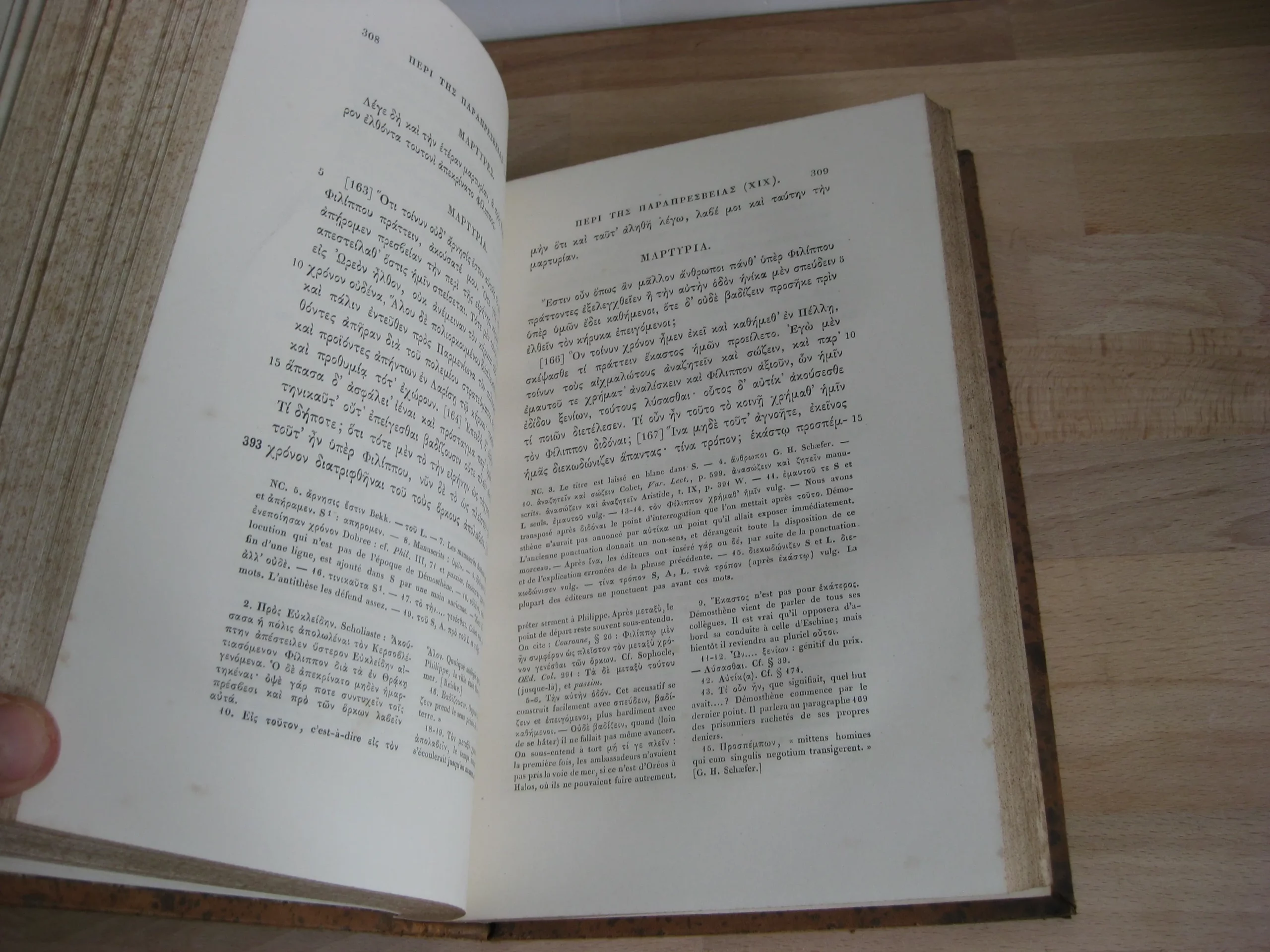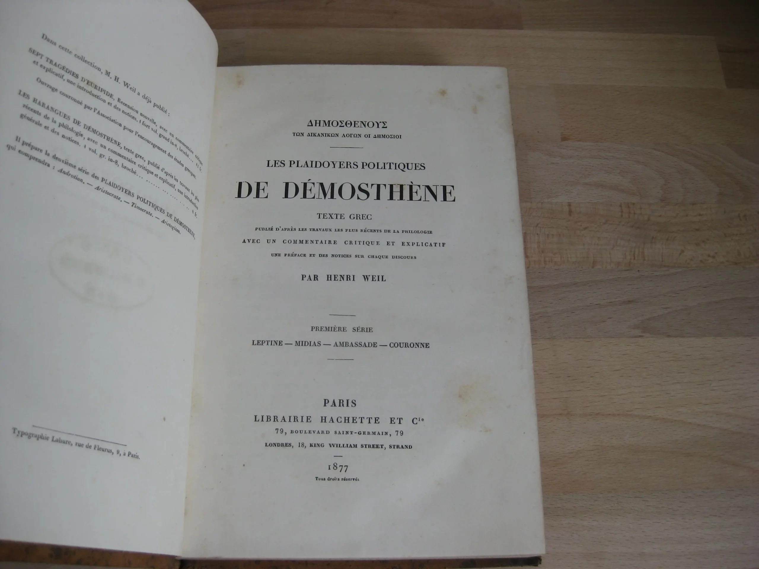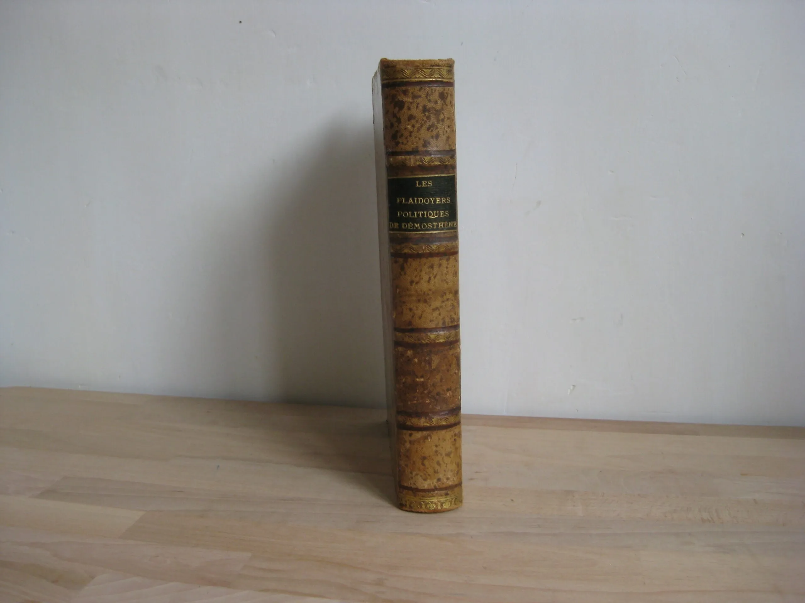 Plein veau havane chiné, dos à faux-nerfs orné d’une pièce de titre en maroquin vert, tranches jaspées, 243 x 170, 568p. Hors table. 1877. Avec une préface et des notices sur chaque discours par Henri Weil. Intérieur globalement propre, rousseurs surtout en marge. Ex-libris en garde cachet de l’institution Saint-Marie d’Aire-sur-la-Lys, et un en faux-titre de l’Abbé Michaux. Coins, plats et champs frottés mais bons. Dos frotté avec épidermures, mais bon. Bel exemplaire bien ferme.