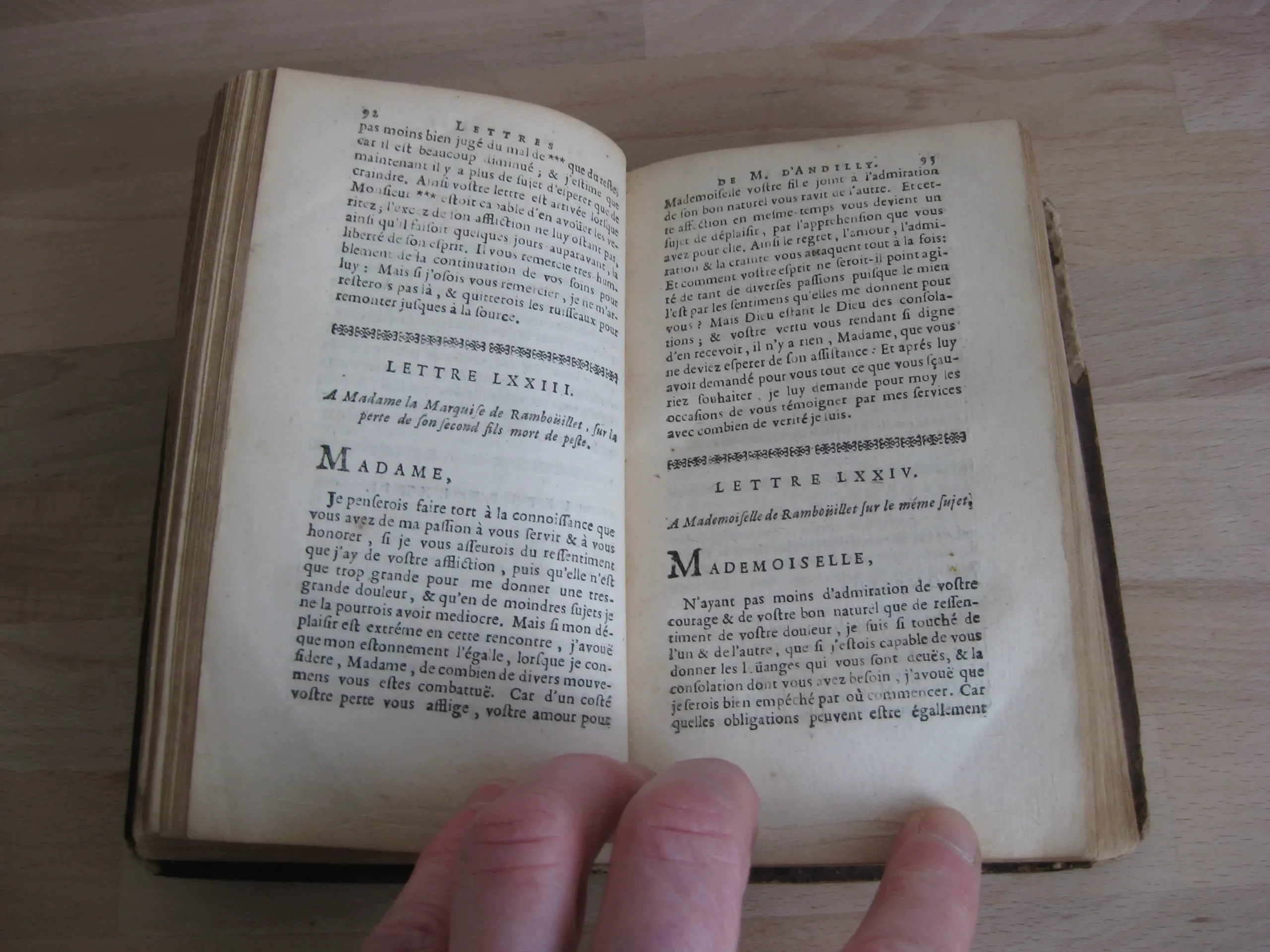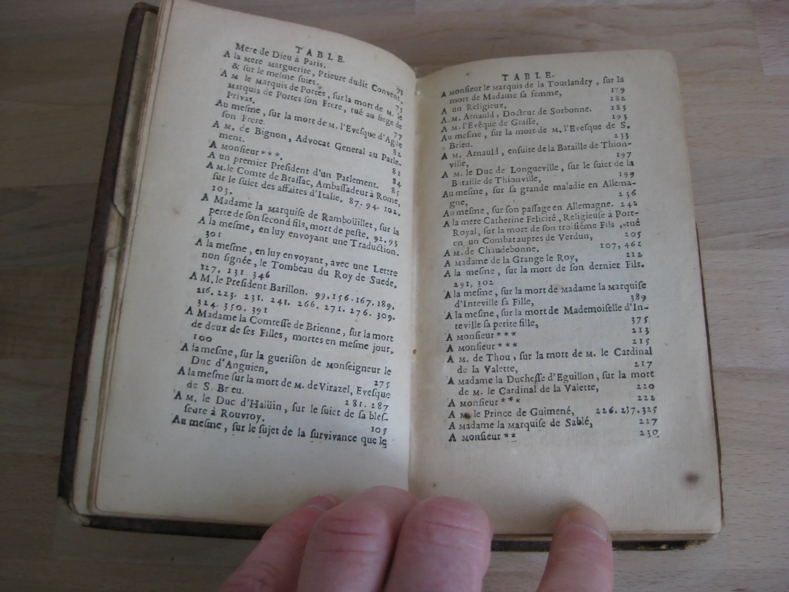 Plein veau marbré, dos à cinq nerfs orné aux caissons et d’une pièce de titre, 163 x 100, 465p. 1680. Dernière édition. Ex-libris biffé en garde. Intérieur frais. Coins et champs frottés, 3 coins légèrement émoussés. Plats frottés avec épidermures. Dos frotté, « épidermures au nerfs, coiffe arasée, deux petits manques en queue, un petit manque caisson de pièce de titre. Rare recueil qui offre une collection de correspondances, un aperçu précieux de la vie, des idées et des préoccupations de cet érudit éminent du XVIIe siècle (religion, littérature et société de l’époque). Proche de Marie de Medicis, solitaire de Port-royal, Arnaud D’Andilly fut l’un des jansénistes les plus influents. L’édition originale avait paru en 1645 chez le même éditeur