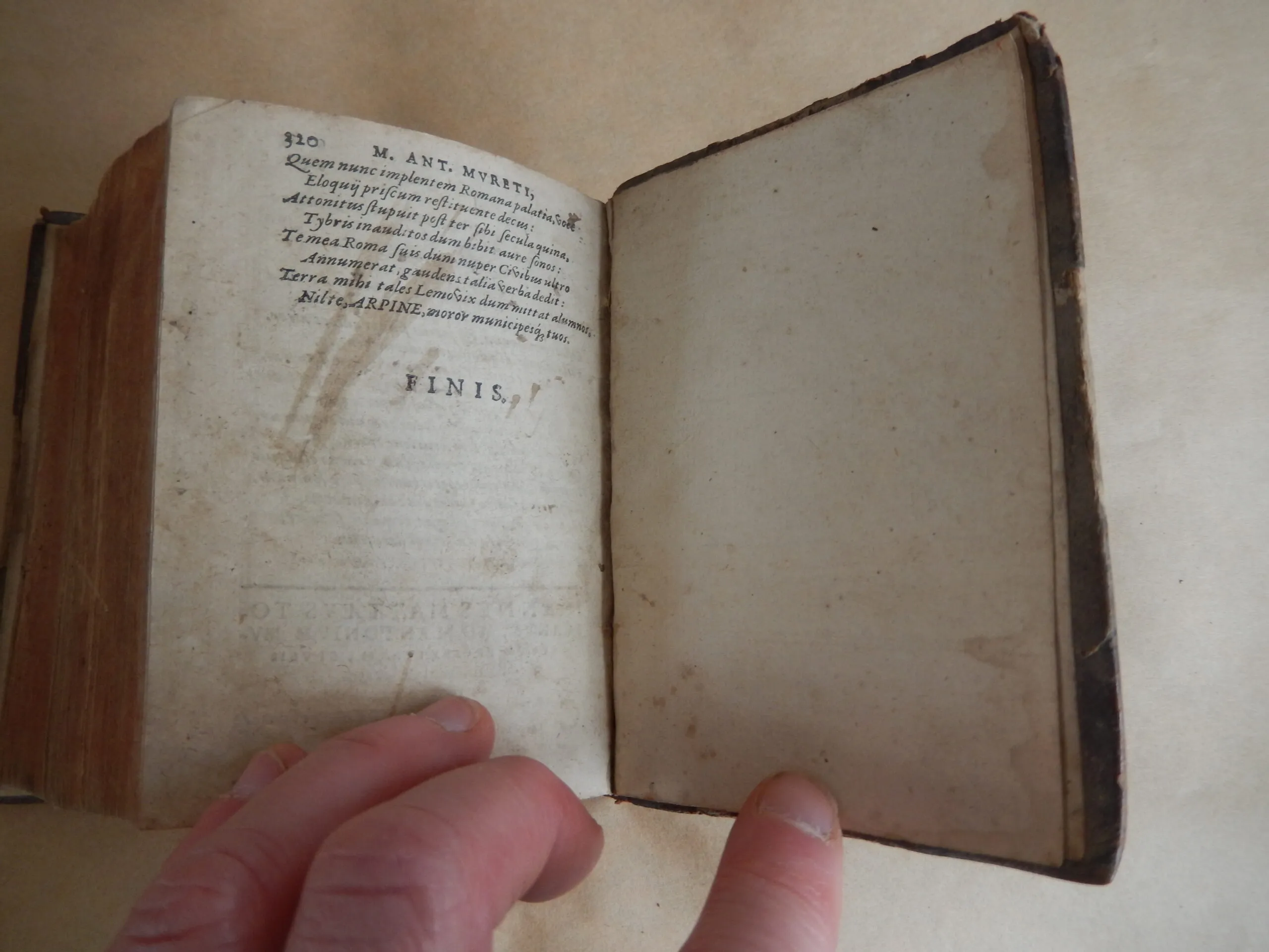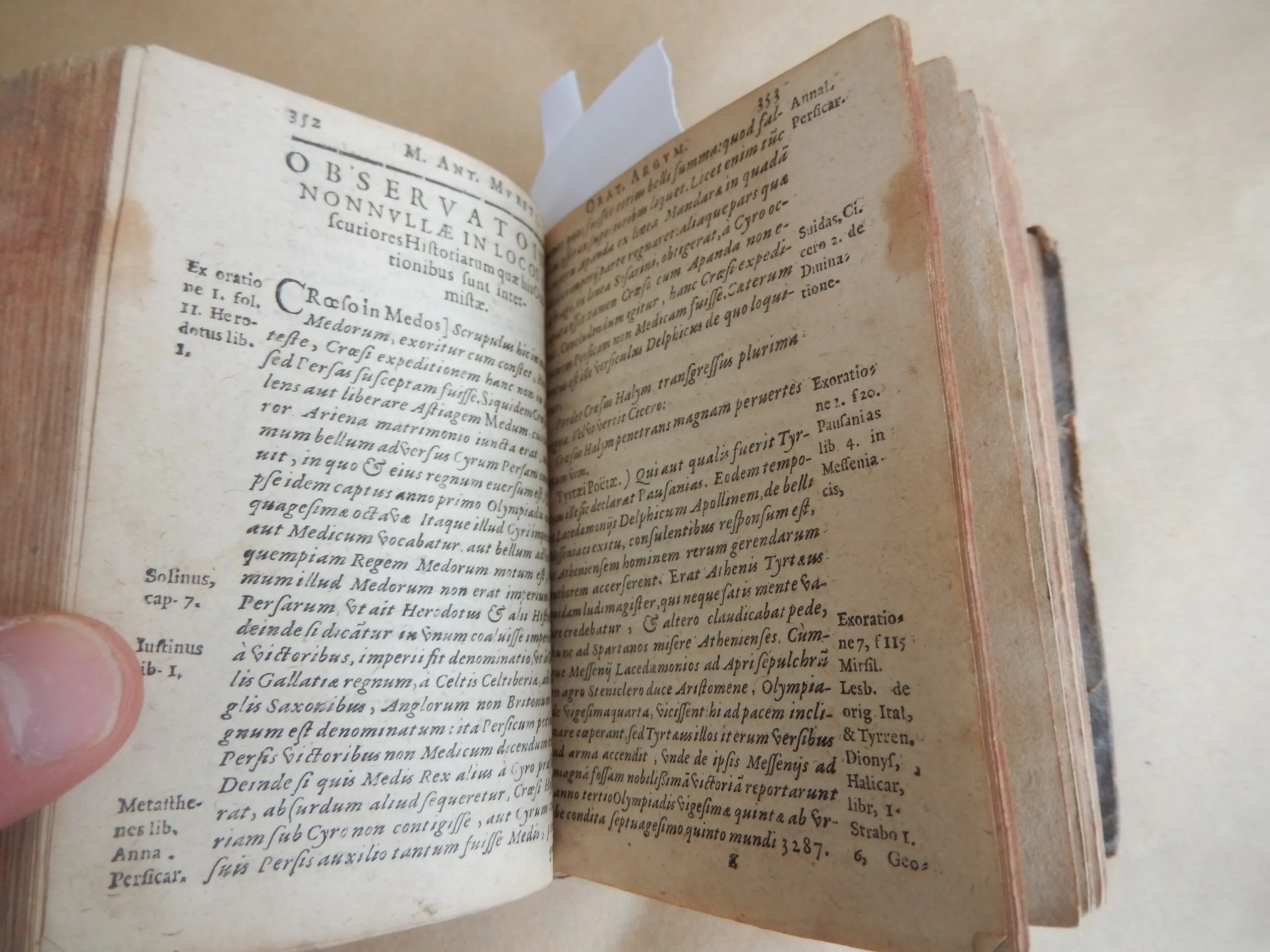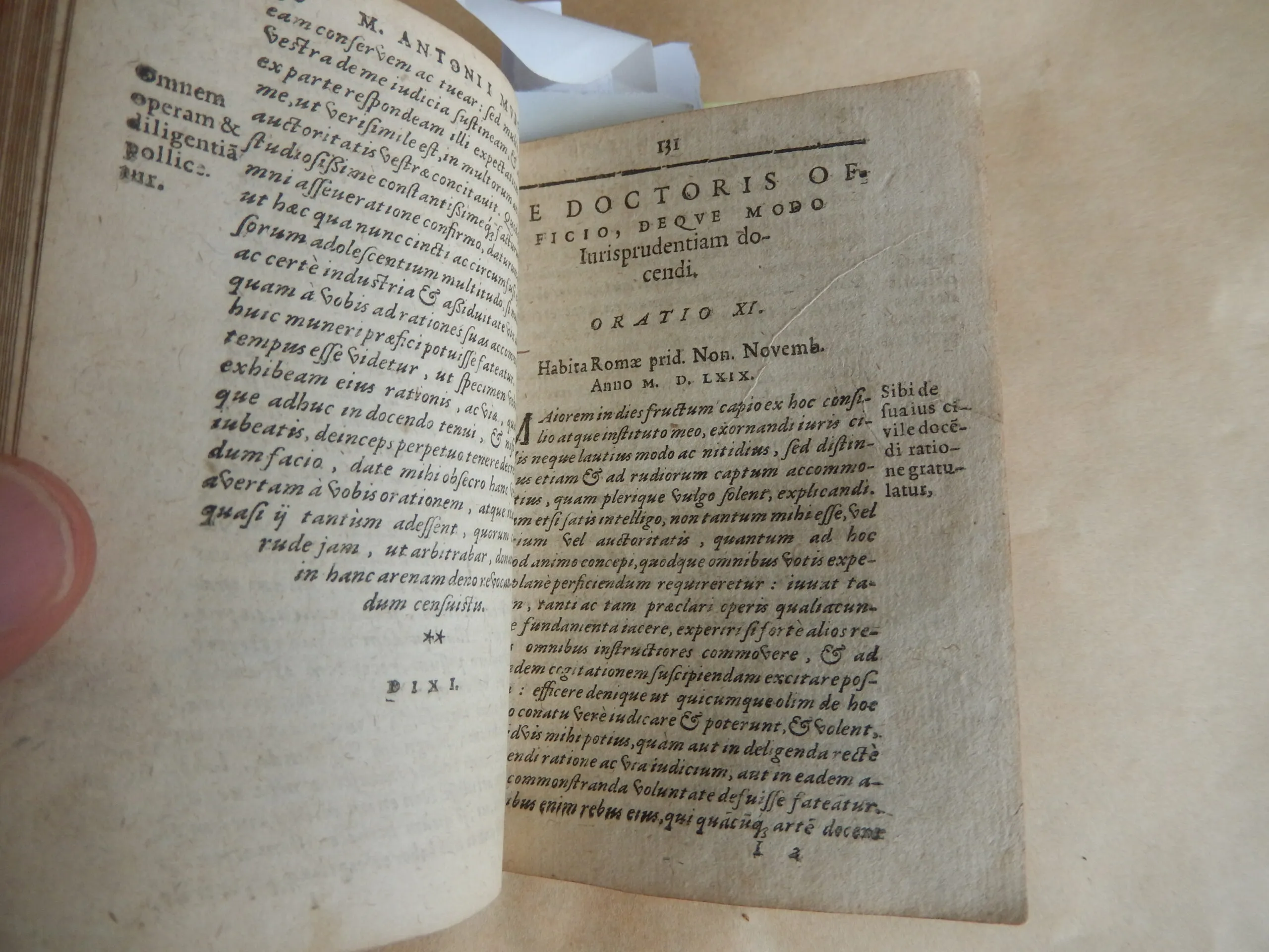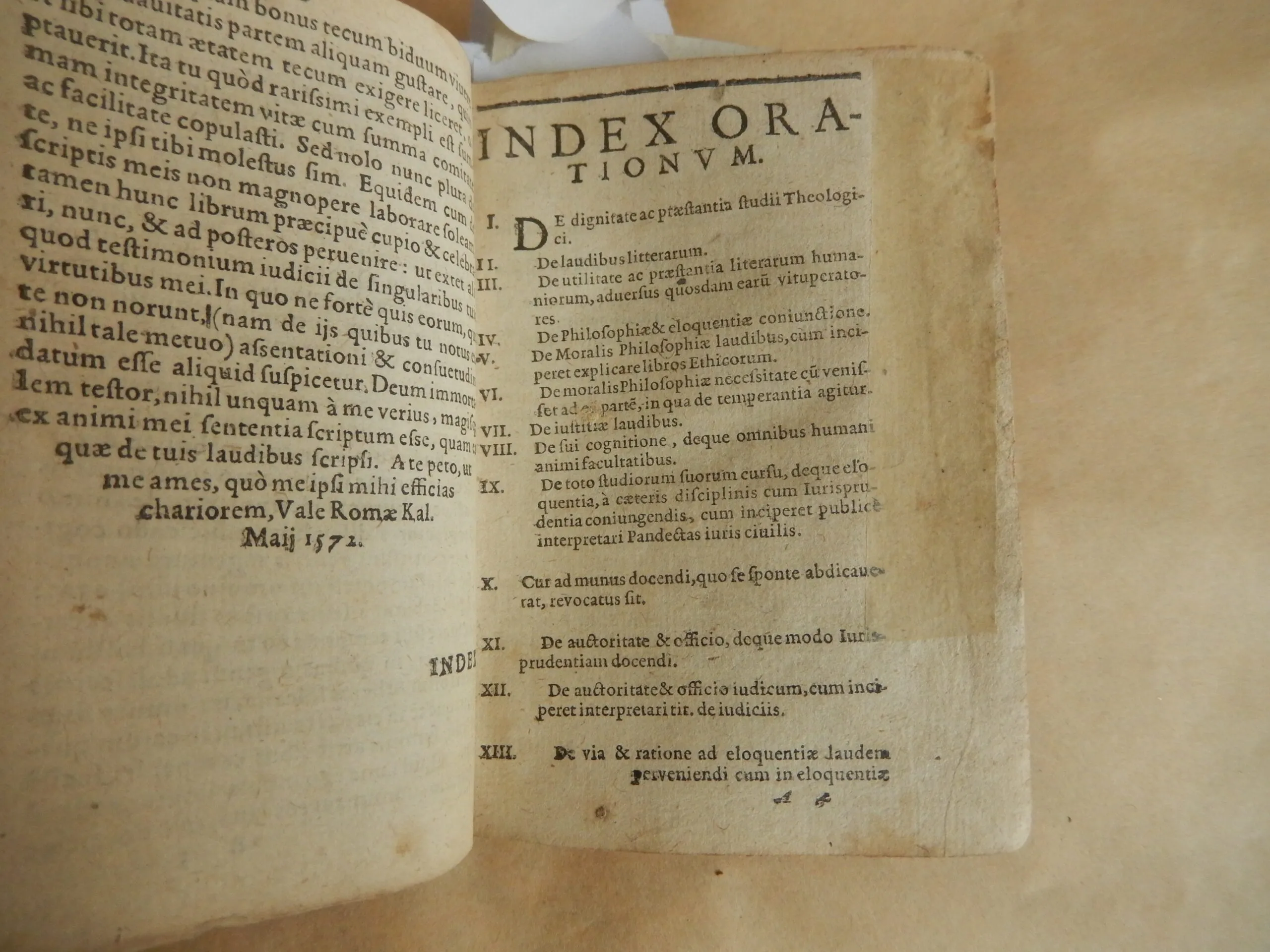 Fort in-12 half calf with corners, spine with 4 raised bands, decorated with a stamped blond calf title piece, red edges, pretty joints with three grooves, 121 x 90, 1622, multiple pagination.: address from 1571 to Scipioni Gonzaga Marchioni, 2p.; Index, 2p. Then Orationum – The speeches, paginated 10 to 351. Followed by Observatoines nonnulae in locos obseutiores historiarum quae his orationibus sunt intermistae, paginated 352-370. Then Orationum volumen secunda, 371-590, including address and index. Related: Epistolarum, paginated 5-267. Then Hymnorum sacro / Poemata, 268-320 including Prologus in Phormionem terentii. Beautiful italic font of the characters, except for the notes in the margin. Condition: six leaves properly restored in the margin including the title page in the inside margin; some underlining and/or exceptionally handwritten marginal notes for the first 8 speeches. Then clean. Covers, corners and fields rubbed but good. Covers a little blackened. Joints rubbed but intact. Spine rubbed with abrasions to the nerves, headpiece and tail but no loss. Title pieces rubbed and darkened.