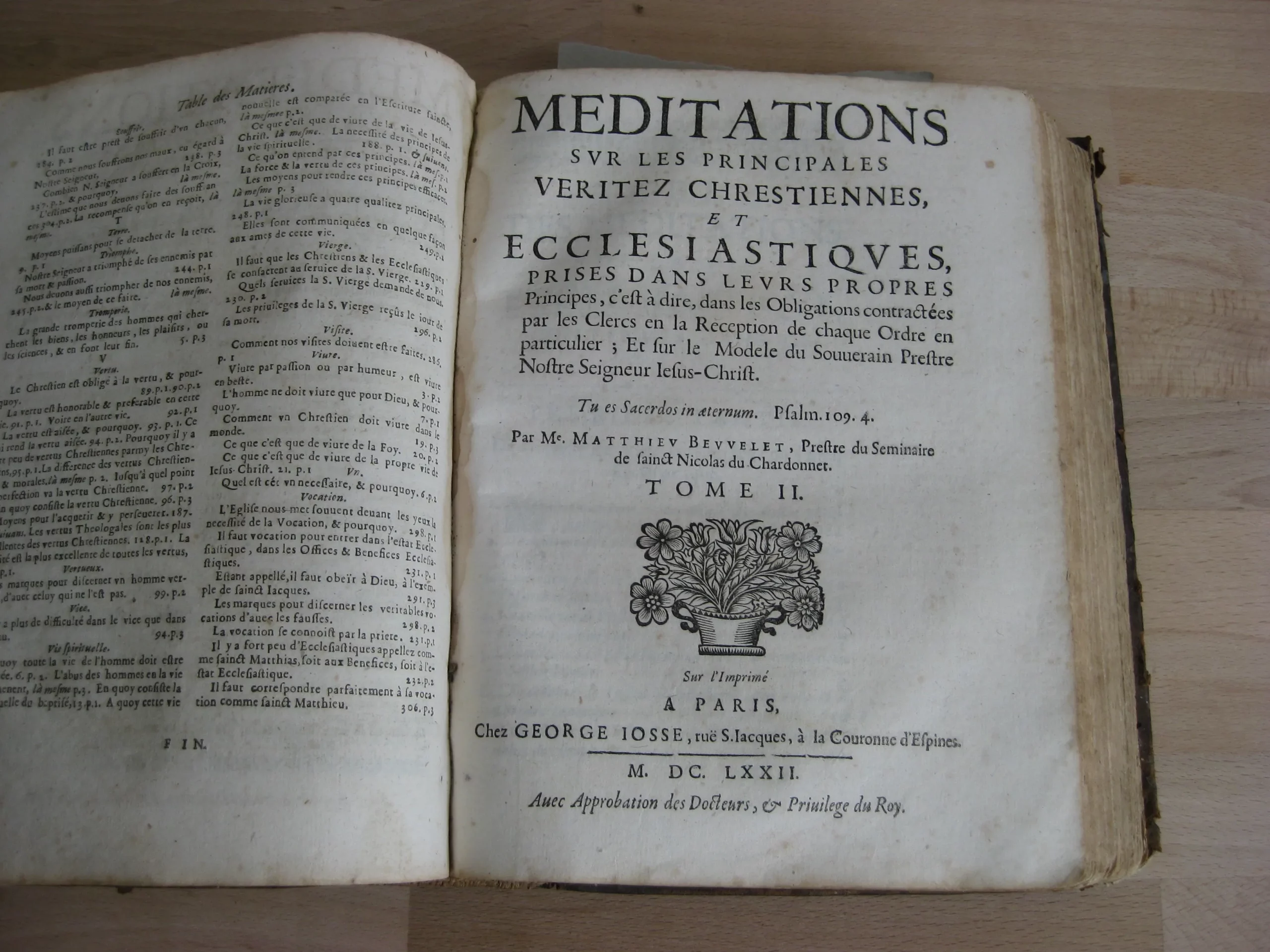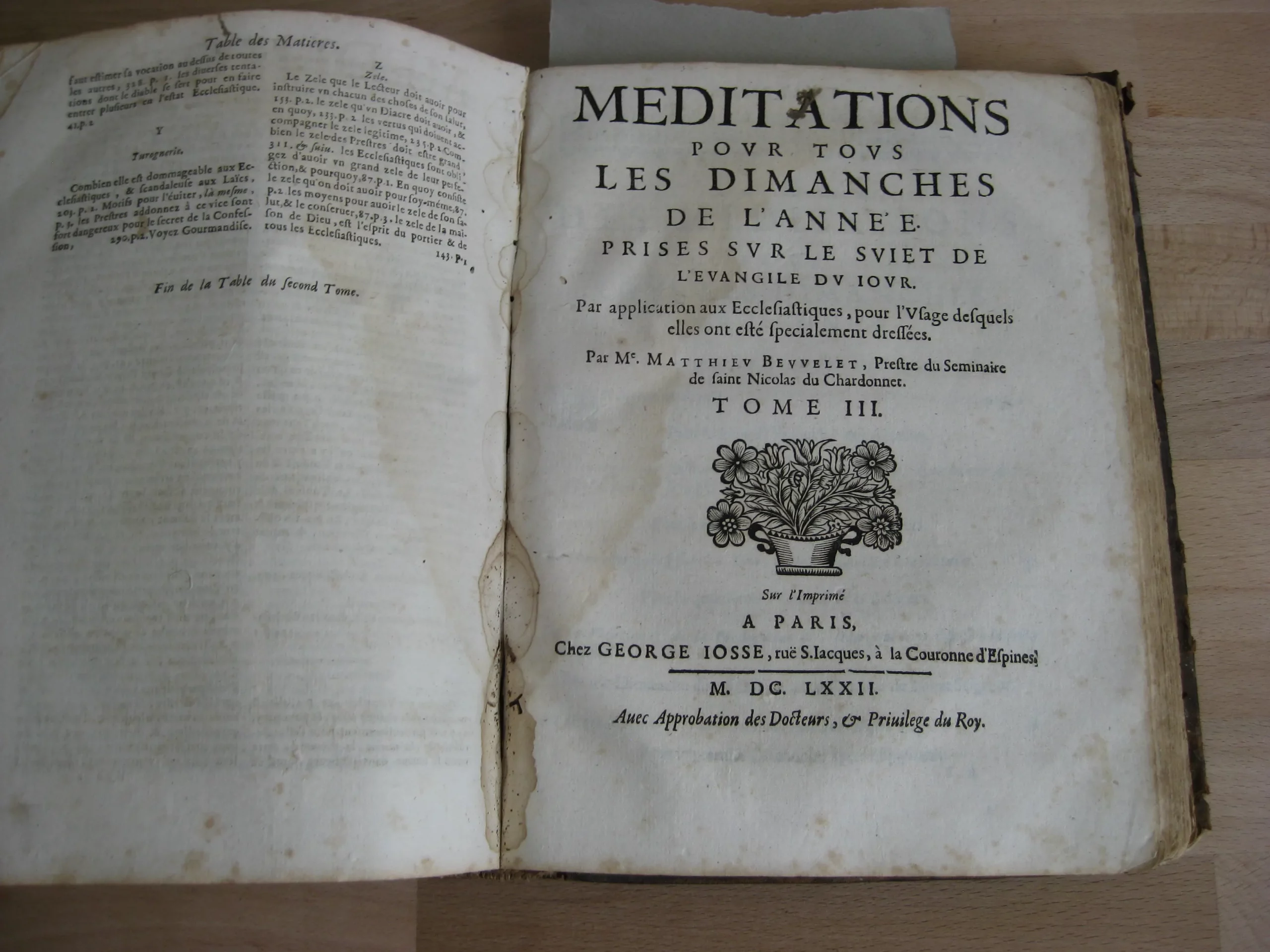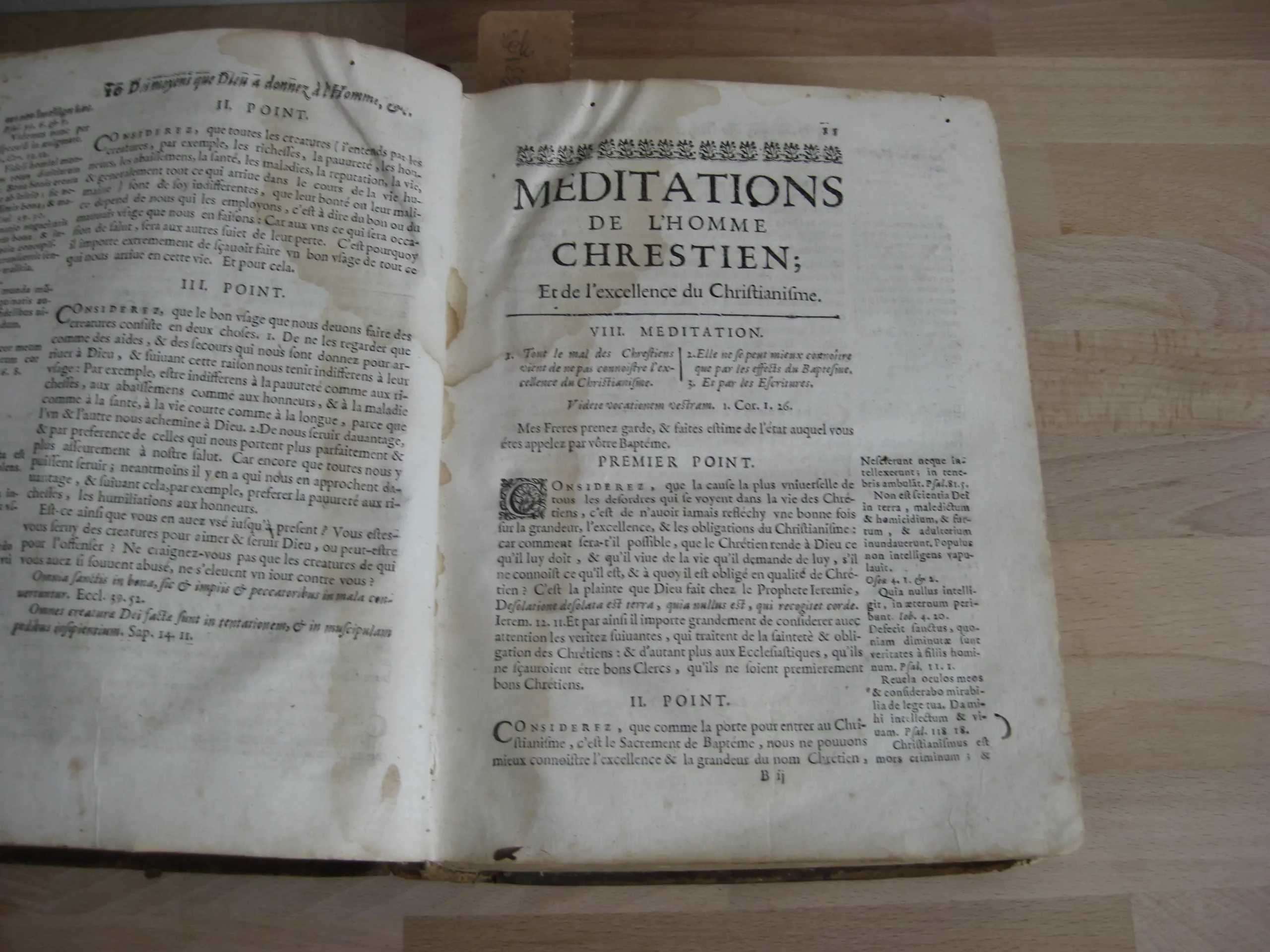 Plein veau, dos à quatre nerfs, 232 x 180, 1672. Tome I, Meditations sur la vie chrestienne, 342p. après sa table des méditations, et suivi de sa table des matières. Précédé de l’adresse à Monseigneur Cesard D’Estrez, evesque et duc de Laon ; Préface ; Approbation ; 10p. Tome II, Méditations sur les principales veritez chrestiennes prises dans leurs propres principes…, paginé 367, après sa table des méditations, et suivi de sa table des matières. Tome III méditations pour tous les dimanches de l’année prises sur le suiet de l’évangile du iour, 228p. Après sa table des méditations et suivi de sa table des matières. Dont p.115 à fin : « Méditations sur les conférences spirituelles et écclésiastiques ». Intérieur avec rousseurs, mouillures, travail de vers en marge. Des manques en page de titre. Reliure avec nombreuses épidermures ; dos très frotté avec manque ; coiffe manquante. Un ex-libris joliment manuscrit en garde surmontant une inscription latine.