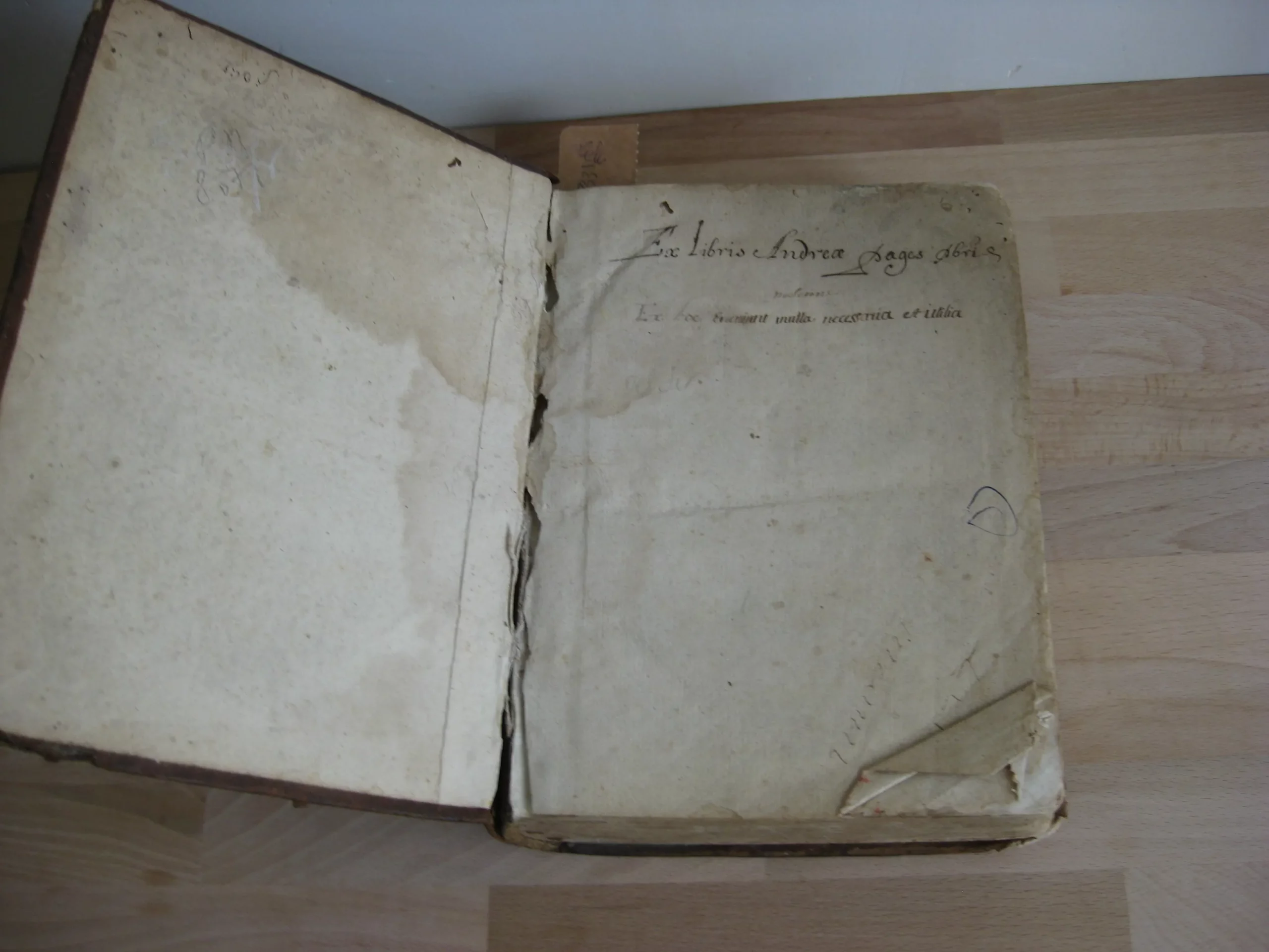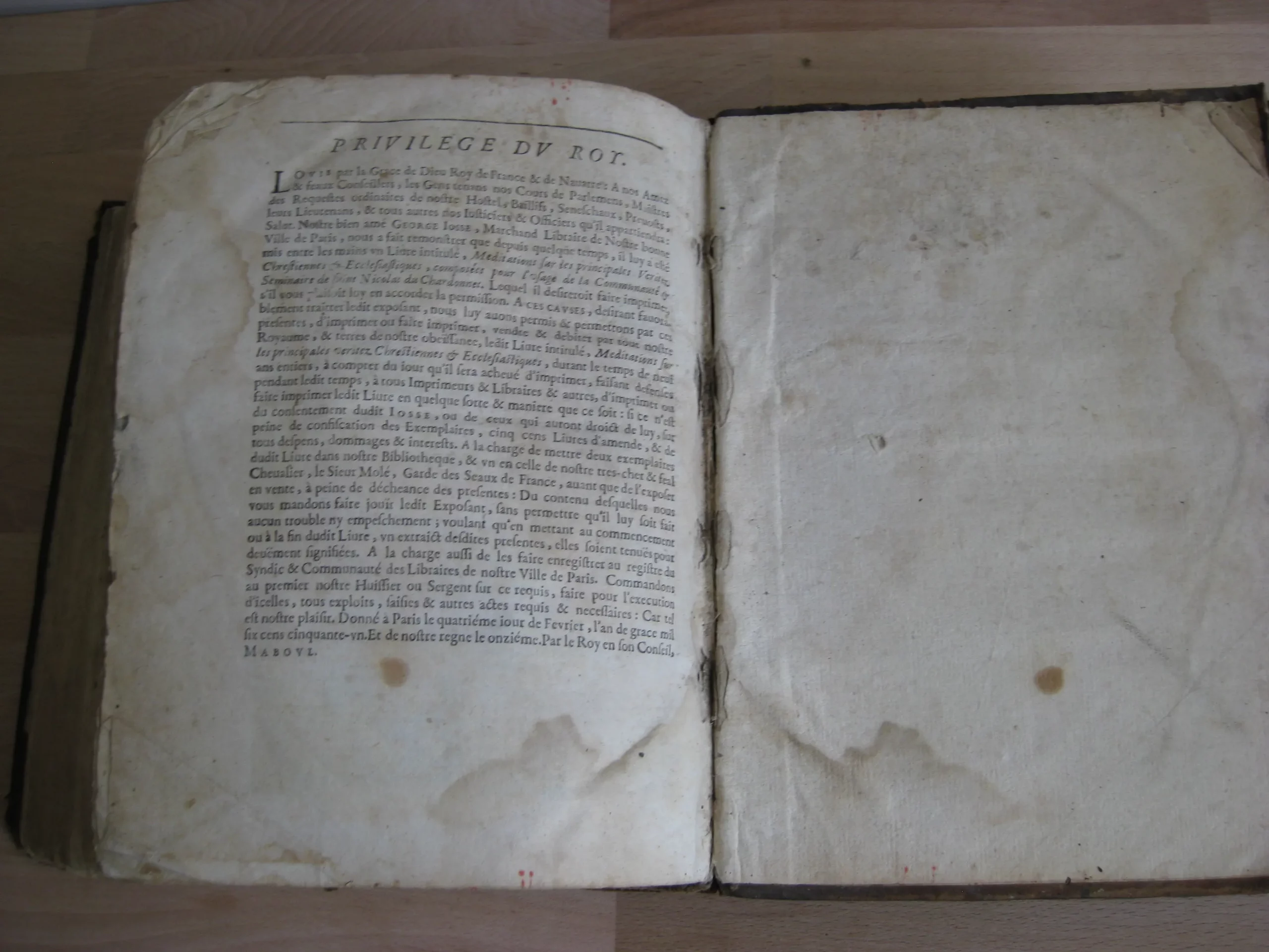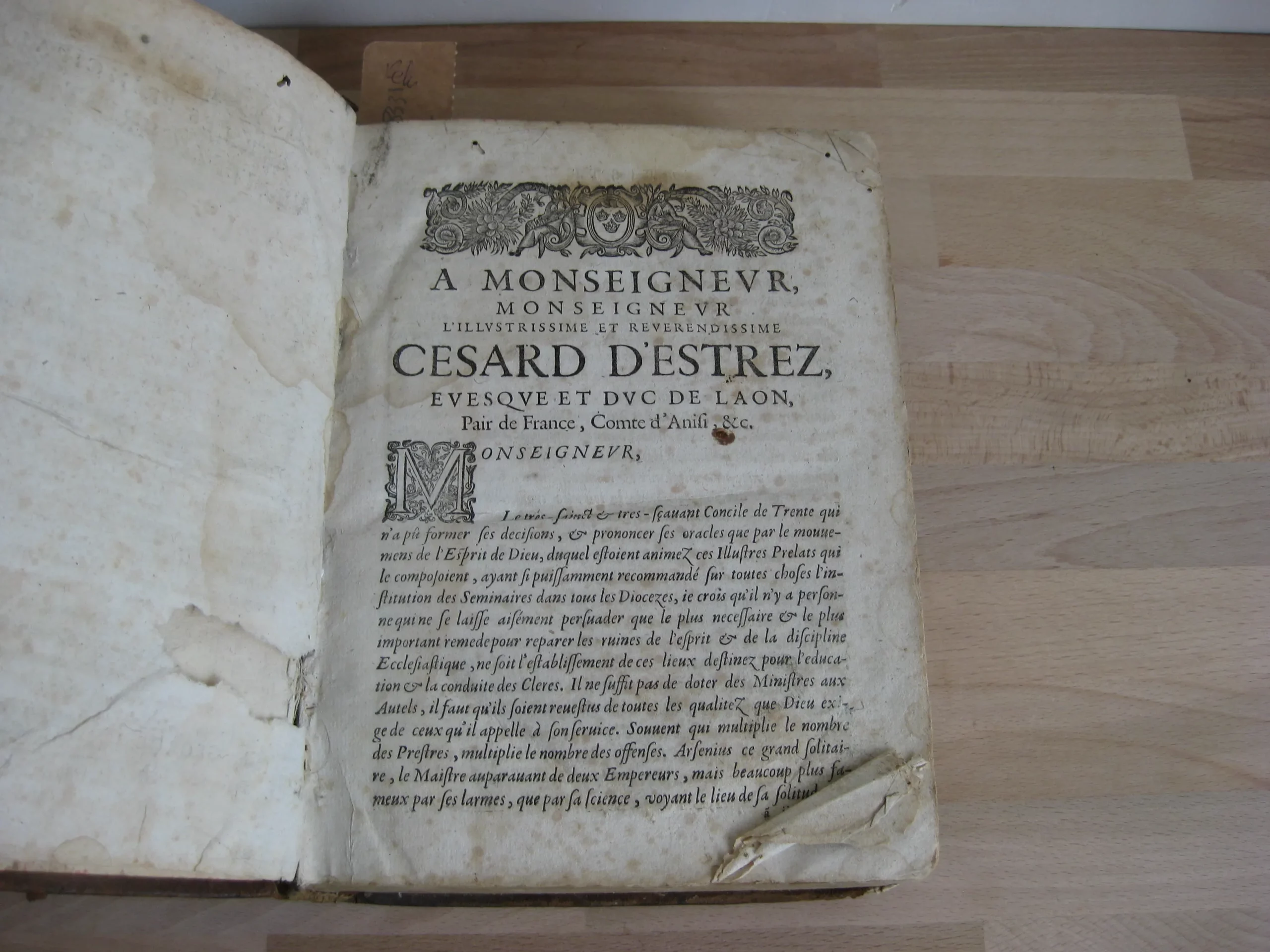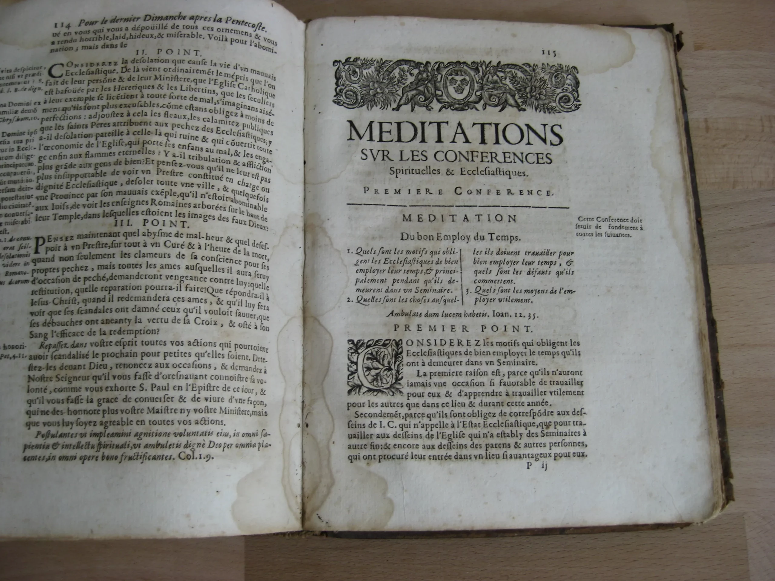 Plein veau, dos à quatre nerfs, 232 x 180, 1672. Tome I, Meditations sur la vie chrestienne, 342p. après sa table des méditations, et suivi de sa table des matières. Précédé de l’adresse à Monseigneur Cesard D’Estrez, evesque et duc de Laon ; Préface ; Approbation ; 10p. Tome II, Méditations sur les principales veritez chrestiennes prises dans leurs propres principes…, paginé 367, après sa table des méditations, et suivi de sa table des matières. Tome III méditations pour tous les dimanches de l’année prises sur le suiet de l’évangile du iour, 228p. Après sa table des méditations et suivi de sa table des matières. Dont p.115 à fin : « Méditations sur les conférences spirituelles et écclésiastiques ». Intérieur avec rousseurs, mouillures, travail de vers en marge. Des manques en page de titre. Reliure avec nombreuses épidermures ; dos très frotté avec manque ; coiffe manquante. Un ex-libris joliment manuscrit en garde surmontant une inscription latine.