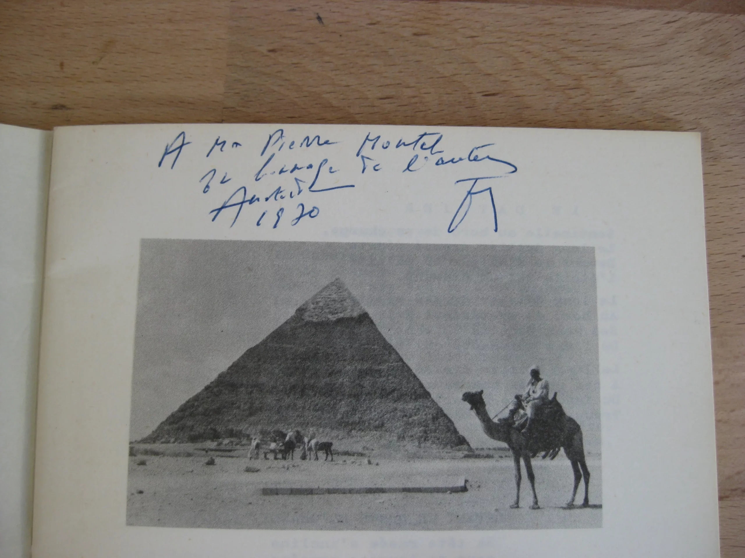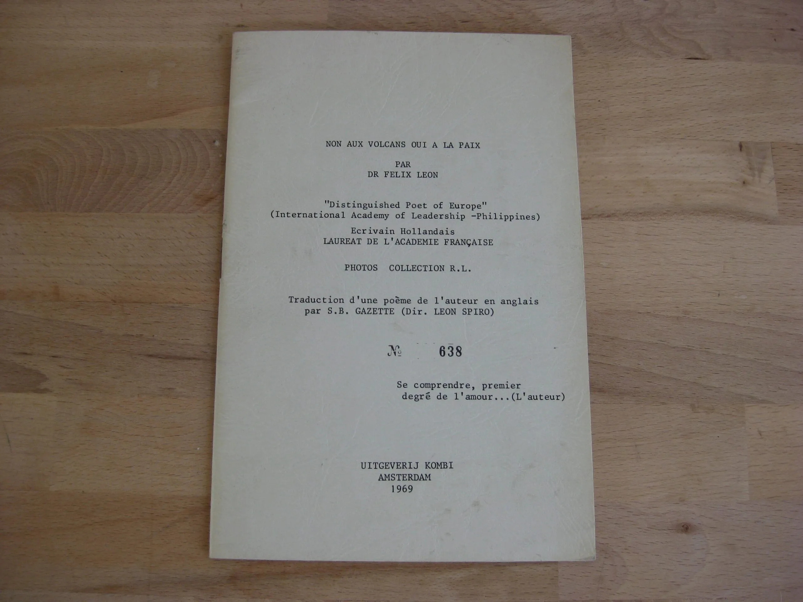 Brochure simple agrafe, 210 x 140, non paginé [24p.], 1969. « Distinguish Poet of Europe » (International Academy of Leadership – Philippines). Ecrivain hollandais. Traduction française d’un poème de l’auteur en anglais par S.B. Cazette (Dir. Léon Spiro). Exemplaire numéroté 638. enrichi d’un envoi signé de l’auteur en première page. Illustré de photos de la collection R. L. Intérieur très bon, propre et intègre. Exemplaire deux taches d’adhésif en quatrième de couverture, couvertures propres et intègres. Bel exemplaire, bien ferme.