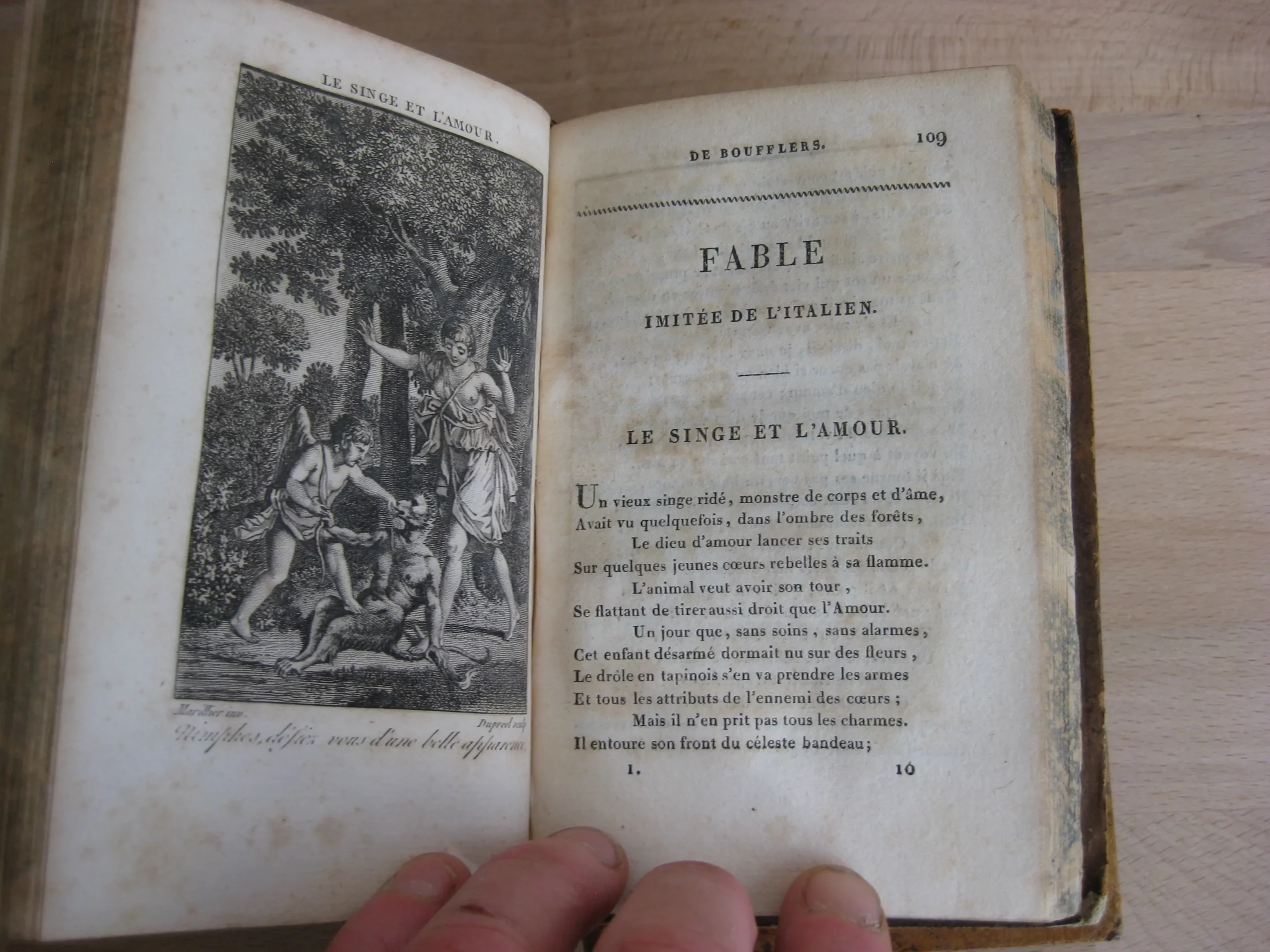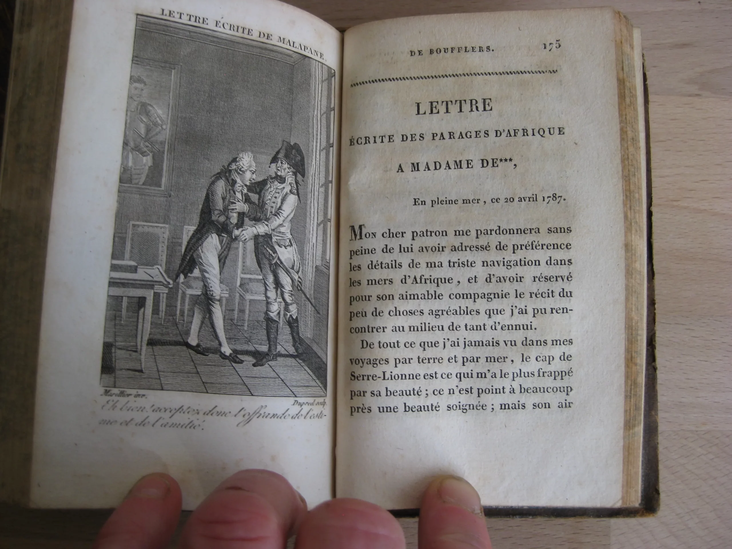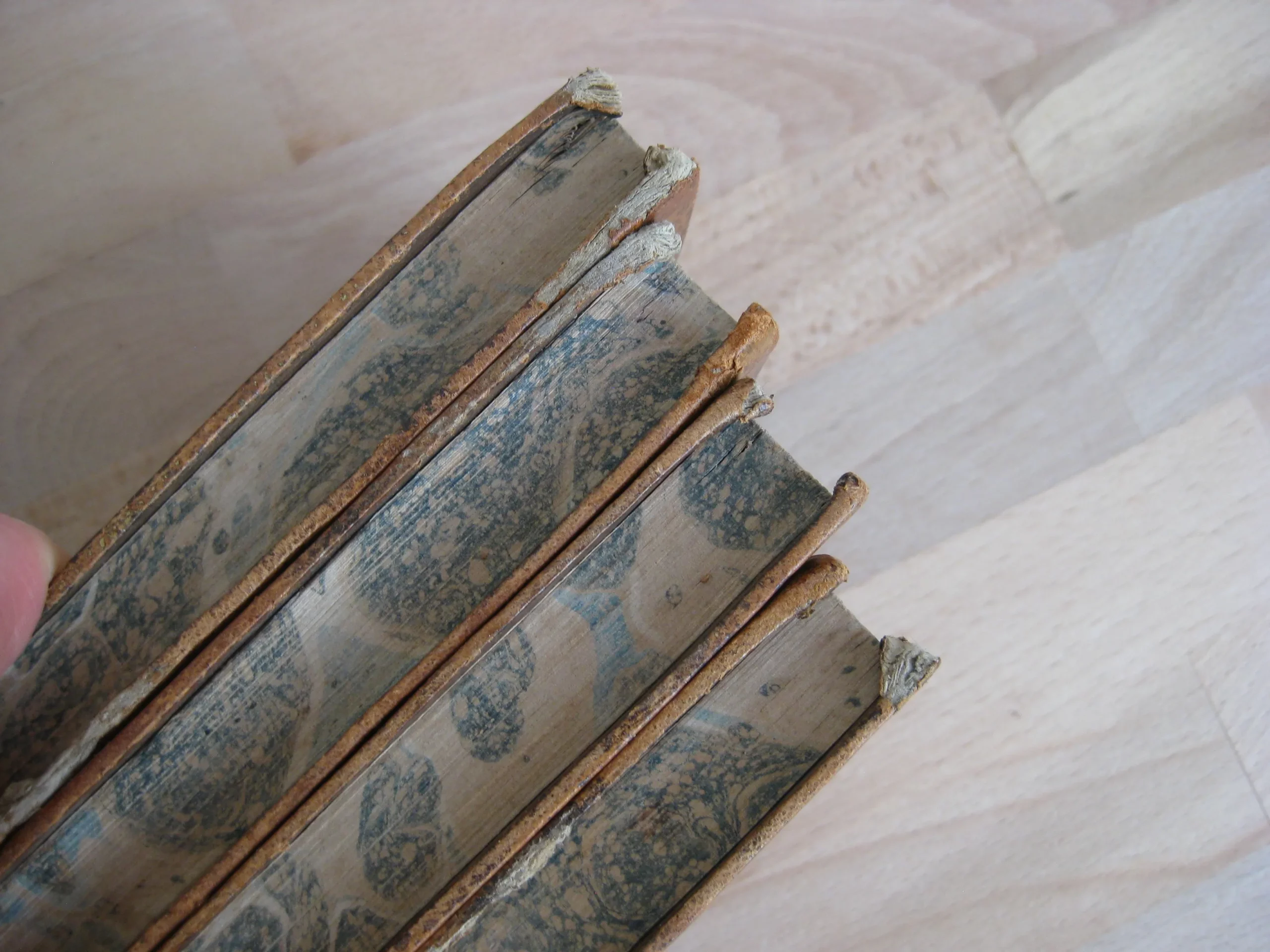 Pleine basane marbrée, in-18, dos long ornés d’une pièce de titre en maroquin rouge et de tomaison en maroquin vert, tranches gros cailloutées, 140 x 88, 1817, seconde édition complète ornée de 16 gravures et du portrait de l’auteur. T1, portrait en frontispice par Hilaire Le Dru, gravé par Gaucher ; et 3 gravures pleine page dessinées par Marillier et gravé par Dupréel. 244p. T2, 2 gravures dont frontispice (Marillier / Delignon) et Marillier /Dupréel. 243p. T3, Frontispice (Marillier / Delignon) et 6 gravures (Monnet /Pérénot / Marillier-Dupréel). 253p. In fine : Placement des gravures pour les 4 tomes. T4, frontispice (N. Vallin, del.) et 3 gravures ( N. Vallin / Pérénot).231 p. Avec table des matières des 4 volumes. Bien complet de toutes ses gravures. Pour tous les volumes : Vignette ex-libris collée au verso de la garde « T. Froissart », et ex-libris tamponné au faux-titre « G. Picarle, greffier de la justice de paix Mussy sur Seine ». Intérieur propre pour tous les volumes, rousseurs marginales. Coins et champs frottés, 9 des coins légèrement émoussés. Plats frottés, avec rares épidermures et griffes, très bons. Dos en bel état, quelques épidermures, petits manques aux pièces de titre, coiffe et queue frottées, mais bonnes, sauf au t4 avc une déchirure en coiffe. Bel ensemble, bien ferme. In fine du T1, une note manuscrite en contreplat inférieur en guise de présentation de l’auteur : « abbé libertin, militaire, philosophe, diplomate chevronné, émigré patriote, républicain… inhumé auprès du poète Delille. »