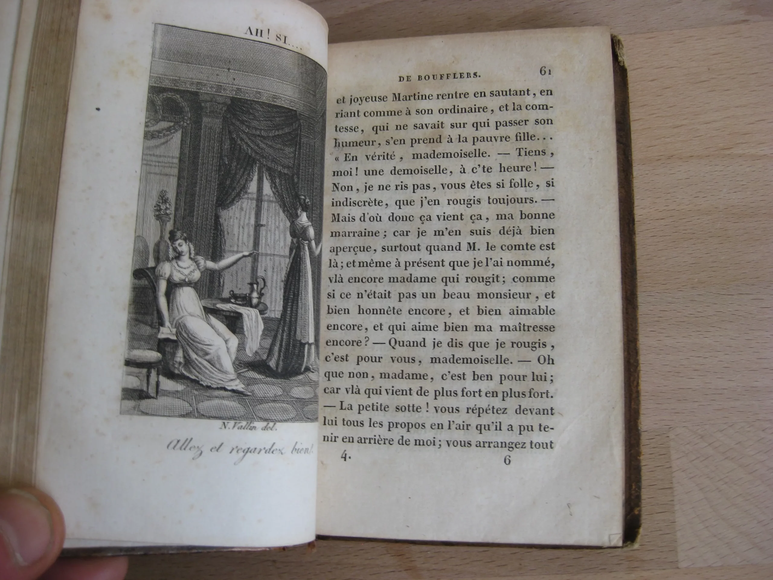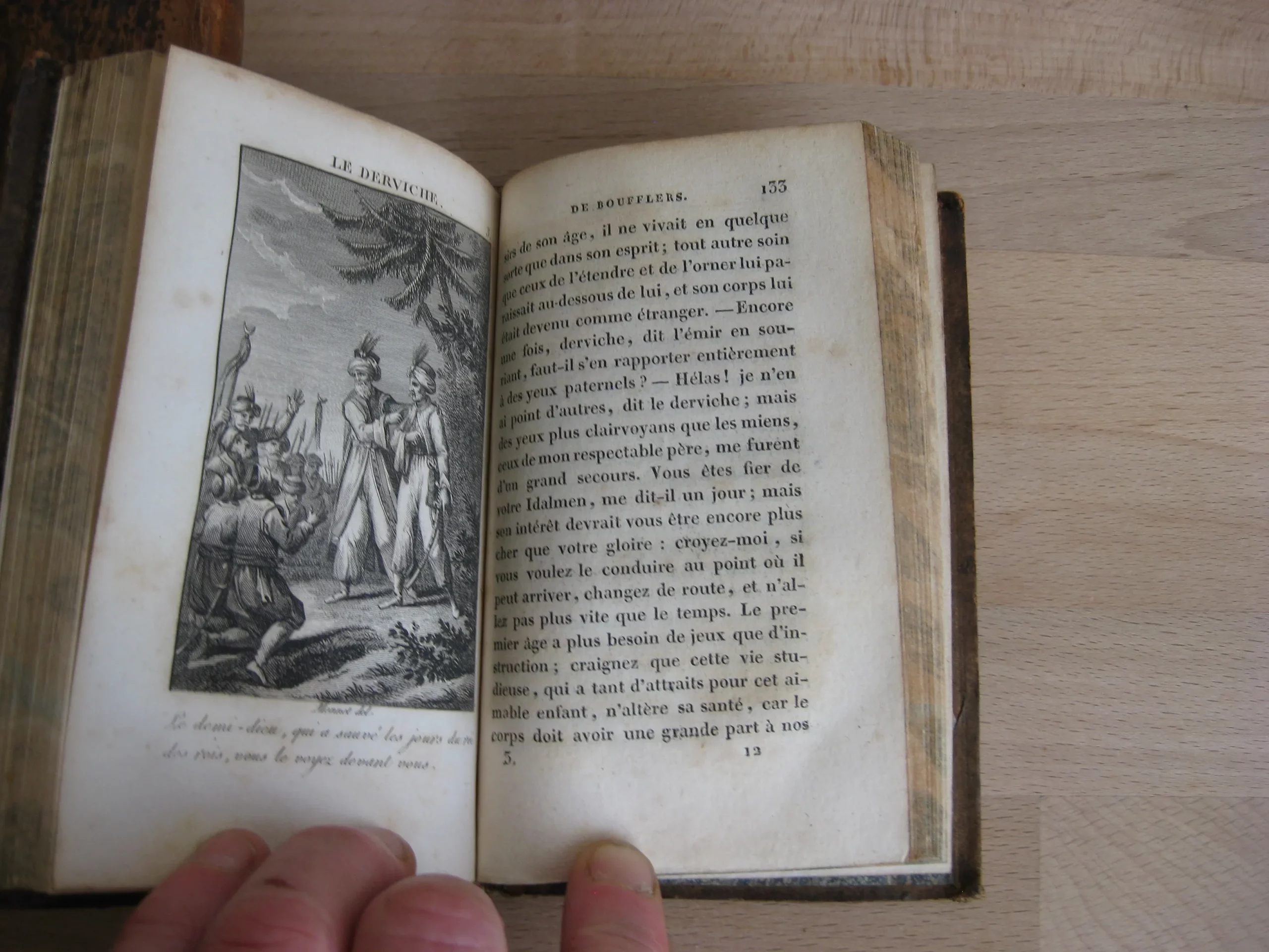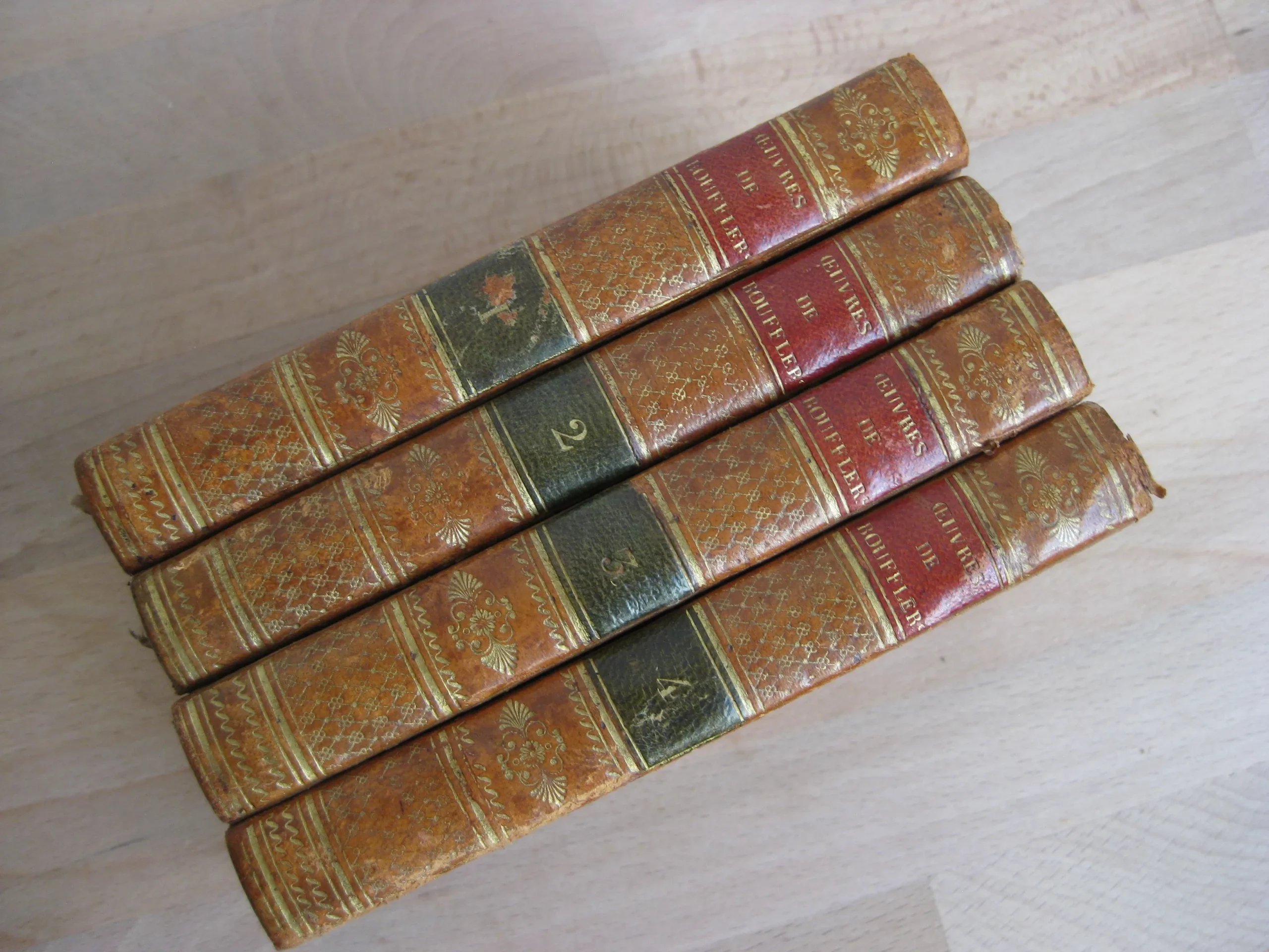 Pleine basane marbrée, in-18, dos long ornés d’une pièce de titre en maroquin rouge et de tomaison en maroquin vert, tranches gros cailloutées, 140 x 88, 1817, seconde édition complète ornée de 16 gravures et du portrait de l’auteur. T1, portrait en frontispice par Hilaire Le Dru, gravé par Gaucher ; et 3 gravures pleine page dessinées par Marillier et gravé par Dupréel. 244p. T2, 2 gravures dont frontispice (Marillier / Delignon) et Marillier /Dupréel. 243p. T3, Frontispice (Marillier / Delignon) et 6 gravures (Monnet /Pérénot / Marillier-Dupréel). 253p. In fine : Placement des gravures pour les 4 tomes. T4, frontispice (N. Vallin, del.) et 3 gravures ( N. Vallin / Pérénot).231 p. Avec table des matières des 4 volumes. Bien complet de toutes ses gravures. Pour tous les volumes : Vignette ex-libris collée au verso de la garde « T. Froissart », et ex-libris tamponné au faux-titre « G. Picarle, greffier de la justice de paix Mussy sur Seine ». Intérieur propre pour tous les volumes, rousseurs marginales. Coins et champs frottés, 9 des coins légèrement émoussés. Plats frottés, avec rares épidermures et griffes, très bons. Dos en bel état, quelques épidermures, petits manques aux pièces de titre, coiffe et queue frottées, mais bonnes, sauf au t4 avc une déchirure en coiffe. Bel ensemble, bien ferme. In fine du T1, une note manuscrite en contreplat inférieur en guise de présentation de l’auteur : « abbé libertin, militaire, philosophe, diplomate chevronné, émigré patriote, républicain… inhumé auprès du poète Delille. »