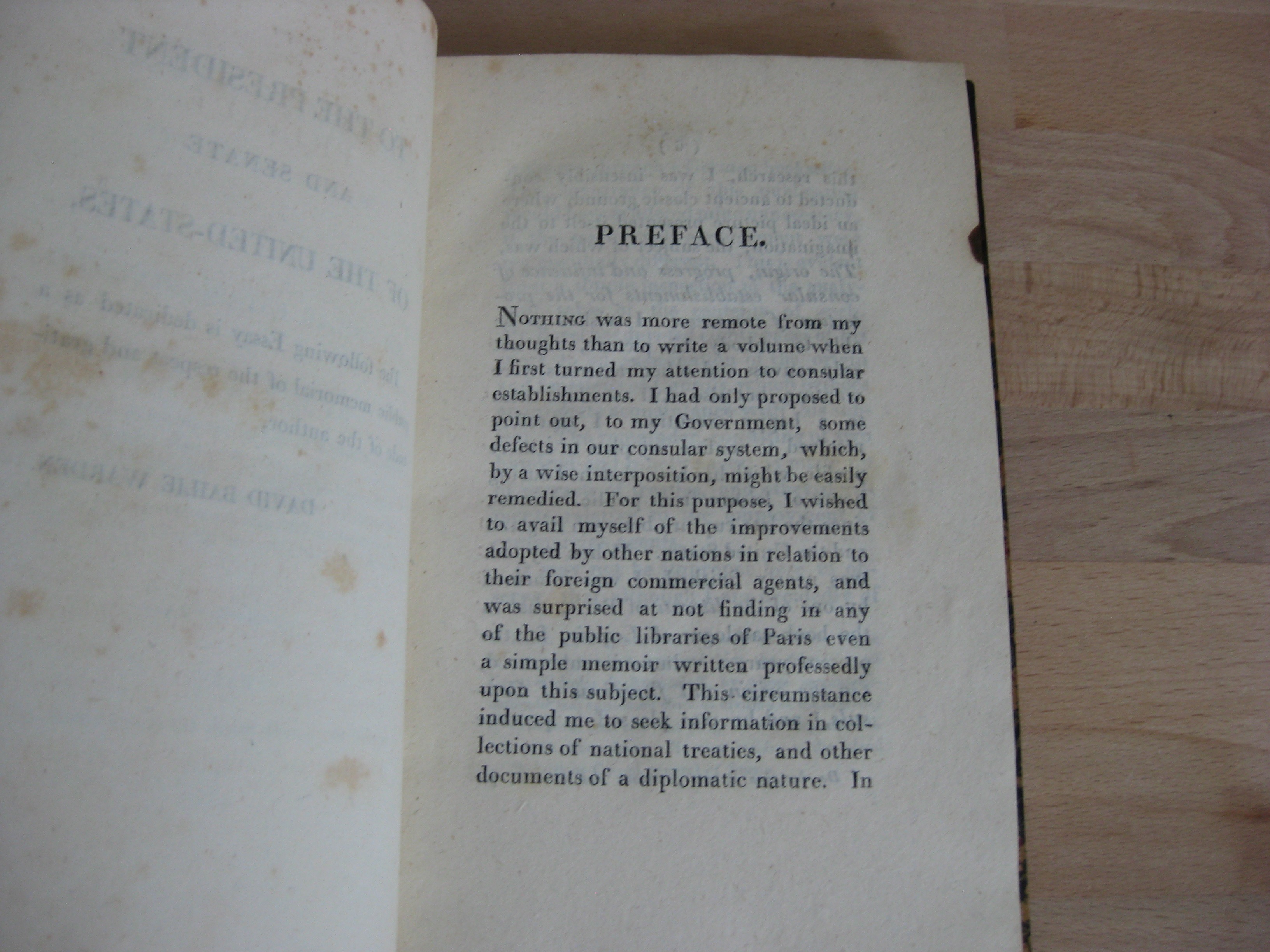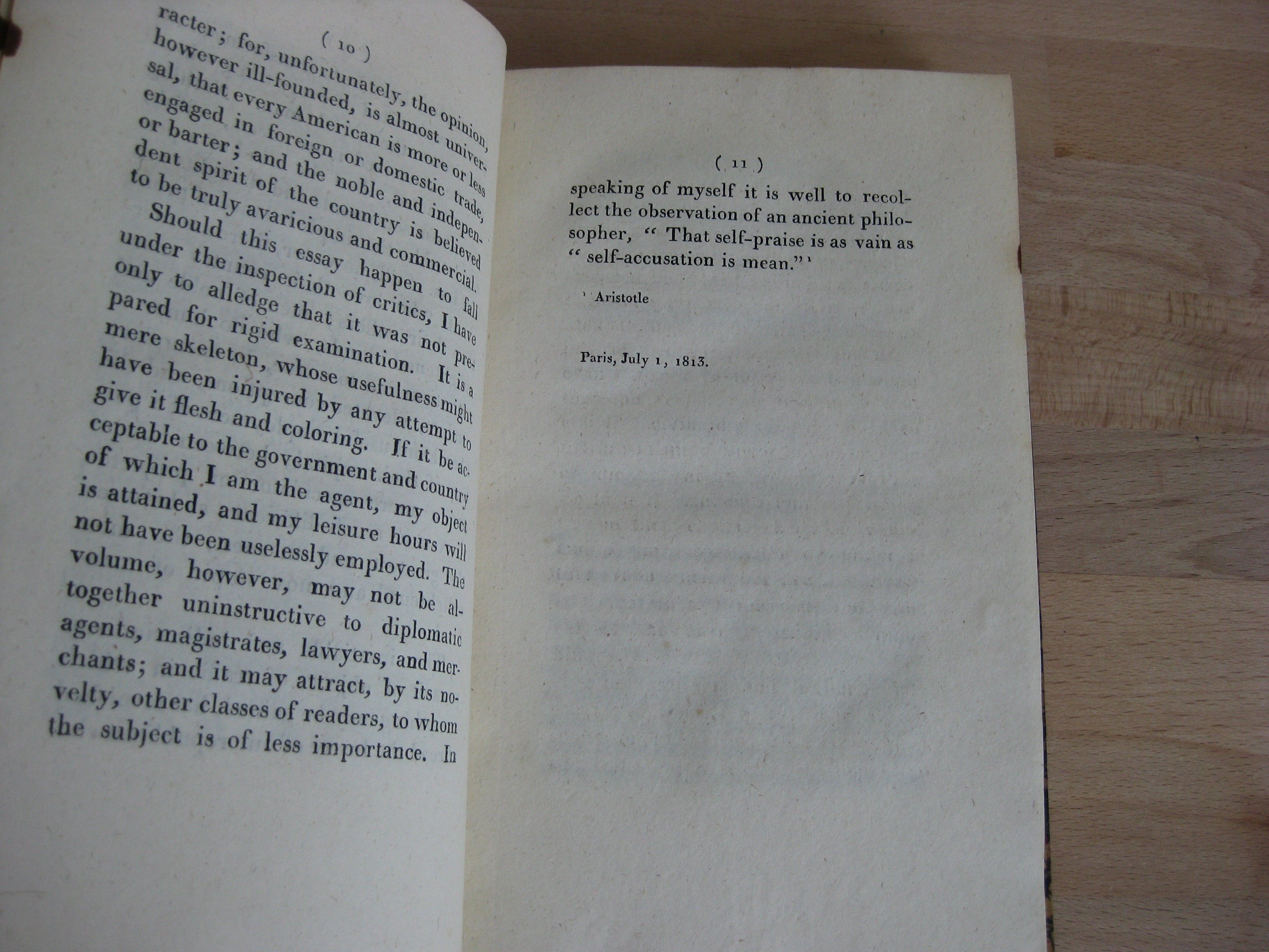 Demi-basane tabac, dos long orné de liserés et d’une pièce de titre en maroquin vert, 224 x 135, 330p. 1813. Edition originale. Intérieur globalement propre, rousseurs marginales. Mouillure sombre brièvement sur la tranche en début de volume, et en fin de volume en coin de page qui va crescendo depuis la page 226. Frottements, griffes, épidermures à al reliure qui reste très bonne néanmoins. Plats et coins frottés, coins de pied légèrement cognés et émoussés. Bon exemplaire bien ferme de cette rare première édition. David Bailie Warden (1772-1845) fut un insurgé républicain lors de la rébellion irlandaise de 1798 contre la Couronne britannique, puis, exilé aux Etats-Unis, il en devint consul en France. C’est dans ce cadre qu’il publie cette étude.