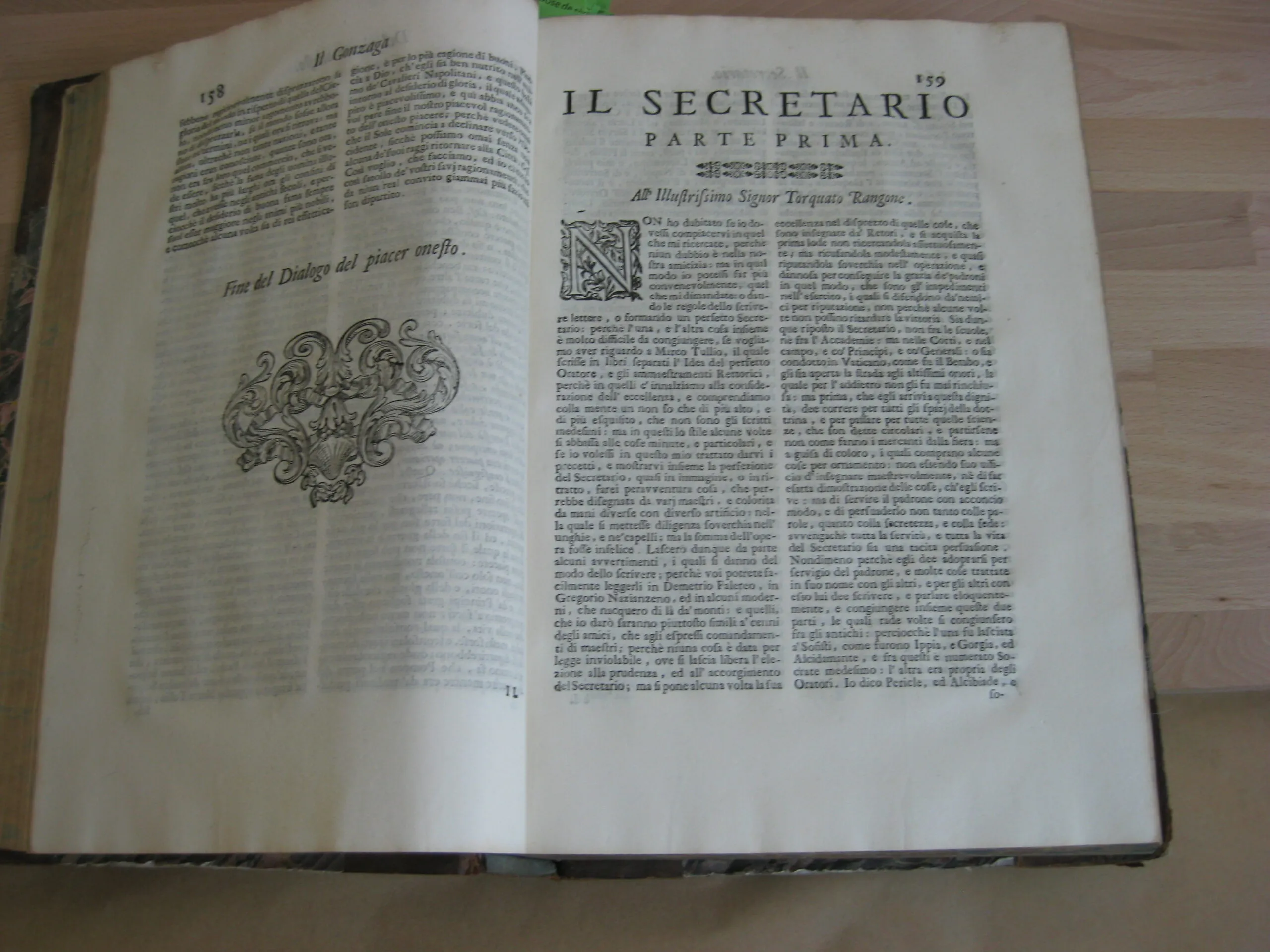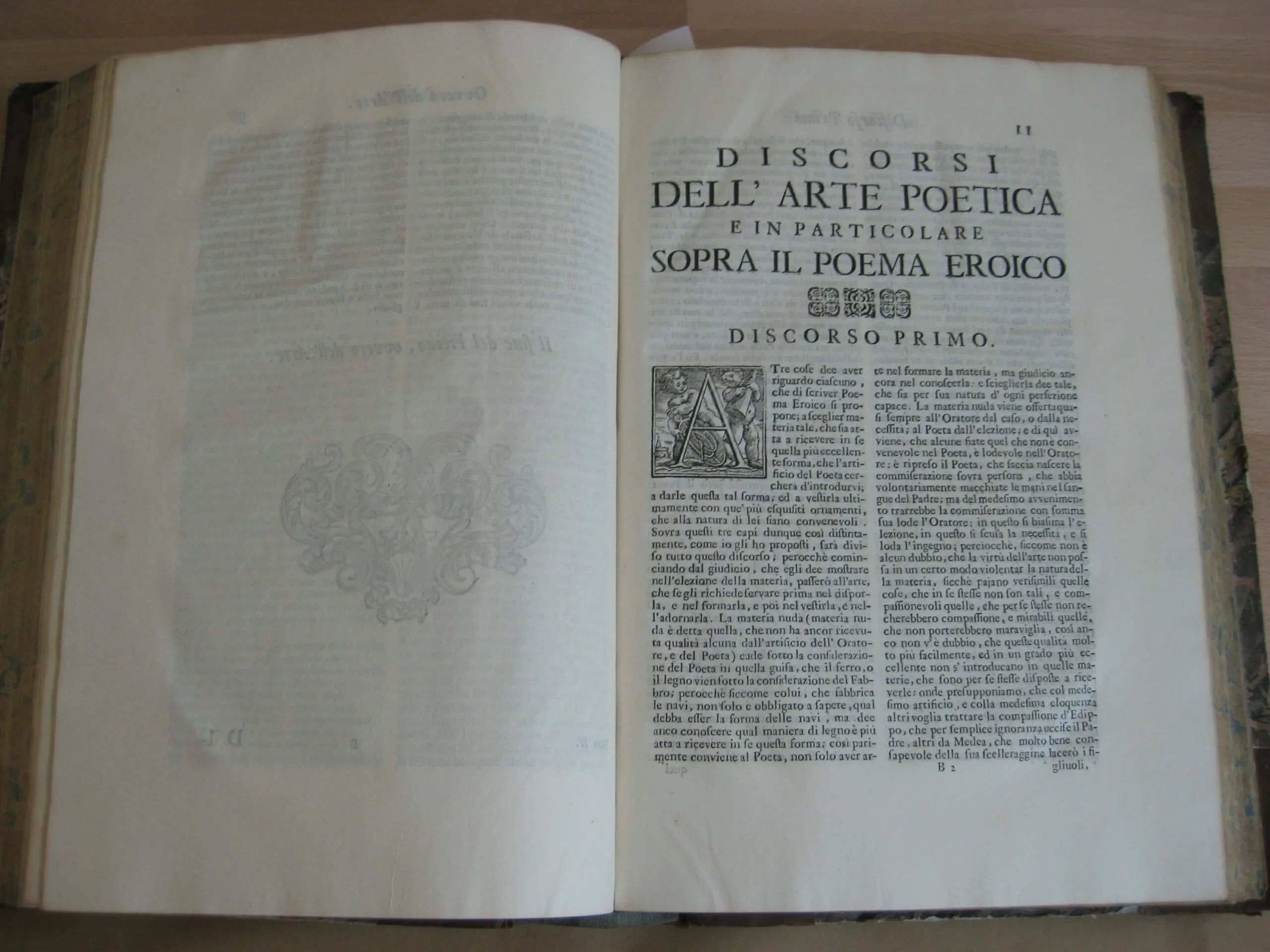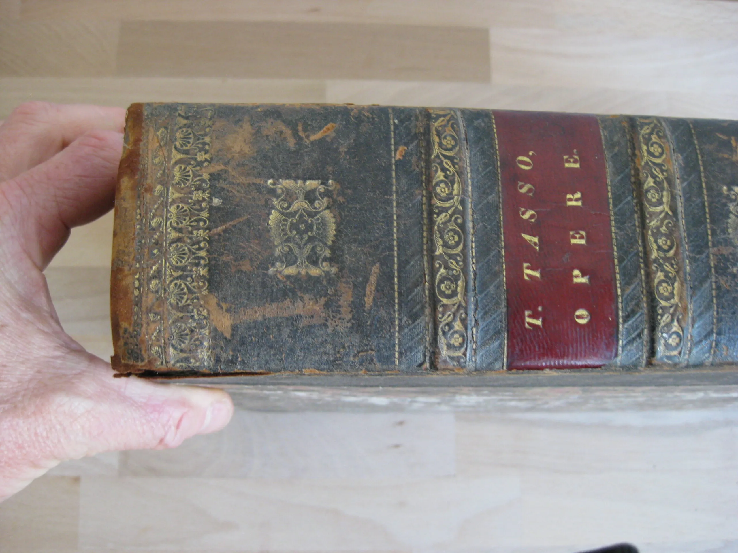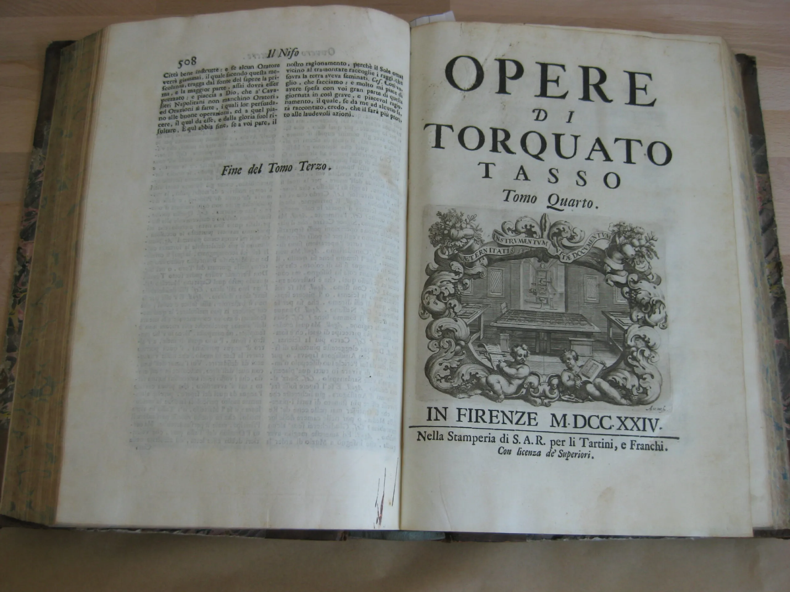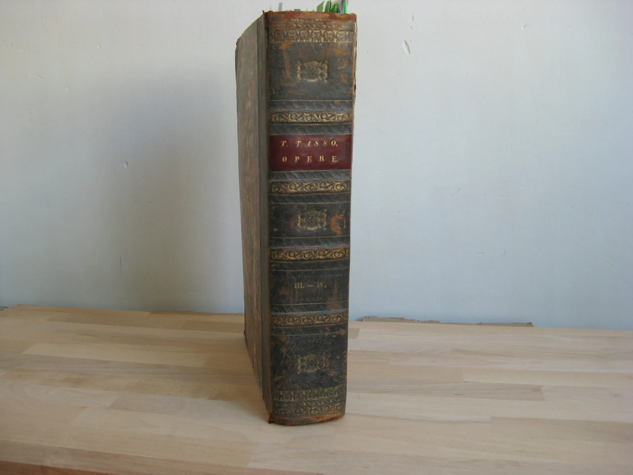 In-folio, half brown sheepskin with corners, ribbed spine decorated with ribbed friezes and boxes, a red calf title label, and volume numbers, veined edges, covers stamped with a frieze in the height, 338 x 233, 1724, Florence. For both volumes, very beautiful engraved vignette on the title with motto "Aeternitatis instrumentum in documentum", and signed "Av. W.". Includes: Table of the terzo tomo, 2p. Then Prose di torquatotasso, Parte prima. 508p. Table of the quarto tomo, 2p. Then Prose di torquatotasso, Parte seconda, 522p. Very good interior, clean and intact. Corners and fields rubbed, corners bumped. Covers rubbed with scuffs. Rubbed joints, upper joint split along the height of the first nerve, and lower joint at the head and foot but less long. Rubbed back, scuffs on the headdress, tail, caissons. A fine specimen nonetheless.