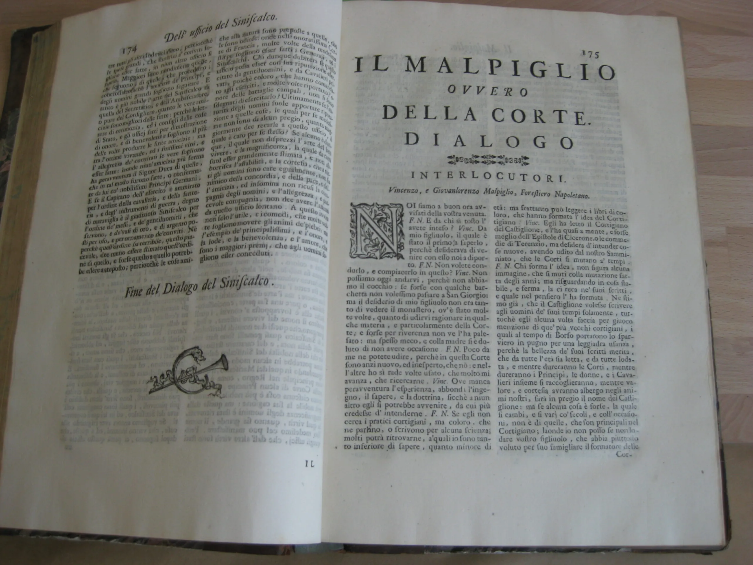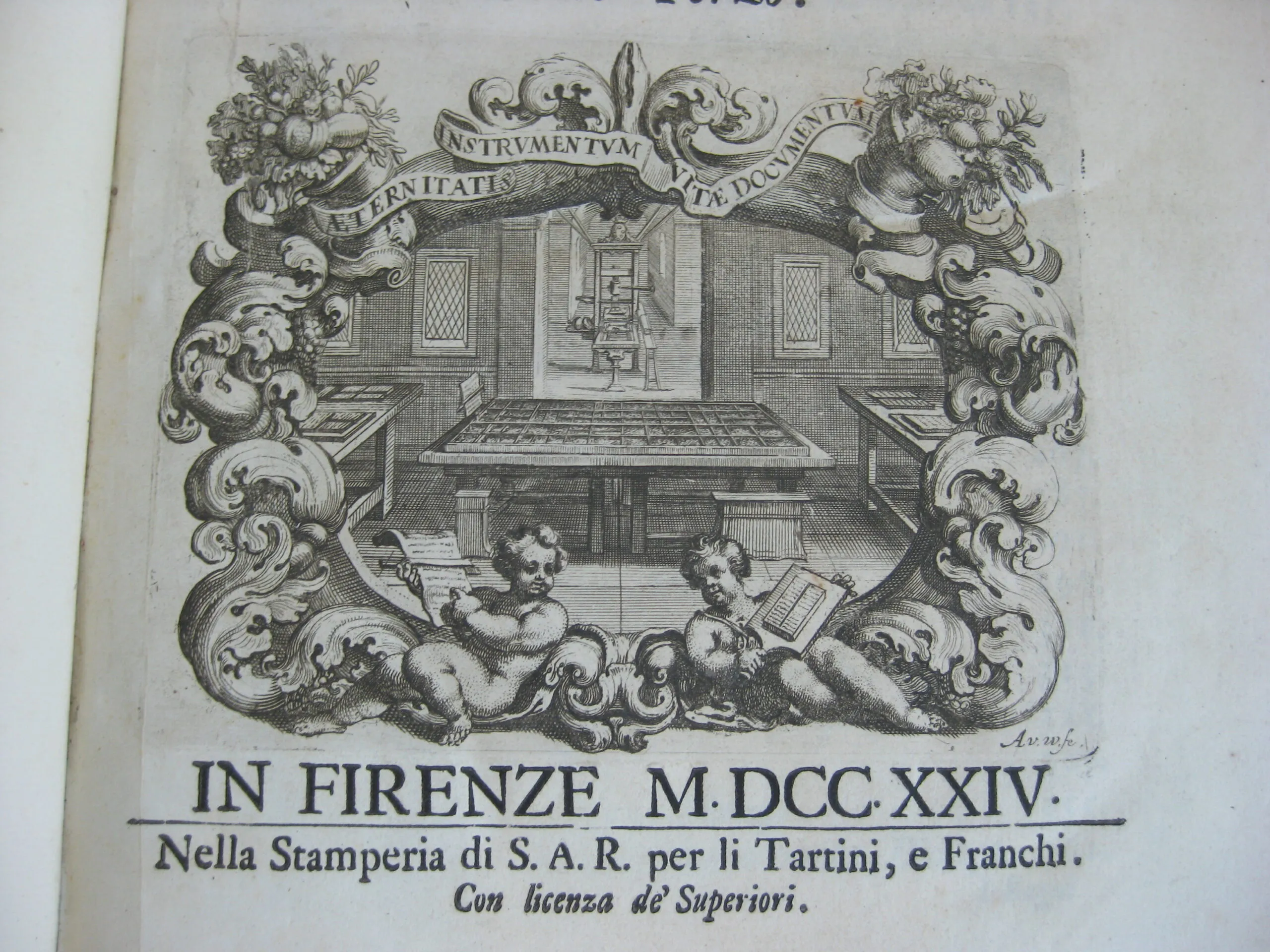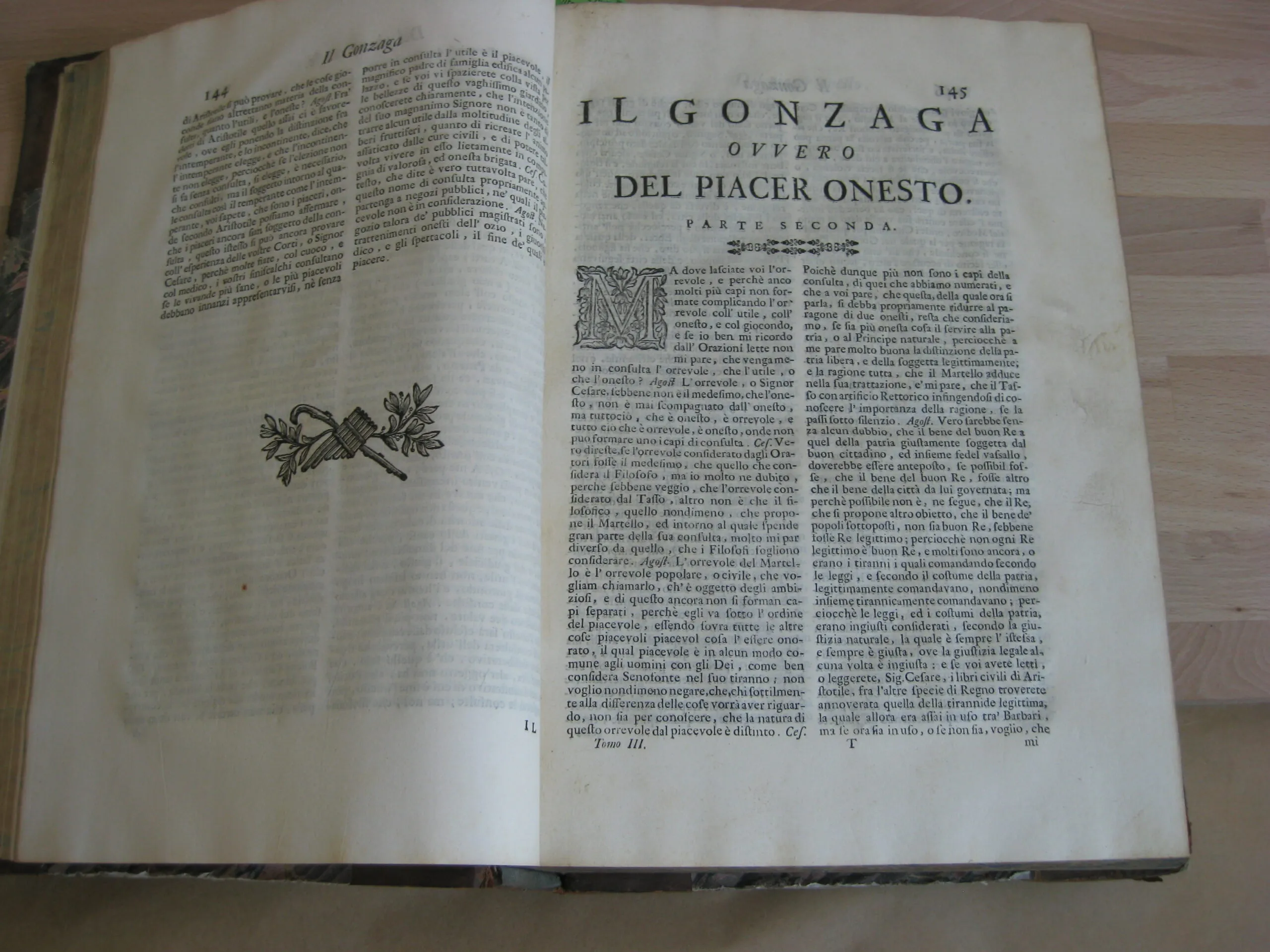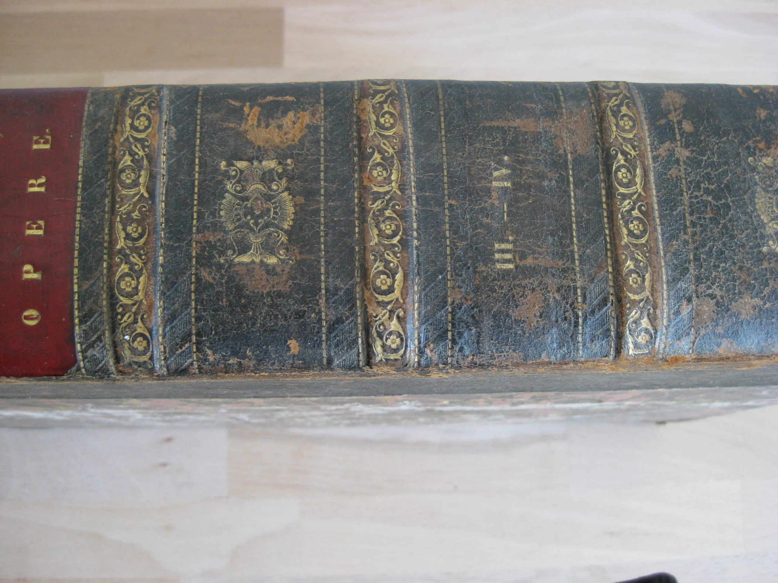 In-folio, half brown sheepskin with corners, ribbed spine decorated with ribbed friezes and boxes, a red calf title label, and volume numbers, veined edges, covers stamped with a frieze in the height, 338 x 233, 1724, Florence. For both volumes, very beautiful engraved vignette on the title with motto "Aeternitatis instrumentum in documentum", and signed "Av. W.". Includes: Table of the terzo tomo, 2p. Then Prose di torquatotasso, Parte prima. 508p. Table of the quarto tomo, 2p. Then Prose di torquatotasso, Parte seconda, 522p. Very good interior, clean and intact. Corners and fields rubbed, corners bumped. Covers rubbed with scuffs. Rubbed joints, upper joint split along the height of the first nerve, and lower joint at the head and foot but less long. Rubbed back, scuffs on the headdress, tail, caissons. A fine specimen nonetheless.