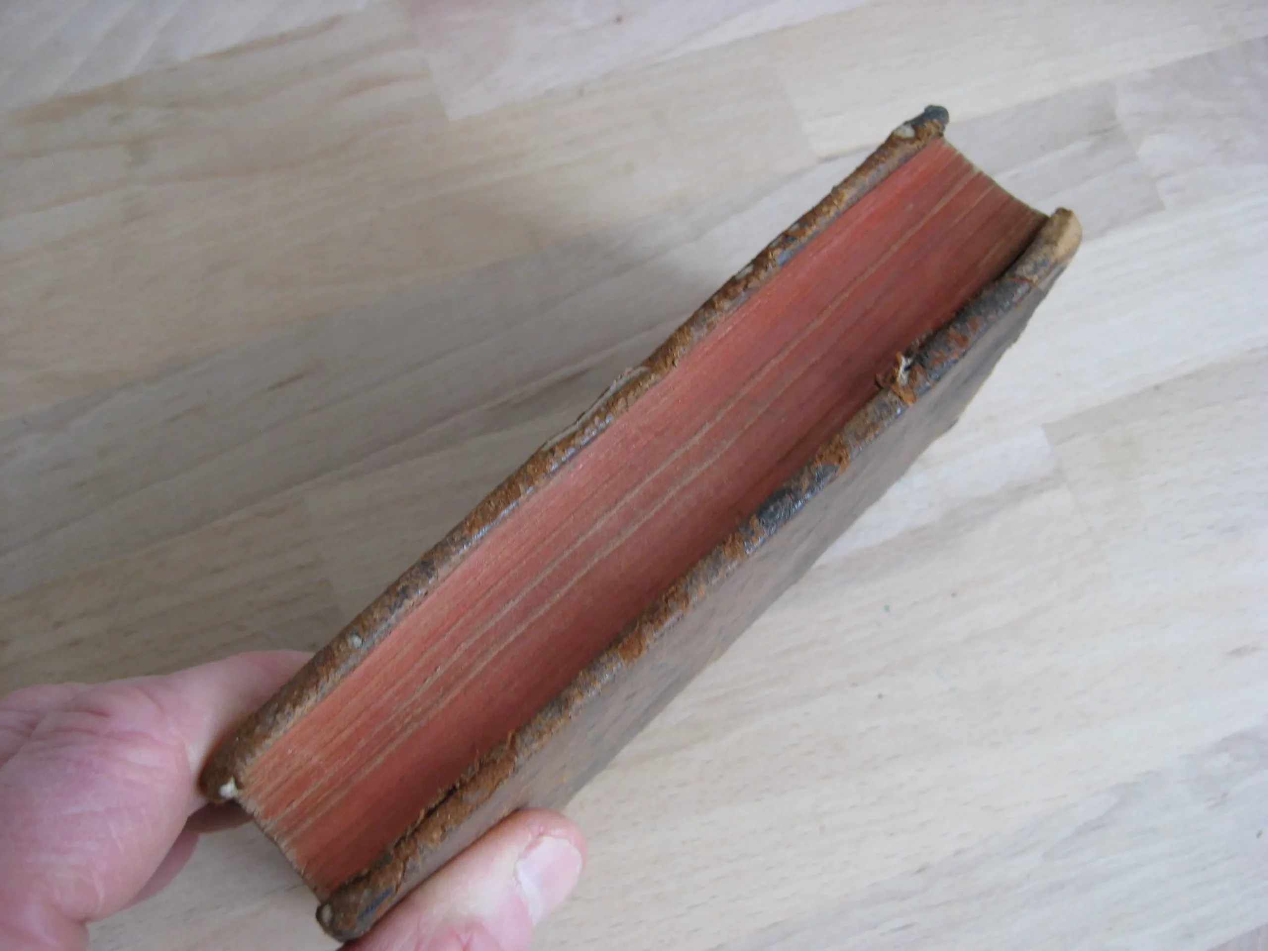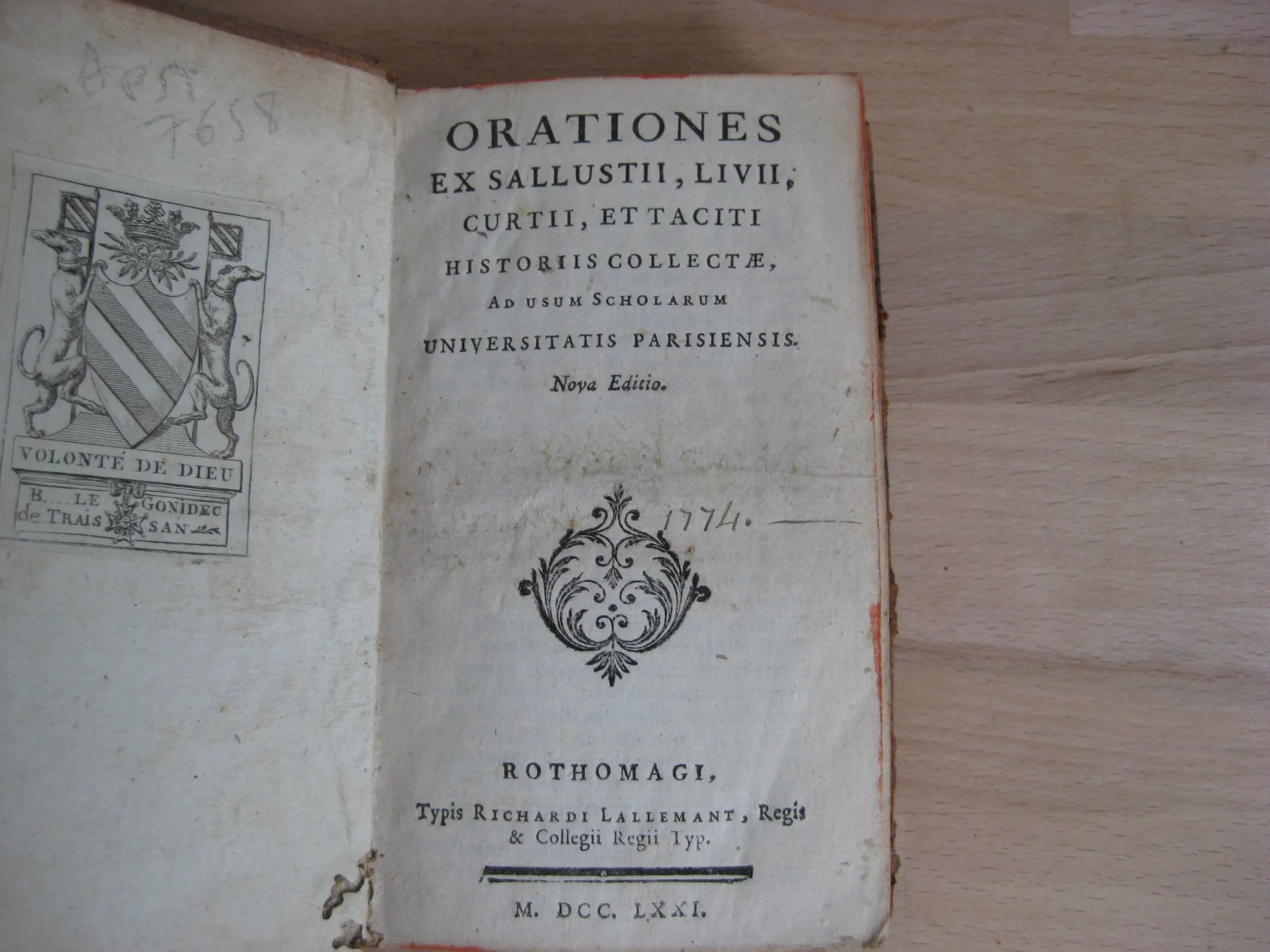 Plein veau marbré, dos à 5 nerfs, orné d’une pièce de titre (effacée), tranches rouges, 148 x 80, 480p. 1771. Orationes de Sallustio, pp. 2-47 ; de Livio, pp.48-347 ; de Cornelio tacito, pp. 348-421 ; de Quinto Curtio, pp. 422-480. Avec un ex-libris aux armes collé en contreplat supếrieur «B. Le Gonidec de Traissan ».  Intérieur globalement bon ; quelques pages avec déchirures en marge sans atteinte au texte. Coins et champs frottés avec épidermures ; Plats frottés avec épidermures, avec 2 petits manques en plat supérieur ; mors frottés avec un petit manque en tête de mors supérieur ; dos très frotté avec fortes épidermures, avec peit manque en queue, et coiffe manquante.