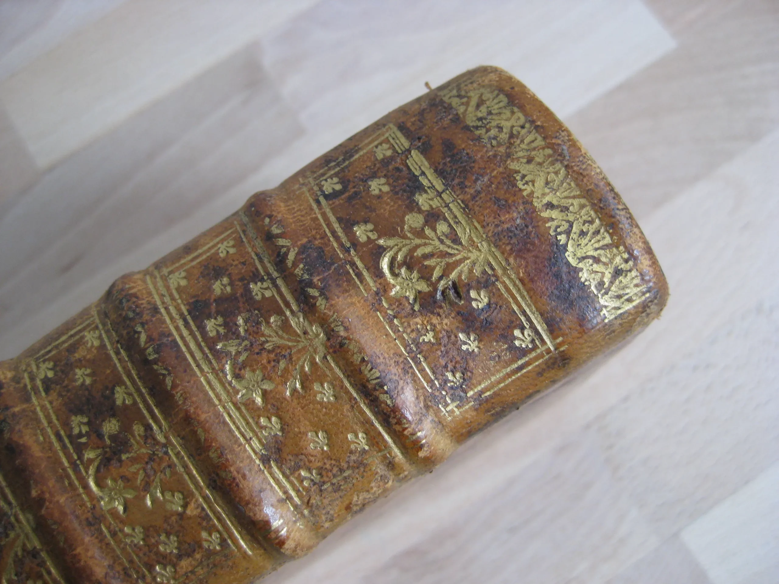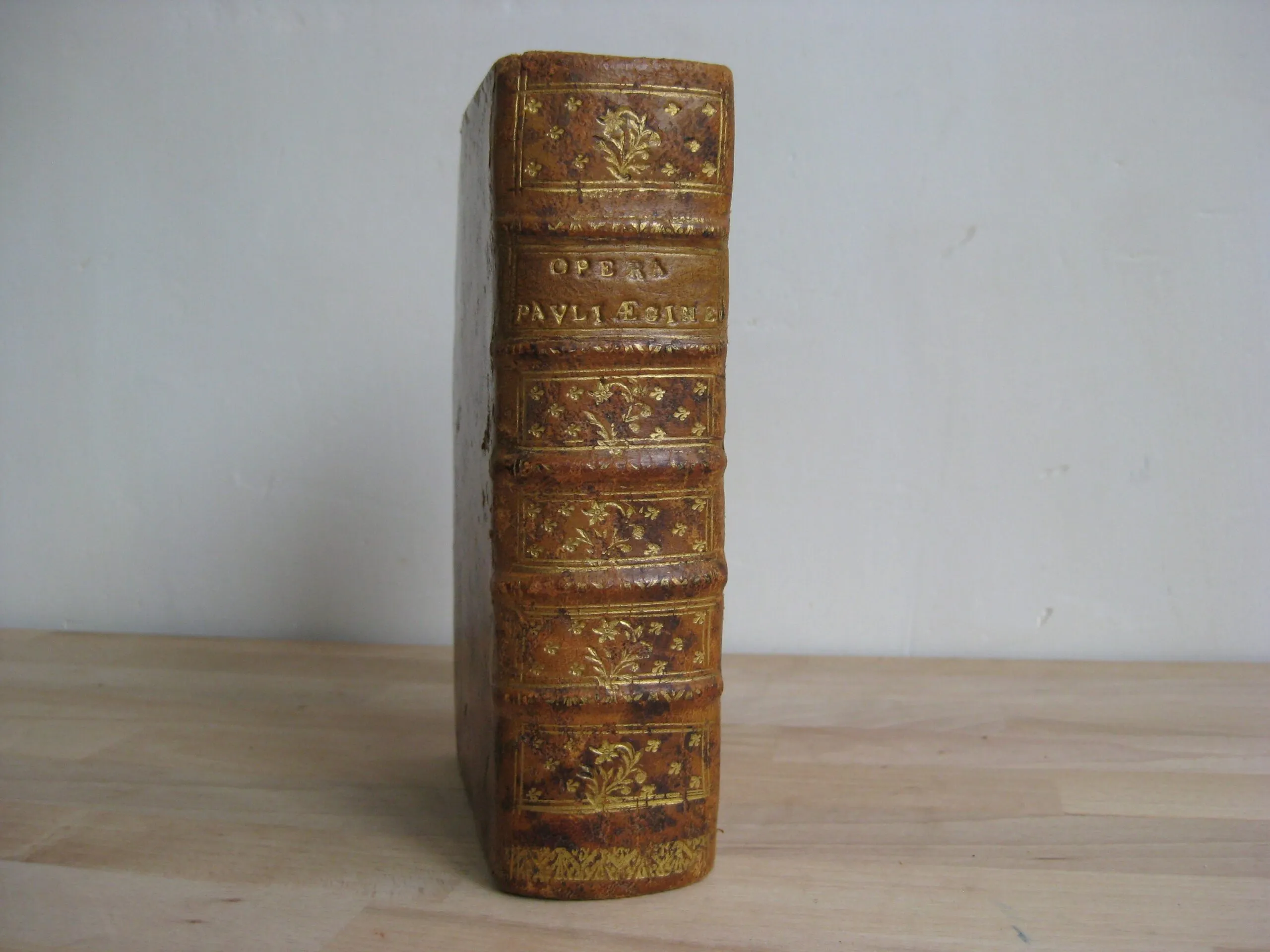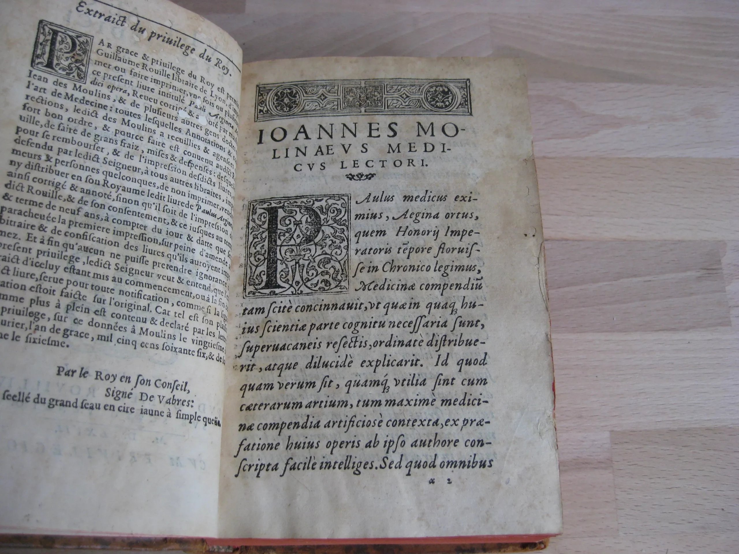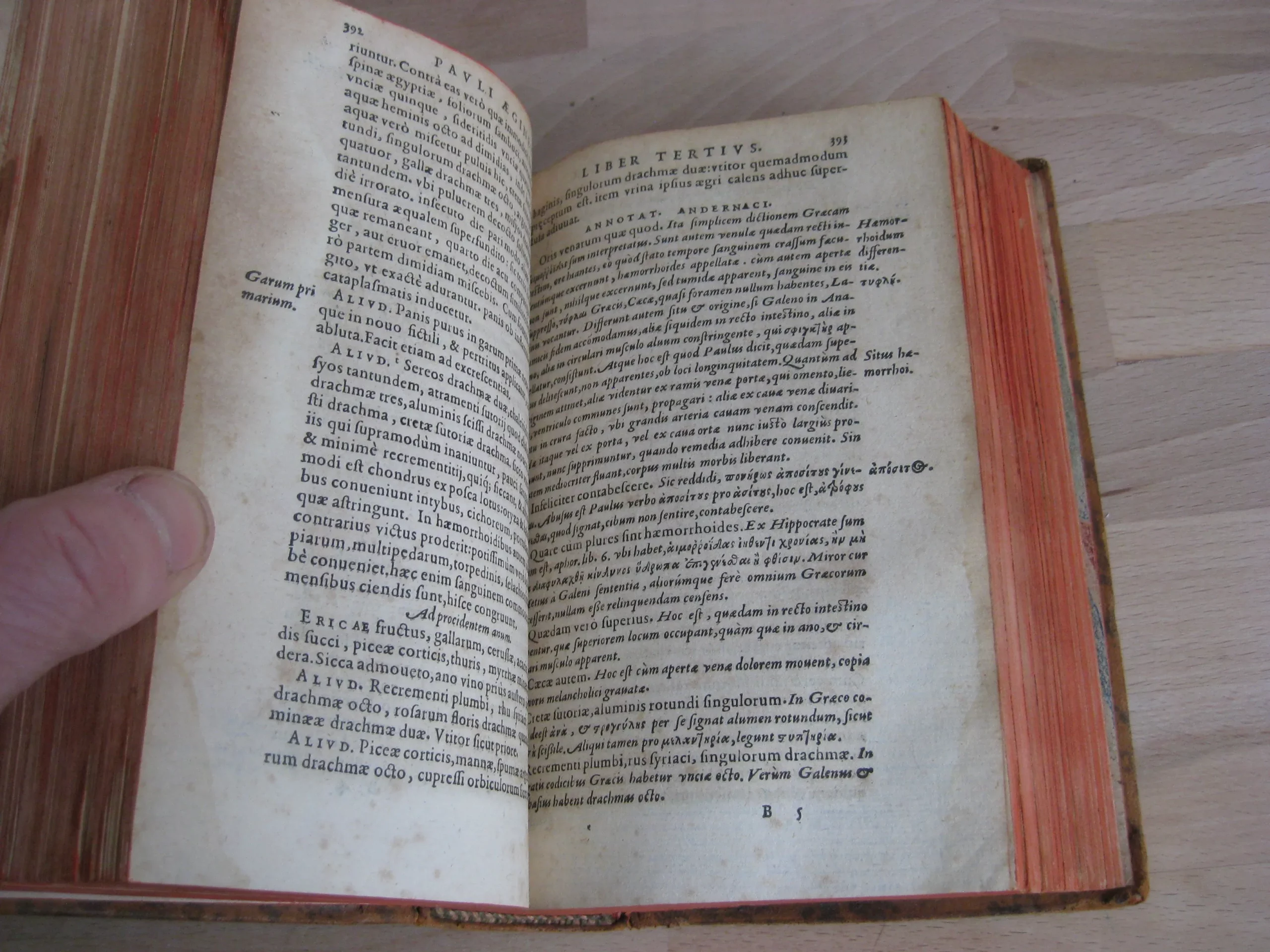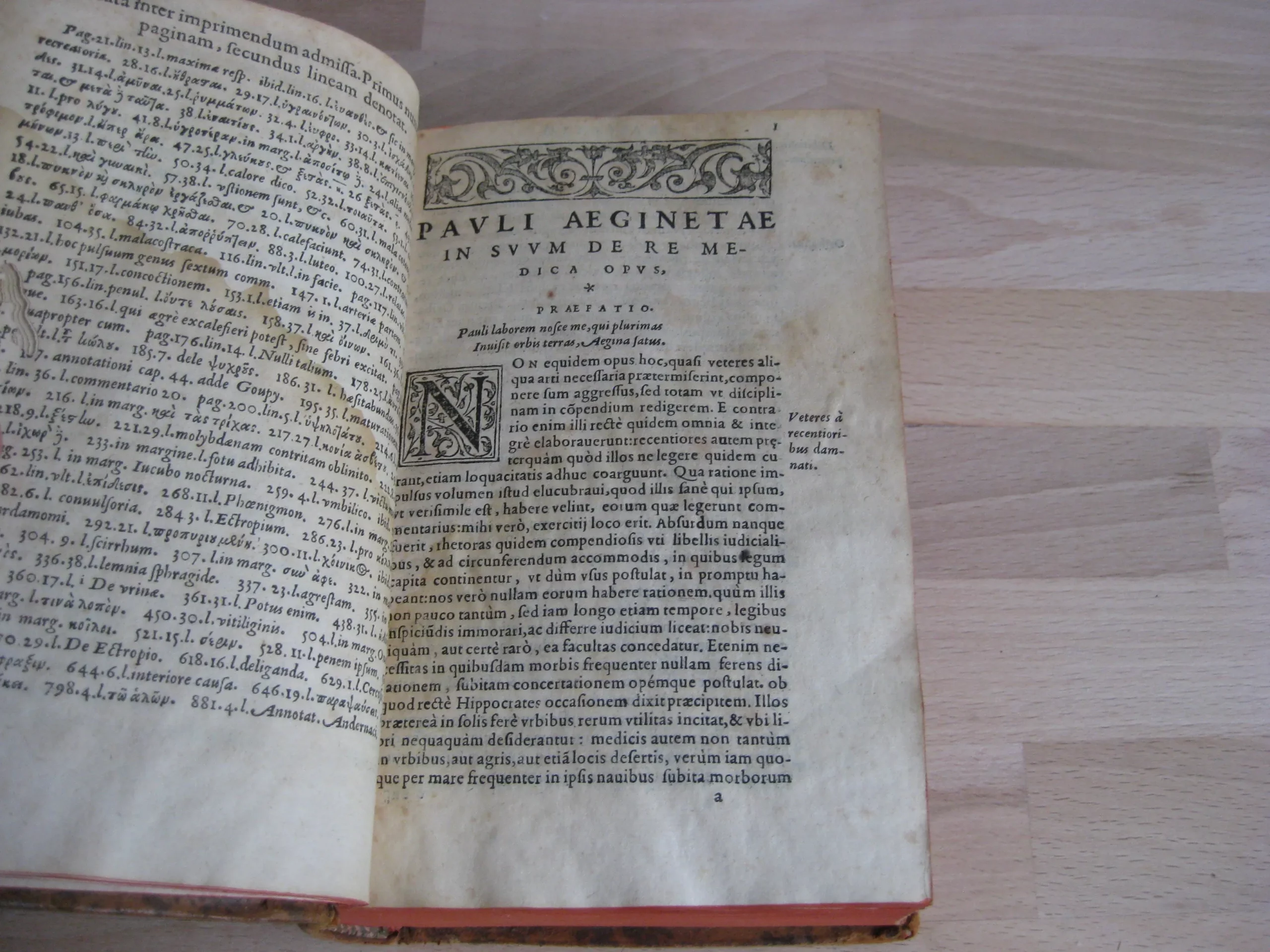 in-8, de 15ff.-923pp.-26ff., plein veau, dos à cinq nerfs, orné de caissons, nerfs ornés, guirlande en pied, tranches rouges, 168 X 116, Lyon, 1567. Vignette de titre « in virtute et fortuna », à l’aigle surplombant deux serpents, de type caducée. Entête, lettrines. Bonne édition lyonnaise latine, avec les notes de Cornarius, Goupyl et Dalechamp. Ex-libris collé en contreplat supérieur Dr. L. Luttrand ». Intérieur avec travail de ver en marge (avec atteinte brève au texte d’errata) et mouillure en début d’ouvrage. Exemplaire enrichi de 35-36 notes manuscrites latines et grecques, en marge et lisibles, dont un ajout « Ponderû nomenclatum et expositio ». Très rares soulignages. Rousseurs marginales. Plats avec légères épiderlures mais bons. Coins frottés, champs frottés. Mors frottés avec épidermlures. Nerfs frottés, épidermures en coiffe et queue. Bel exemplaire. NB : Jacques Daléchamps ou D’Aléchamps, né en 1513 à Caen et mort le 1er mars 1588 à Lyon, est un médecin, botaniste, philologue, et naturaliste français. Il est célèbre pour sa traduction latine d’Athénée, enrichie de notes. / Jacques Goupil (parfois Goupyl) est un médecin et philologue français du xvie siècle (1525 ? Luçon -1564 ? Paris).
