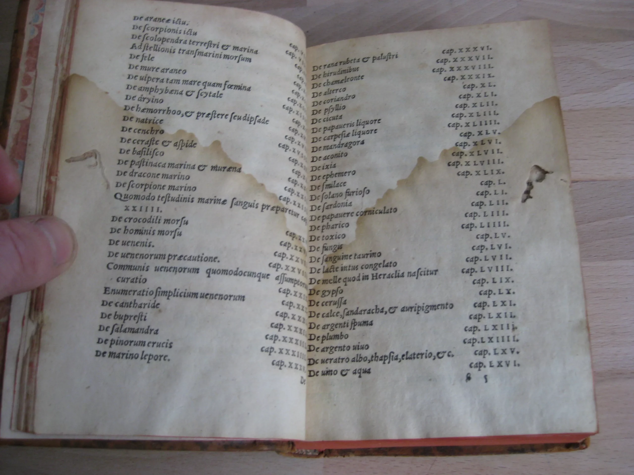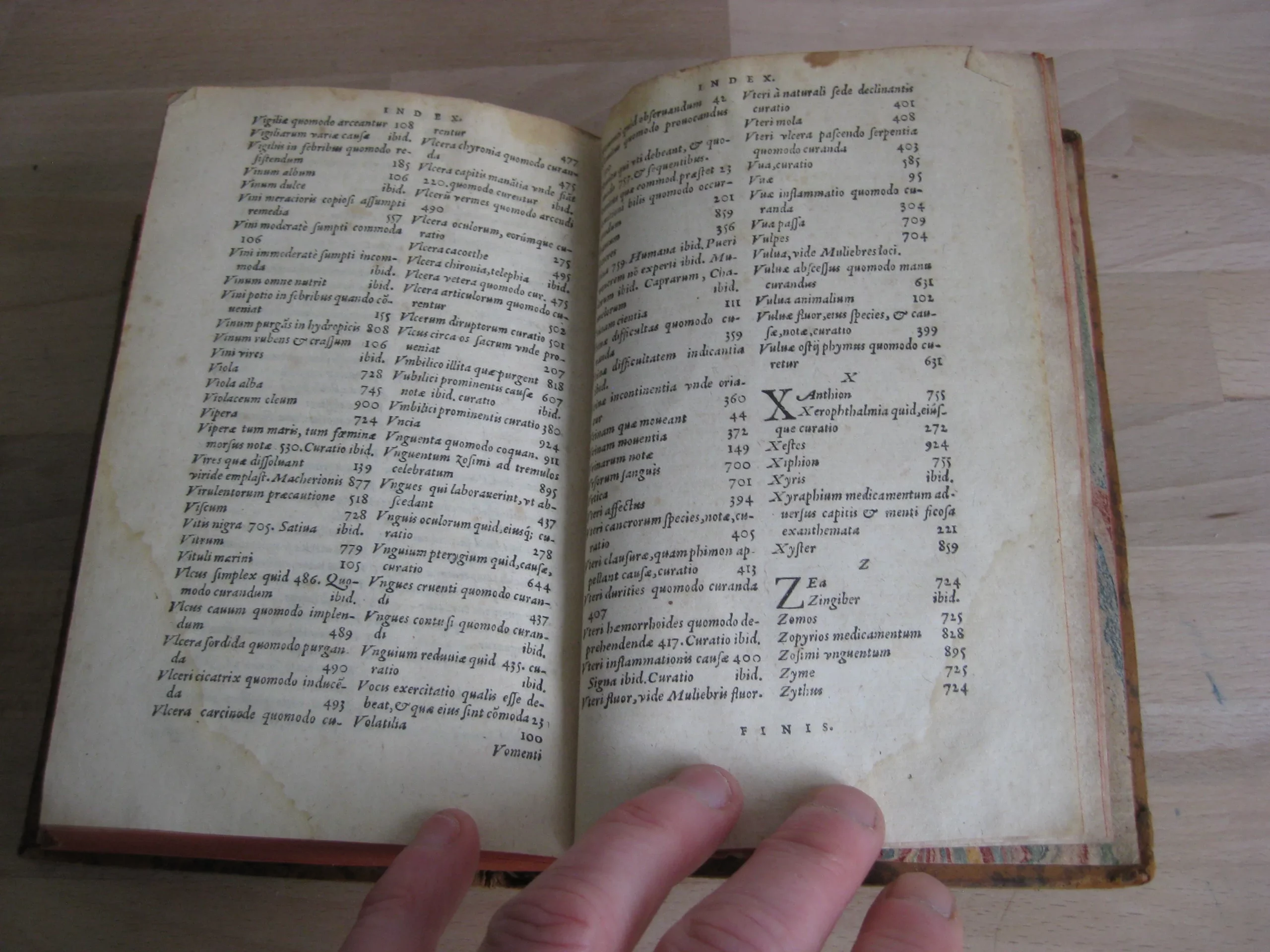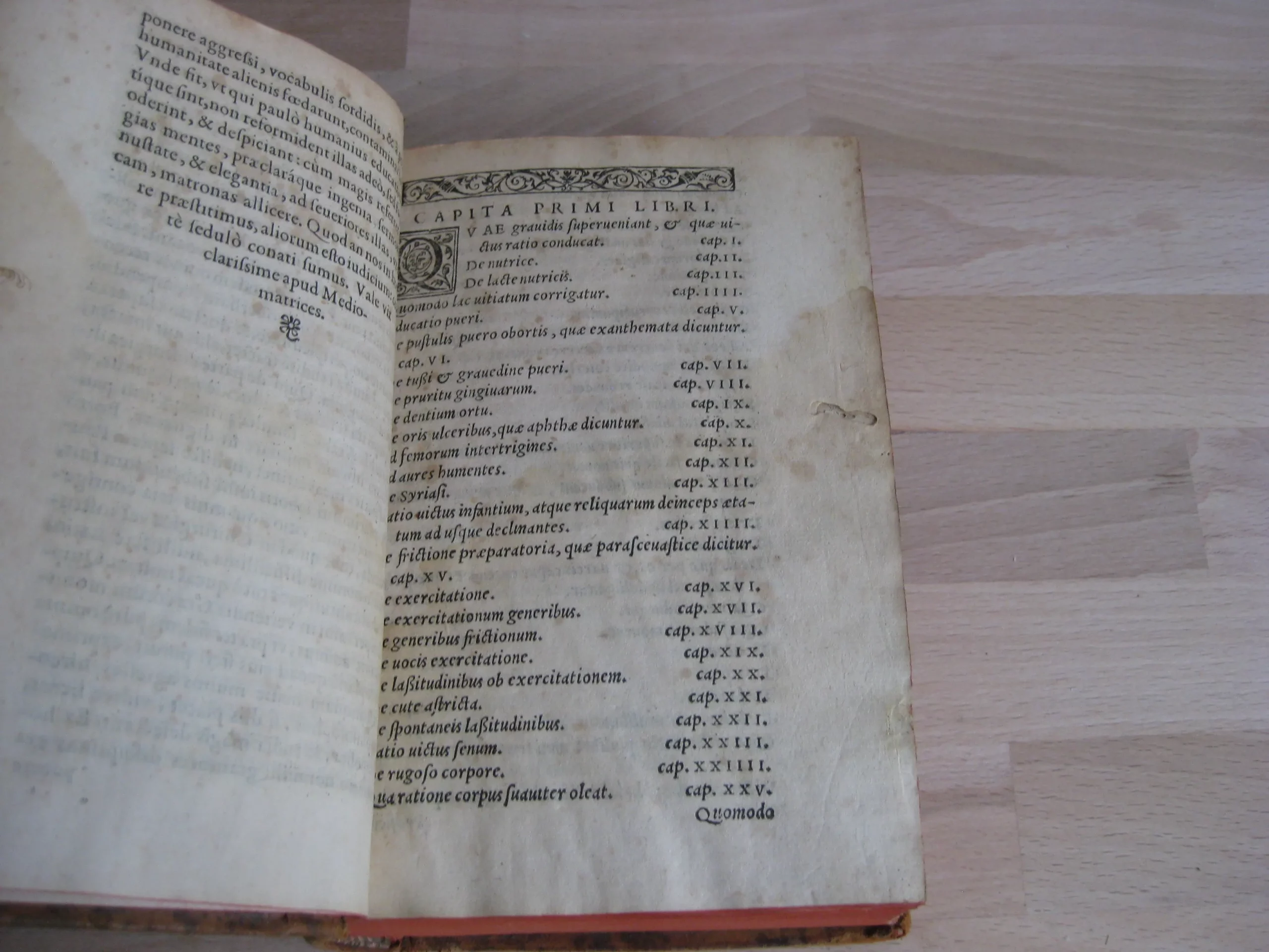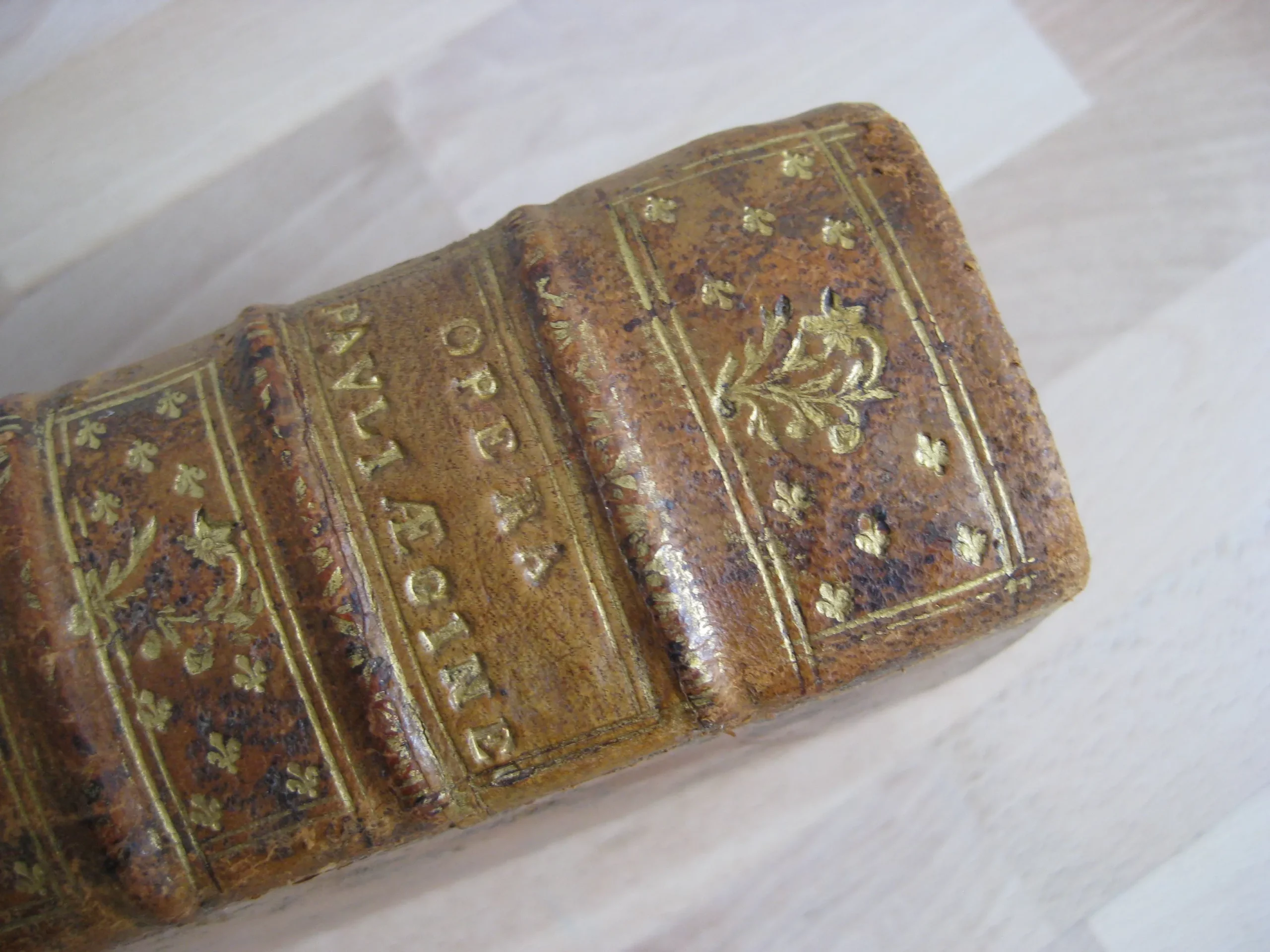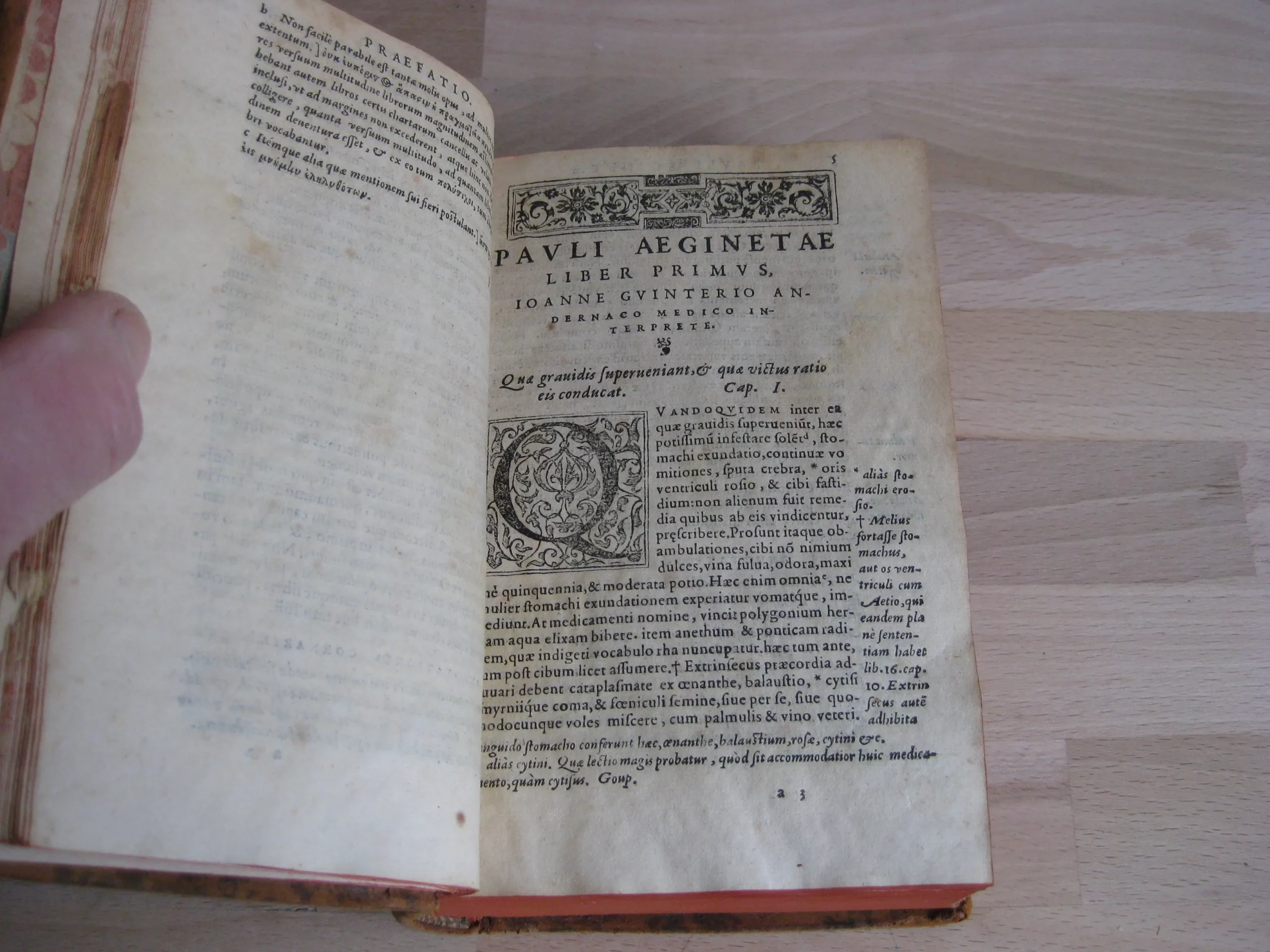 in-8, de 15ff.-923pp.-26ff., plein veau, dos à cinq nerfs, orné de caissons, nerfs ornés, guirlande en pied, tranches rouges, 168 X 116, Lyon, 1567. Vignette de titre « in virtute et fortuna », à l’aigle surplombant deux serpents, de type caducée. Entête, lettrines. Bonne édition lyonnaise latine, avec les notes de Cornarius, Goupyl et Dalechamp. Ex-libris collé en contreplat supérieur Dr. L. Luttrand ». Intérieur avec travail de ver en marge (avec atteinte brève au texte d’errata) et mouillure en début d’ouvrage. Exemplaire enrichi de 35-36 notes manuscrites latines et grecques, en marge et lisibles, dont un ajout « Ponderû nomenclatum et expositio ». Très rares soulignages. Rousseurs marginales. Plats avec légères épiderlures mais bons. Coins frottés, champs frottés. Mors frottés avec épidermlures. Nerfs frottés, épidermures en coiffe et queue. Bel exemplaire. NB : Jacques Daléchamps ou D’Aléchamps, né en 1513 à Caen et mort le 1er mars 1588 à Lyon, est un médecin, botaniste, philologue, et naturaliste français. Il est célèbre pour sa traduction latine d’Athénée, enrichie de notes. / Jacques Goupil (parfois Goupyl) est un médecin et philologue français du xvie siècle (1525 ? Luçon -1564 ? Paris).
